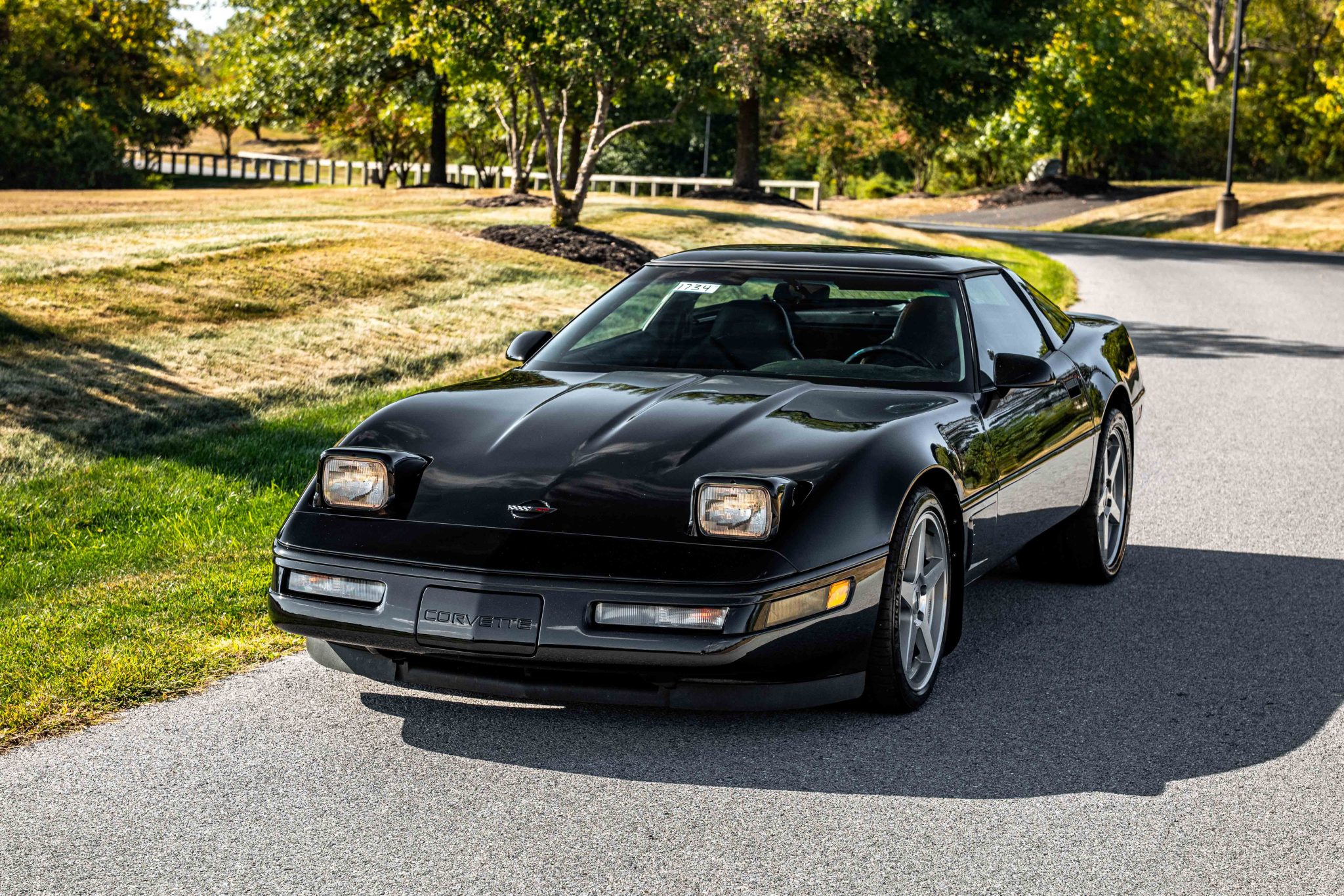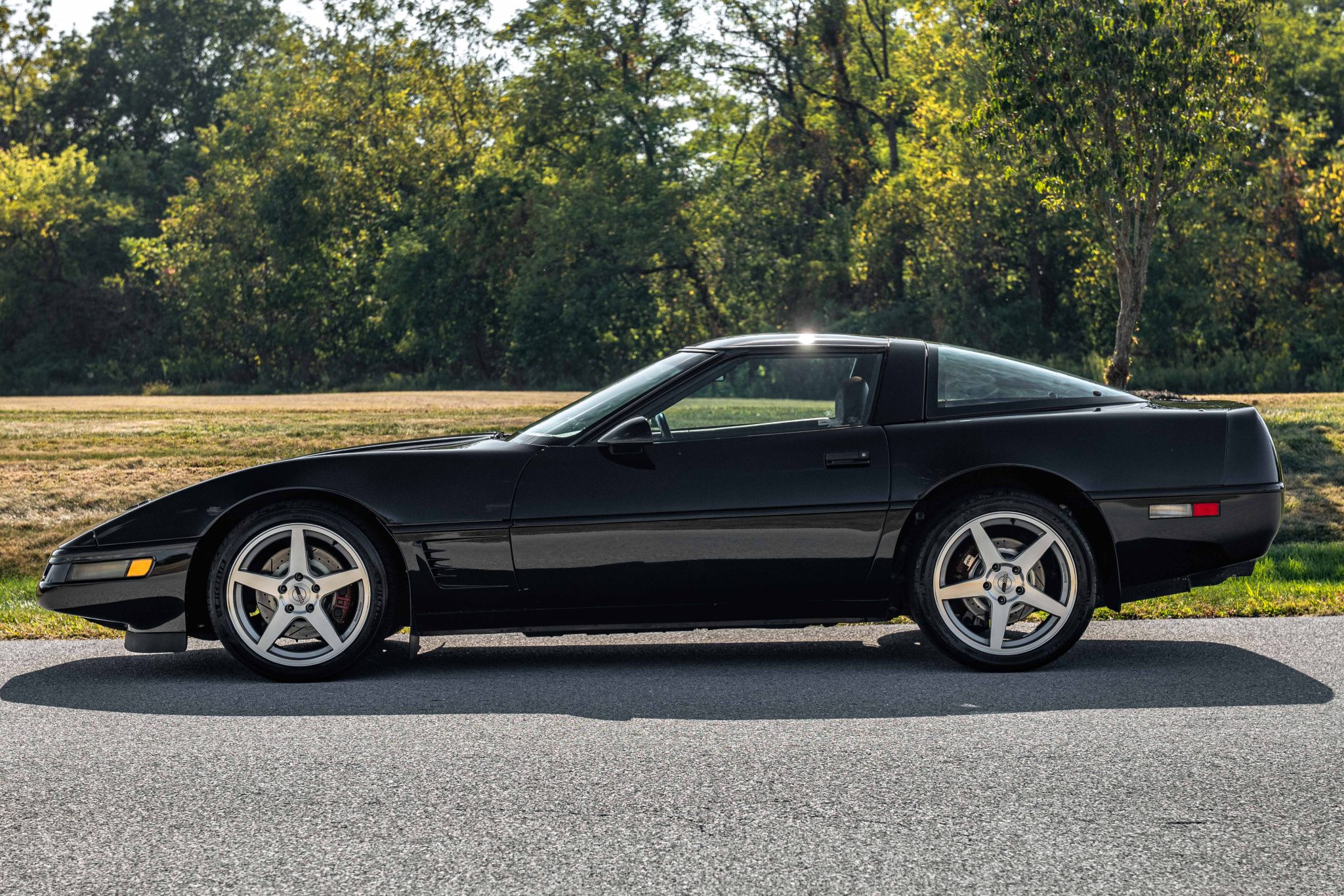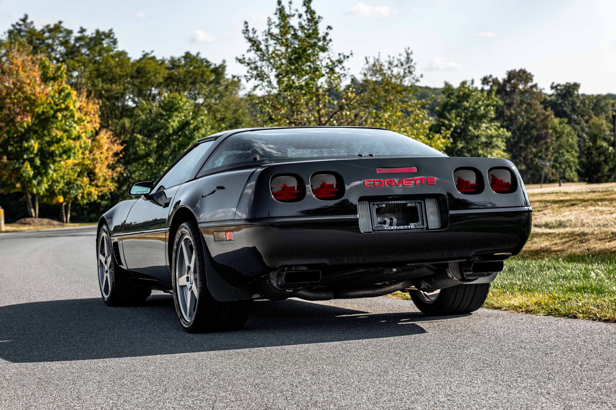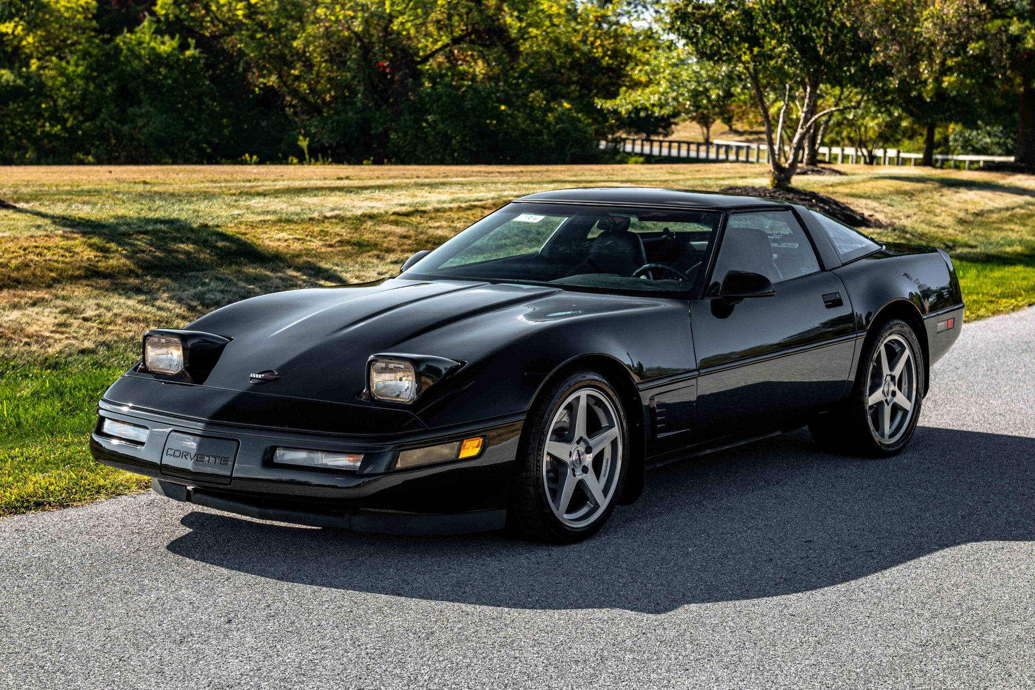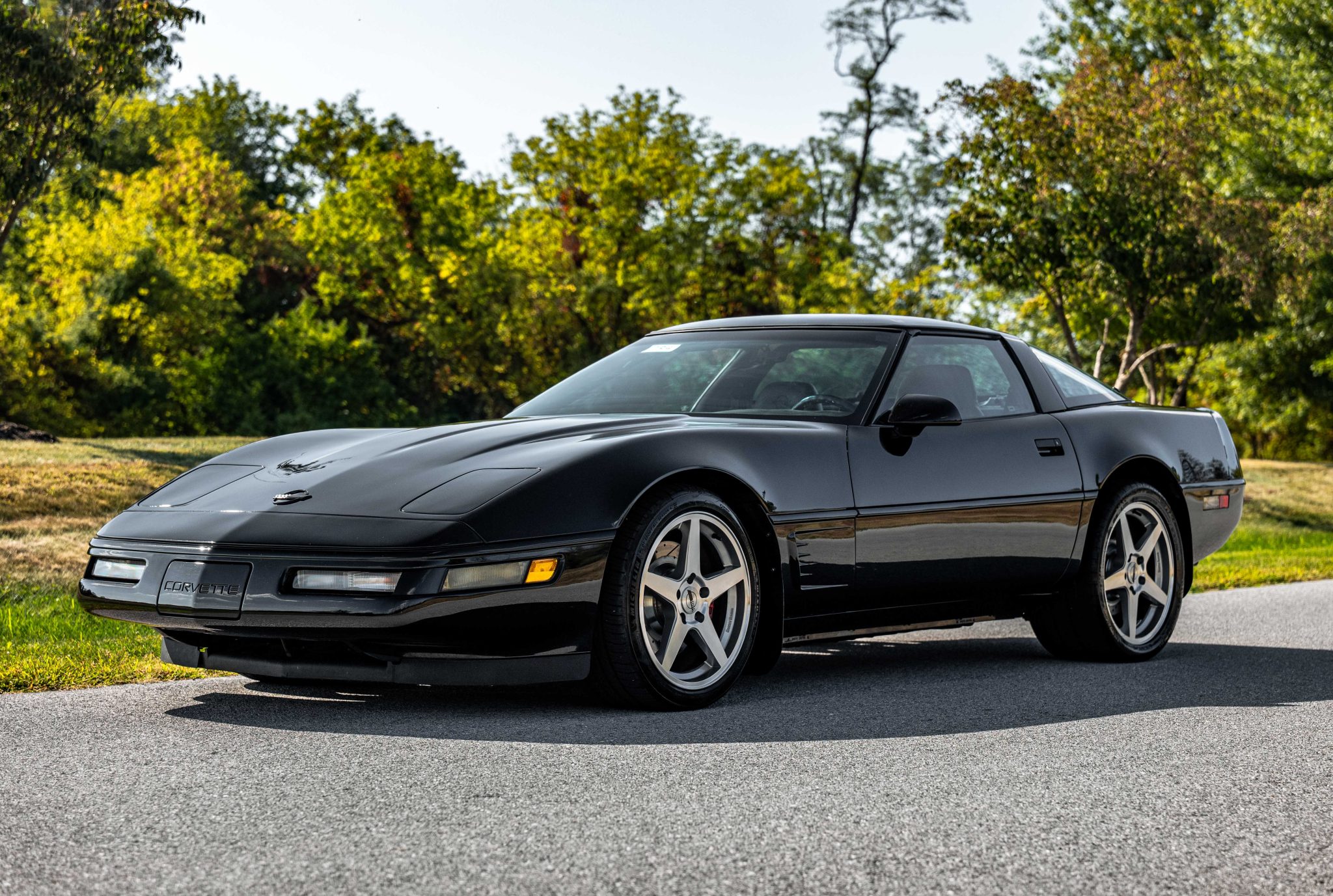 This 1996 Chevrolet Corvette is a black-over-black coupe powered by a 5.7-liter LT4 V8 linked with a six-speed manual transmission and a limited-slip differential. It features a removable tinted-glass roof panel, pop-up headlights, and 18” Rocket Racing wheels along with a Delco Bose cassette stereo, automatic climate control, and power-adjustable sport seats.