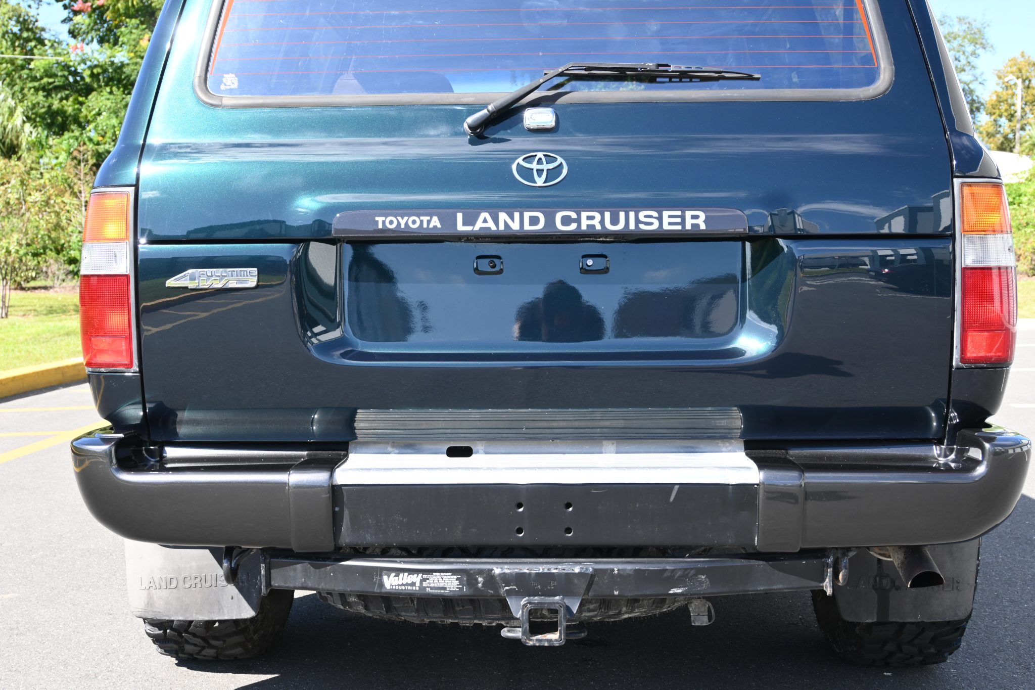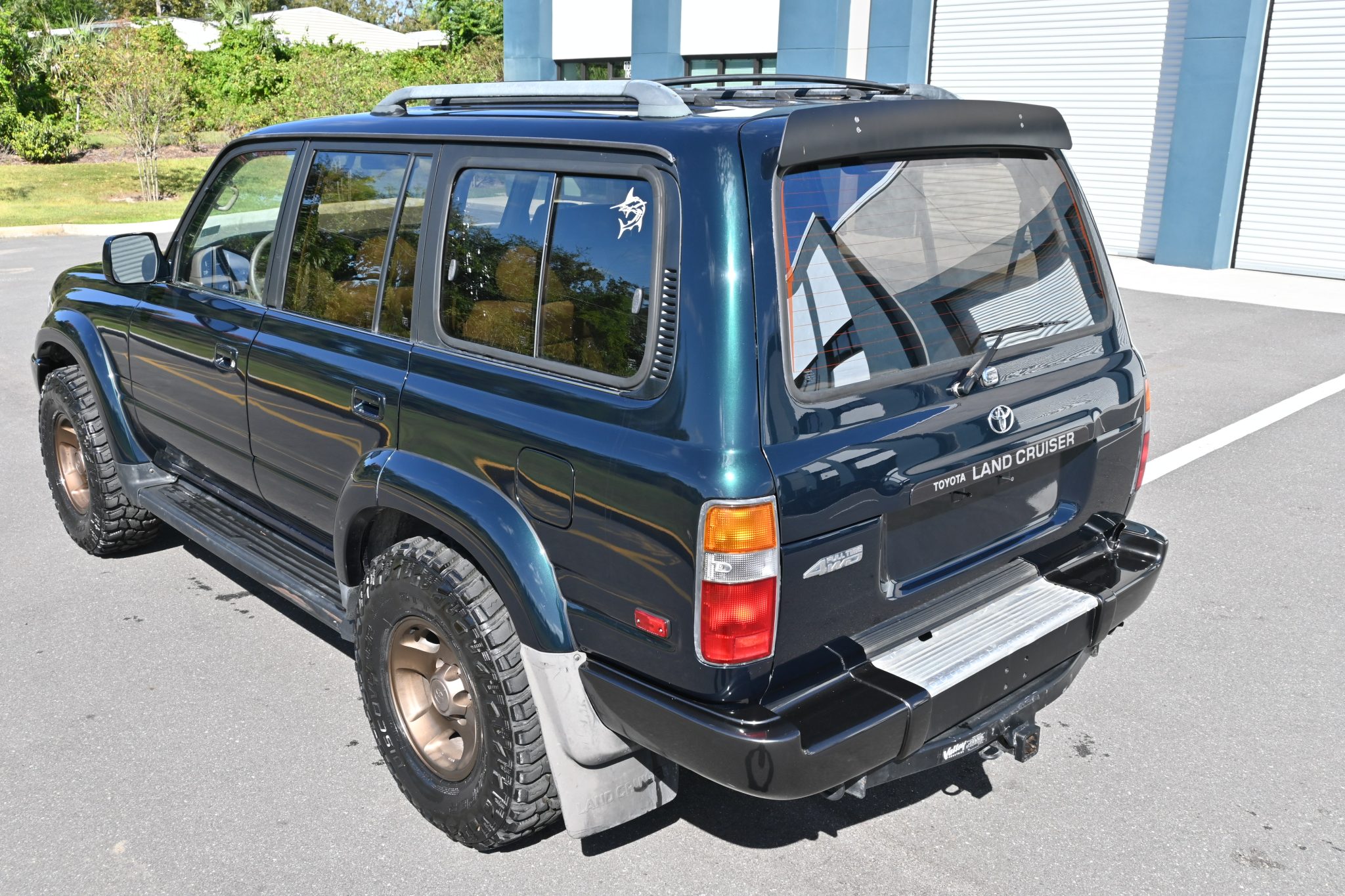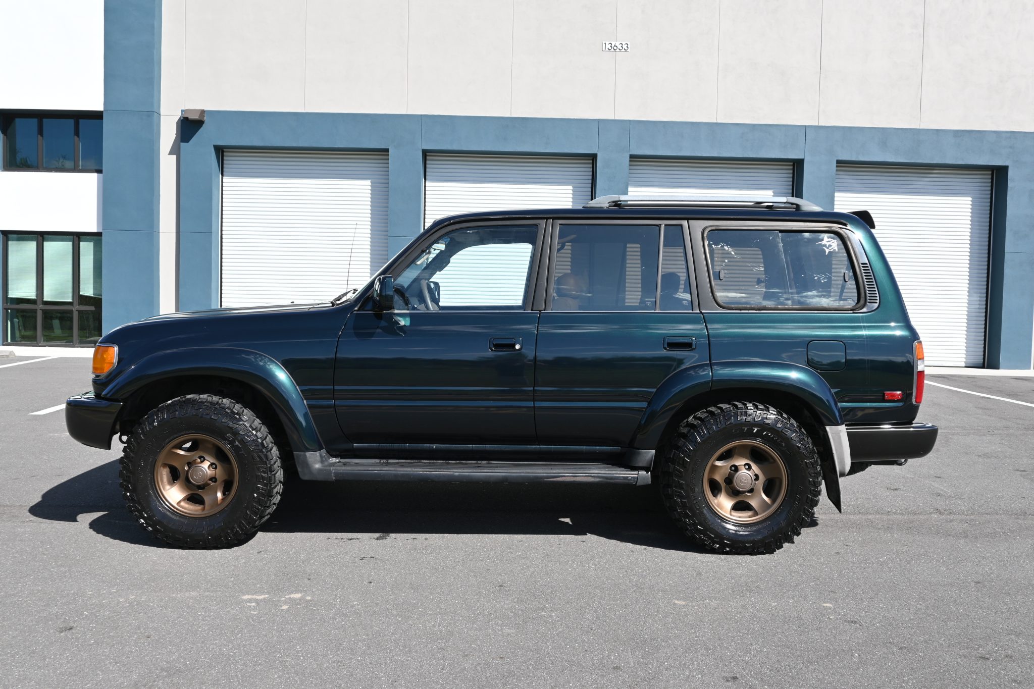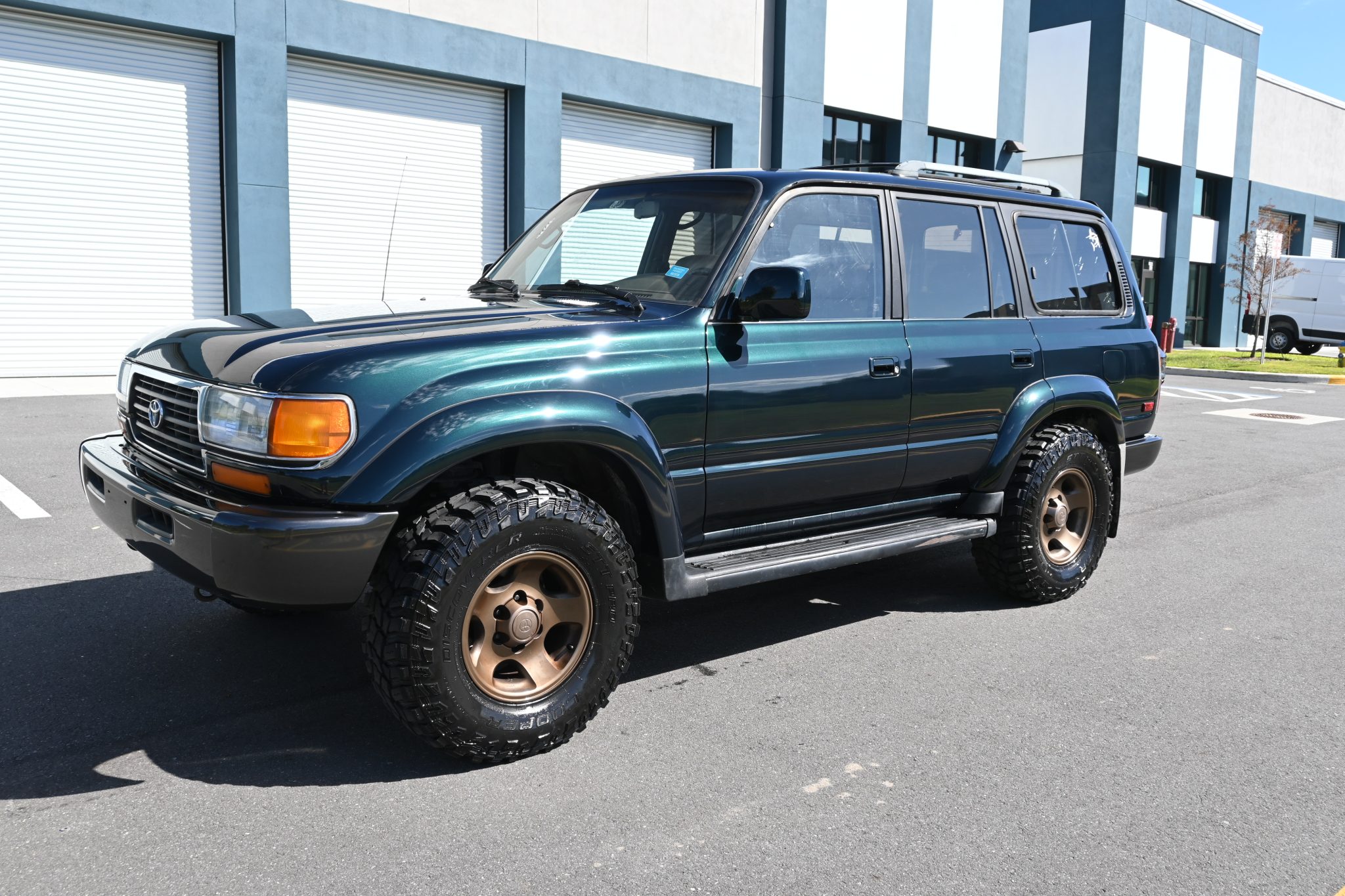 This 1996 Toyota Land Cruiser is powered by a 4.5L 1FZ-FE inline-six linked with a four-speed automatic transmission, a dual-range transfer case, and a locking center differential. It is finished in Dark Emerald Pearl over Oak leather and features gold-painted 16″ alloy wheels, a sunroof, a receiver hitch, a roof rack, folding third-row seats, a Bluetooth-capable aftermarket stereo, and air conditioning.
