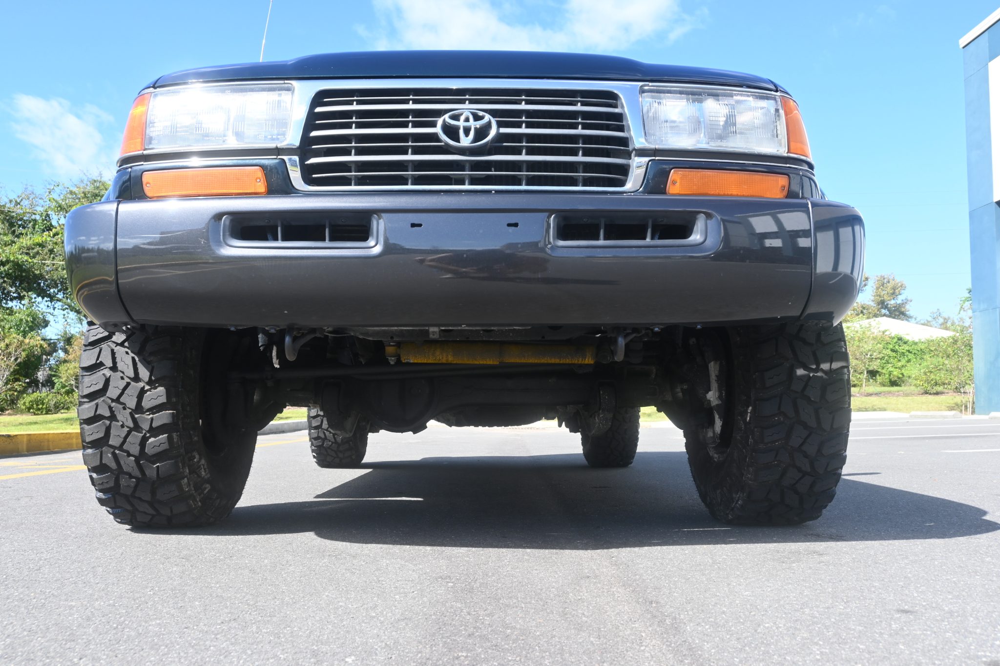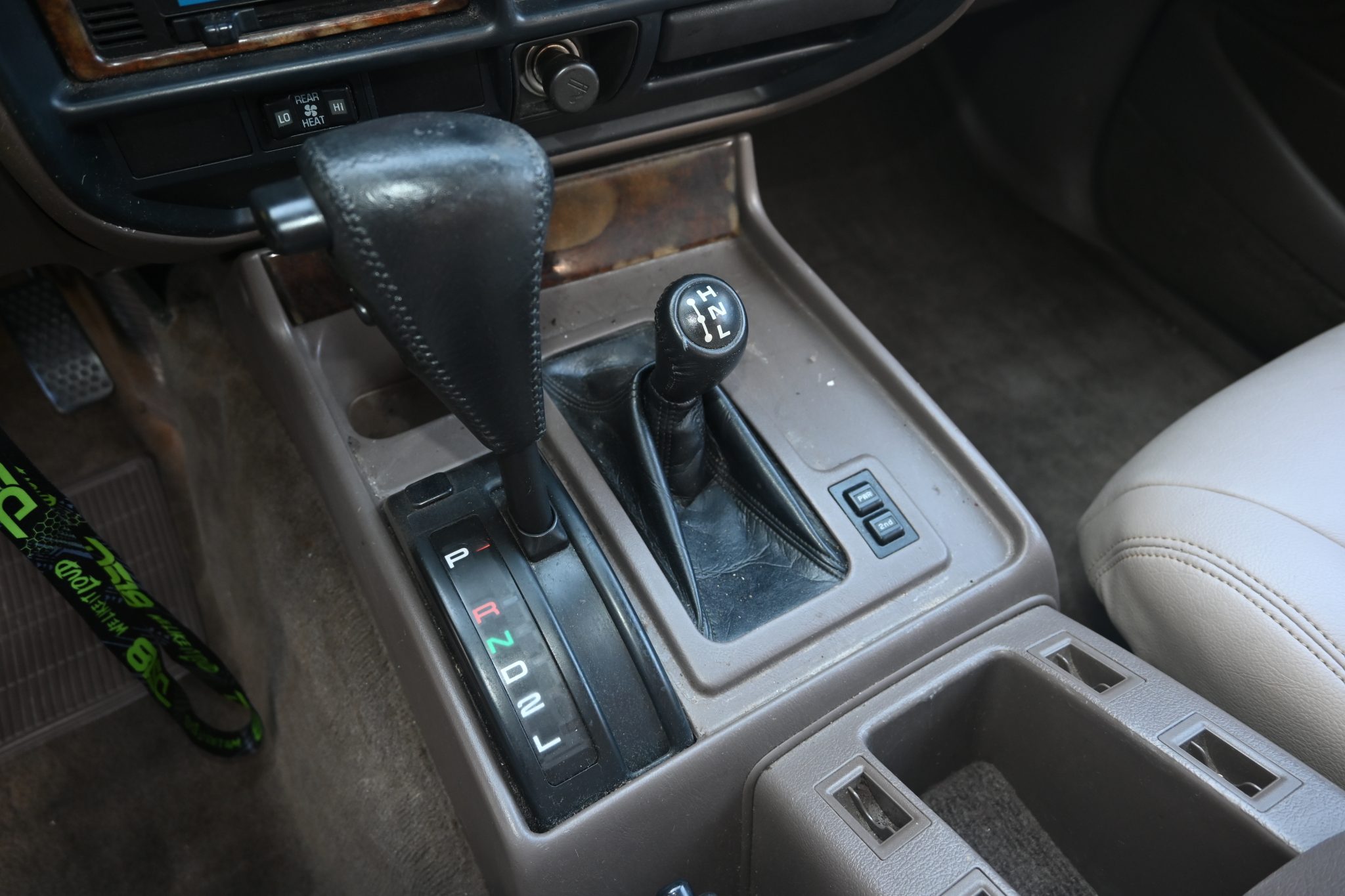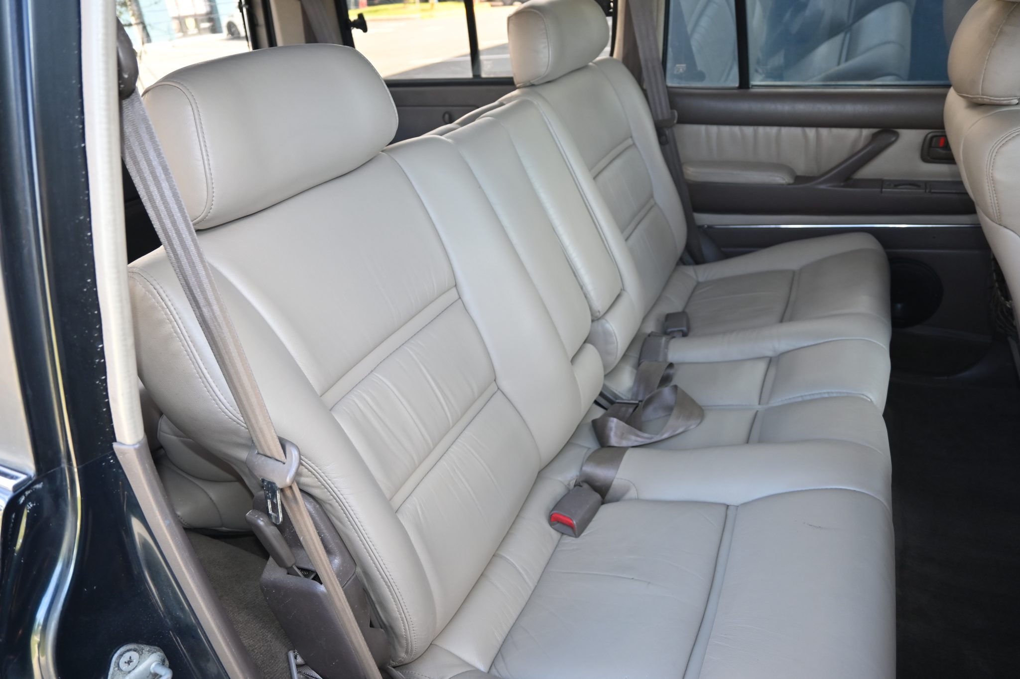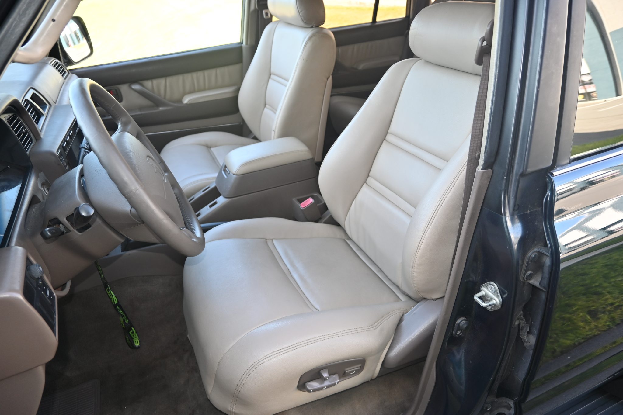 This 1996 Toyota Land Cruiser is powered by a 4.5L 1FZ-FE inline-six linked with a four-speed automatic transmission, a dual-range transfer case, and a locking center differential. It is finished in Dark Emerald Pearl over Oak leather and features gold-painted 16″ alloy wheels, a sunroof, a receiver hitch, a roof rack, folding third-row seats, a Bluetooth-capable aftermarket stereo, and air conditioning.
