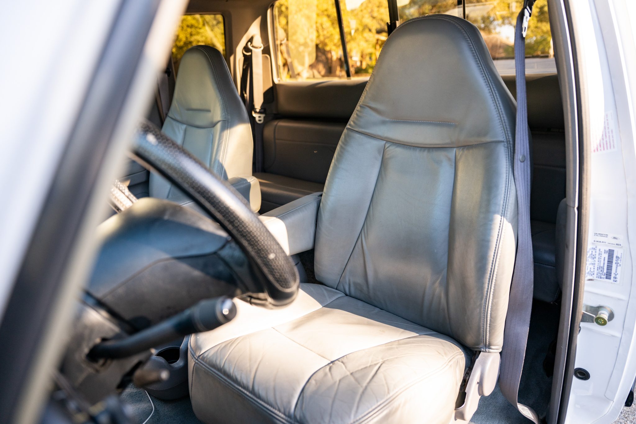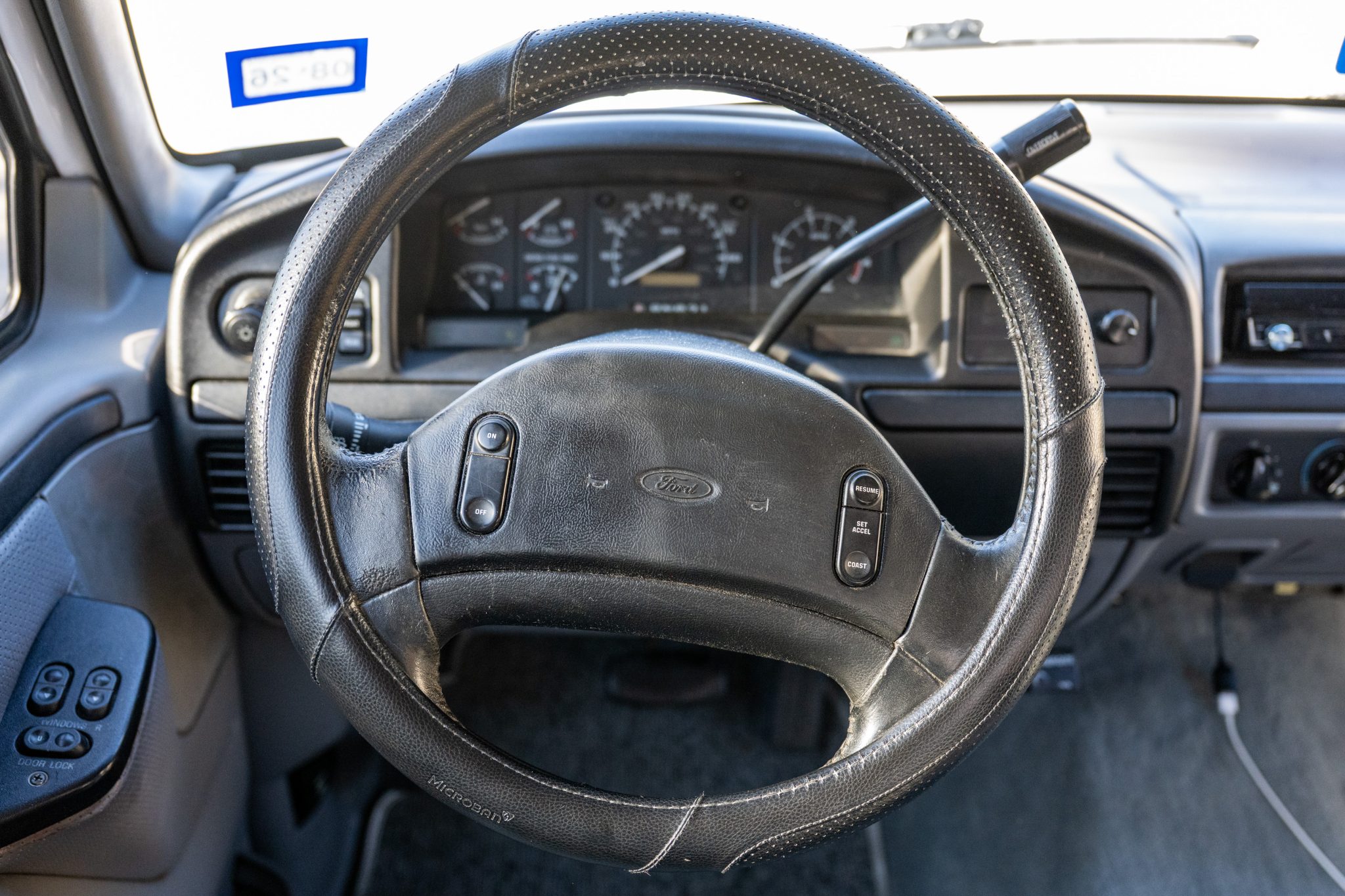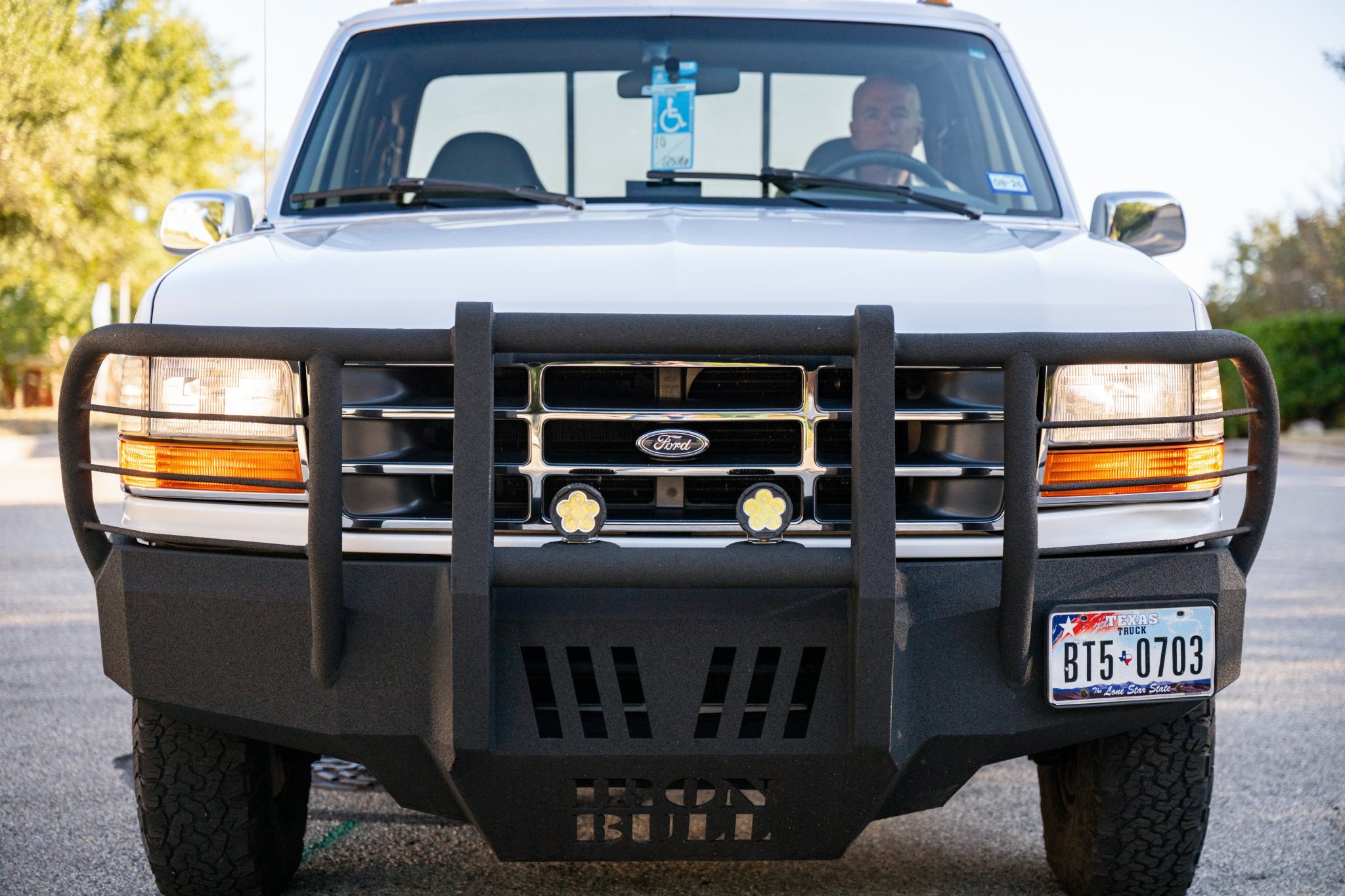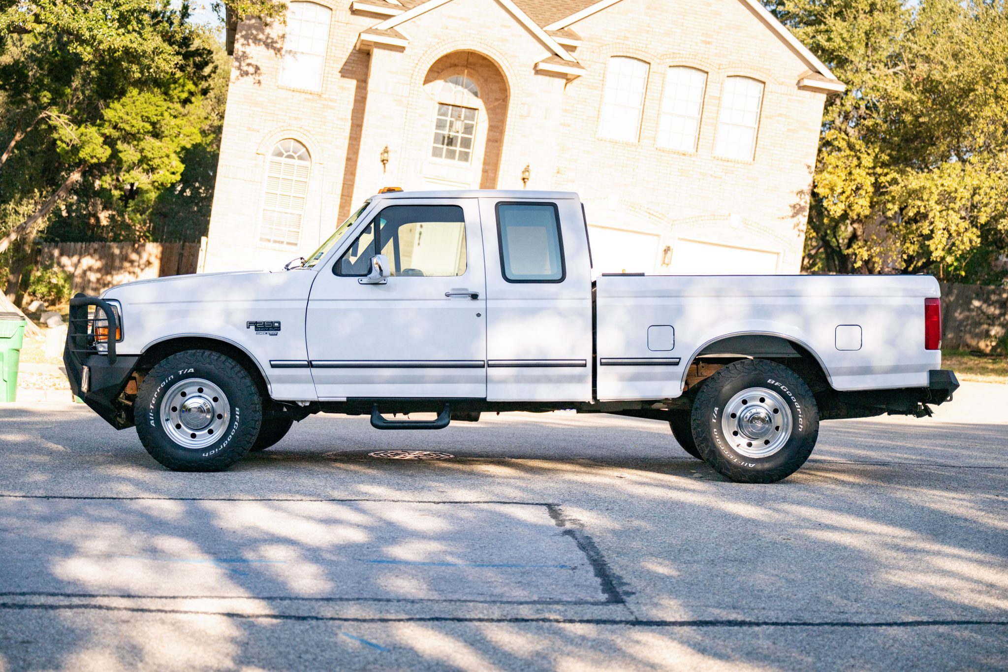 This 1997 Ford F-250 HD XLT SuperCab pickup is finished in Oxford White over Opal Gray leather and powered by a 7.3-liter turbodiesel V8 that drives the rear wheels through a four-speed automatic transmission. Equipment includes Iron Bull bumpers, LED driving lights, clearance lights, a retractable tonneau cover, and 16″ eight-hole alloy wheels in addition to air conditioning, cruise control, power windows, a Pioneer touchscreen head unit, front- and rear-facing cameras, and dual fuel tanks.