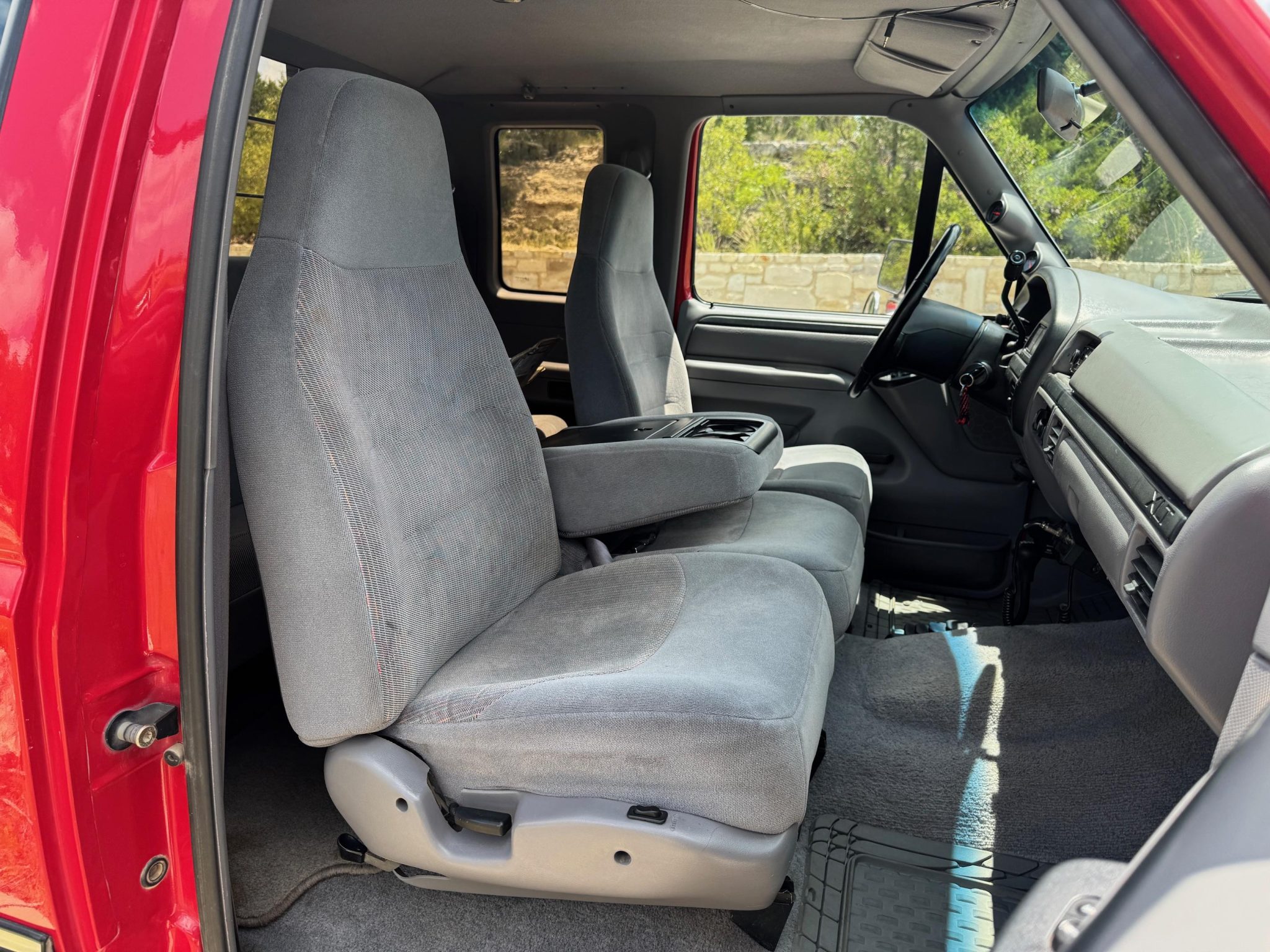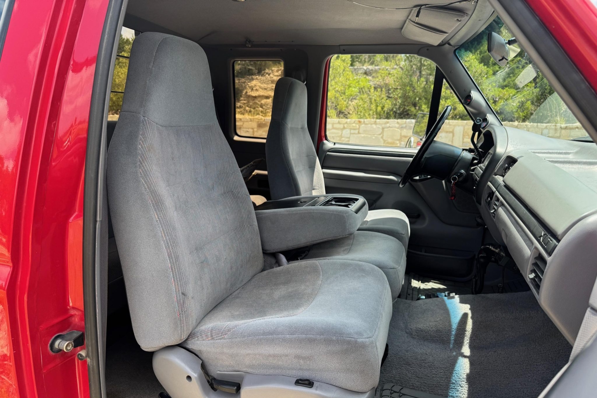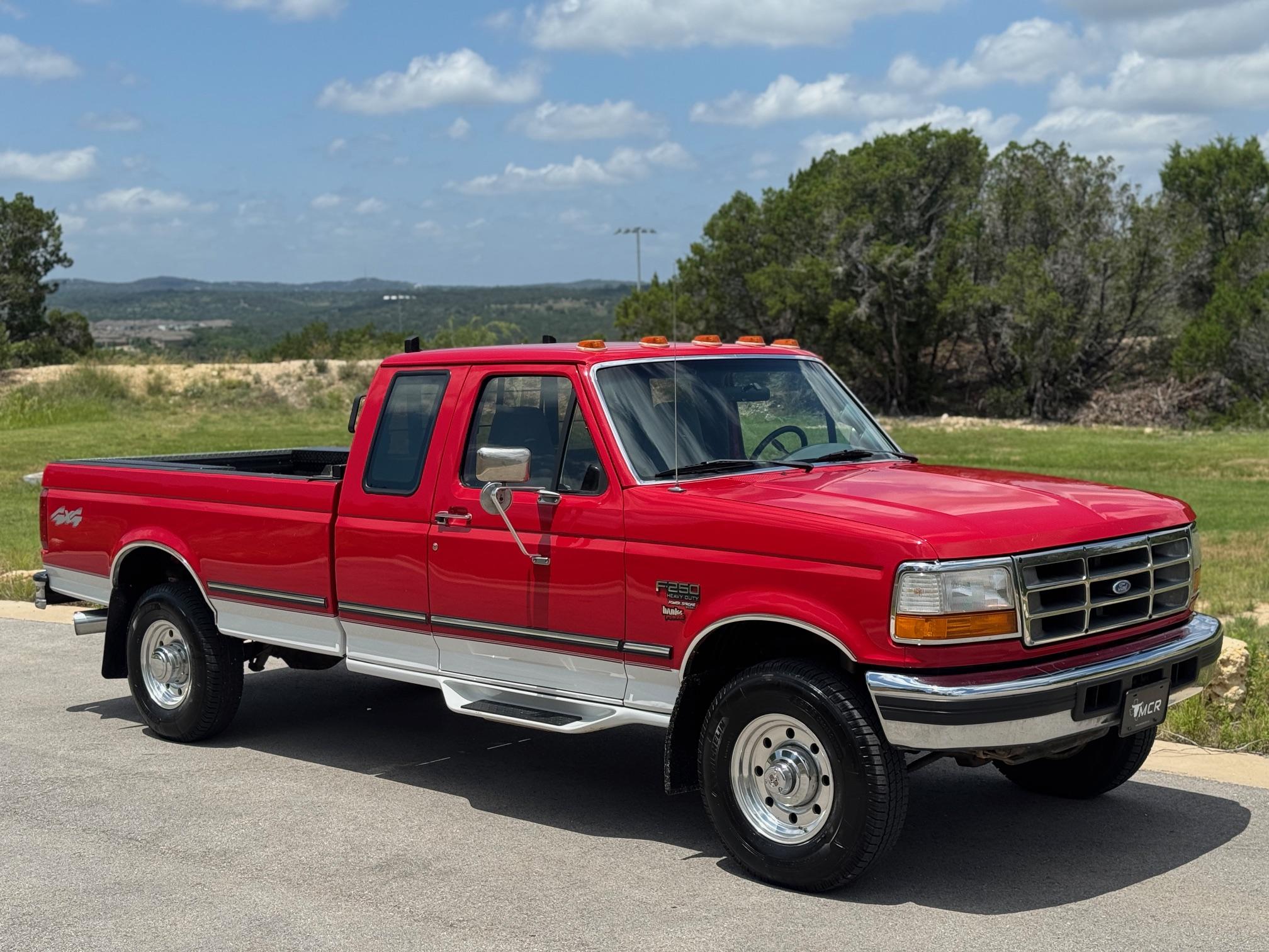 The truck is finished in Bright Red and Oxford White over Opal Gray cloth and is powered by a 7.3-liter turbodiesel V8 linked to a four-speed automatic transmission and a dual-range transfer case. Equipment includes a receiver hitch, a gooseneck hitch, bed-mounted toolboxes, a headache rack, 16″ eight-hole alloy wheels, front disc brakes, manually locking front hubs, air conditioning, cruise control, and a Kenwood stereo. This F-250