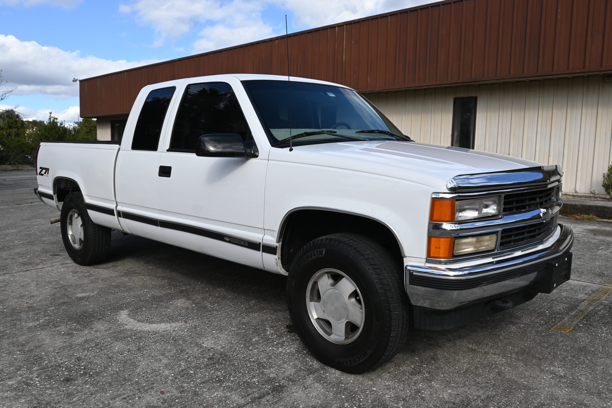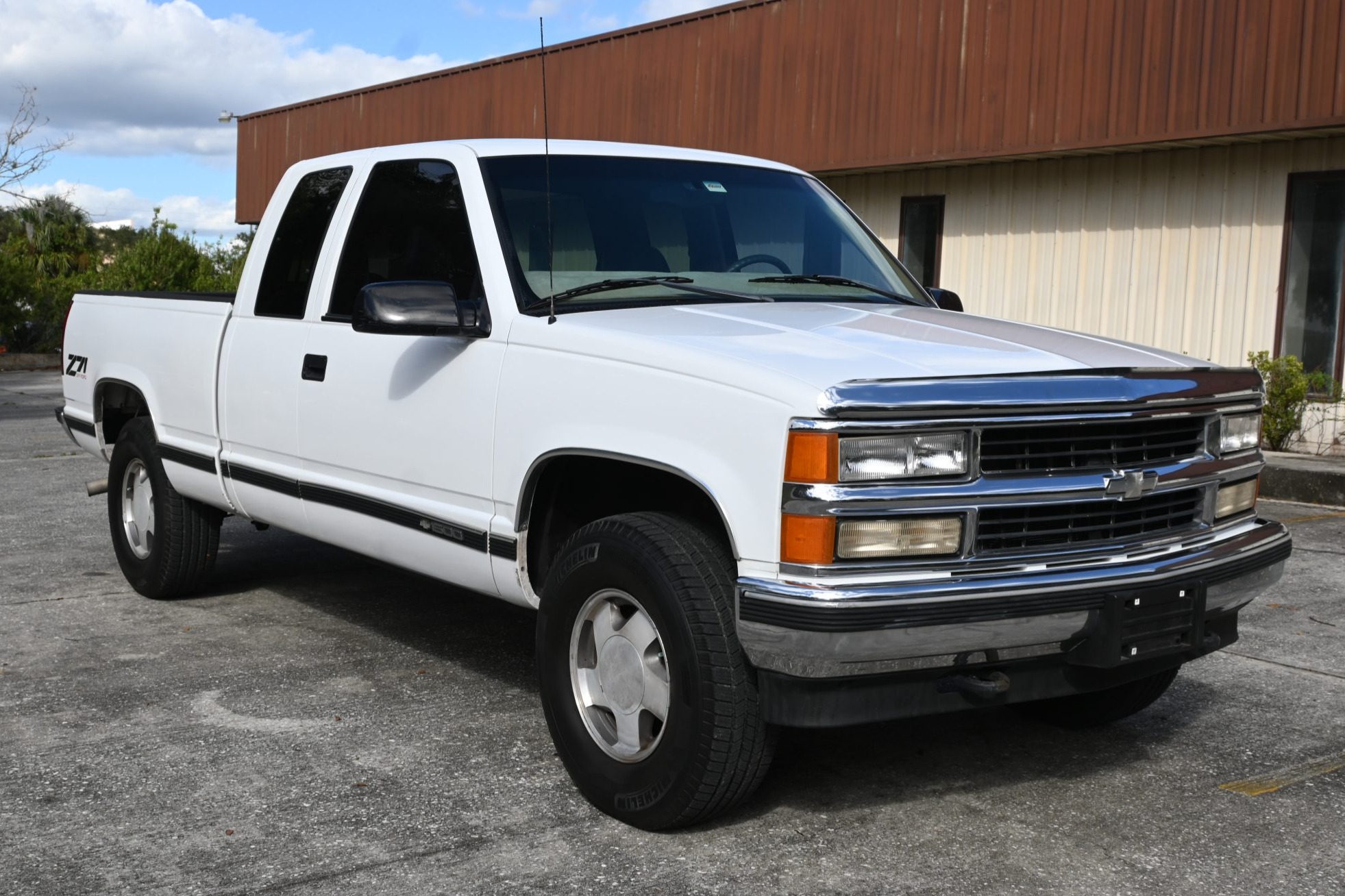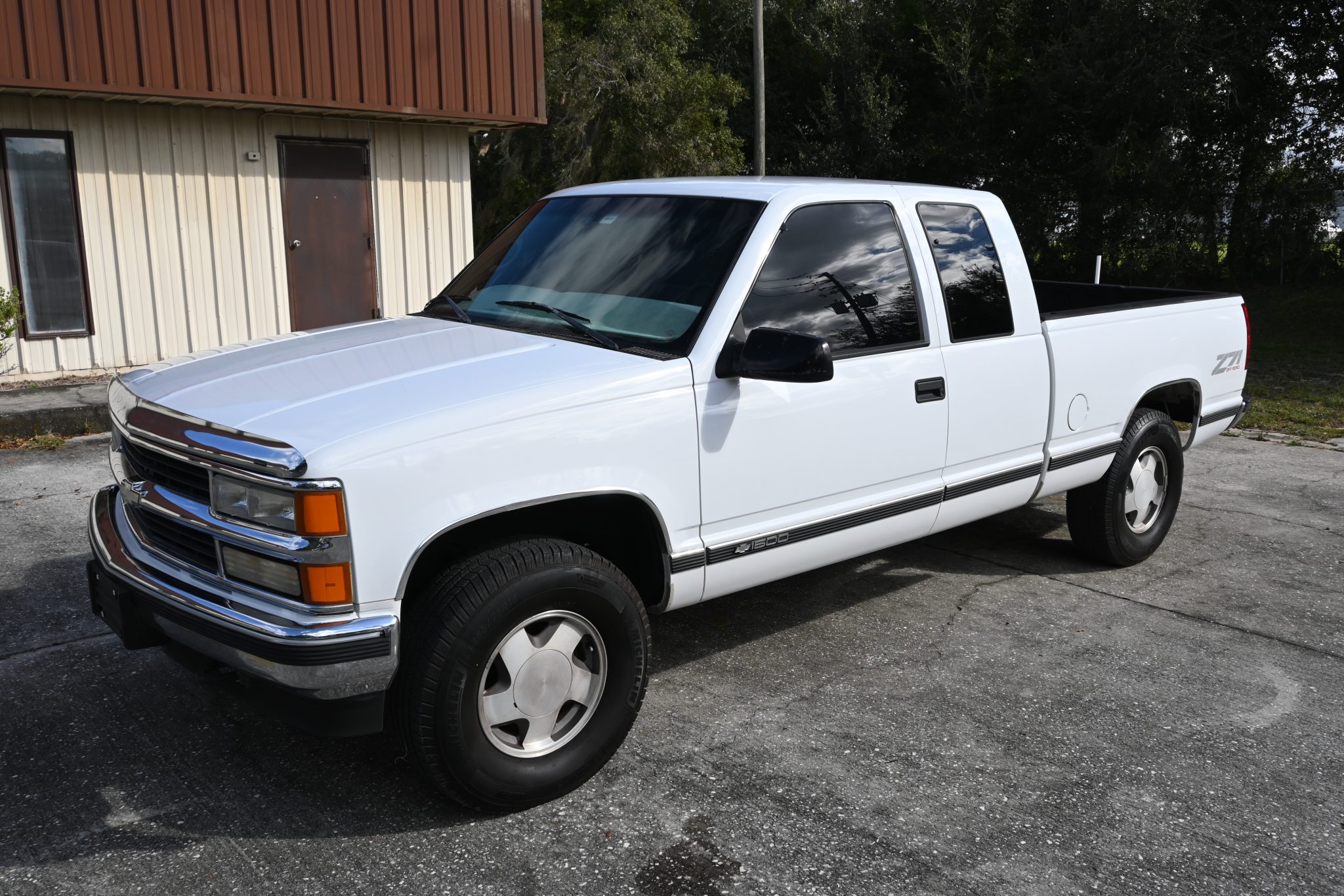 This 1999 Chevrolet Silverado K1500 LS is an extended-cab 4×4 pickup The truck is powered by a 5.7-liter Vortec V8 linked to a four-speed automatic transmission and a dual-range transfer case, and it is finished in Summit White over Oak leather. Equipment includes the Z71 Off-Road package, 16″ aluminum wheels, a bed liner, a receiver hitch, a power-adjustable driver’s seat, power windows and door locks, a CD stereo, cruise control, and air conditioning.