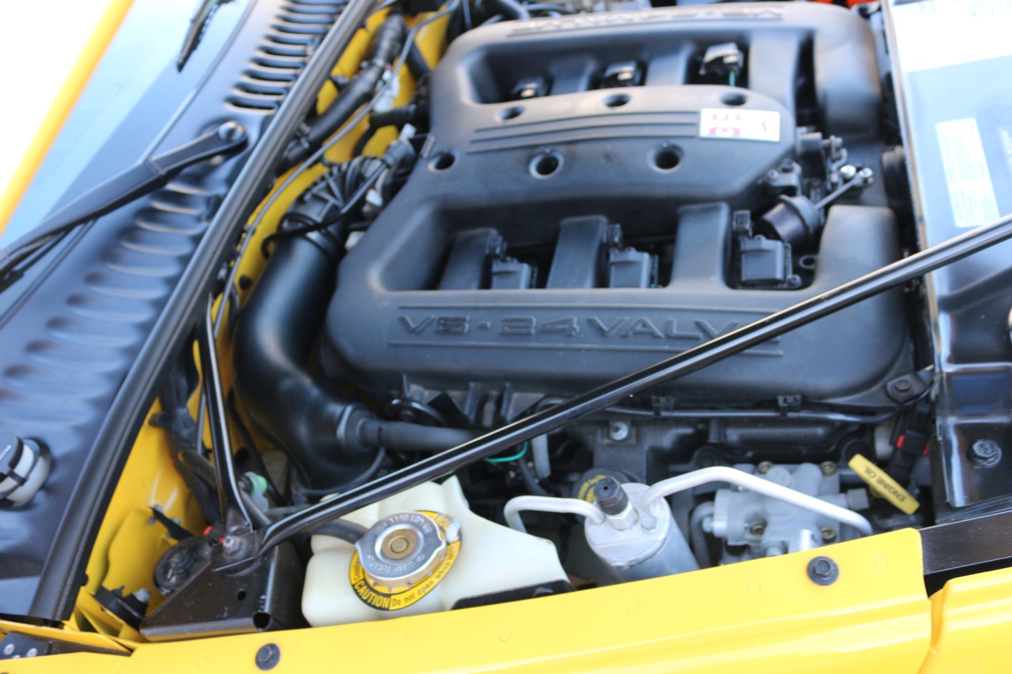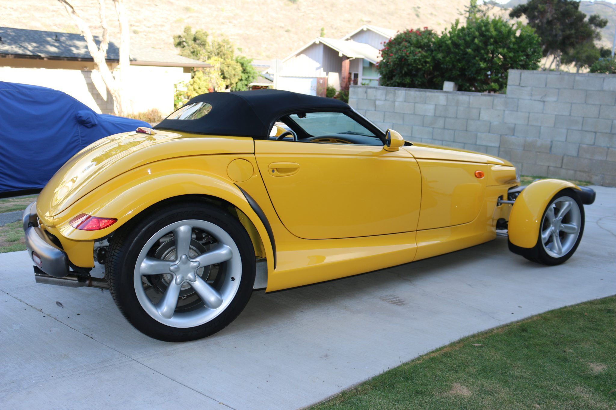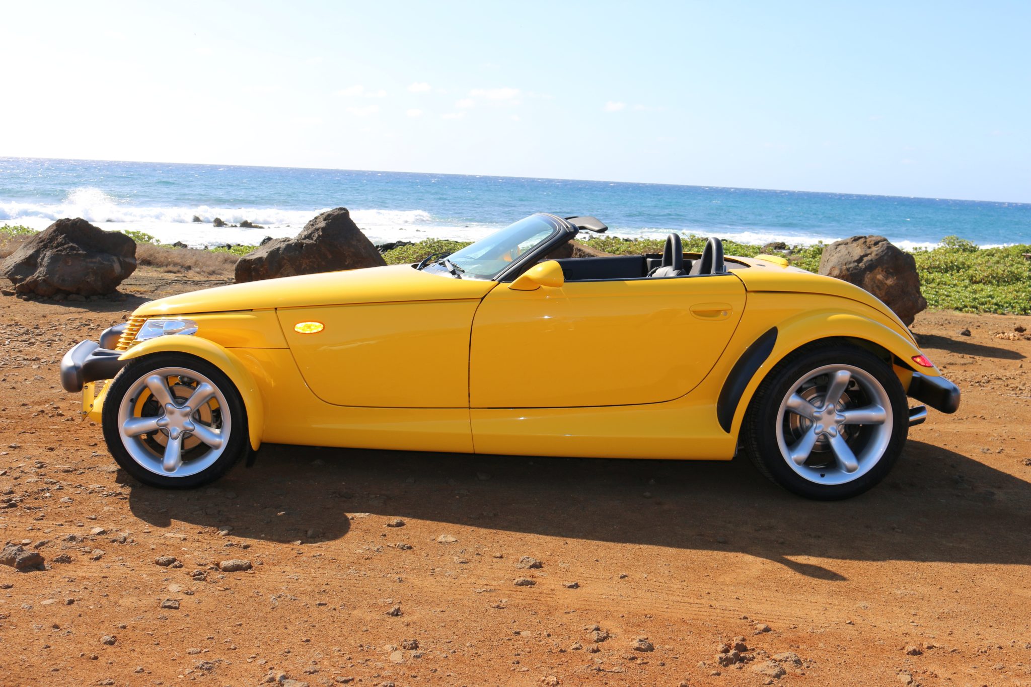 The car is powered by a 3.5-liter V6 paired with a four-speed automatic transaxle and is finished in Prowler Yellow over Agate leather. Equipment includes staggered-diameter five-spoke wheels, a black convertible soft top, air conditioning, cruise control, an Infinity sound system, and an AM/FM/cassette stereo with a CD changer.