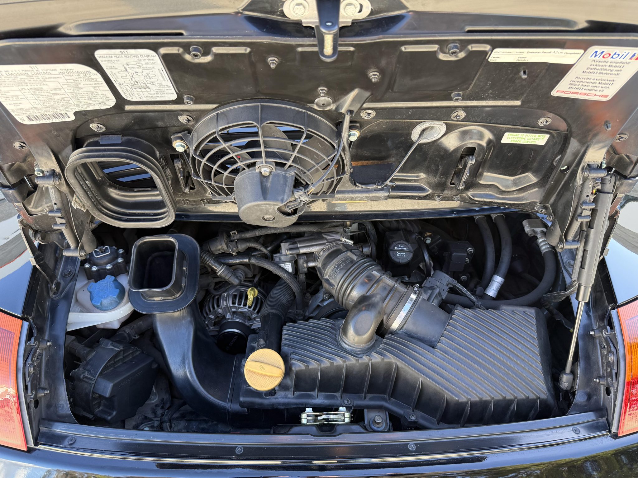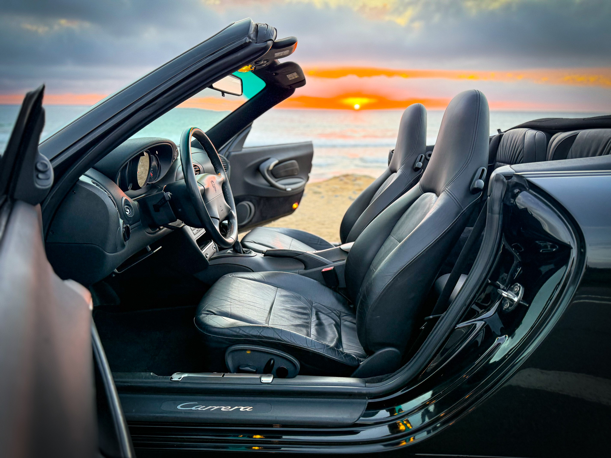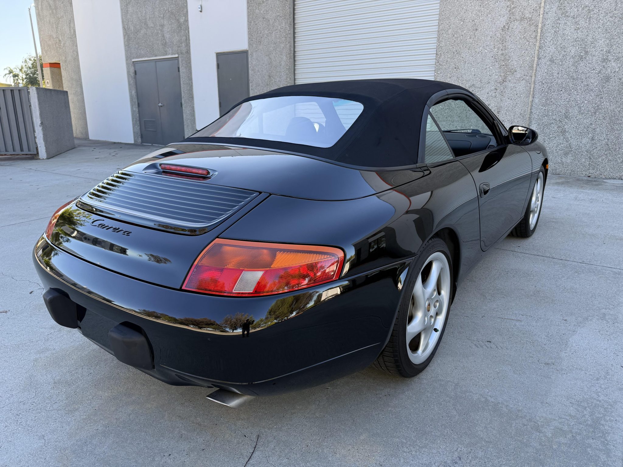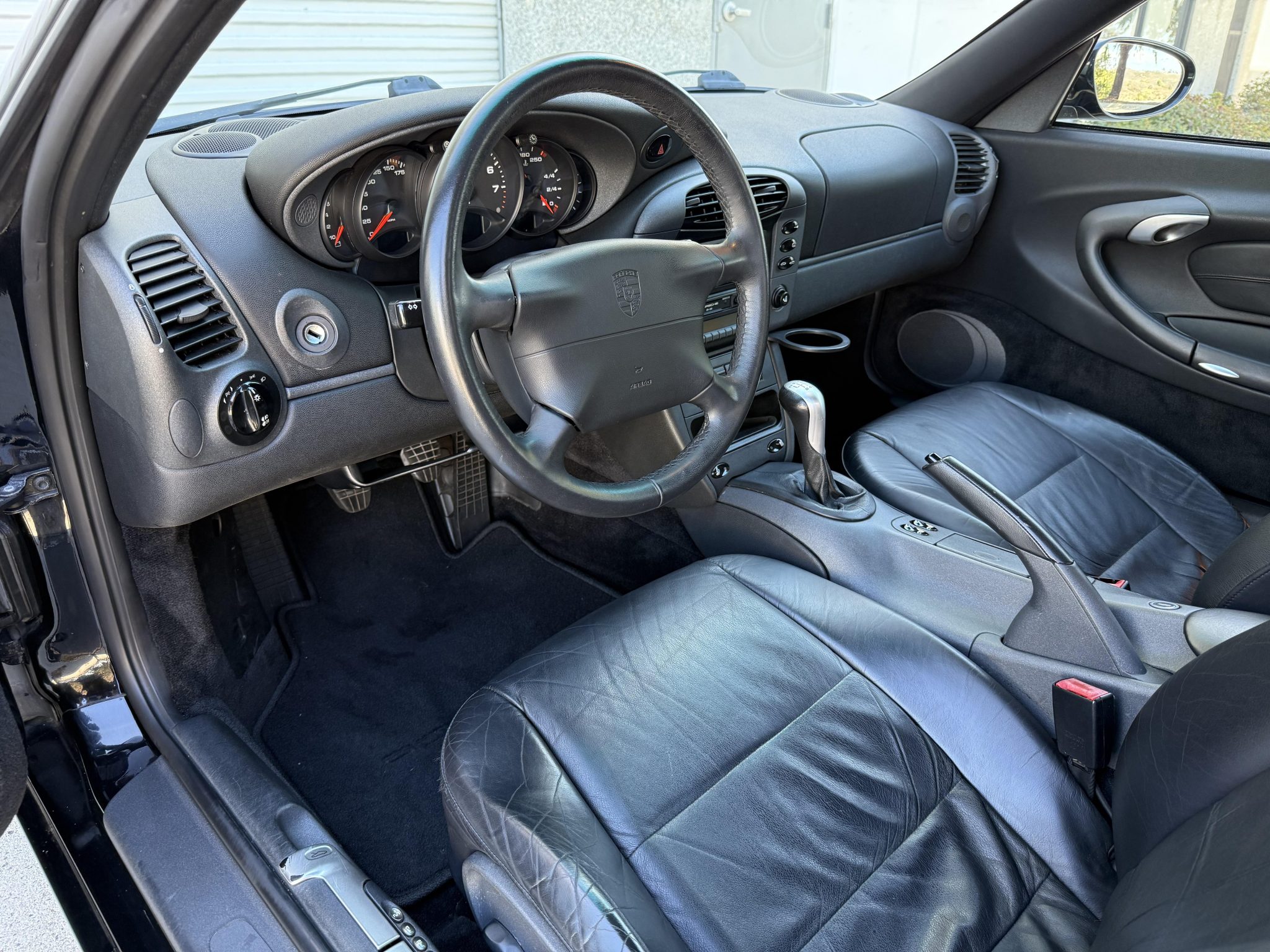 This 1999 Porsche 911 Carrera is an early-production cabriolet that is powered by a 3.4-liter flat-six paired with a six-speed manual transaxle, and it now has 45k miles. Finished in black over black leather, the car is equipped with a black soft top, 18″ Technology hollow-spoke wheels, a deployable rear spoiler, integrated fog lights, a Becker-Porsche CR-210 stereo, a Hi-Fi audio system, a remote six-disc CD changer, automatic climate control, heated power-adjustable seats, and cruise control.