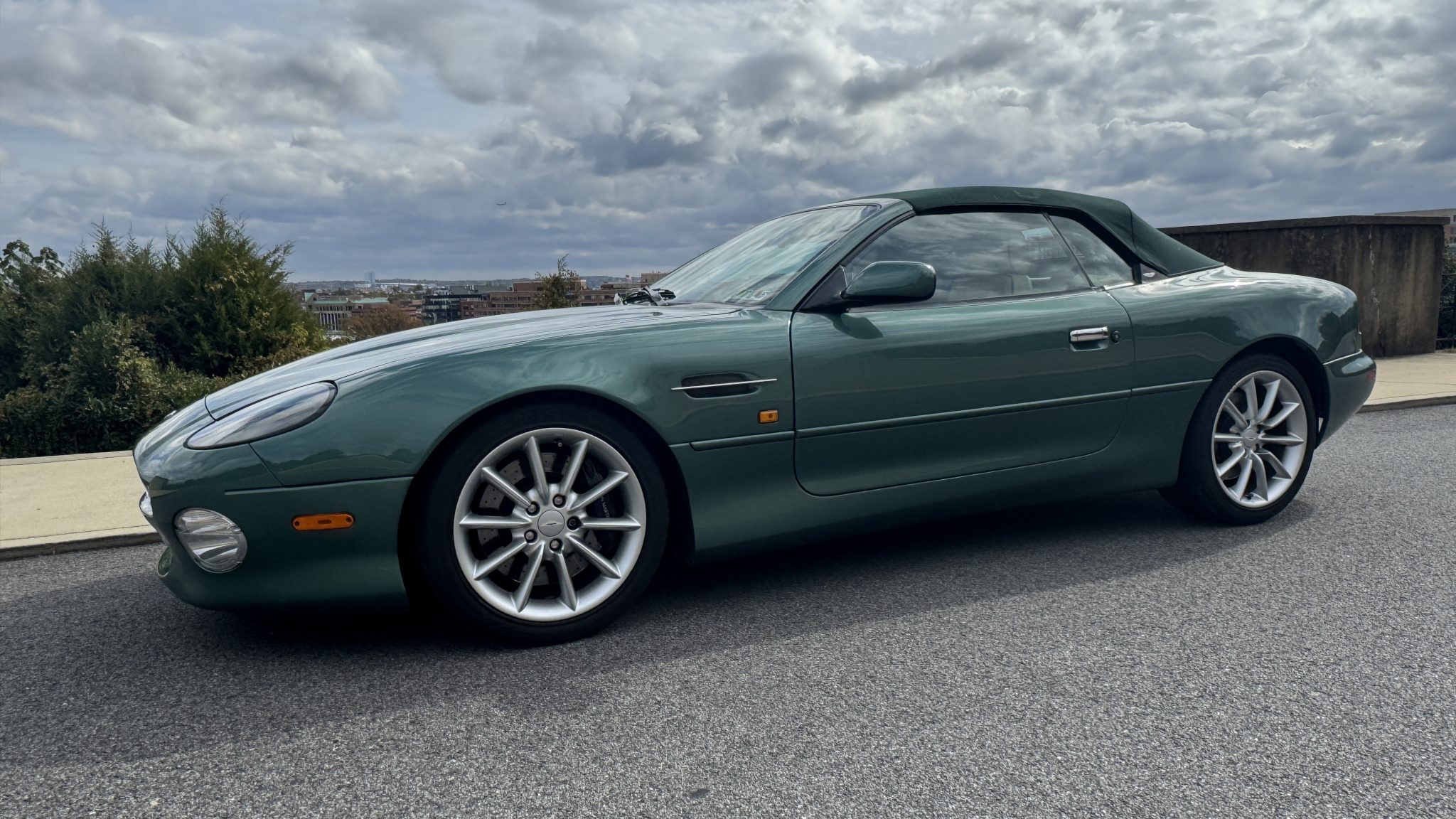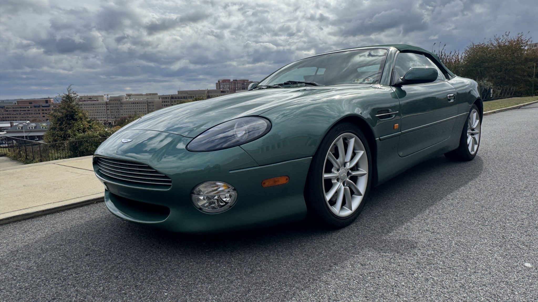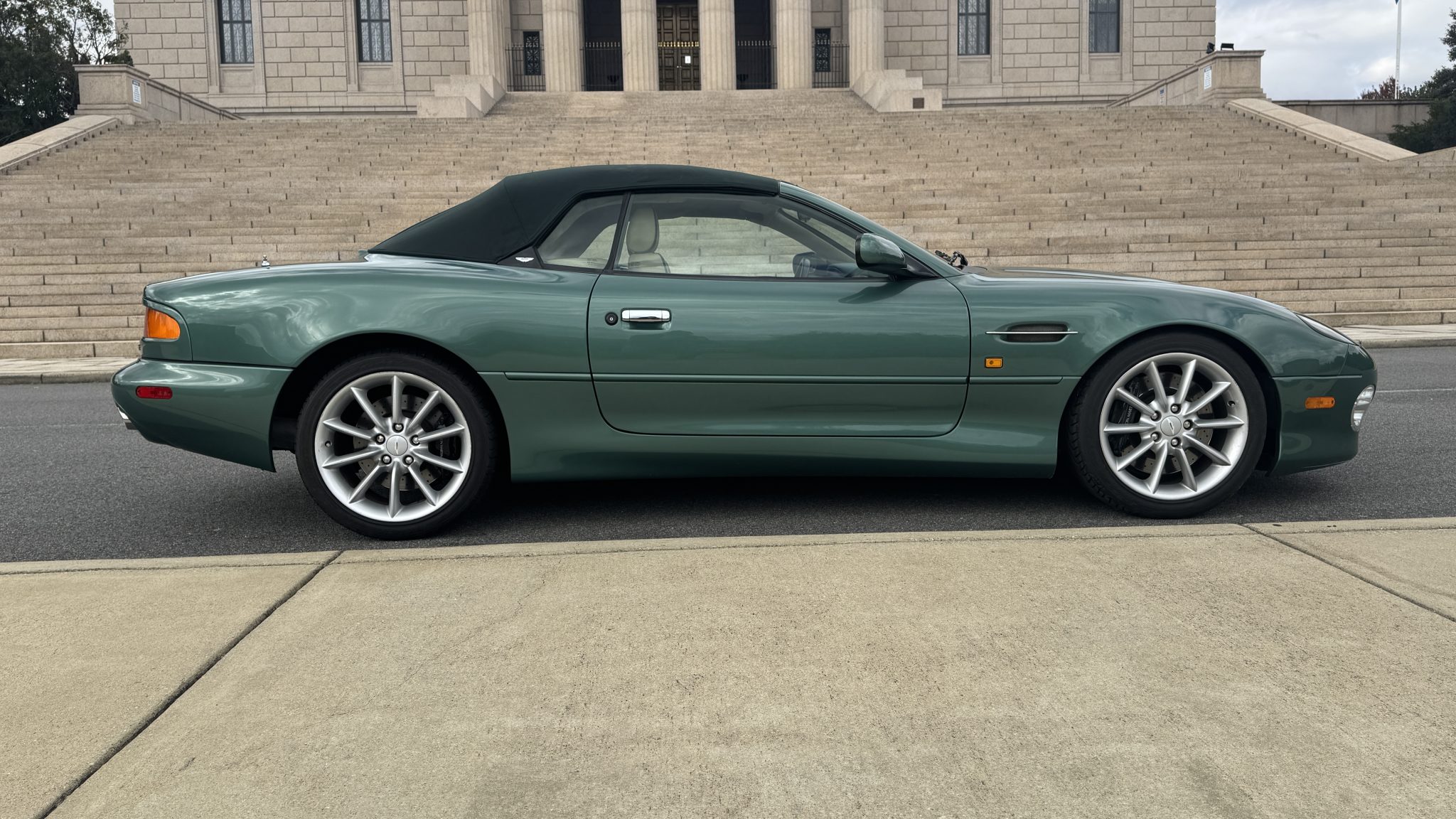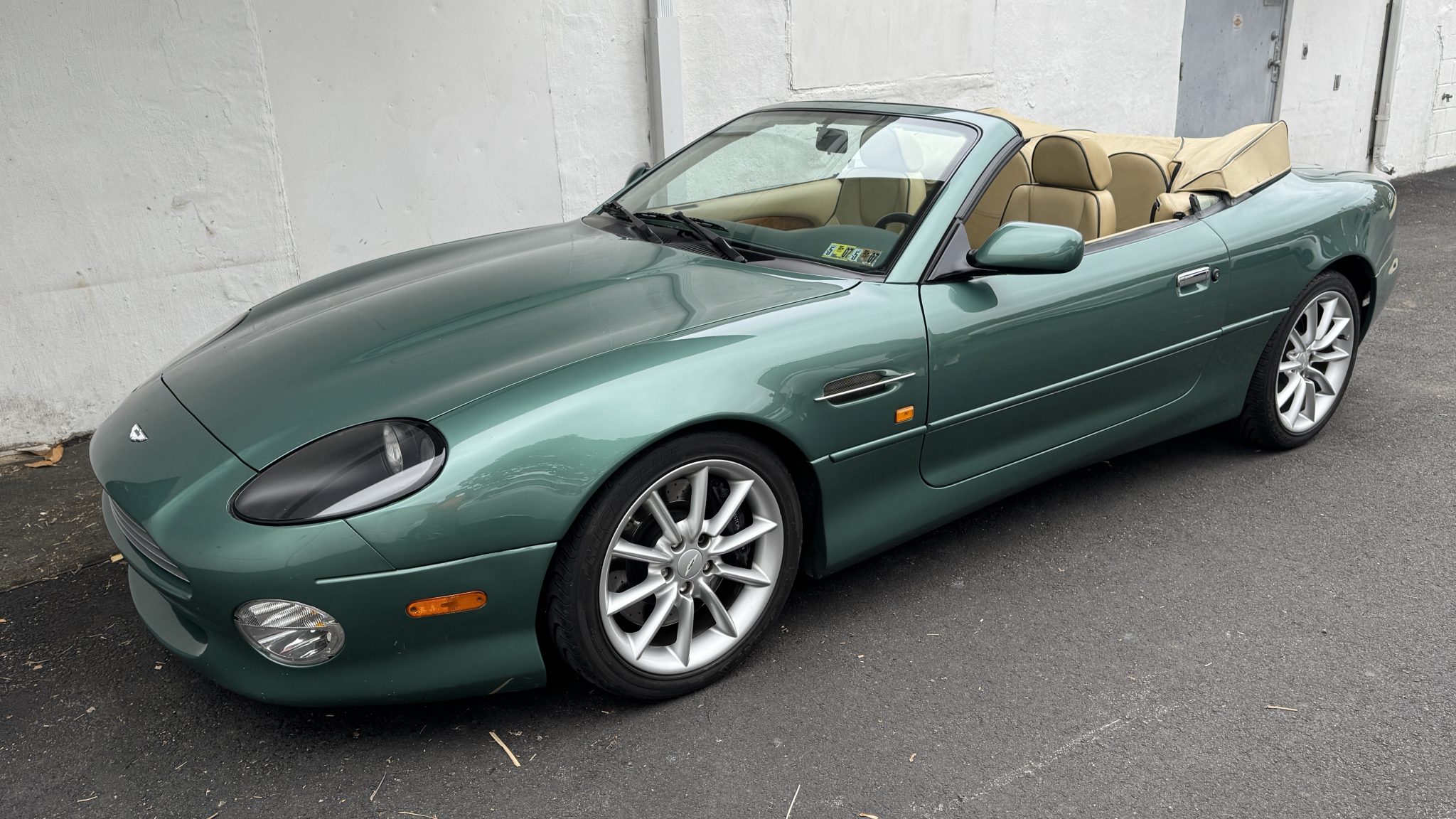 This 2000 Aston Martin DB7 V12 Vantage Volante is powered by a 5.9-liter V12 paired with a five-speed automatic transmission and is finished in Aston Martin Racing Green over beige leather. The car rides on 18″ 10-spoke alloy wheels and is further equipped with a green soft top, a beige top boot, fog lights, heated and power-adjustable front seats, dual-zone automatic climate control, and power windows, locks, and mirrors.