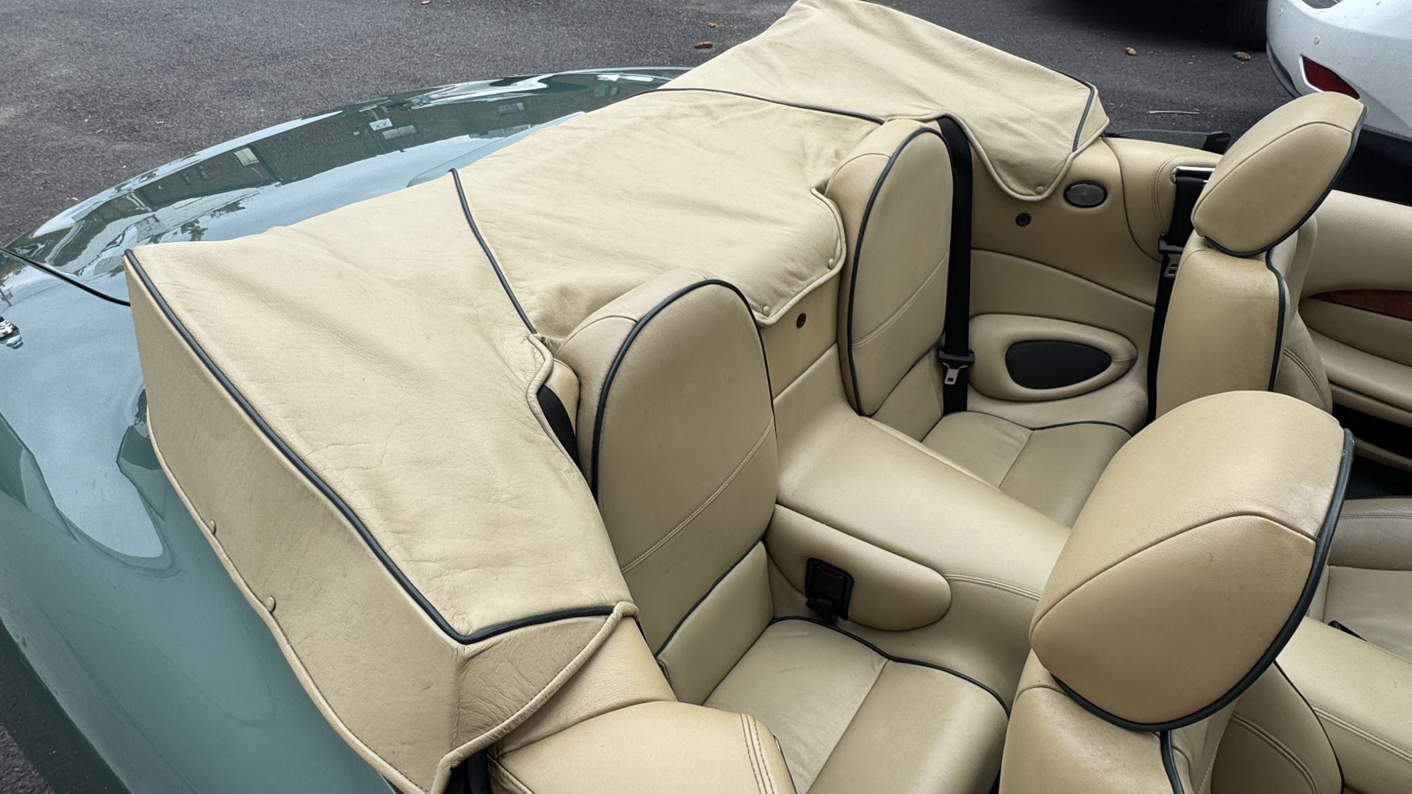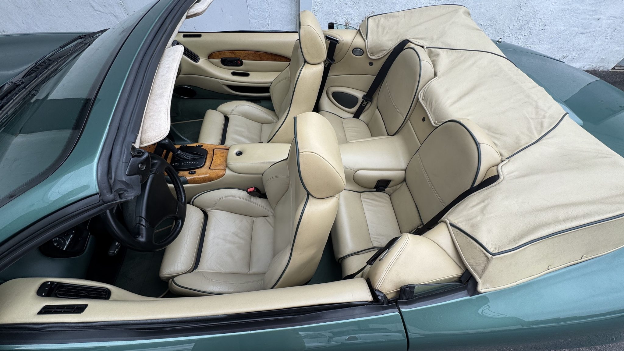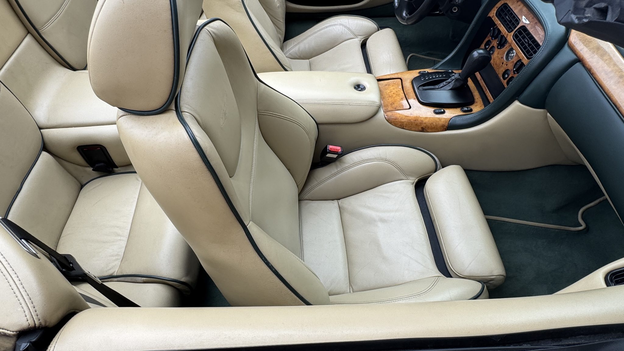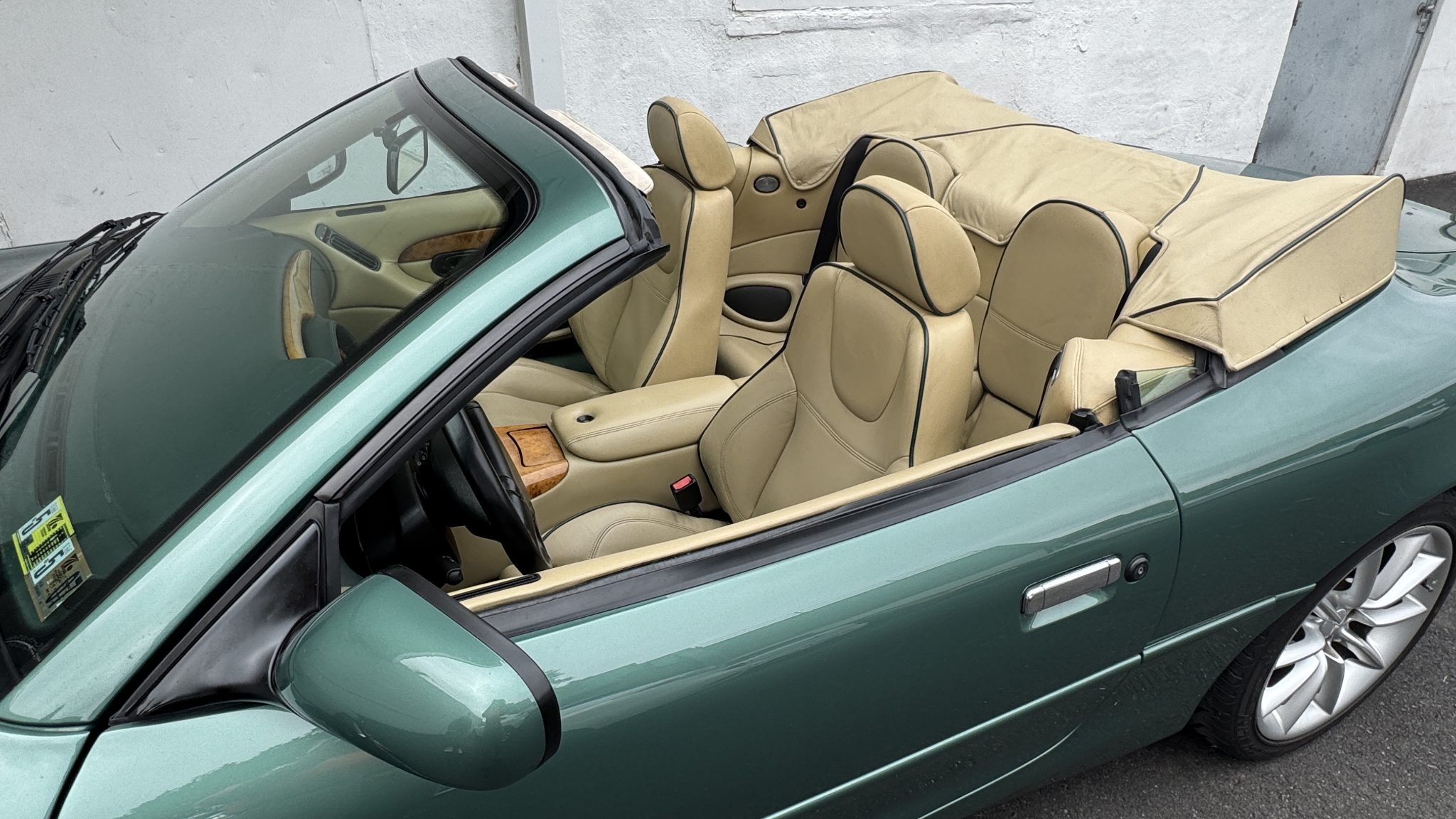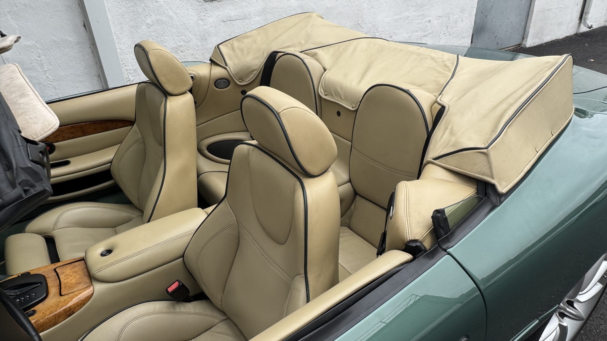 This 2000 Aston Martin DB7 V12 Vantage Volante is powered by a 5.9-liter V12 paired with a five-speed automatic transmission and is finished in Aston Martin Racing Green over beige leather. The car rides on 18″ 10-spoke alloy wheels and is further equipped with a green soft top, a beige top boot, fog lights, heated and power-adjustable front seats, dual-zone automatic climate control, and power windows, locks, and mirrors.