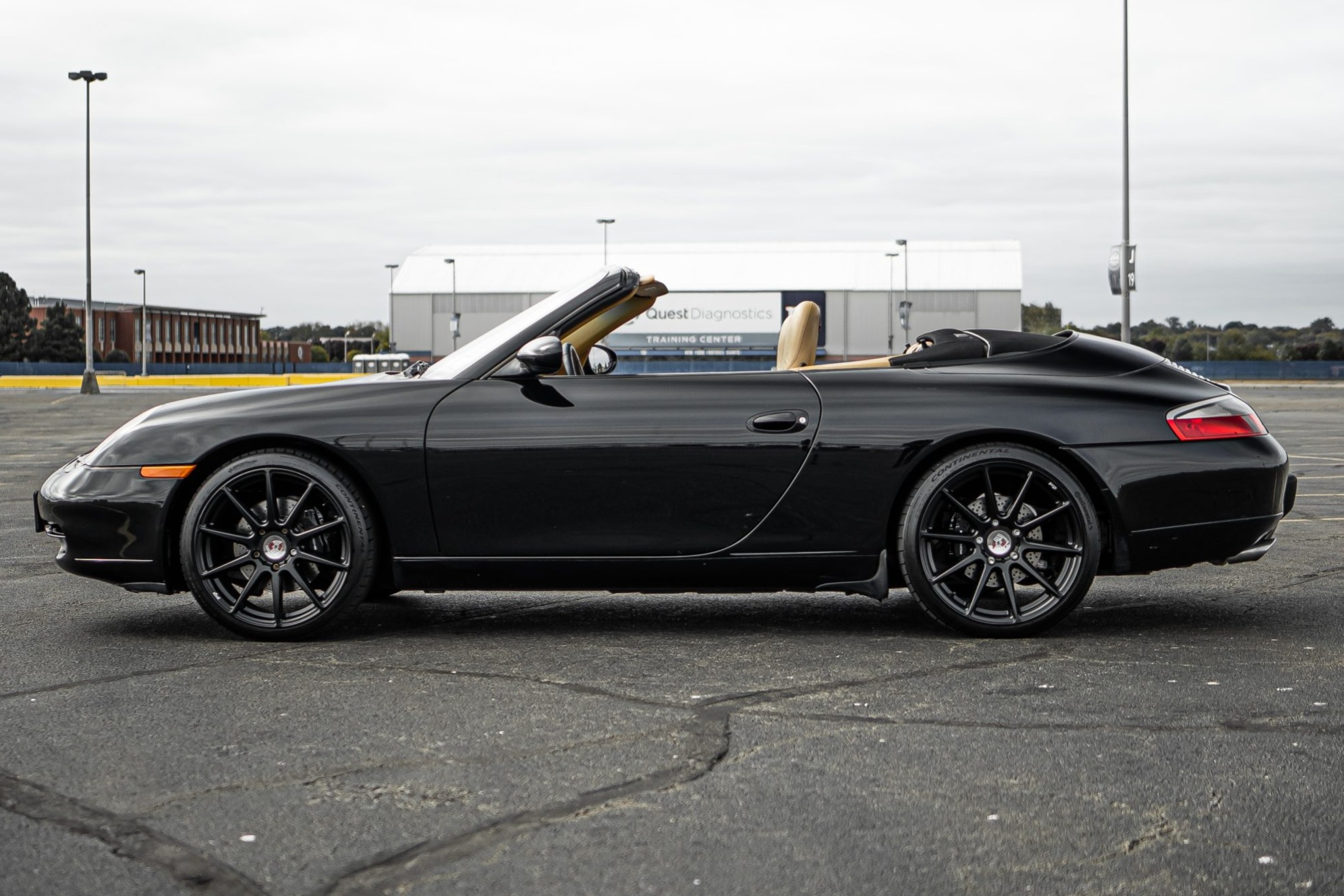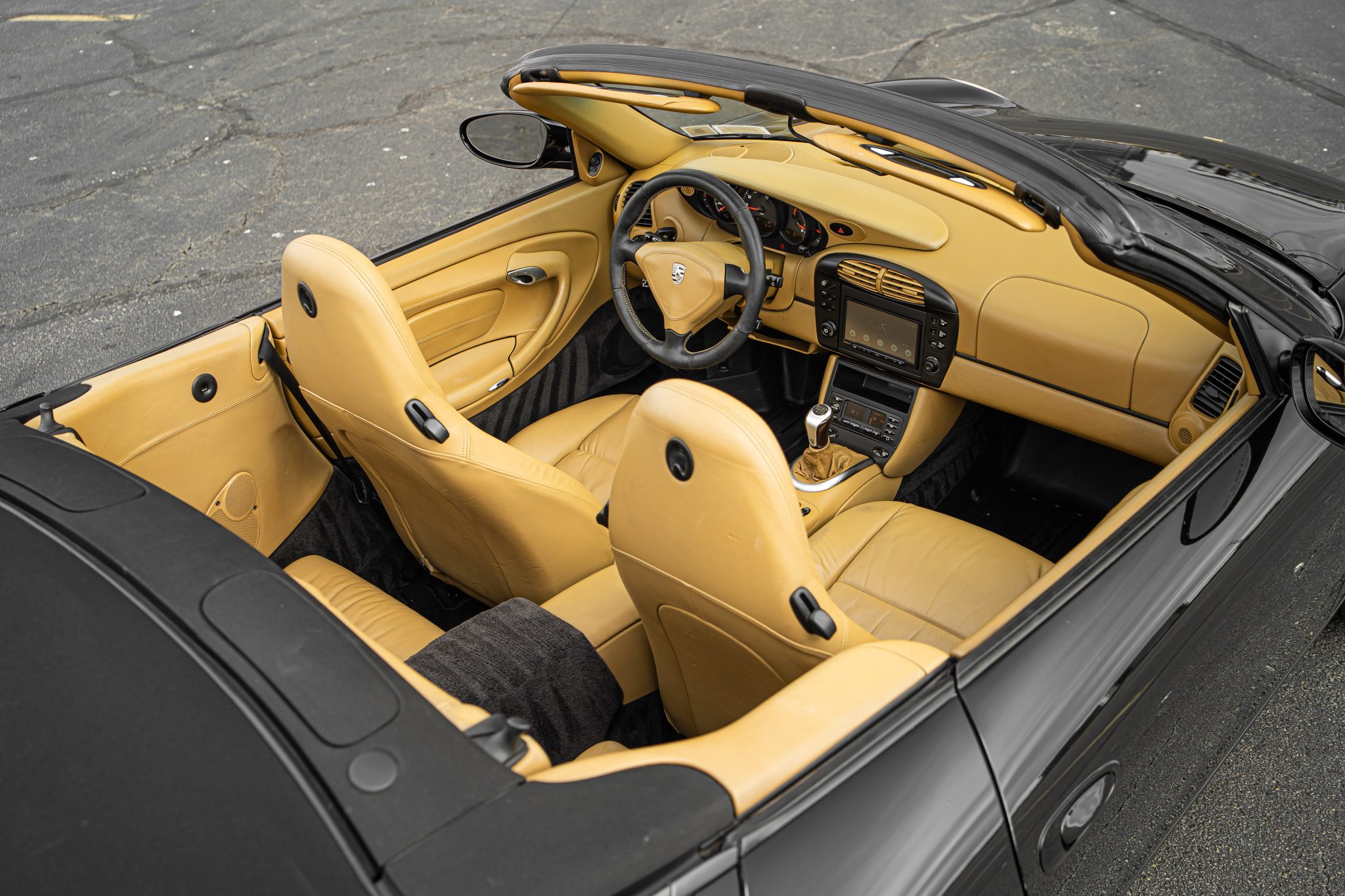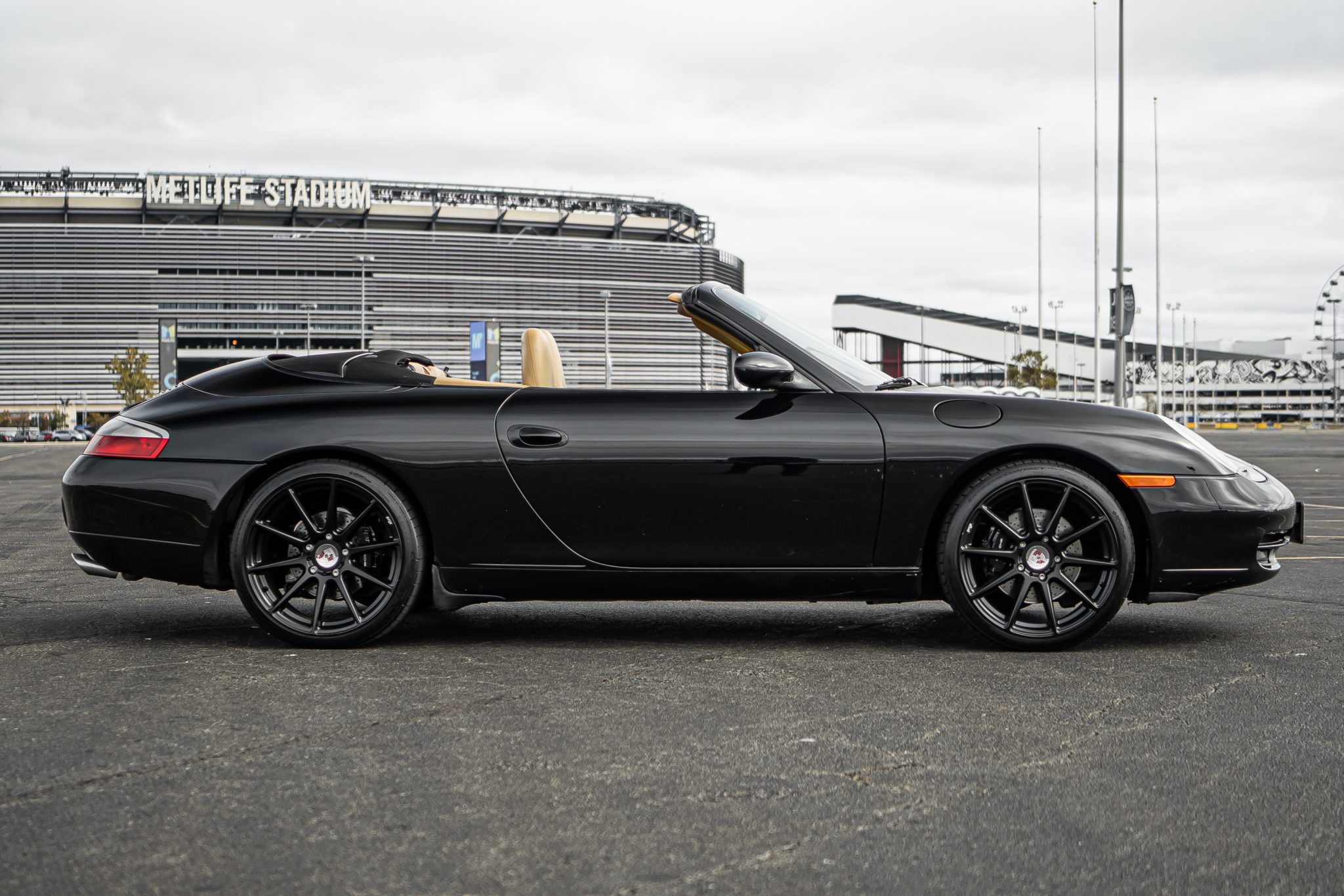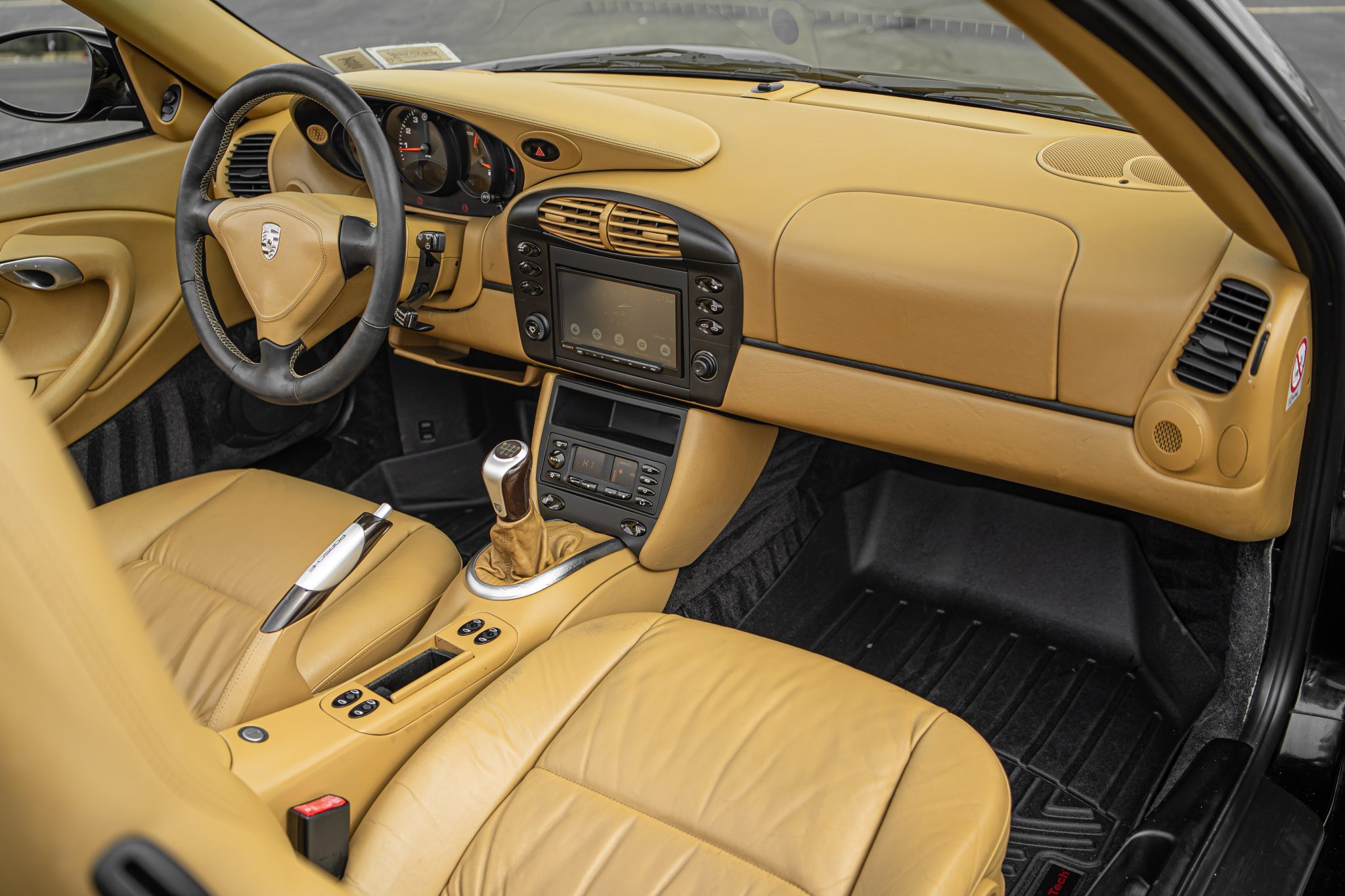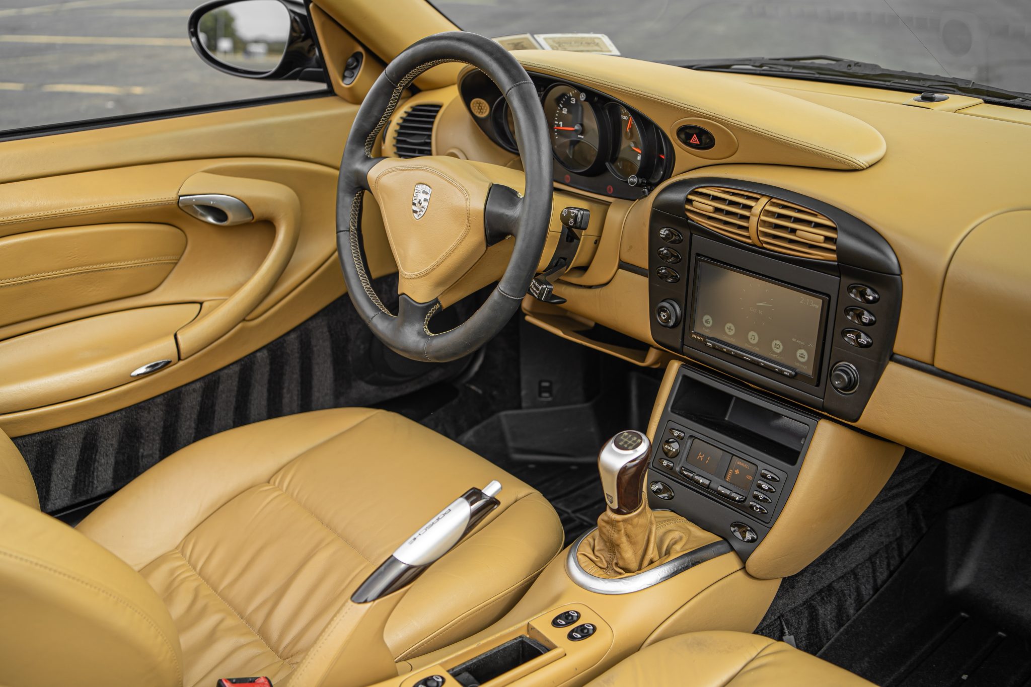 This 2000 Porsche 911 Carrera cabriolet is powered by a 3.4-liter M96 flat-six paired with a six-speed manual transaxle Subsequent maintenance consisted of rebuilding the top hydraulic pump, replacing assorted suspension components, trimming the steering wheel in black leather, and replacing assorted interior trim. Work in 2022 included replacing the IMS bearing, rear main seal, clutch, fuel filter, accessory drive belt, spark plugs, and coil packs. Finished in black over Savannah Beige full leather and black carpeting, the car has a speed-activated rear spoiler, a replacement black soft top, 19″ Niche alloy wheels, xenon headlights, heated power-adjustable seats, a Sony touchscreen stereo, and automatic climate control.