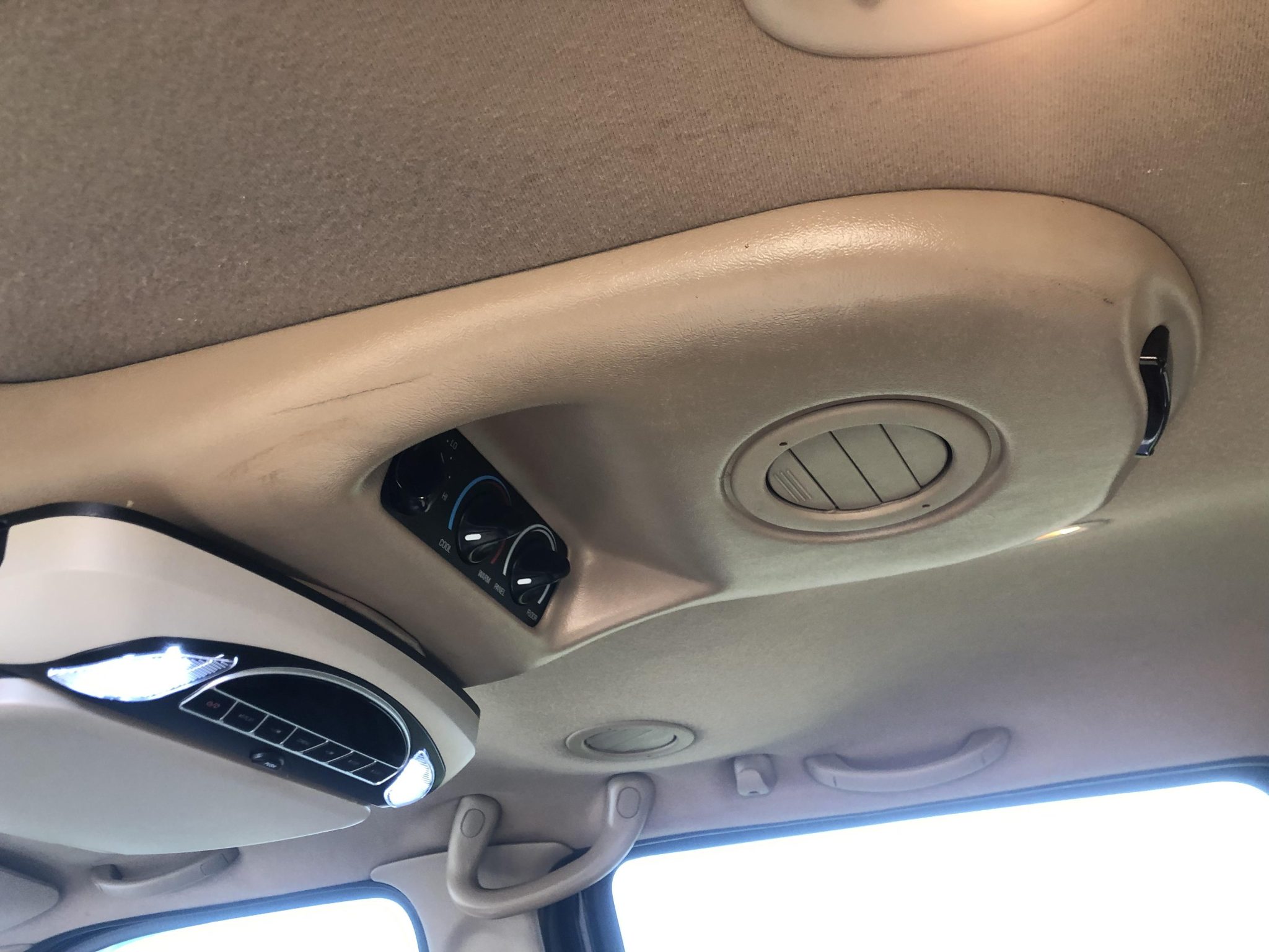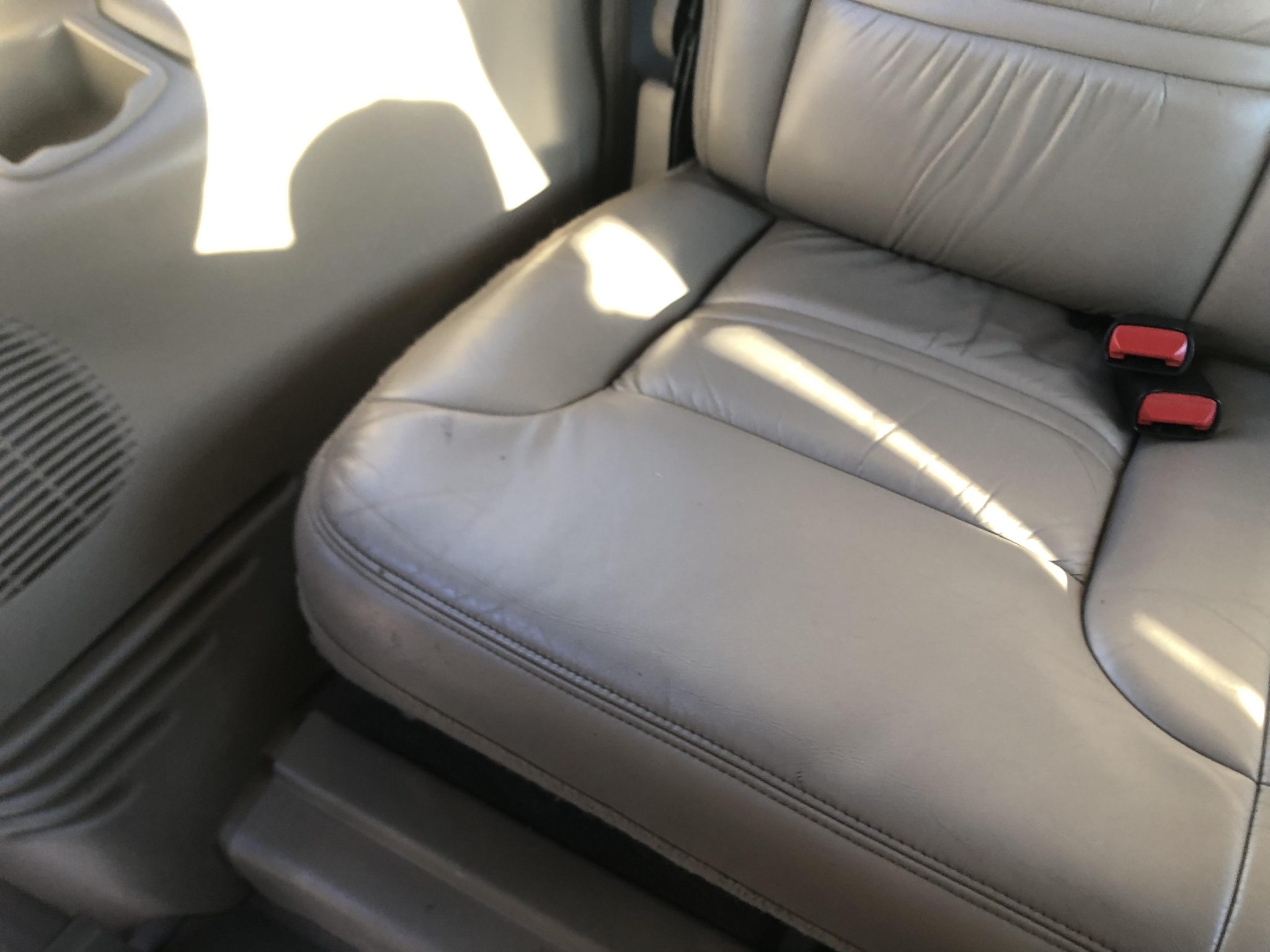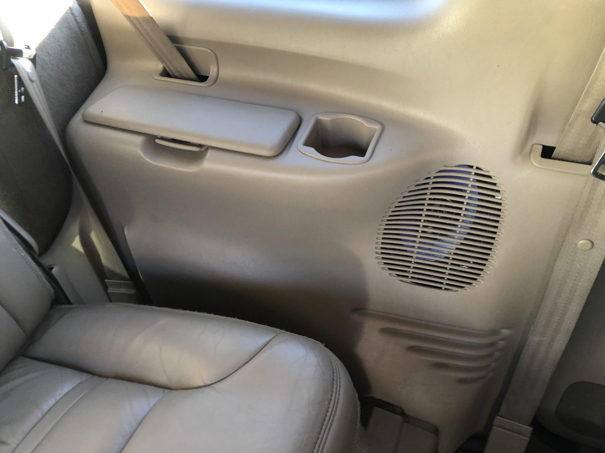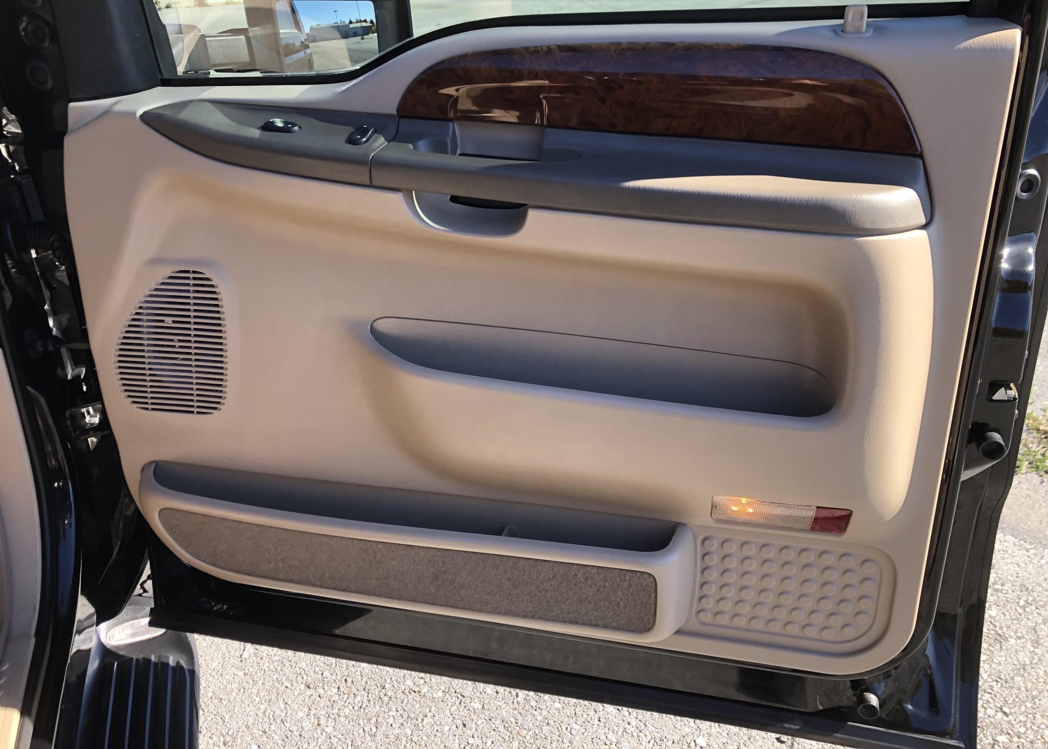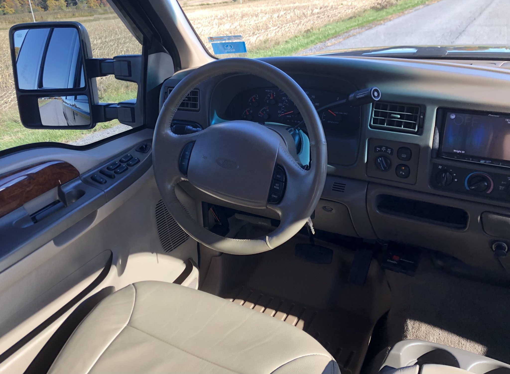 Power is provided by a 7.3-liter Power Stroke turbodiesel V8 linked with a four-speed automatic transmission and a dual-range transfer case, and the truck is finished in Black over Medium Parchment leather. Features include a lifted ride height, 16″ eight-hole alloy wheels, manually locking front hubs, heated front seats, a Pioneer touchscreen, a rear-seat entertainment system, and a rearview camera. This Excursion now shows 142k miles