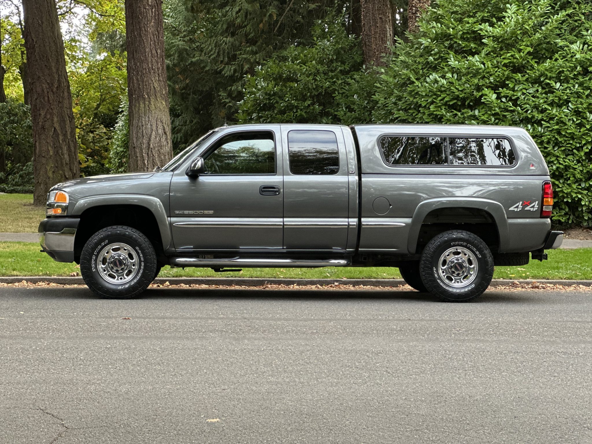 This 2001 GMC Sierra 2500HD SLT 4×4 Extended Cab pickup has 122k miles Power is provided by an 8.1-liter Vortec V8 linked to a five-speed automatic transmission, a push-button dual-range transfer case, and a locking rear differential, and the truck is finished in Storm Gray Metallic over a Graphite leather interior. Equipment includes Westin side steps, a Leer bed topper, a receiver hitch, 16″ 10-hole polished aluminum wheels, heated power-adjustable front bucket seats, a CD/cassette stereo, cruise control, and air conditioning.