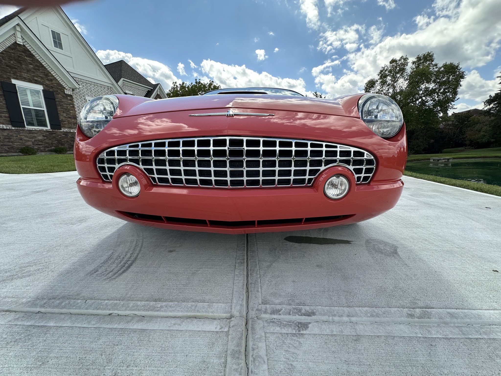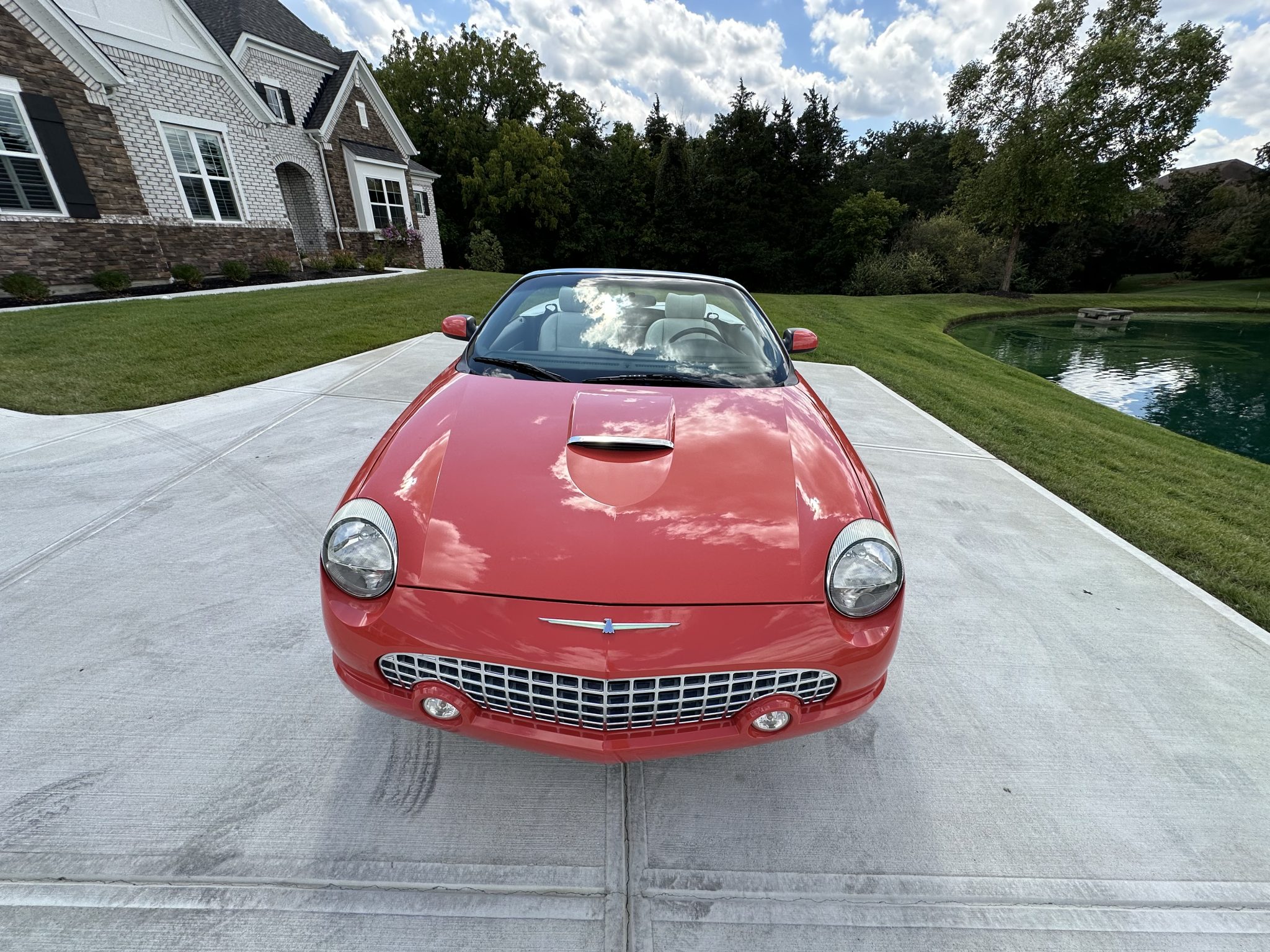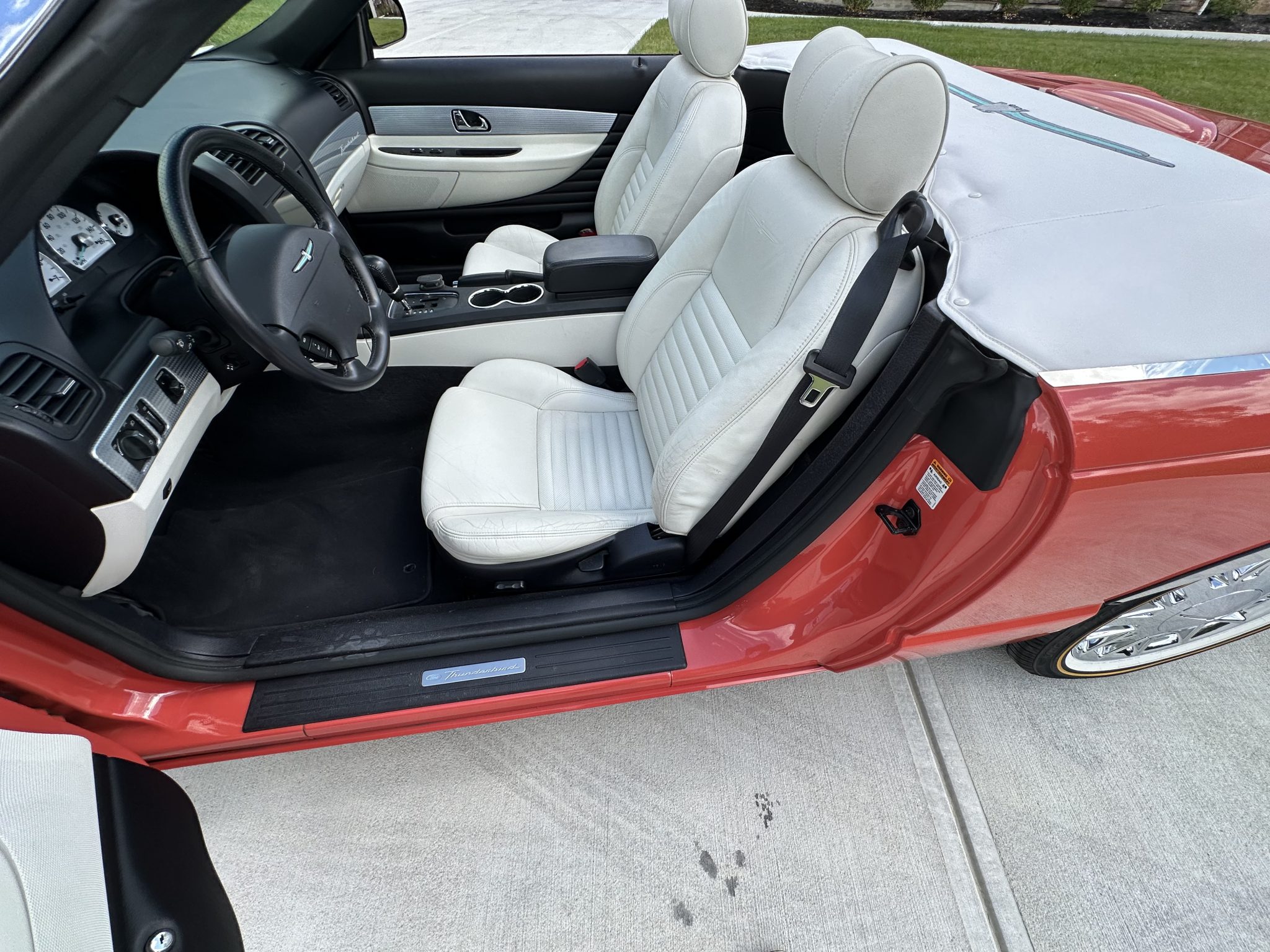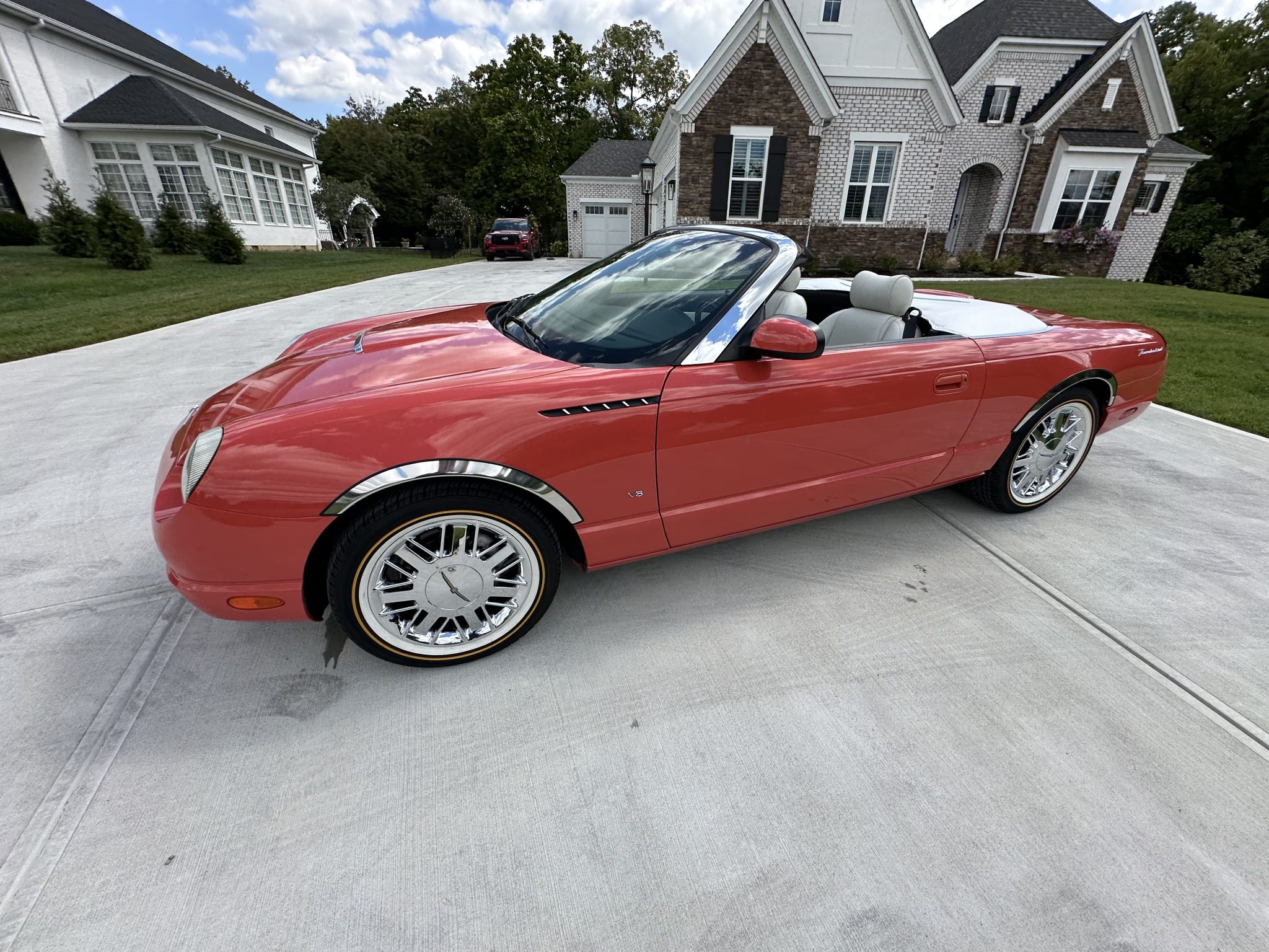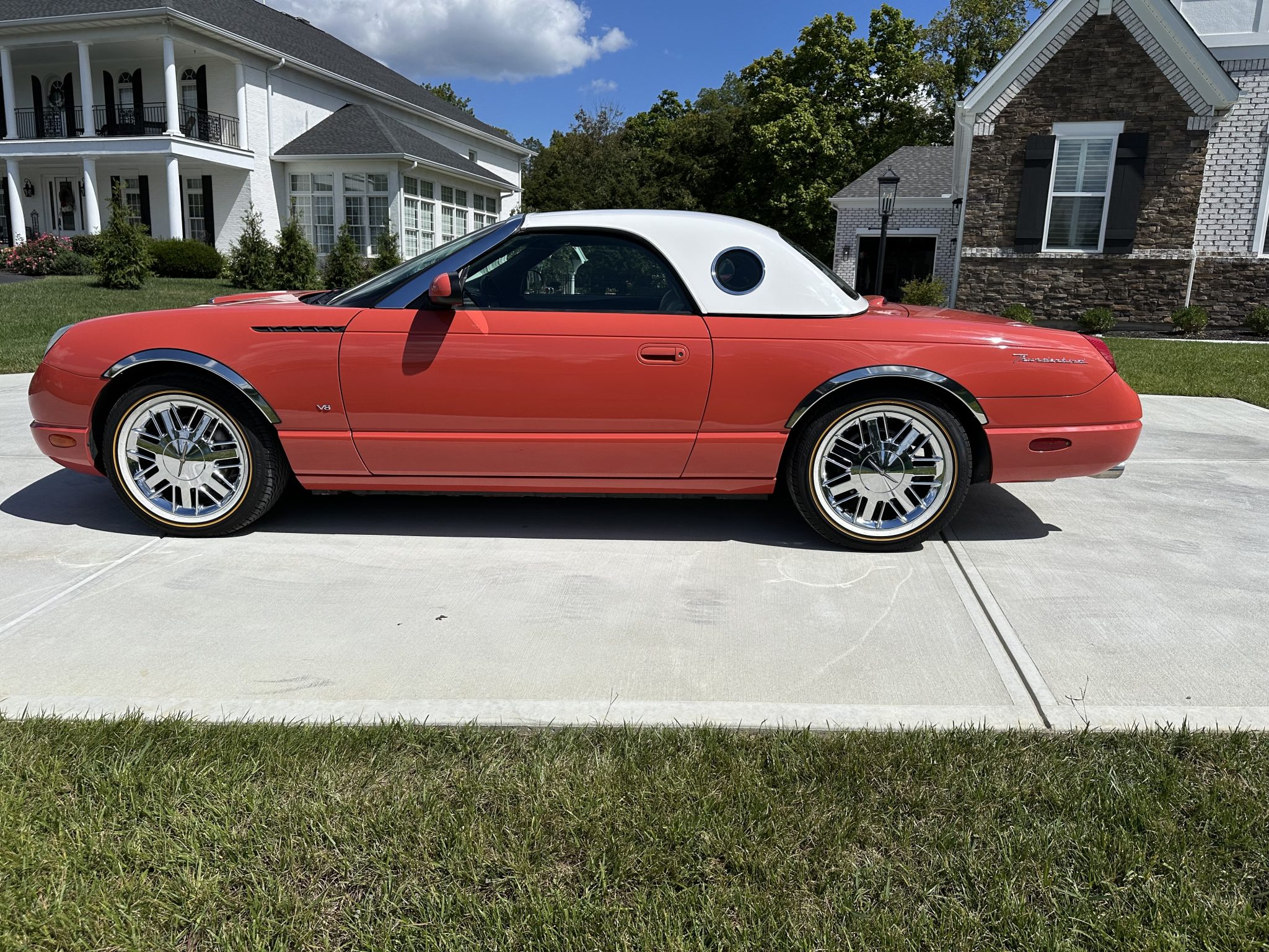 The car is powered by a 3.9-liter V8 paired with a five-speed automatic transmission, and it has been fitted with a Borla exhaust system, a K&N intake, and a Kenwood head unit. Finished in Coral over white leather, the car is also equipped with a Midnight Black soft top, a Performance White removable hardtop, traction control, 17″ chrome-finished Deluxe wheels, “007” badging, integrated fog lights, heated power-adjustable seats, and dual-zone automatic climate control.