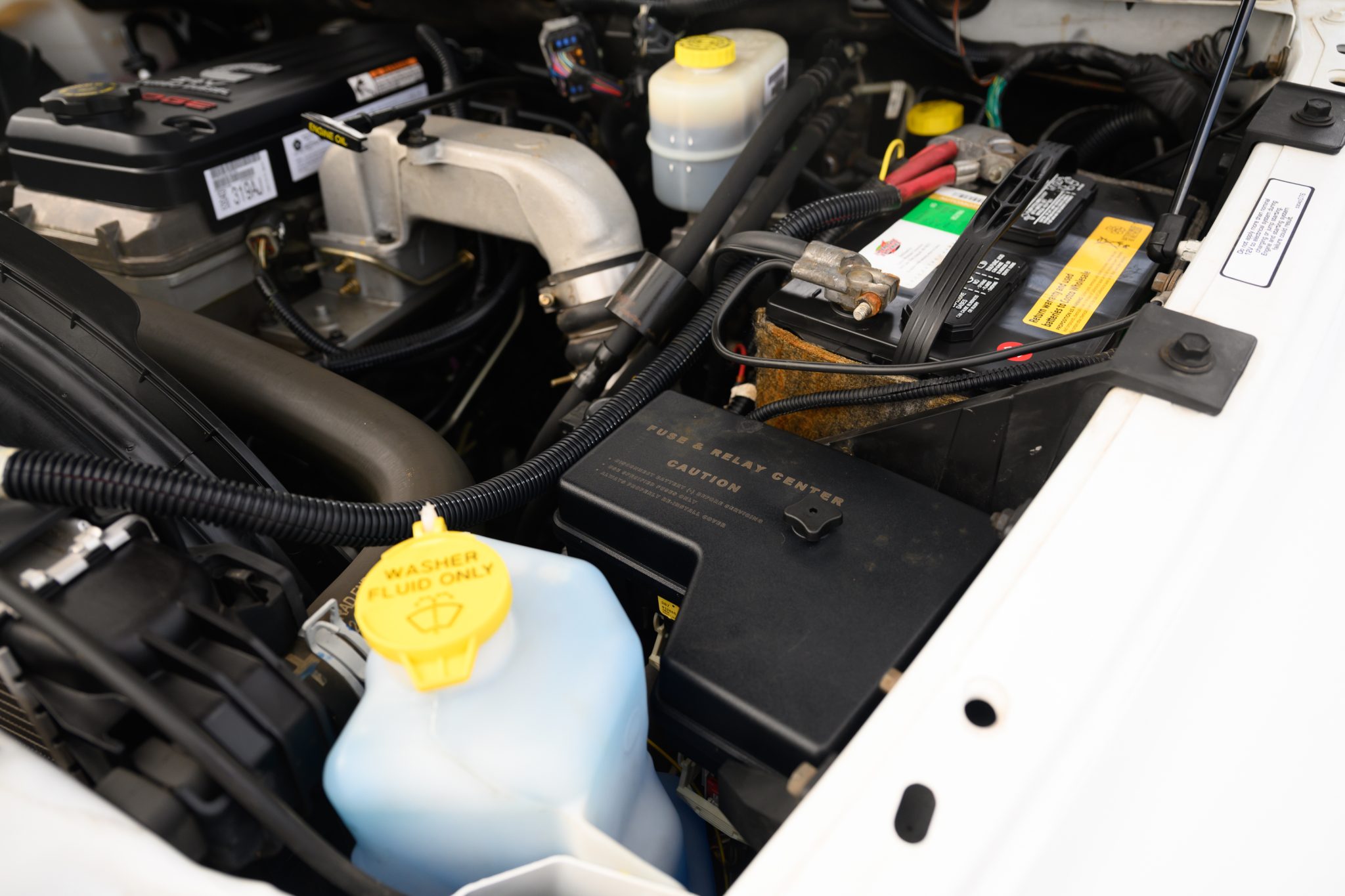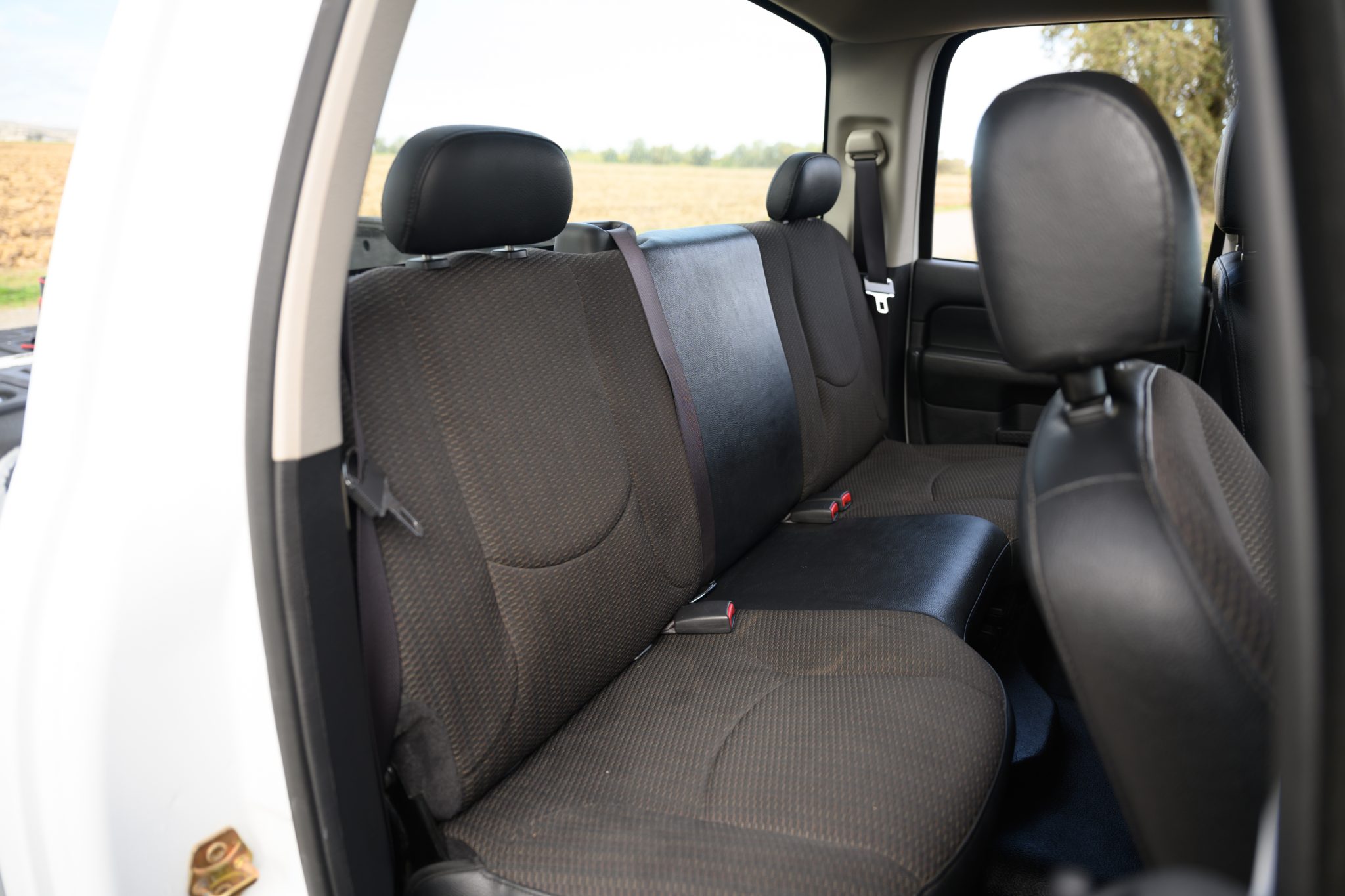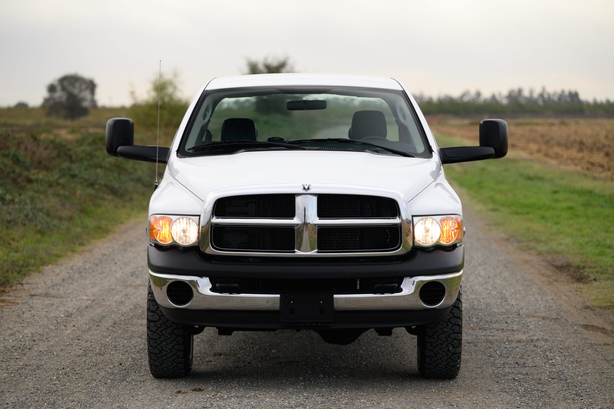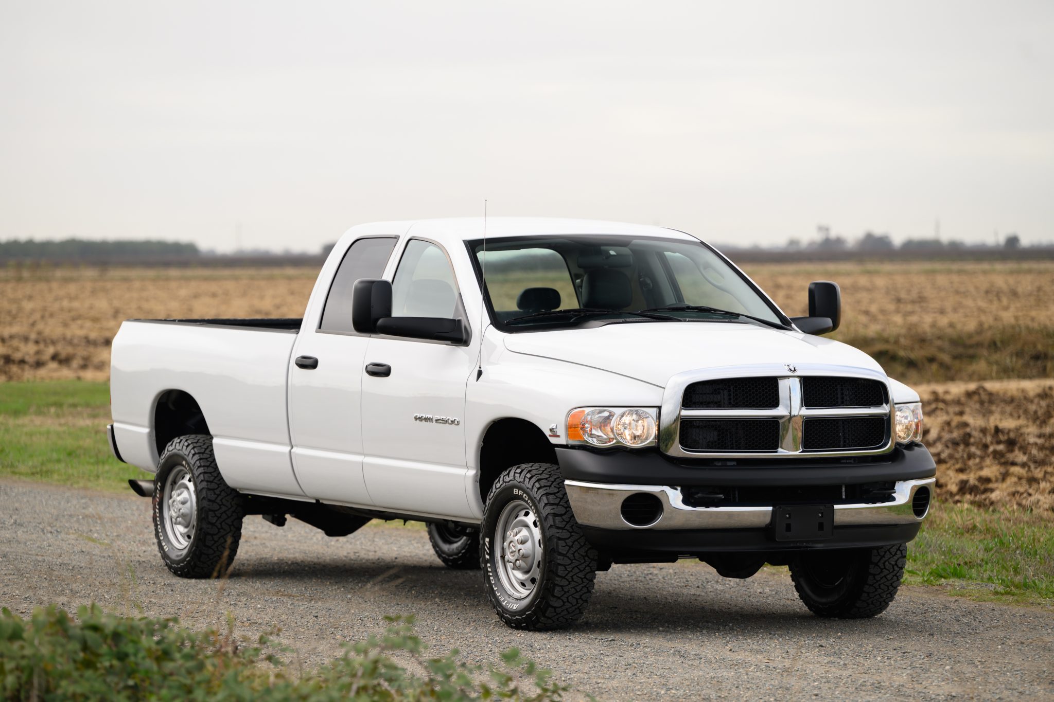 This 2005 Dodge Ram 2500 ST is a quad cab 4×4 that is powered by a 5.9-liter Cummins turbodiesel inline-six paired with a six-speed manual transmission. Finished in Bright White over Dark Slate Gray cloth, it features a limited-slip rear axle, a 35-gallon fuel tank, a block heater, 17″ steel wheels, air conditioning, cruise control, and a cassette stereo.
