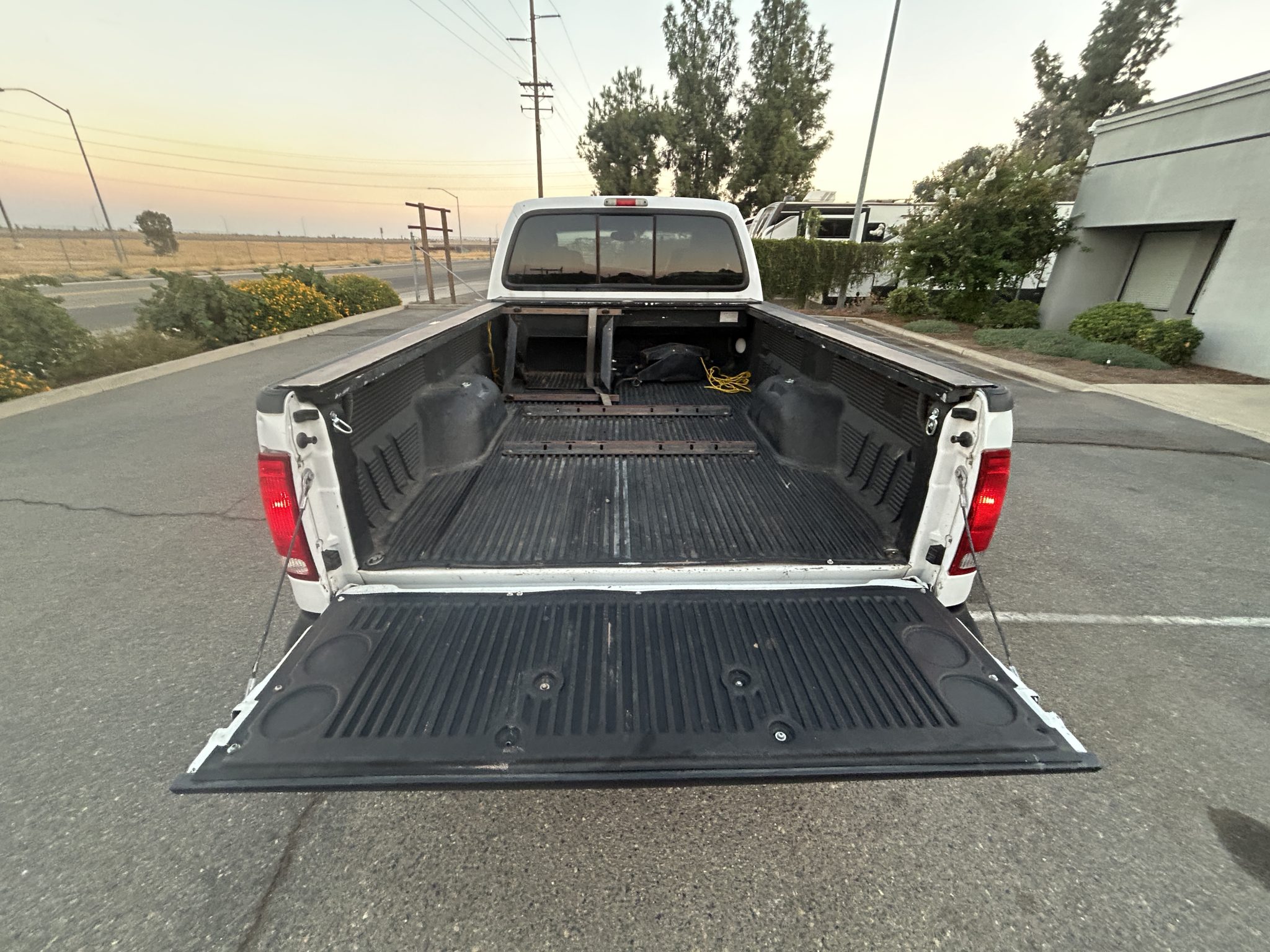 This 2005 Ford F-250 Super Duty Lariat Crew Cab long-bed 4×4 pickup is powered by a 6.0-liter Power Stroke turbodiesel V8 that drives the rear or all four wheels through a five-speed automatic transmission and a dual-range transfer case. The truck is finished in two-tone Oxford White and grey over Medium Flint leather, and features include tubular side steps, telescoping trailer mirrors, a tonneau cover, a receiver hitch, 17″ alloy wheels, automatic climate control, power-adjustable heated front seats, and a stereo with a six-disc in-dash CD changer.