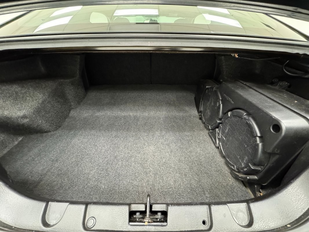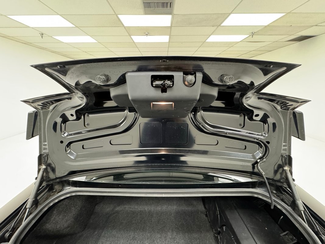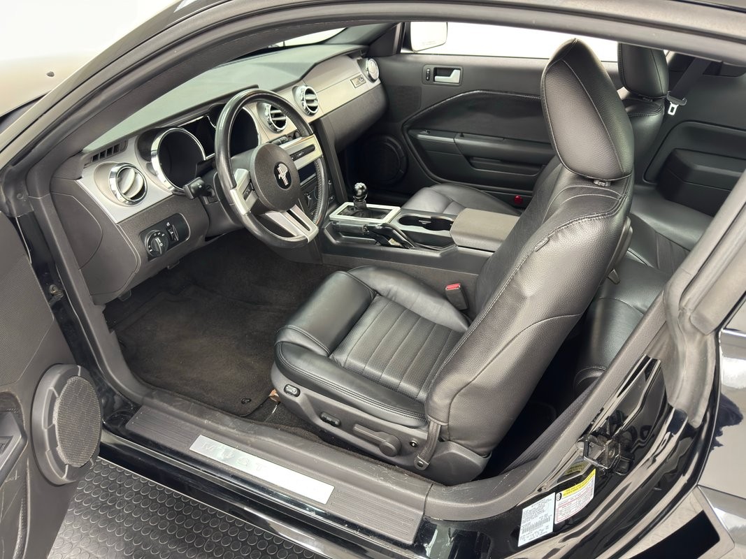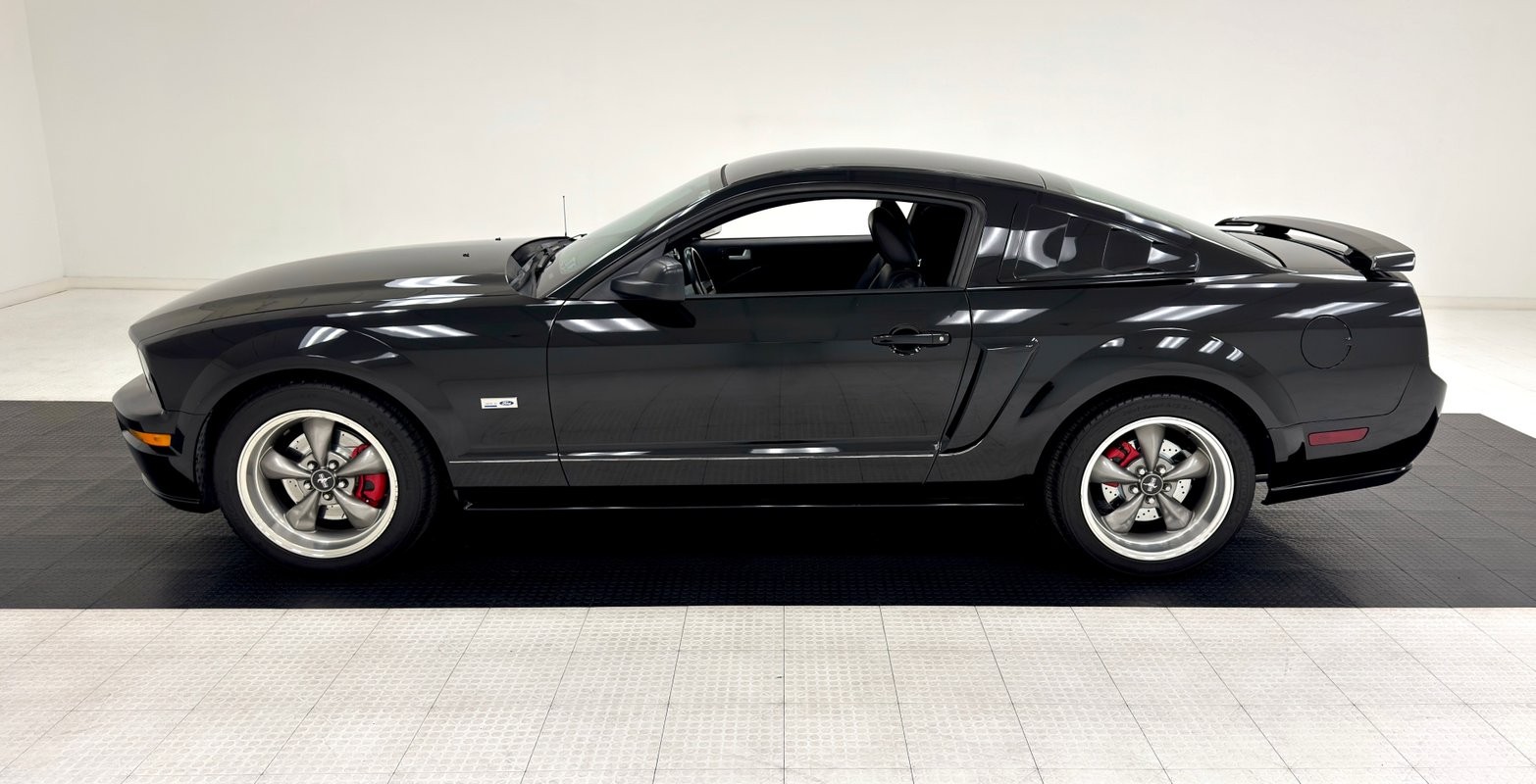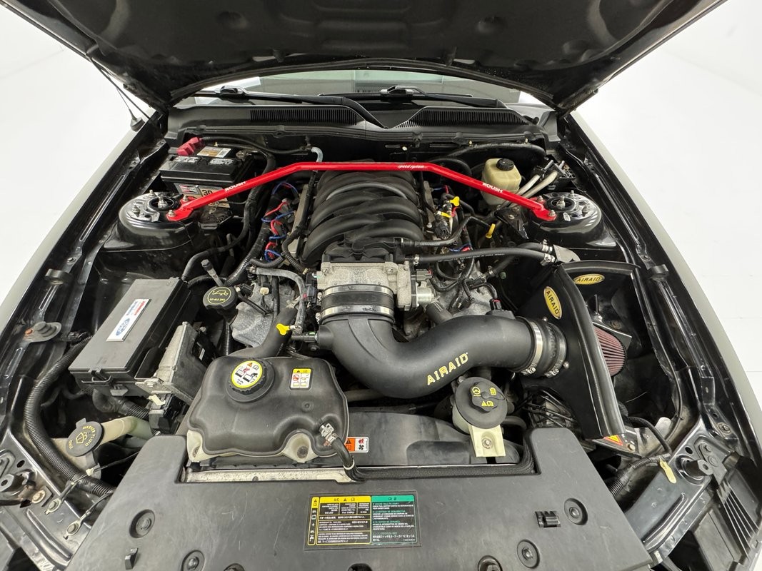 With very little exception, the entire car is bathed in an inky, two stage black paint with seamless bumper covers, a rear wing, and quarter window covers all adopting the flow of black. That darkness makes the red tail light explode off the rear fascia with translucent clarity and the front orange markers standing out, along with the headlights, inboard fog lights, and floating horse on the black grille. Nice wheels add so much to a car and that's the case here with 18-inch Bullitt wheels in argent gray, wrapped in staggered size tires with a late 2019 date code, and showing off red brake calipers through the spokes. Imperfections on this low mileage example include some scuffs on the chin and some light staining on the wheels. A bright red Roush strut tower brace highlights the engine bay where we find a clean 4.6 liter 3 valve V8, now wearing an AirRaid cold air intake. With its fuel injection, the engine is rated at 300 horsepower and is mated to a Tremec TR3550 5-speed manual transmission that routes power to the Ford 8" in back with 3.55 gears and TracLoc.