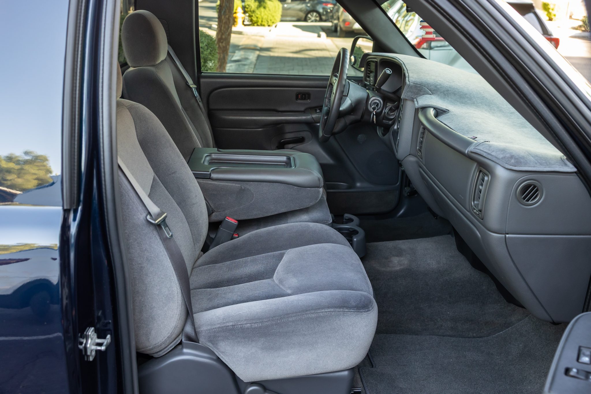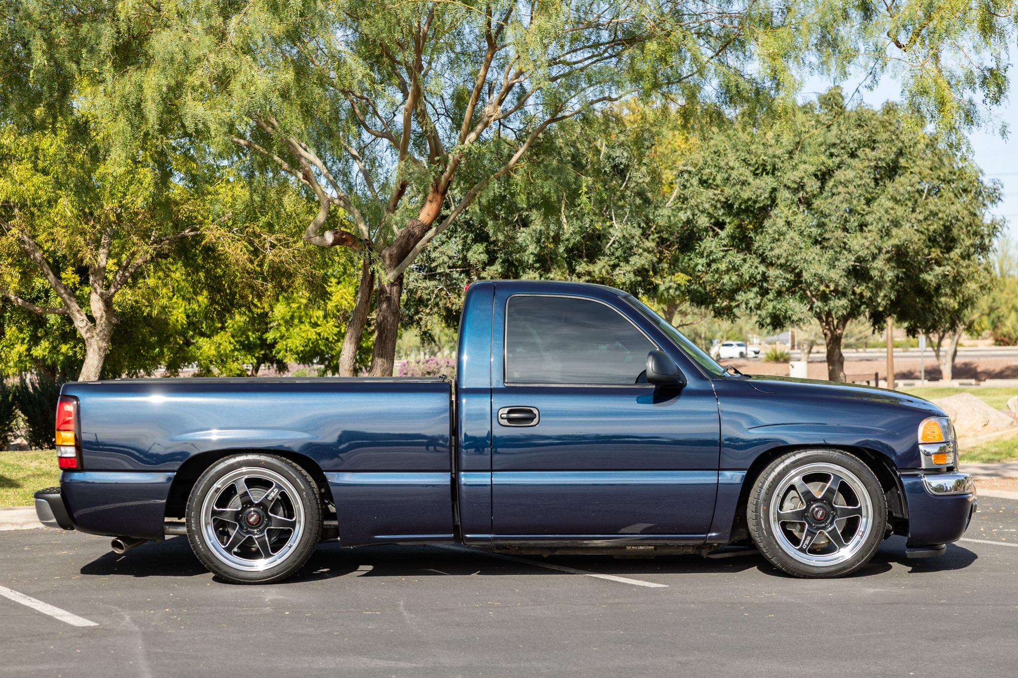 This 2005 GMC Sierra 1500 SLE pickup rides on 20” WELD Racing Ventura wheels and a lowered suspension with Ridetech coilovers. It is finished in Deep Blue Metallic over Pewter cloth and is powered by a 4.8-liter Vortec V8 linked to a four-speed automatic transmission. Equipment includes a carpeted bed with a roll-up tonneau cover along with a Flowmaster cat-back exhaust, aftermarket headlights, a Kenwood touchscreen head unit, a rearview camera, a subwoofer, and Focal speakers.