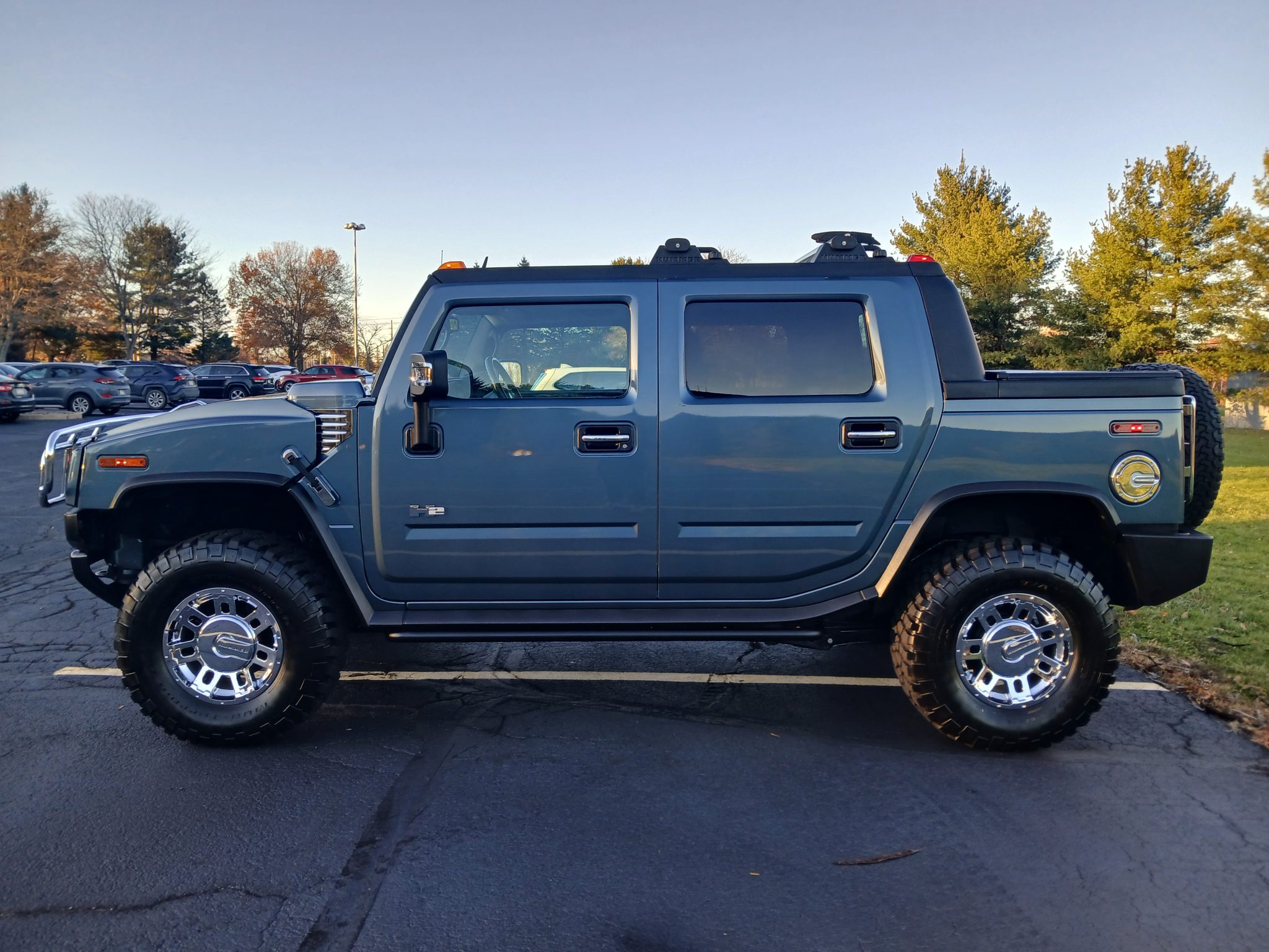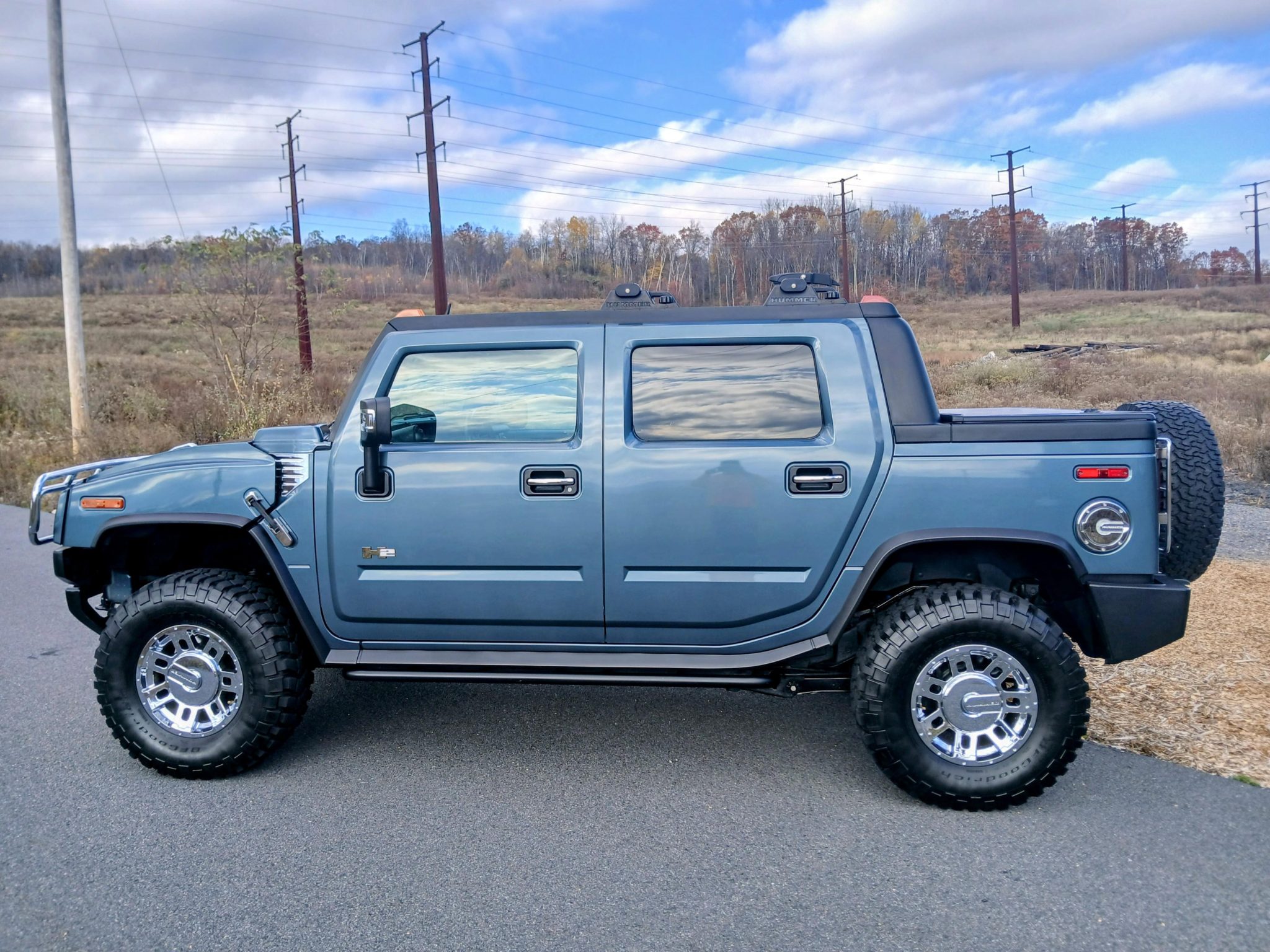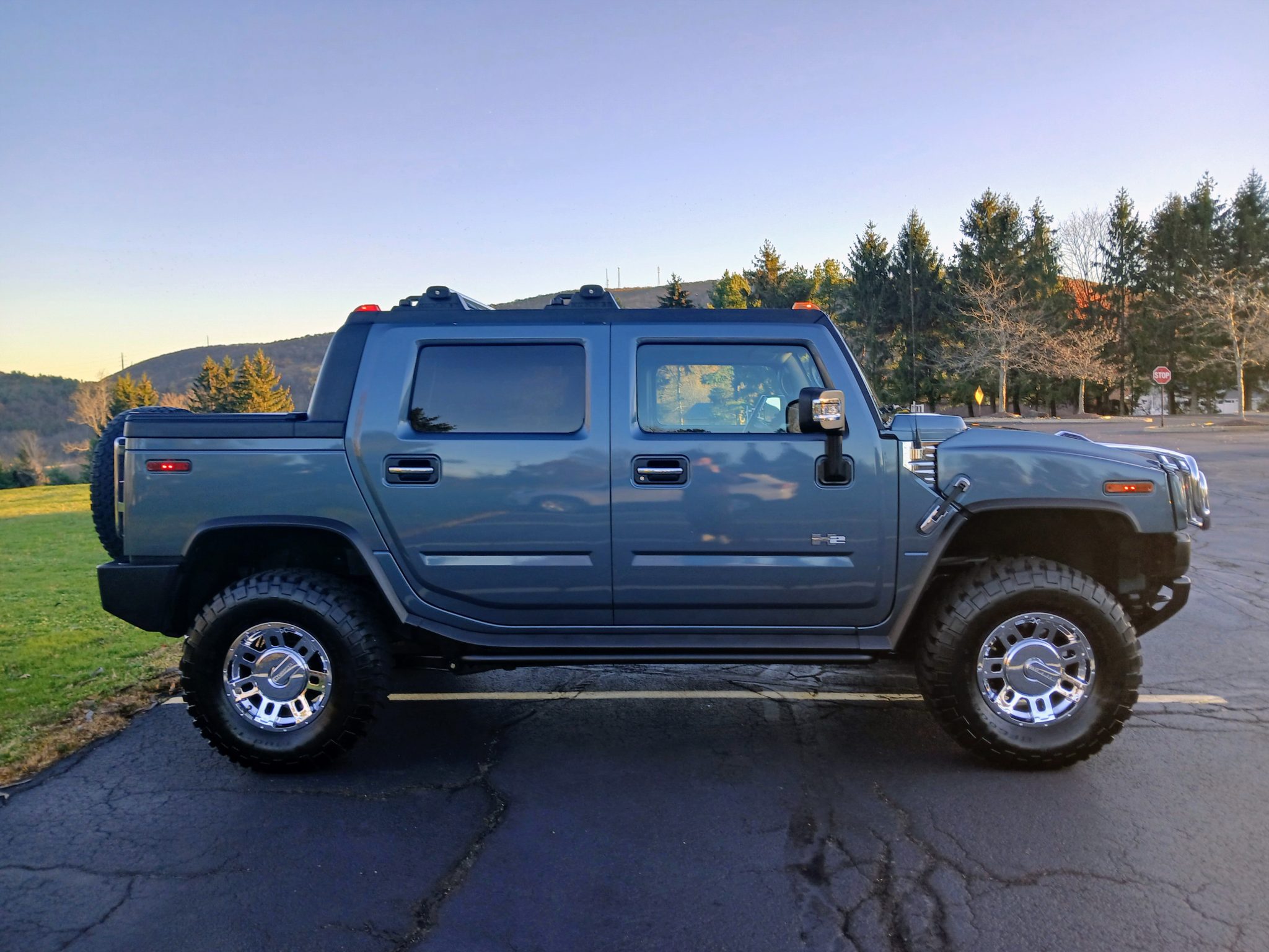 This 2005 Hummer H2 SUT has 77k miles and is powered by a 6.0-liter V8 linked with a four-speed automatic transmission, a dual-range transfer case, and a locking rear differential. Finished in Stealth Gray Metallic over Ebony leather, the truck features a front brush guard, a power sunroof, a tonneau cover, a power-operated window, an adjustable air suspension, cross-drilled and slotted disc brakes, and 17″ eight-spoke alloy wheels in addition to heated front and rear seats, dual-zone automatic climate control, cruise control, an Alpine CD changer, a Bose sound system, JBA Performance Exhaust headers, and a MagnaFlow cat-back exhaust.