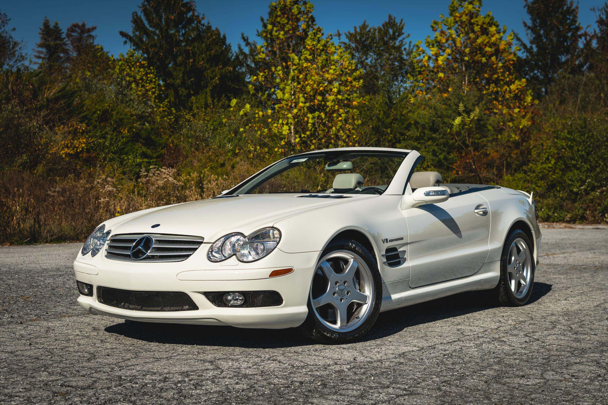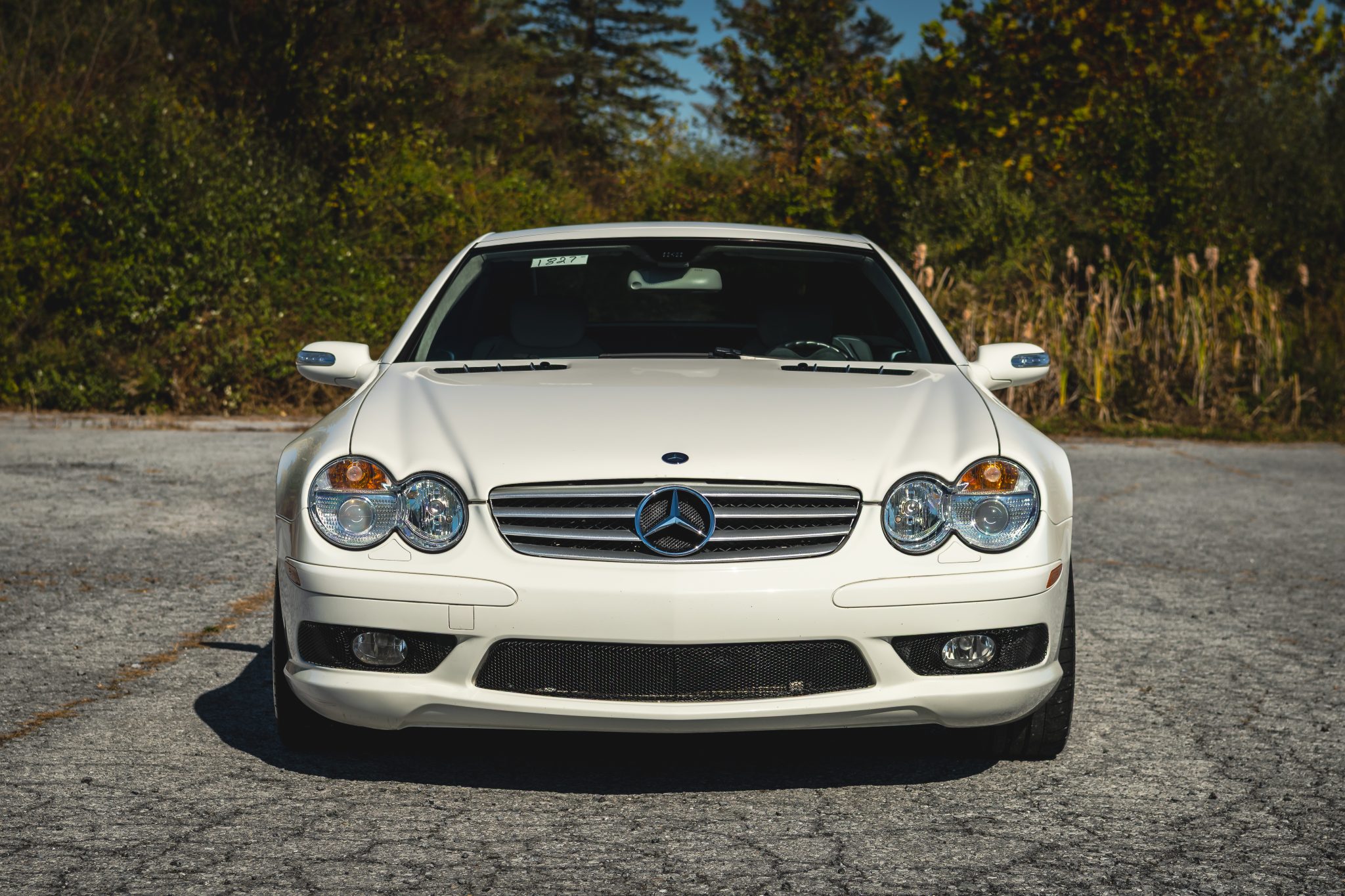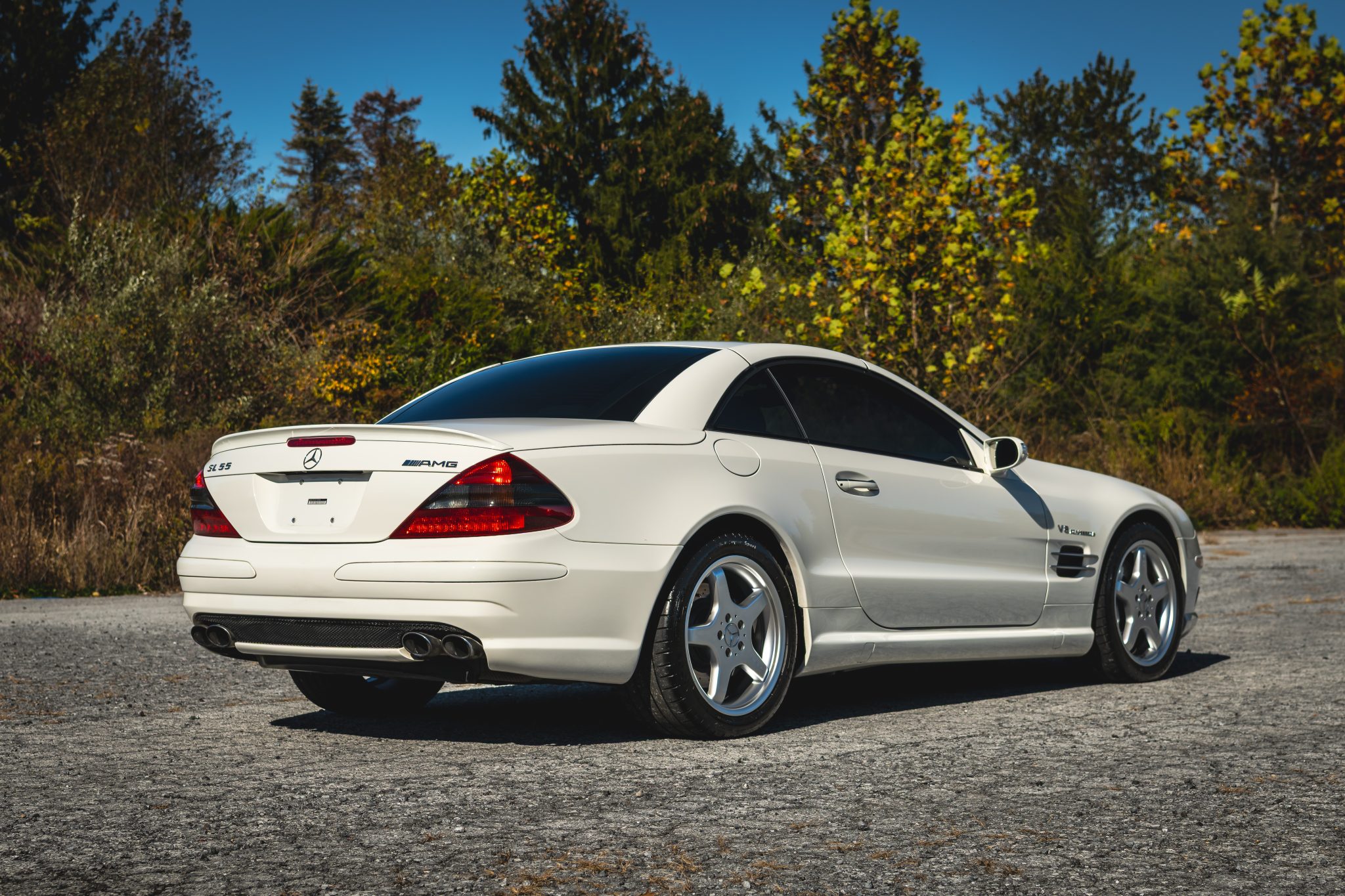 This 2005 Mercedes-Benz SL55 AMG it has 48k miles The car is finished in Alabaster White over Ash and Dark Ash leather, and it is powered by a supercharged 5.4-liter V8 paired with a five-speed automatic transmission. Equipment includes a power-retractable hardtop, xenon headlights, 18″ AMG five-spoke alloy wheels, heated multi-contour seats, a Bose sound system, and COMAND with navigation
