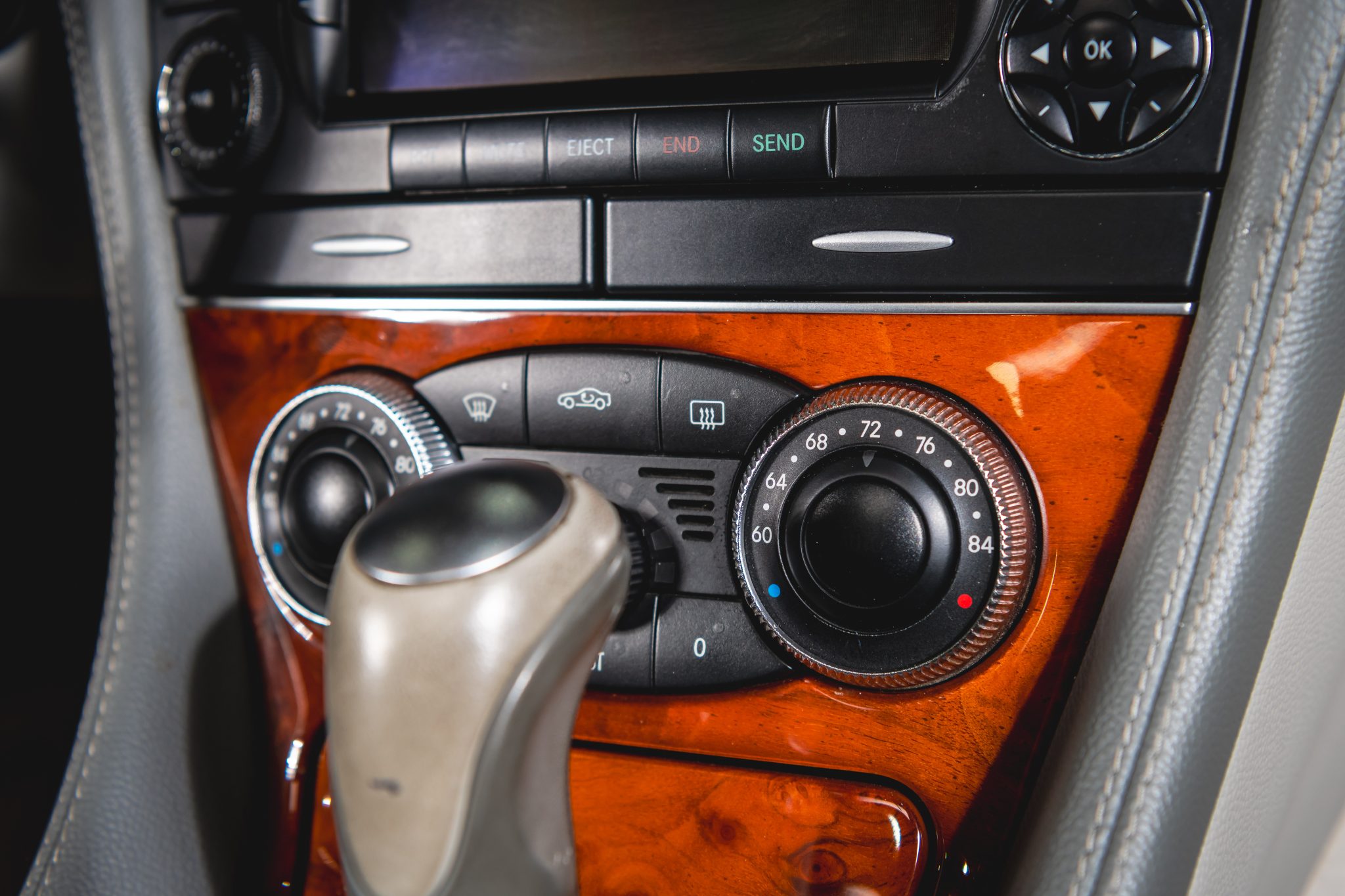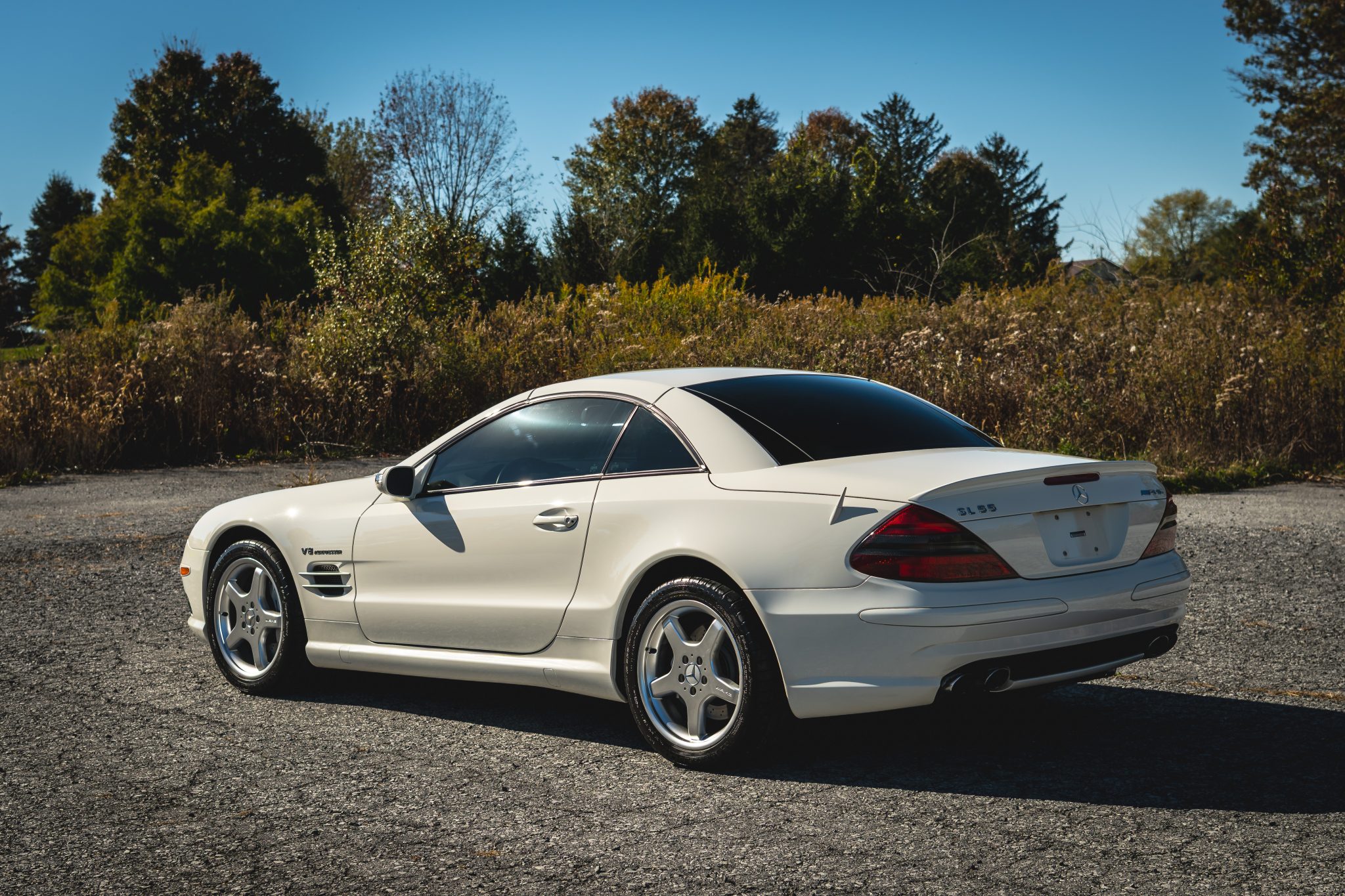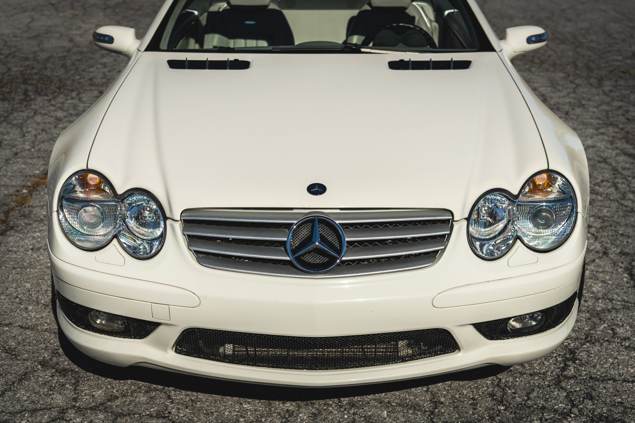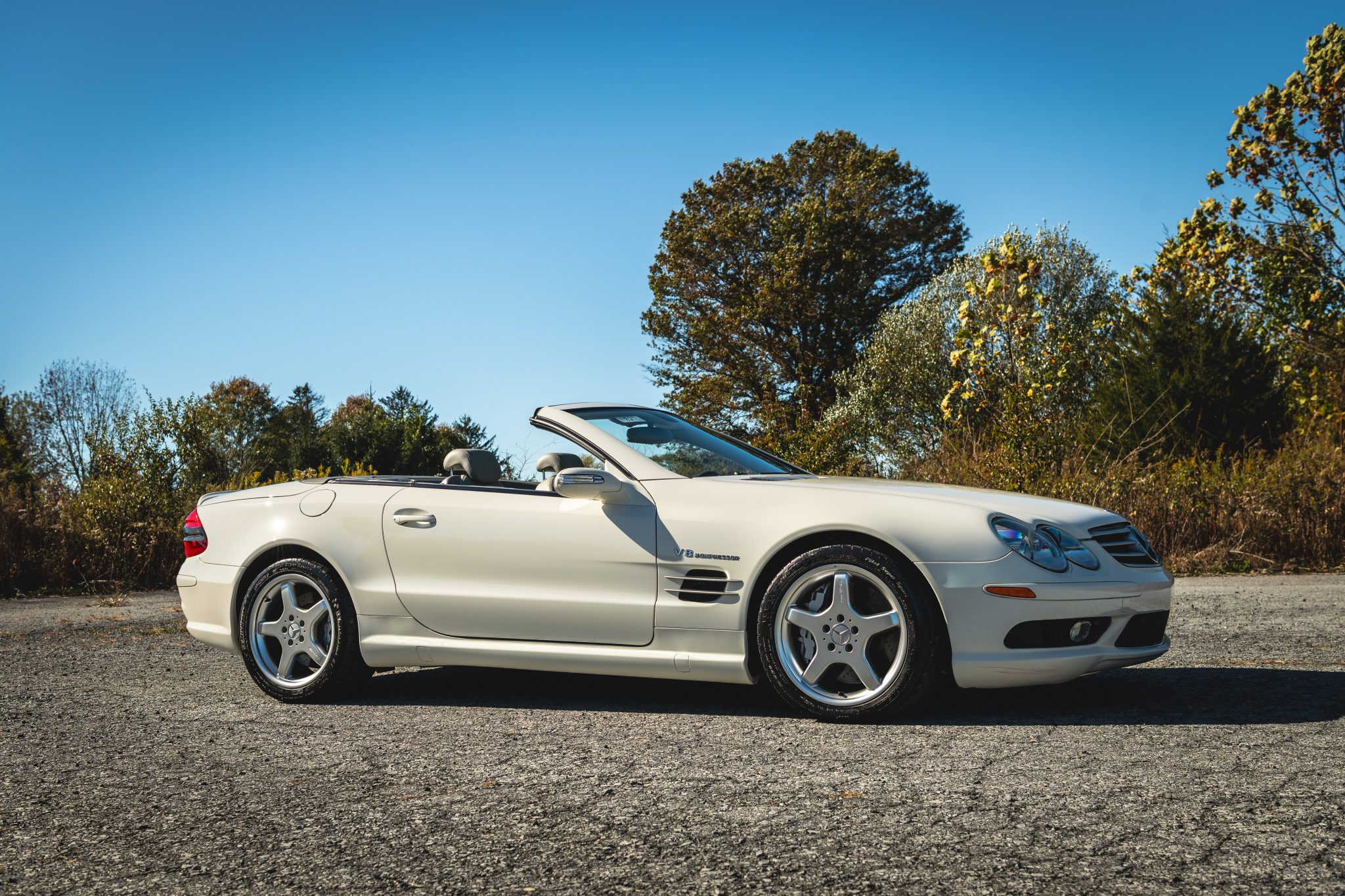 This 2005 Mercedes-Benz SL55 AMG it has 48k miles The car is finished in Alabaster White over Ash and Dark Ash leather, and it is powered by a supercharged 5.4-liter V8 paired with a five-speed automatic transmission. Equipment includes a power-retractable hardtop, xenon headlights, 18″ AMG five-spoke alloy wheels, heated multi-contour seats, a Bose sound system, and COMAND with navigation