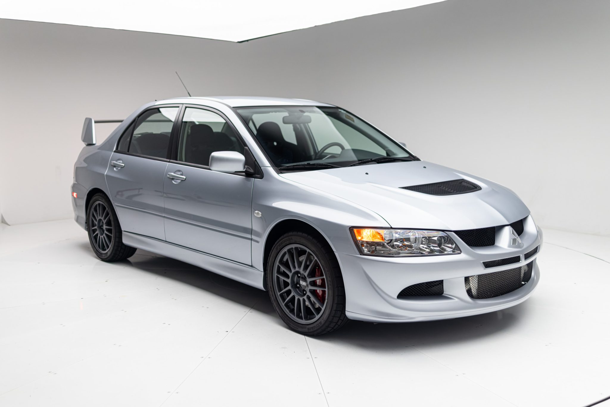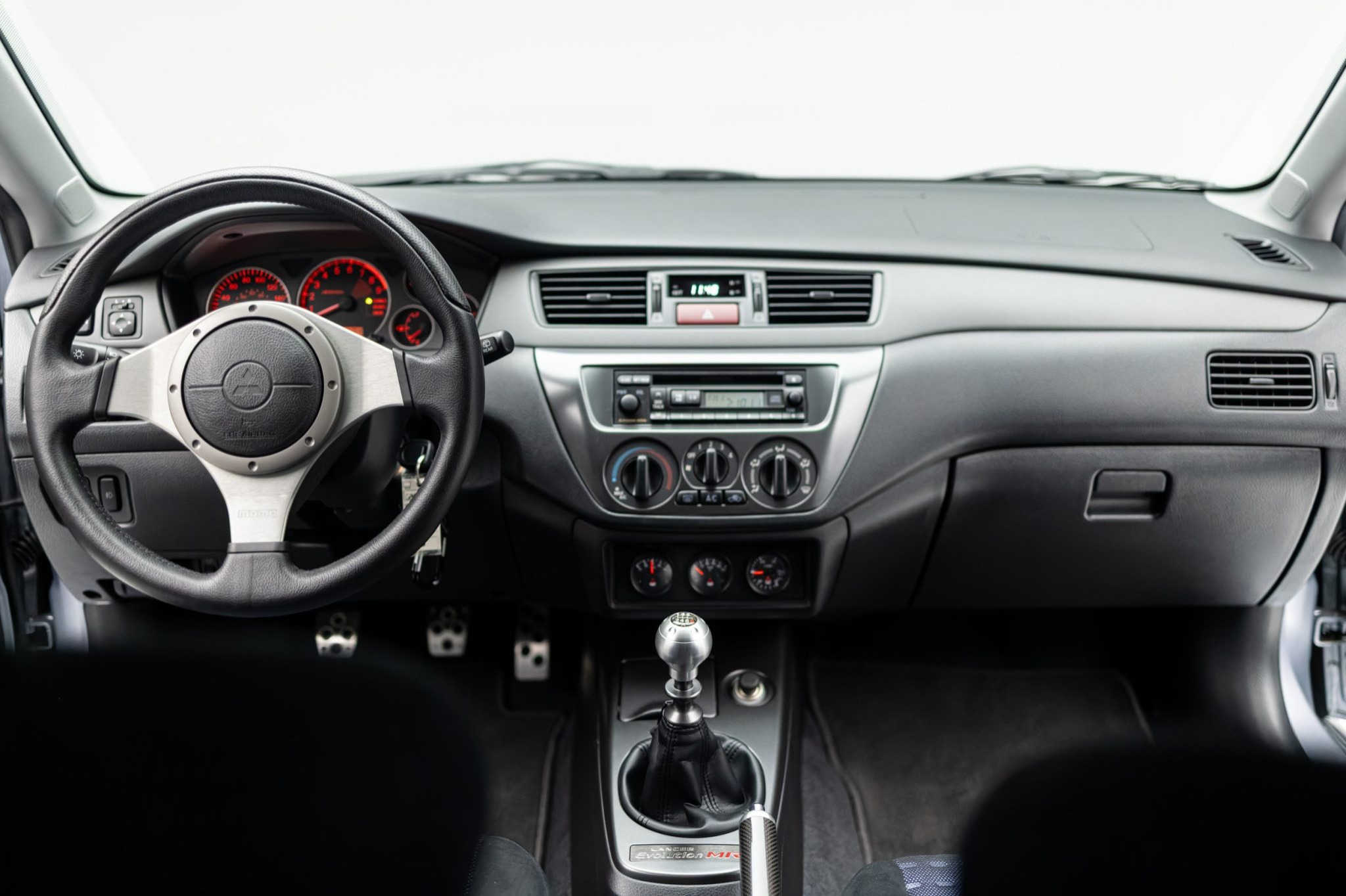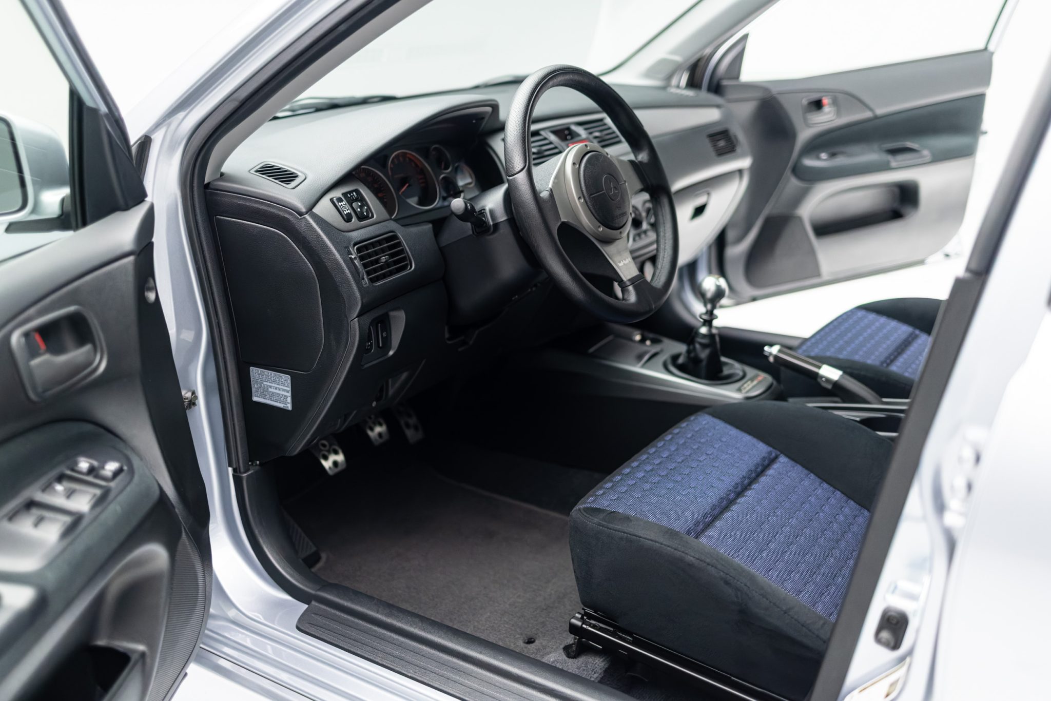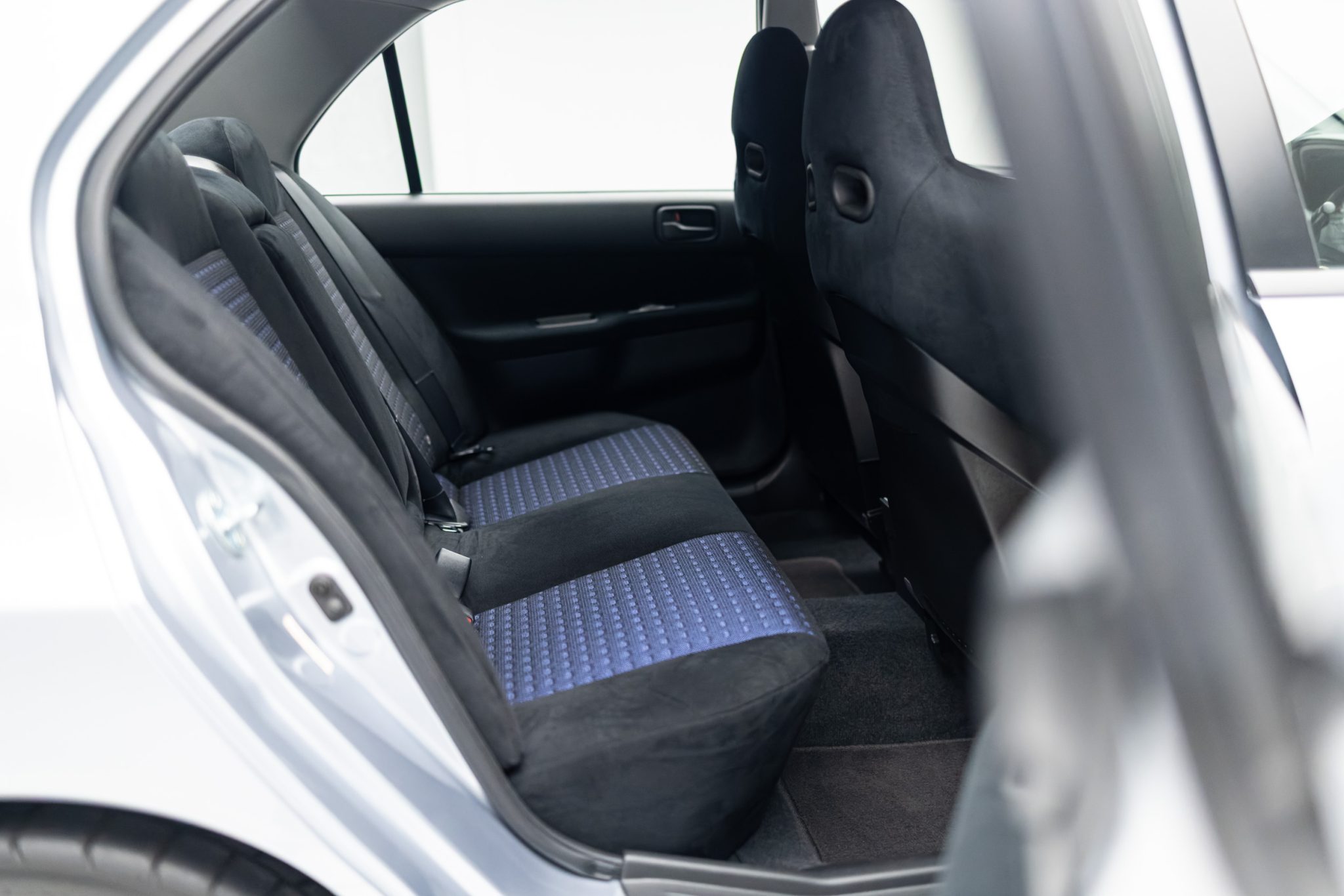is finished in Apex Silver over Black Ecsaine and blue cloth. The car is powered by a turbocharged 2.0-liter inline-four linked with a six-speed manual transaxle and an all-wheel-drive system with a limited-slip rear differential and an Active Center Differential. Equipment includes a carbon-fiber rear wing, 17″ BBS multi-spoke alloy wheels, a rear window wiper, roof-mounted vortex generators, Recaro front seats, a leather-wrapped MOMO steering wheel, a CD stereo, and air conditioning.
