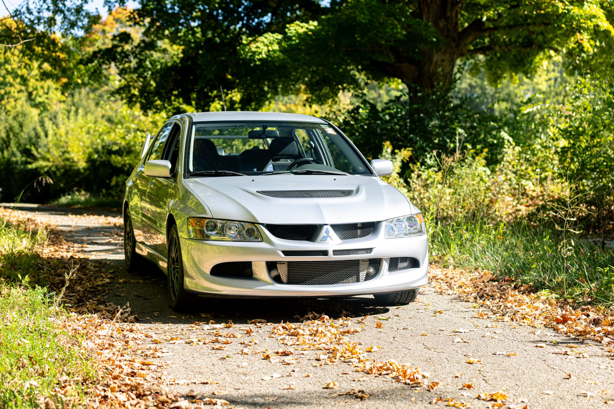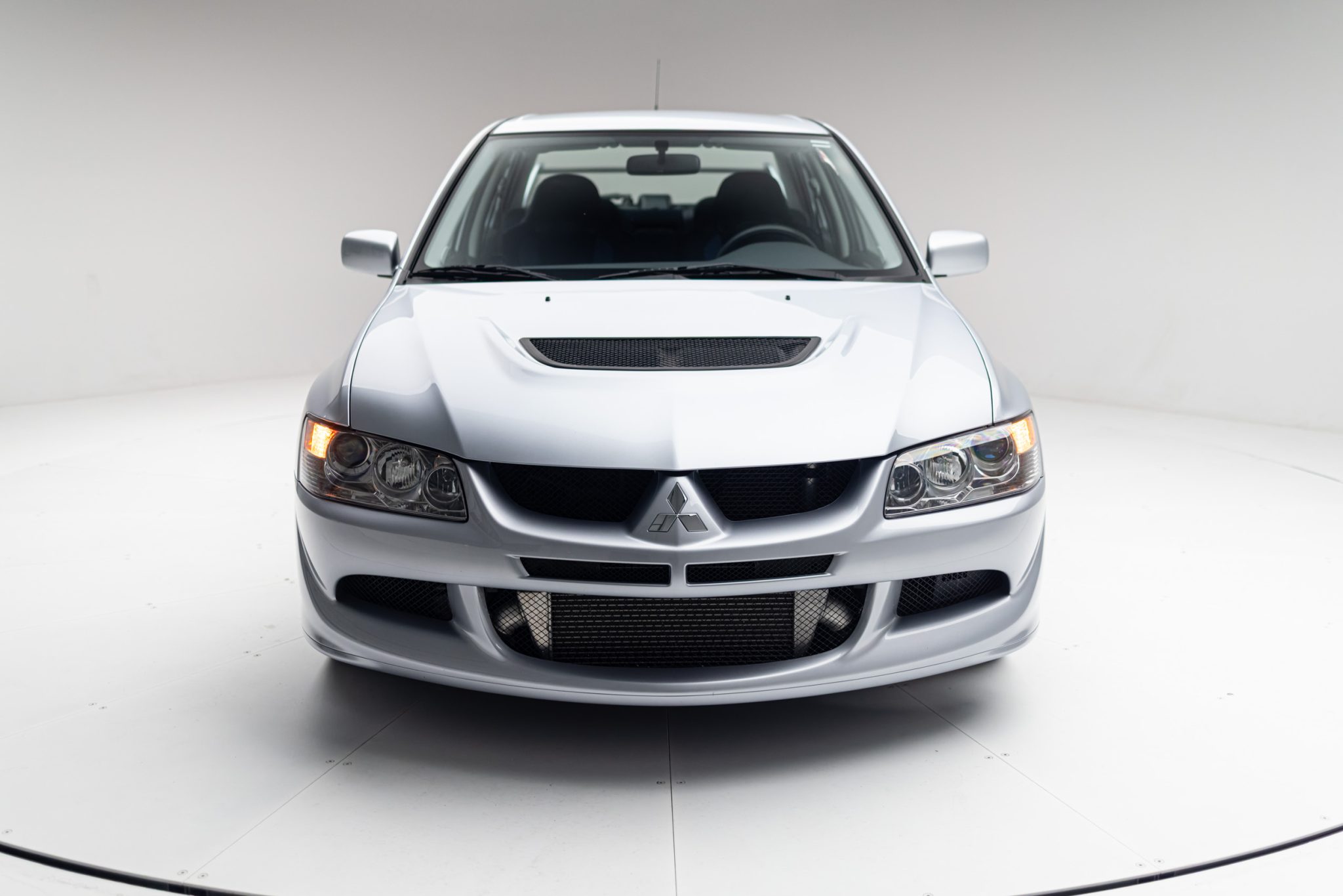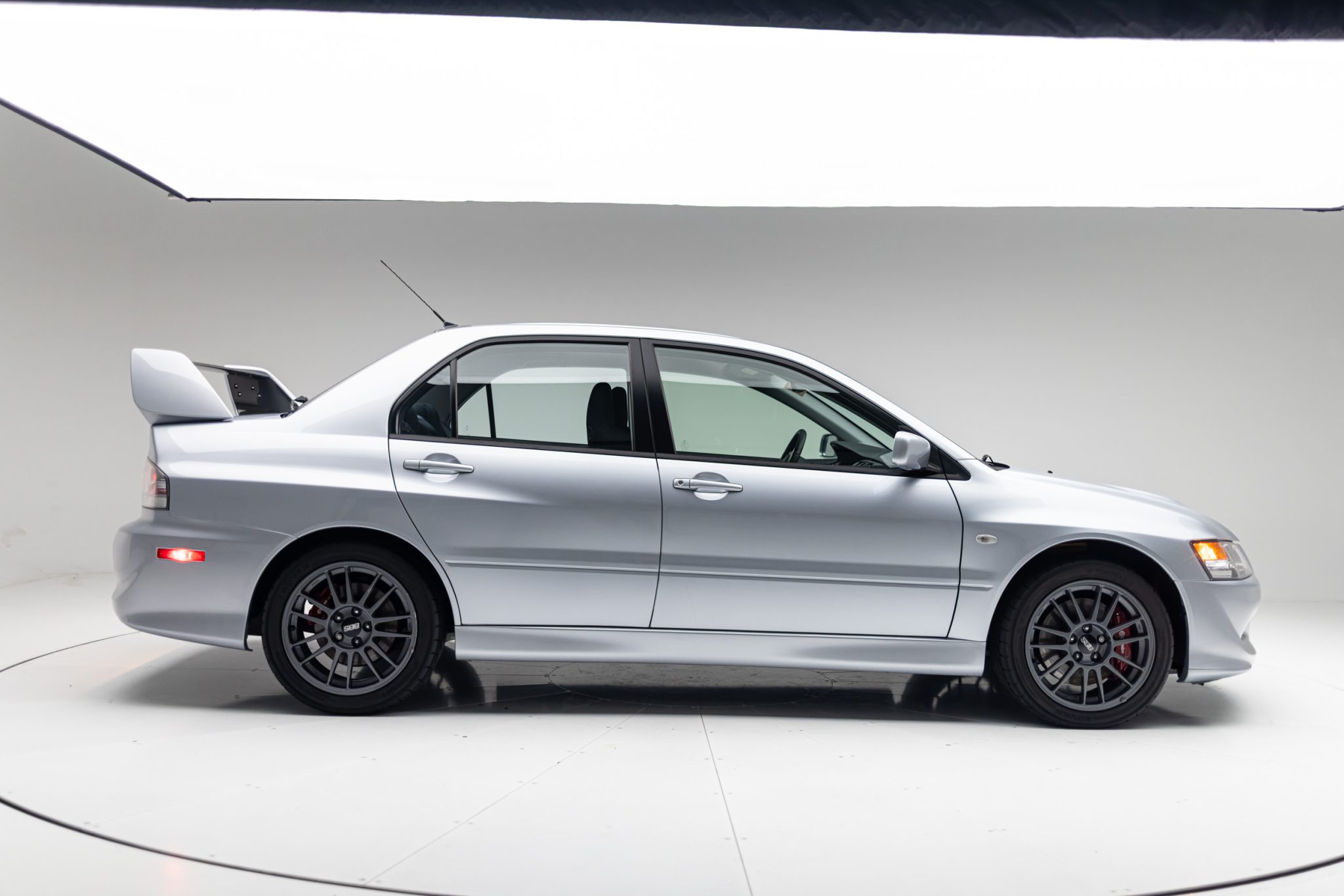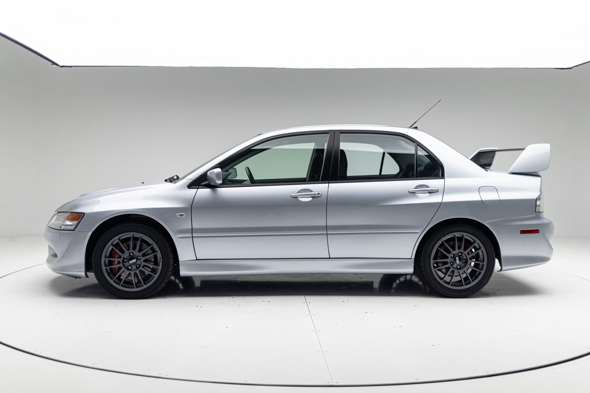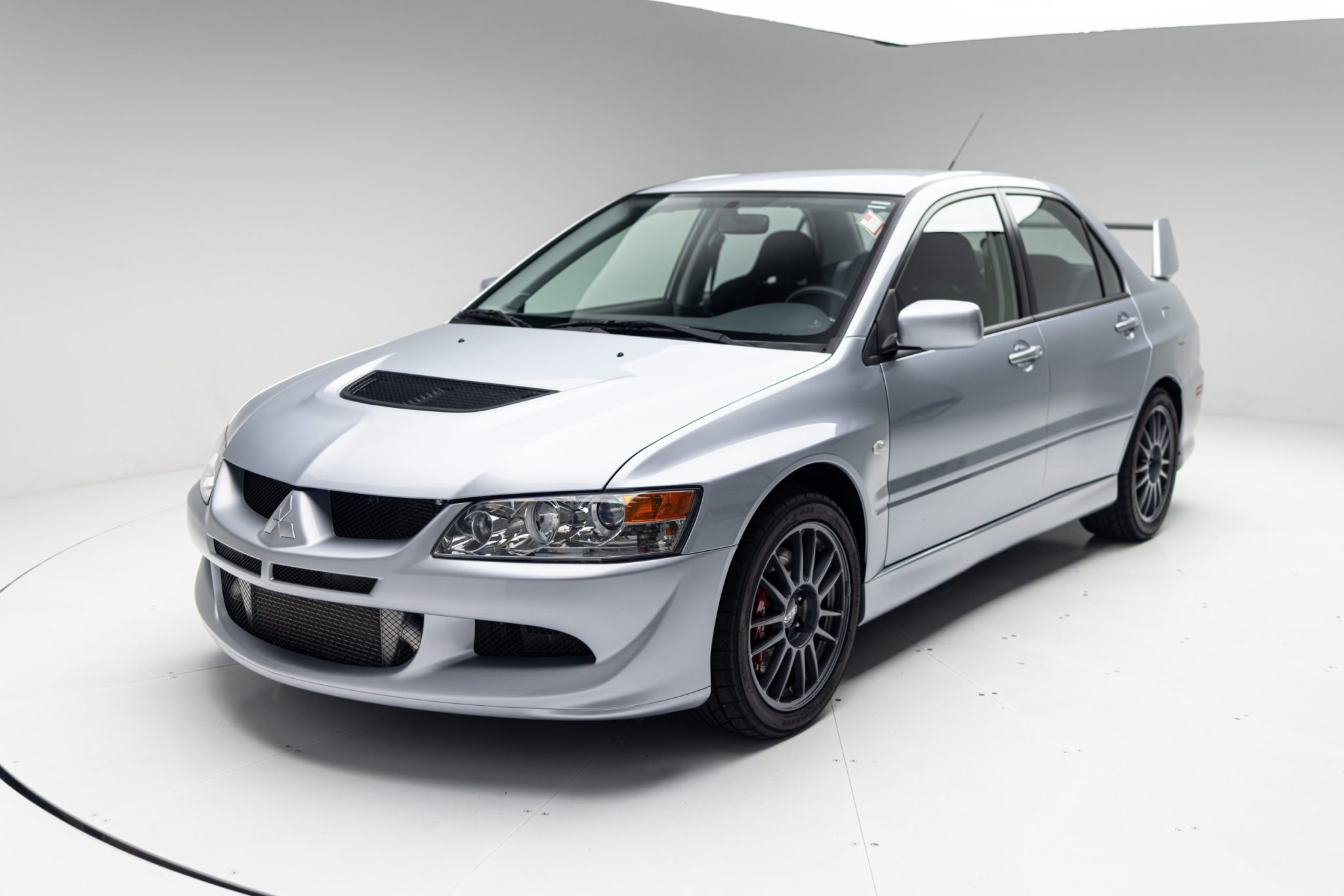 is finished in Apex Silver over Black Ecsaine and blue cloth. The car is powered by a turbocharged 2.0-liter inline-four linked with a six-speed manual transaxle and an all-wheel-drive system with a limited-slip rear differential and an Active Center Differential. Equipment includes a carbon-fiber rear wing, 17″ BBS multi-spoke alloy wheels, a rear window wiper, roof-mounted vortex generators, Recaro front seats, a leather-wrapped MOMO steering wheel, a CD stereo, and air conditioning.