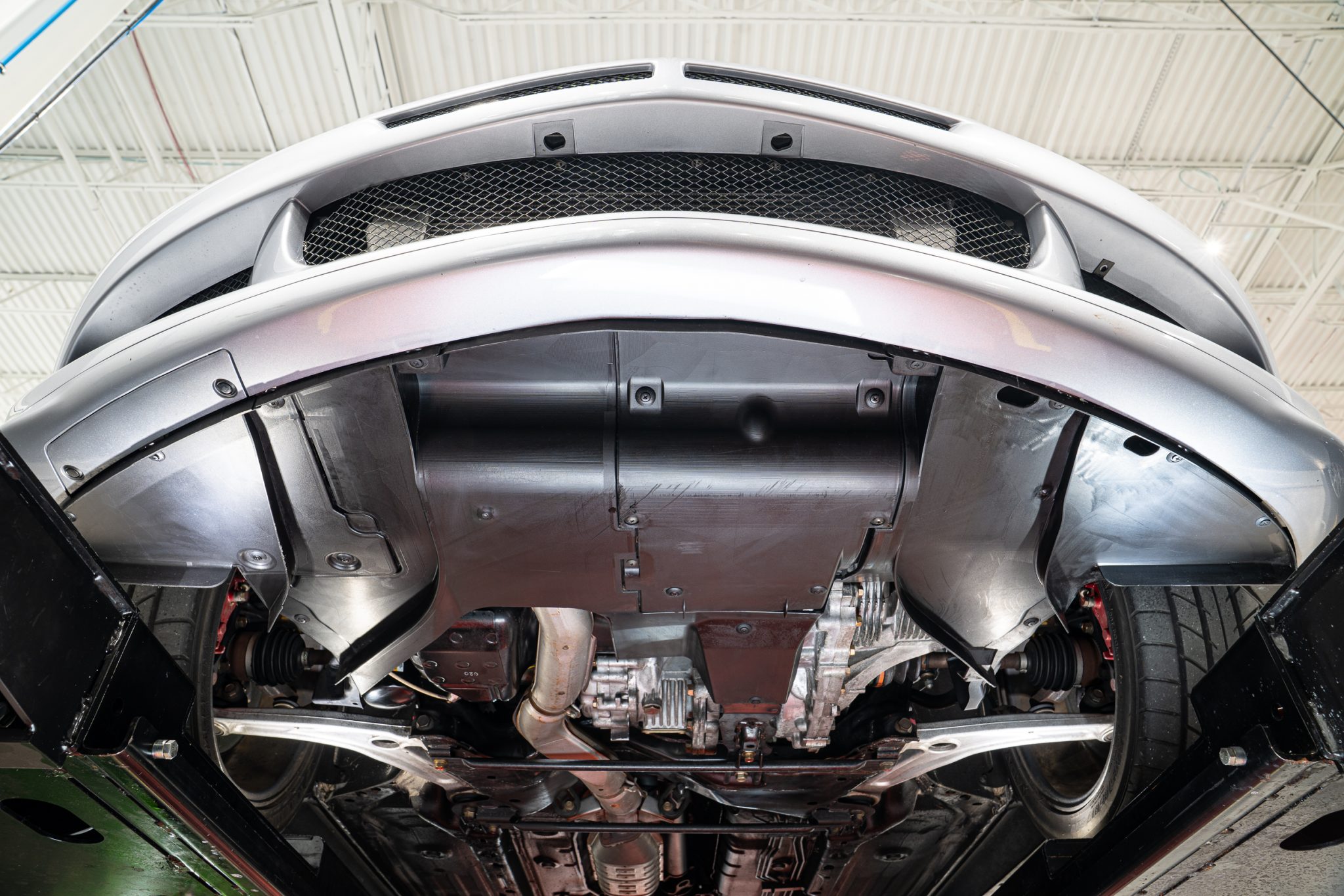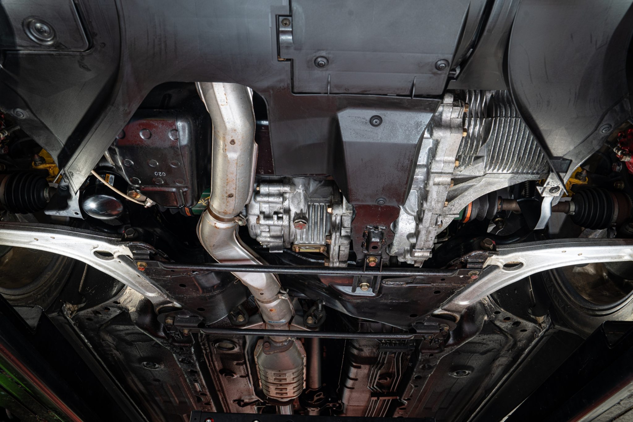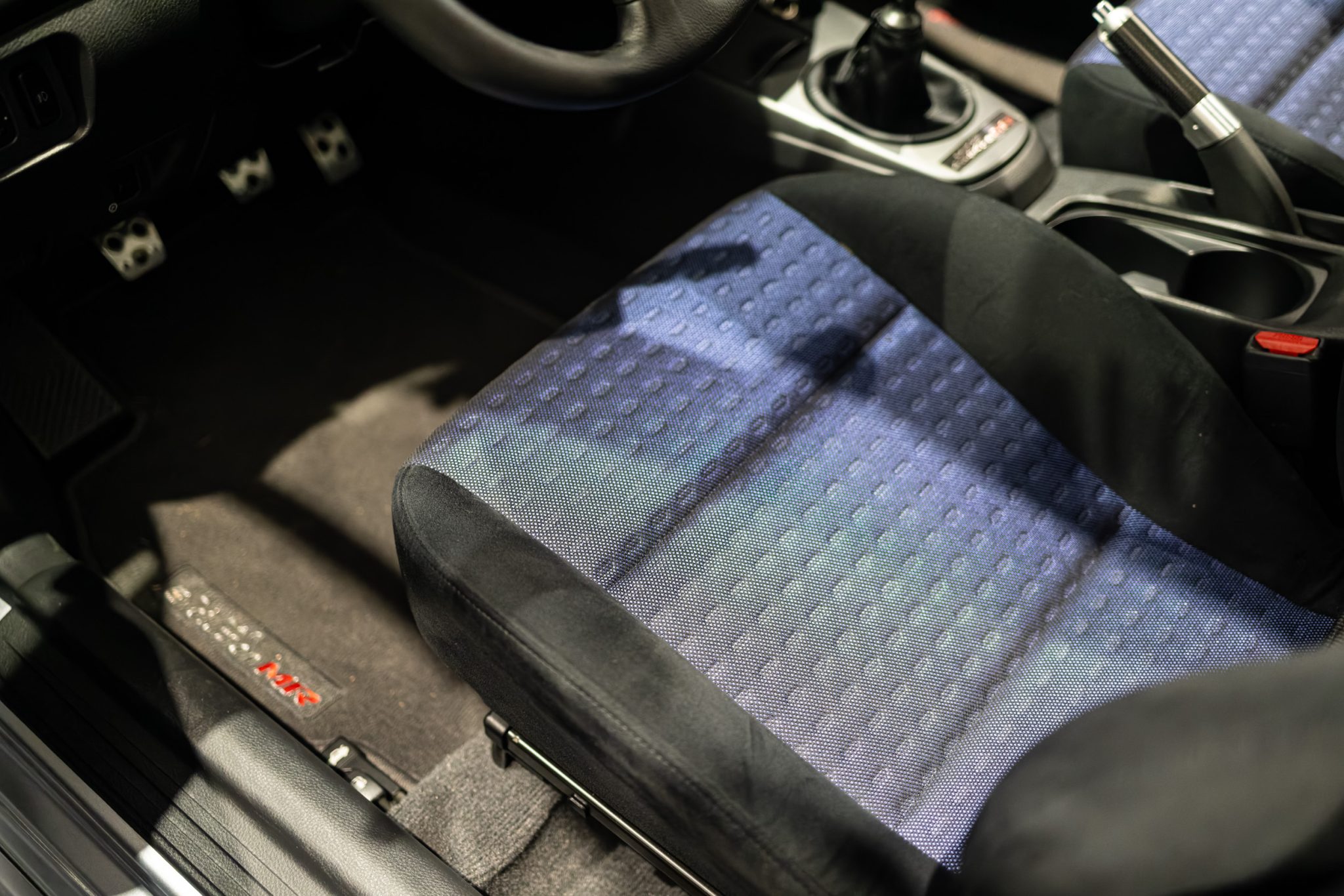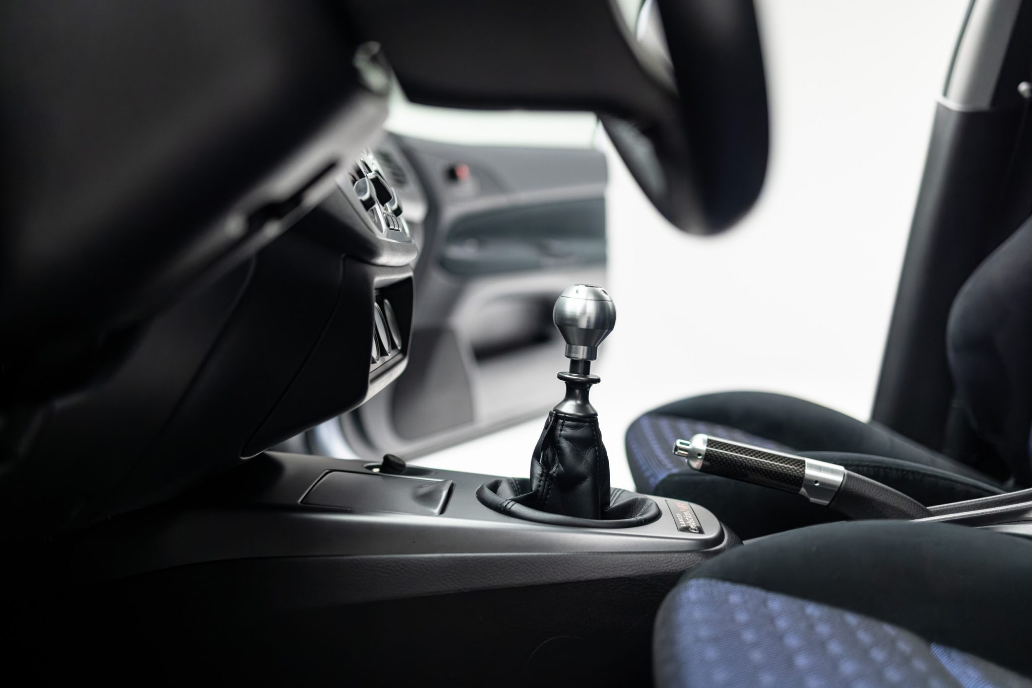 is finished in Apex Silver over Black Ecsaine and blue cloth. The car is powered by a turbocharged 2.0-liter inline-four linked with a six-speed manual transaxle and an all-wheel-drive system with a limited-slip rear differential and an Active Center Differential. Equipment includes a carbon-fiber rear wing, 17″ BBS multi-spoke alloy wheels, a rear window wiper, roof-mounted vortex generators, Recaro front seats, a leather-wrapped MOMO steering wheel, a CD stereo, and air conditioning.