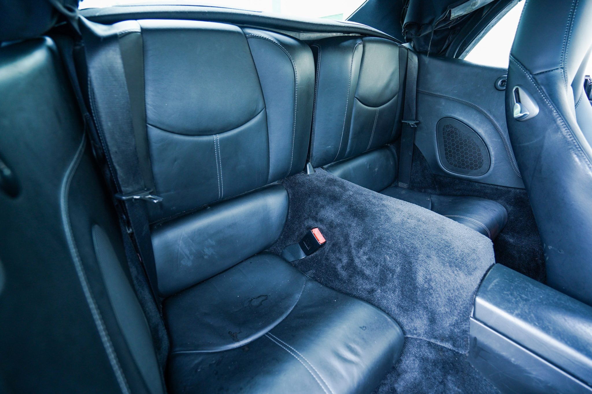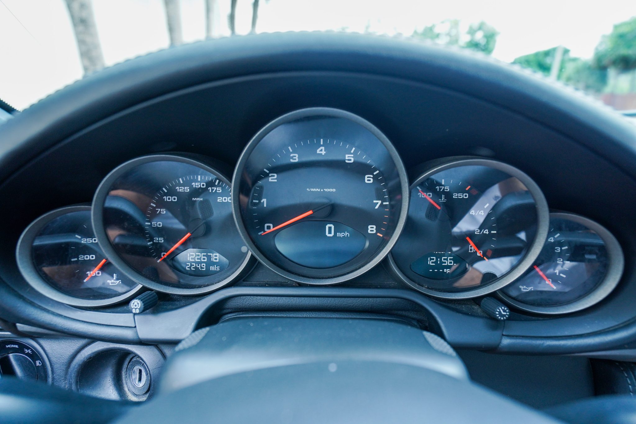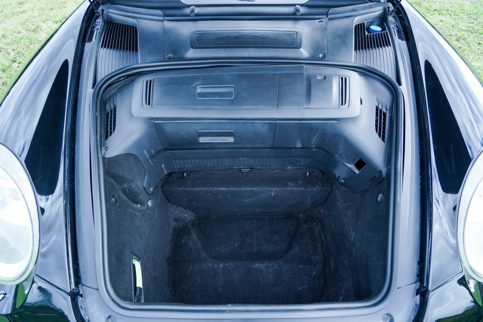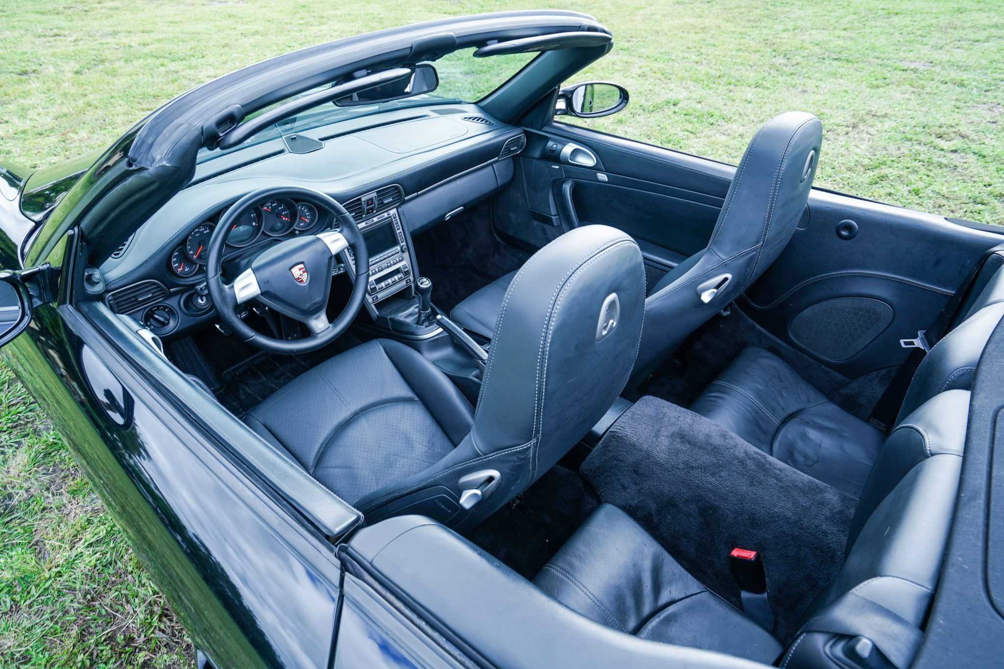 This 2005 Porsche 911 Carrera cabriolet is finished in black over black full leather and is powered by a 3.6-liter flat-six paired with a six-speed manual transaxle. Equipment includes a black soft top, 19″ alloy wheels, bi-xenon headlights, a deployable rear spoiler, heated power-adjustable front seats, automatic climate control, navigation, and Porsche Communication Management linked to a Bose sound system.