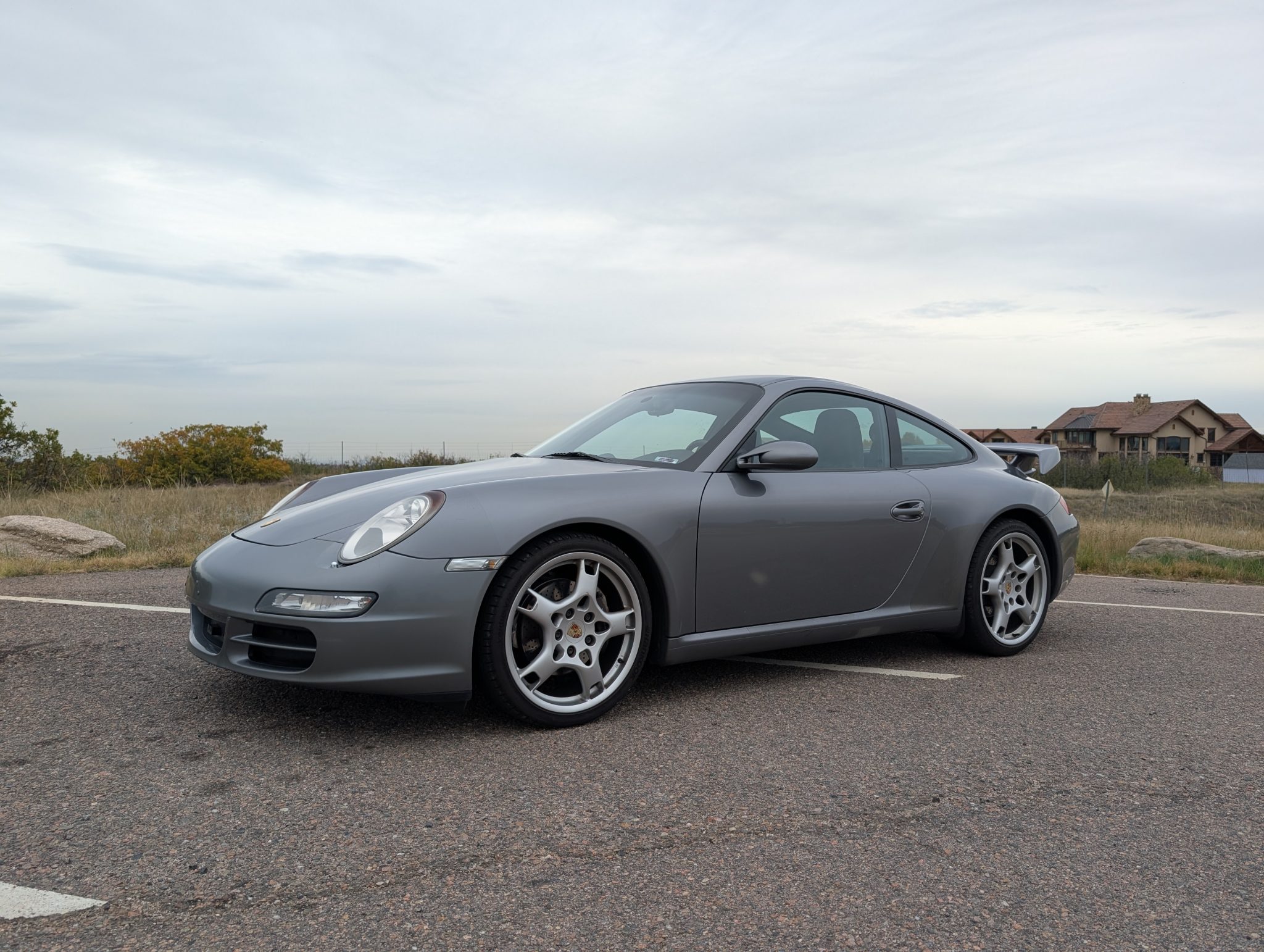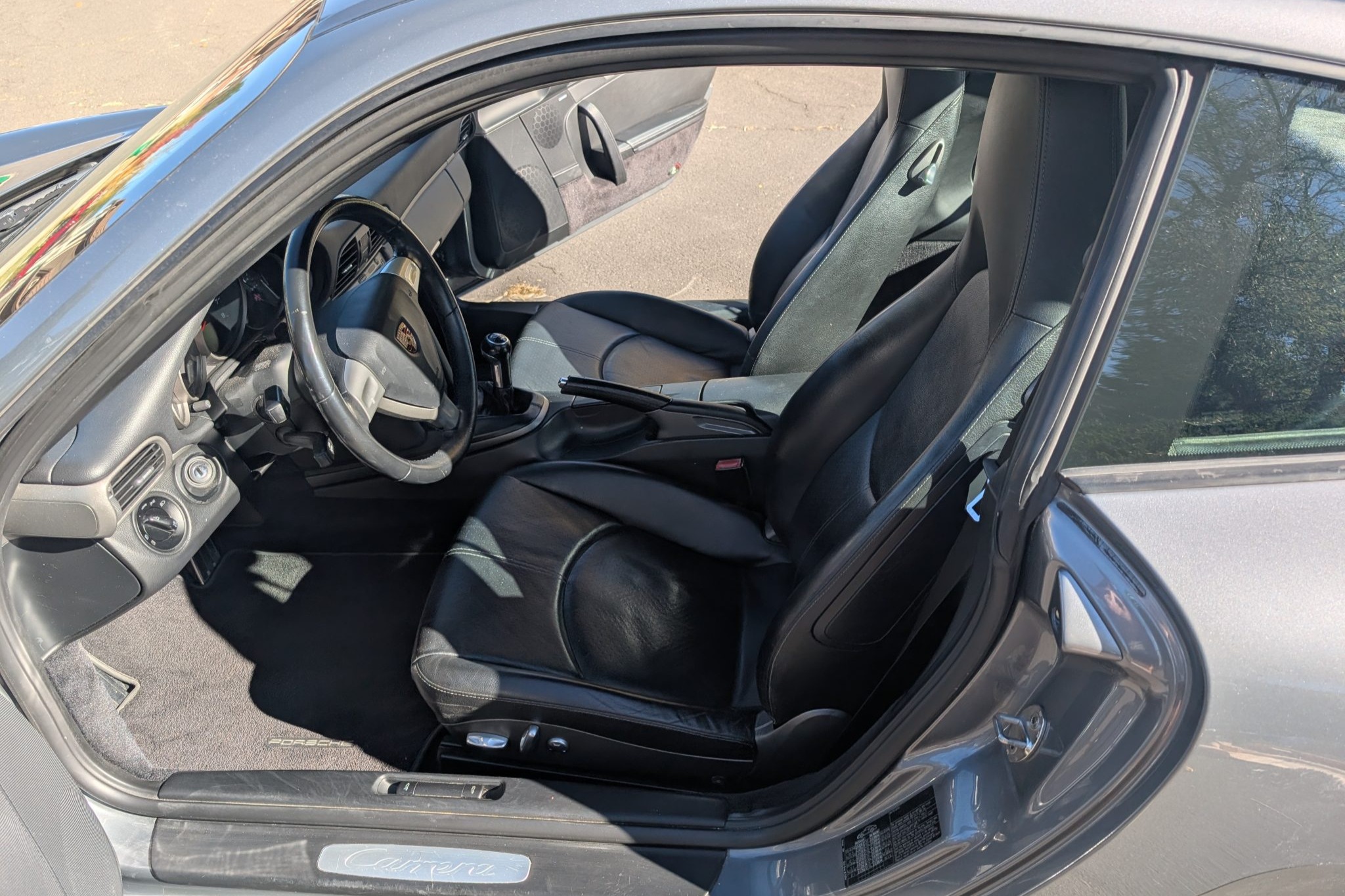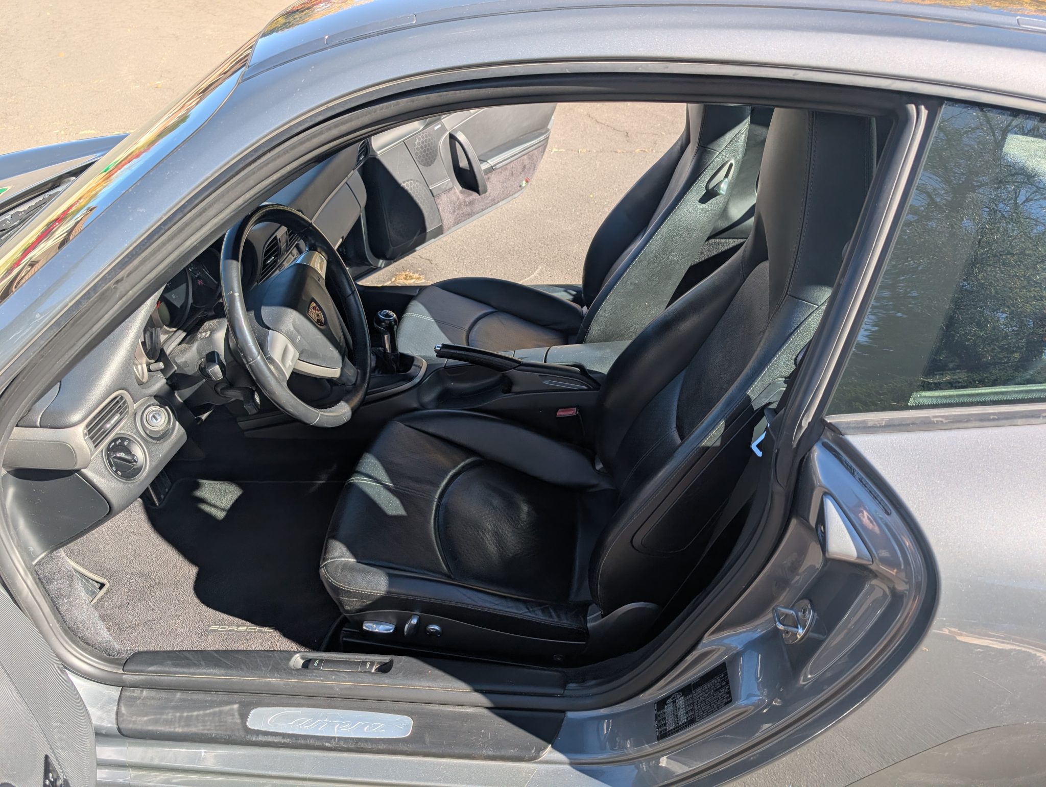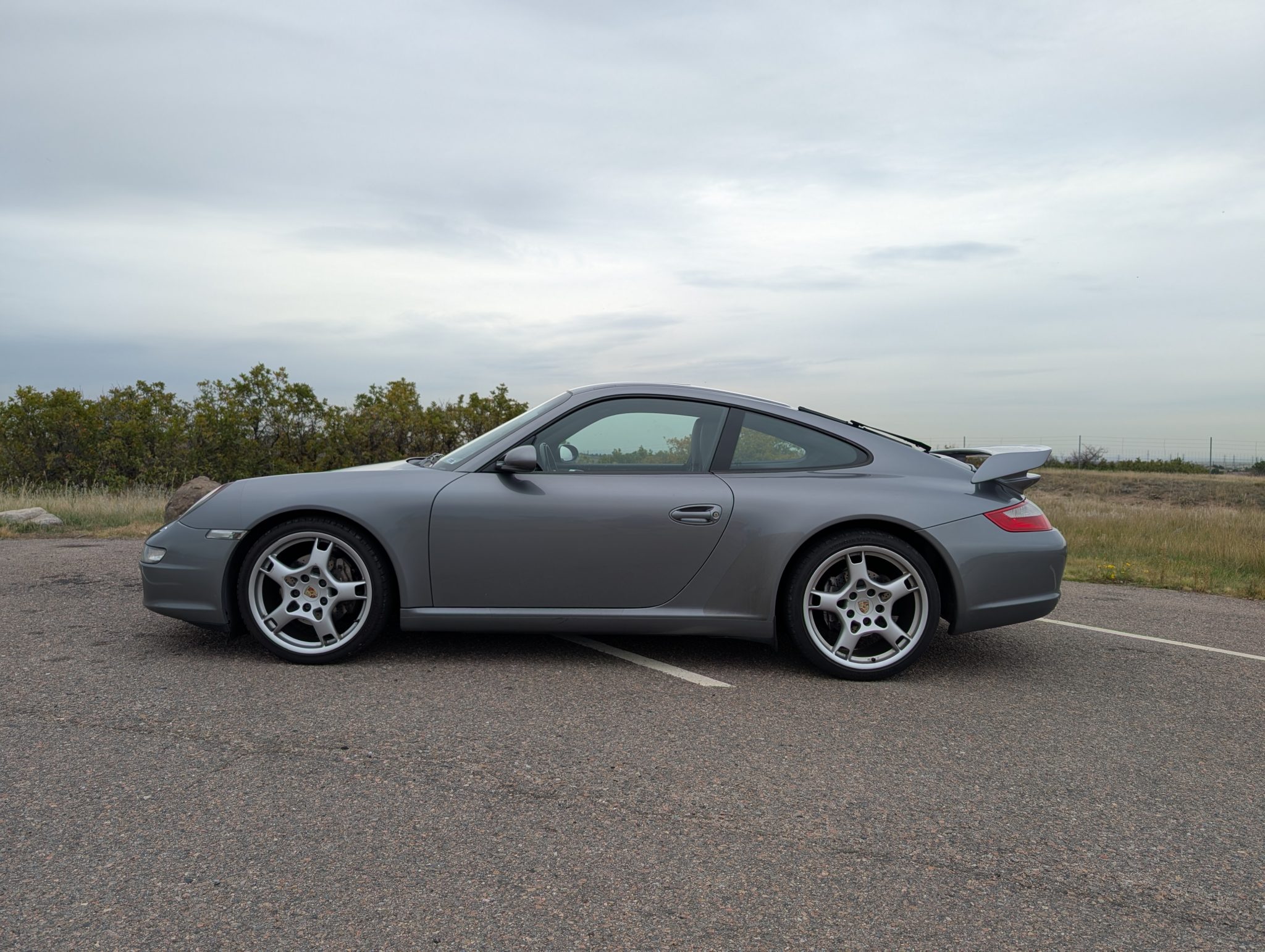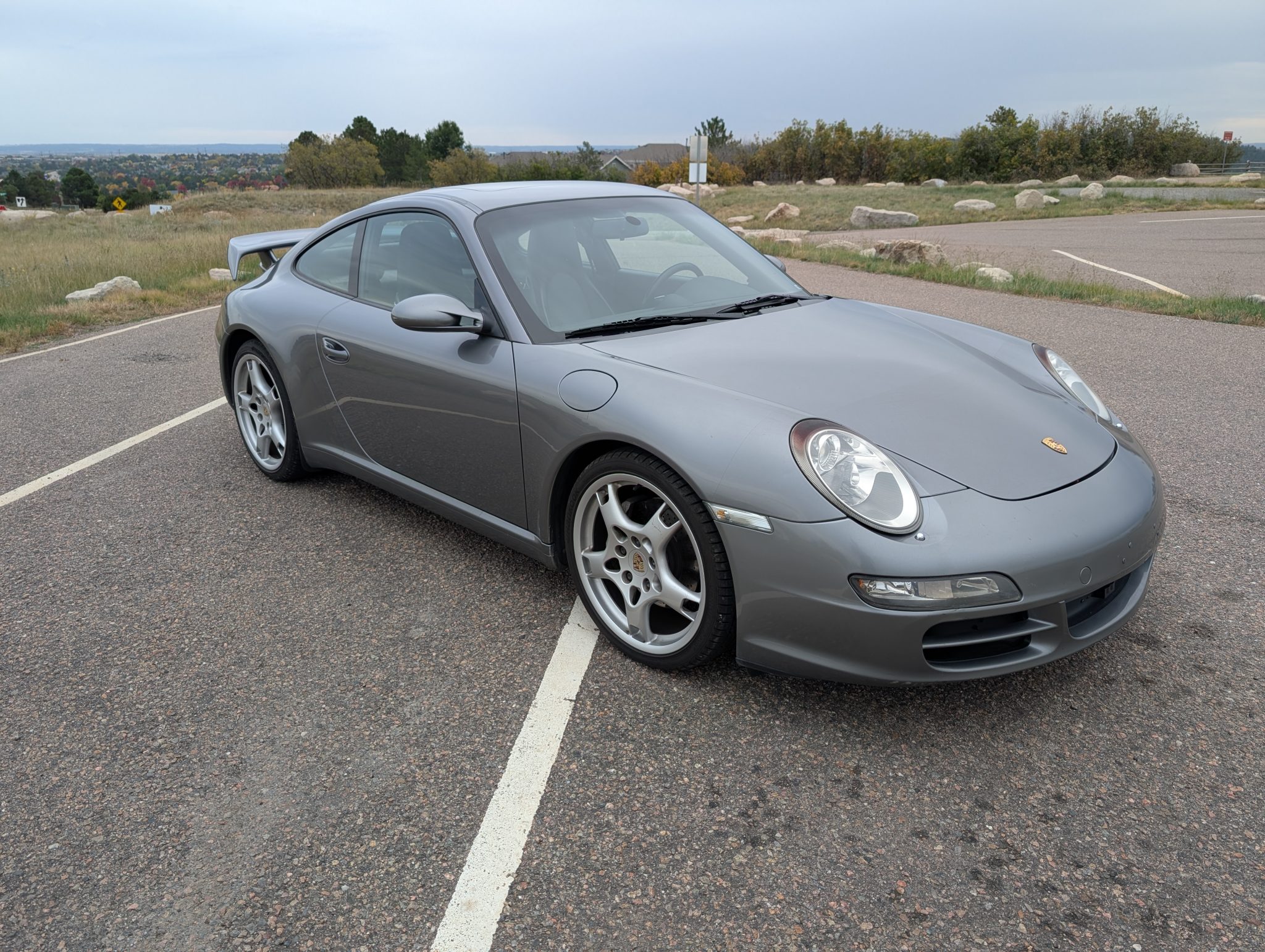 The car was specified in Seal Gray Metallic over a Black standard leather interior, and it is powered by a 3.6-liter flat-six paired with a six-speed manual transaxle. Equipment includes the Sport Chrono Package Plus, a fixed rear wing, a rear window wiper, bi-xenon headlights, Porsche Active Suspension Management (PASM), 19″ Carrera S wheels, 12-way power-adjustable front seats, a Bose sound system, and driver-seat position memory settings.