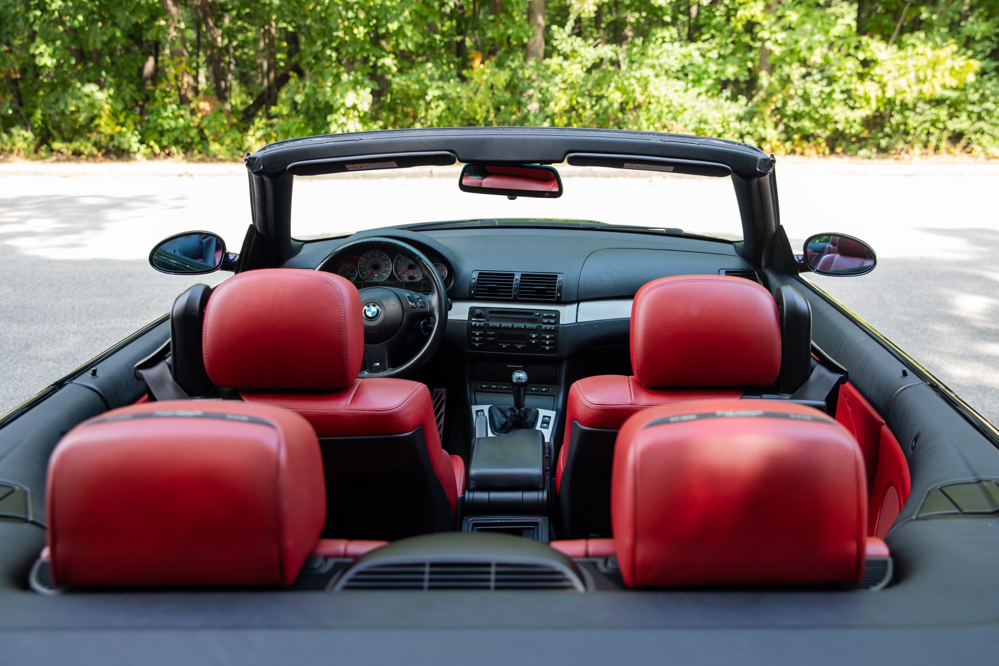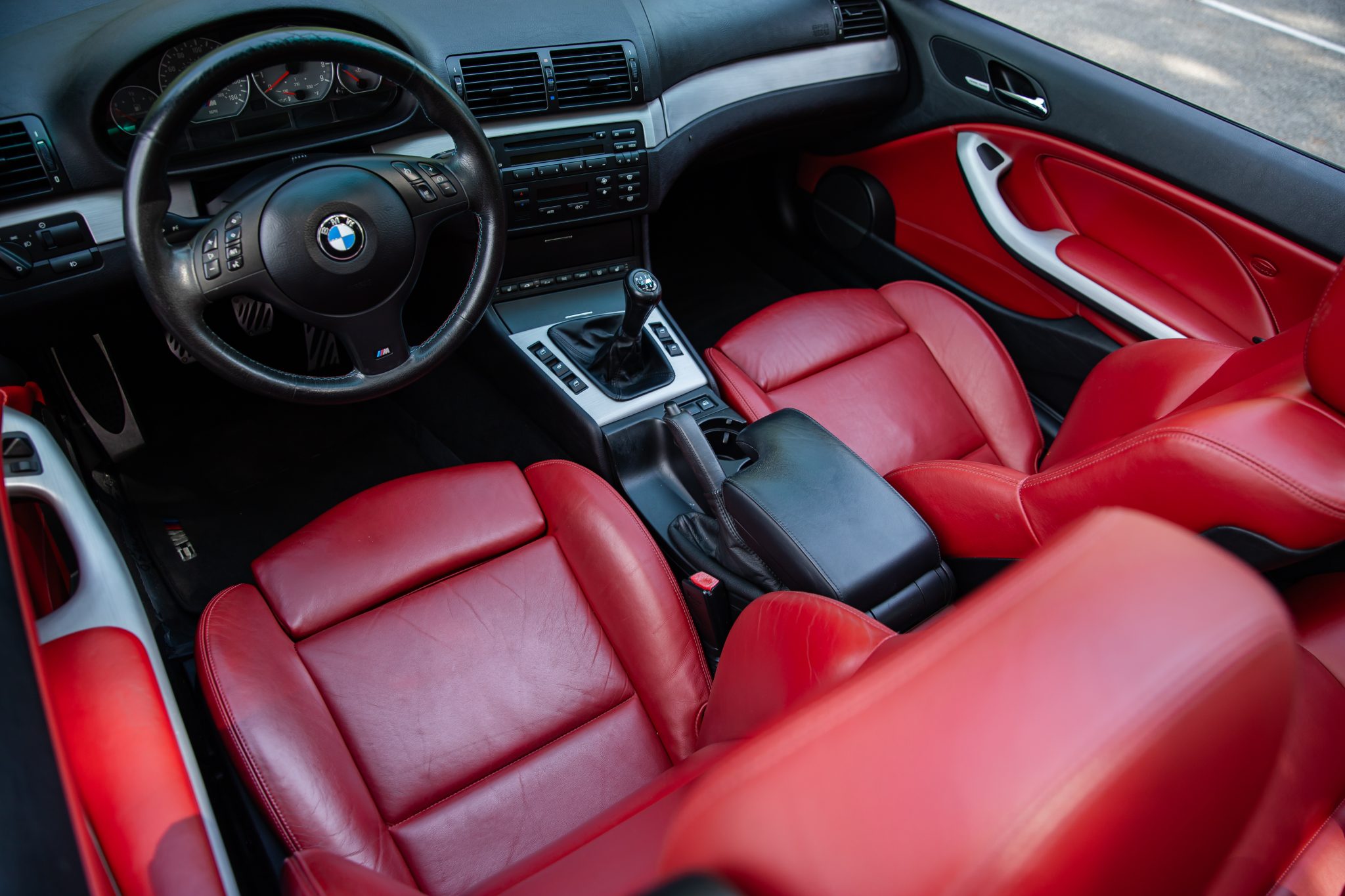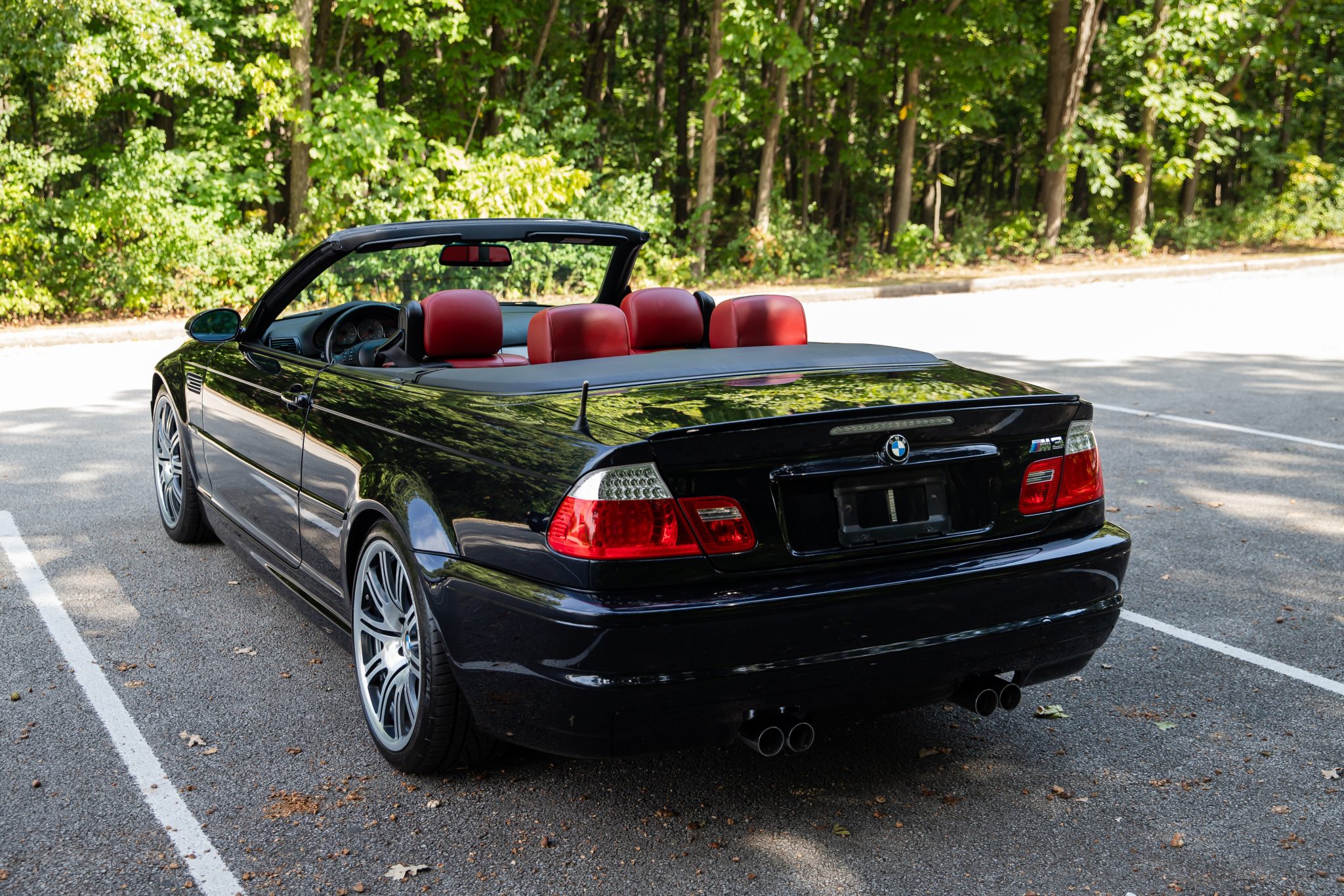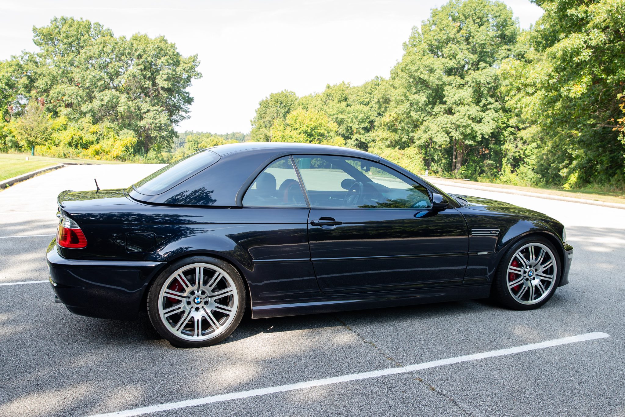This 2006 BMW M3 convertible has 52k miles The car is finished in Carbon Black Metallic over Imola Red Nappa leather and is powered by a 3.2-liter inline-six linked with a six-speed manual transmission and a limited-slip differential. Equipment includes a black soft top, a body-color removable hardtop, 19″ M double-spoke Style 67 wheels, xenon headlights, heated power-adjustable front sport seats, a Harman Kardon sound system, and automatic climate control.