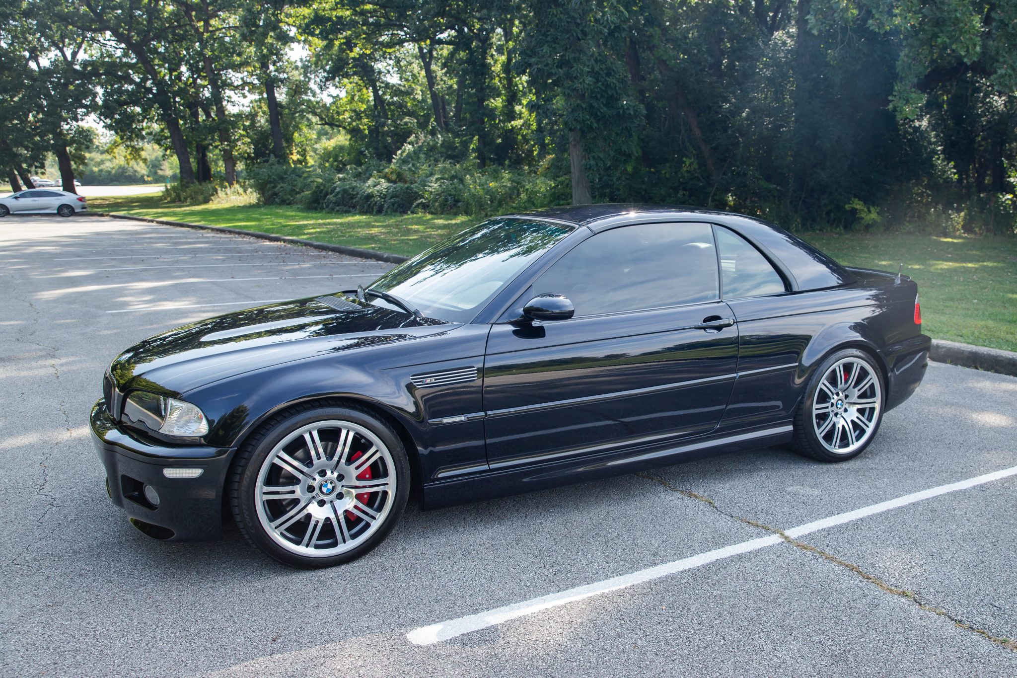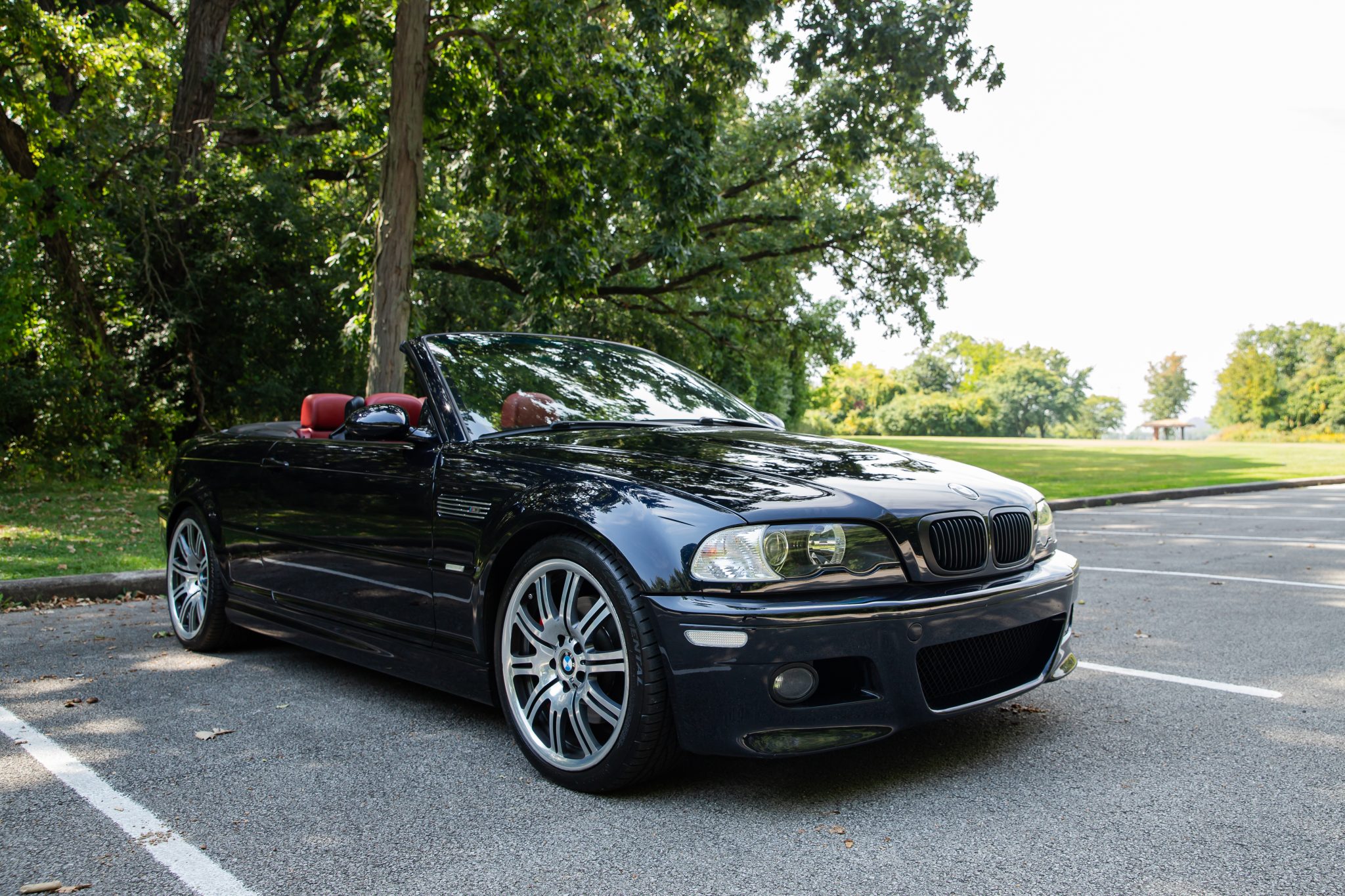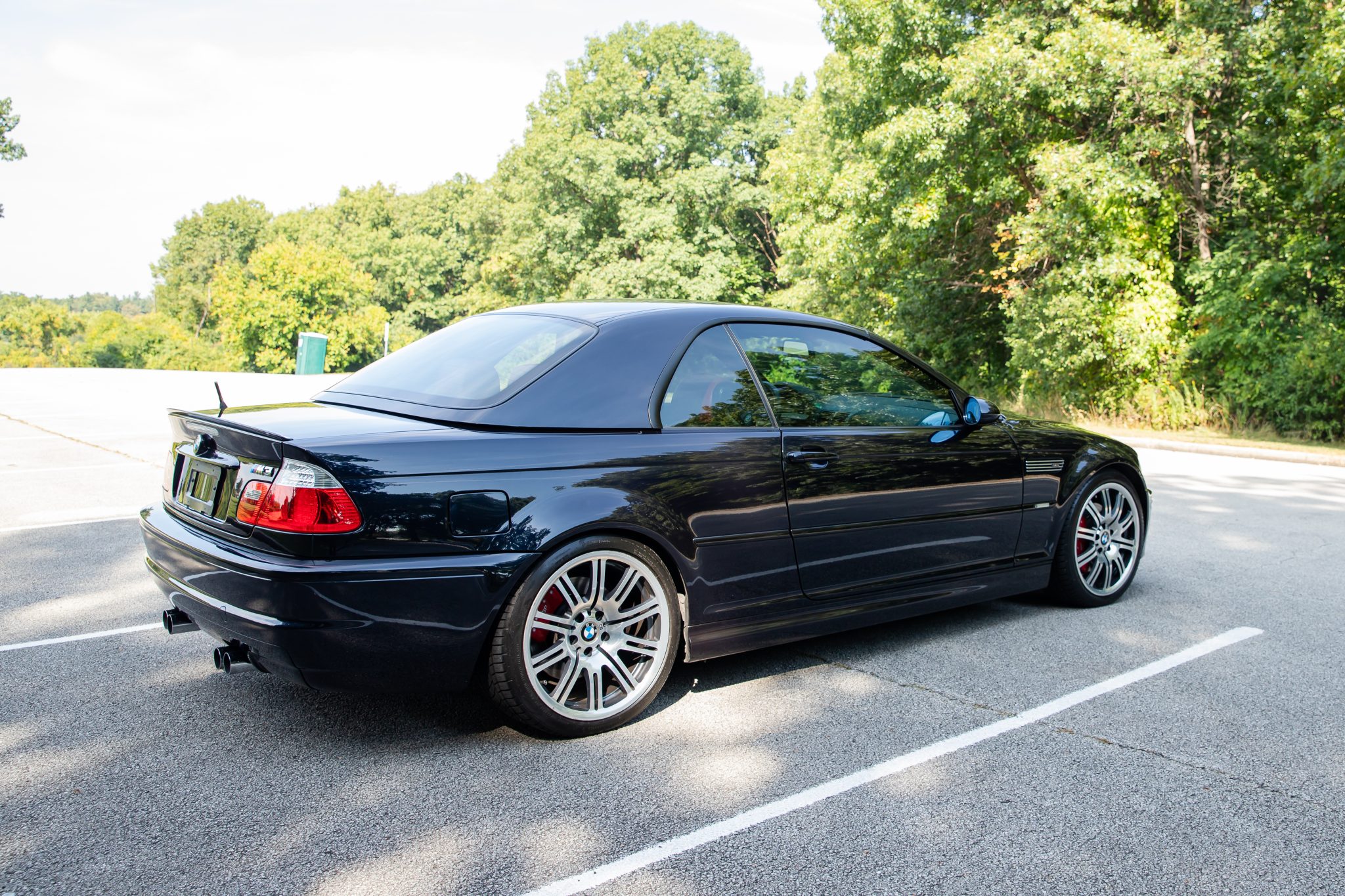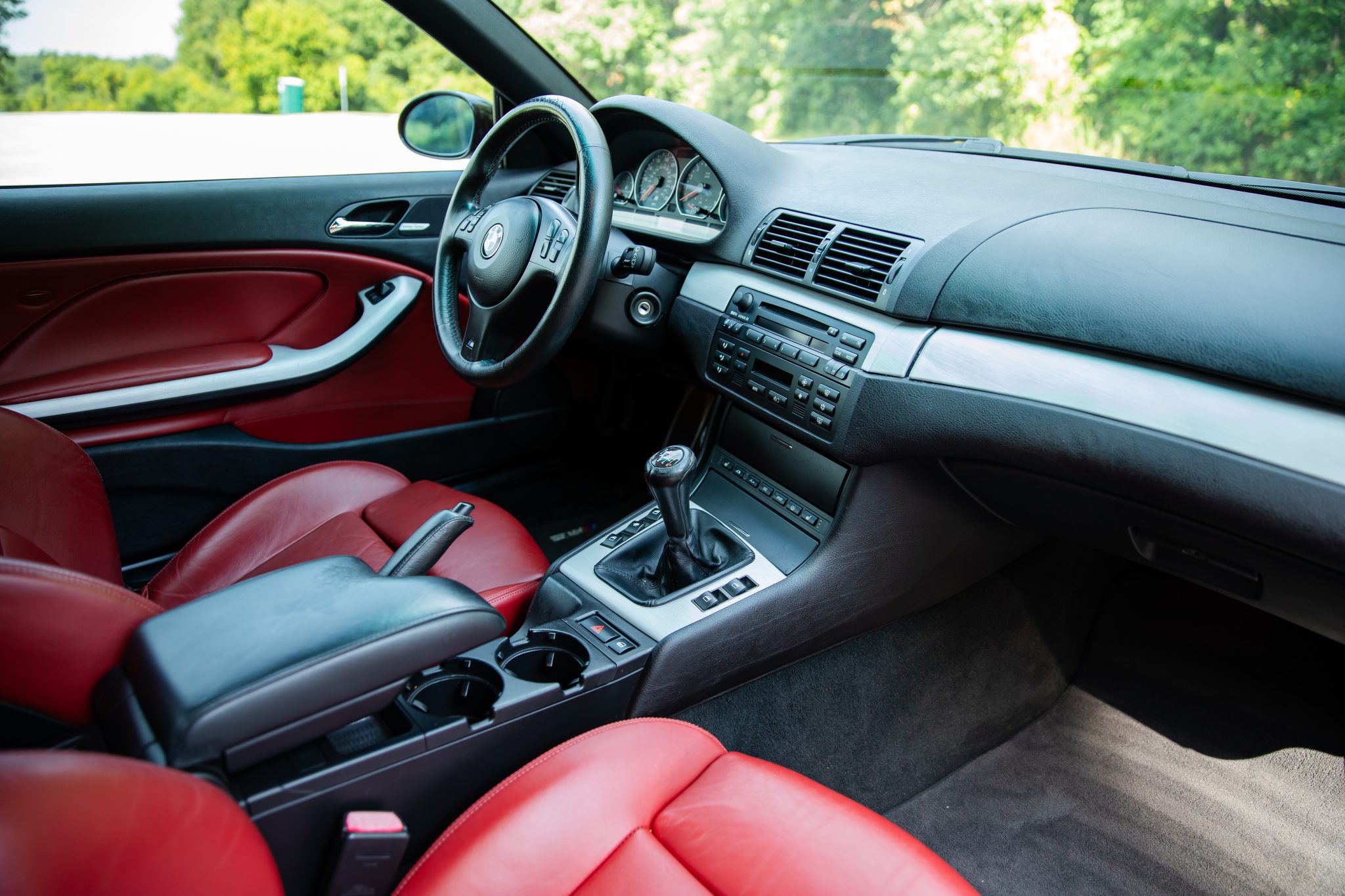 This 2006 BMW M3 convertible has 52k miles The car is finished in Carbon Black Metallic over Imola Red Nappa leather and is powered by a 3.2-liter inline-six linked with a six-speed manual transmission and a limited-slip differential. Equipment includes a black soft top, a body-color removable hardtop, 19″ M double-spoke Style 67 wheels, xenon headlights, heated power-adjustable front sport seats, a Harman Kardon sound system, and automatic climate control.