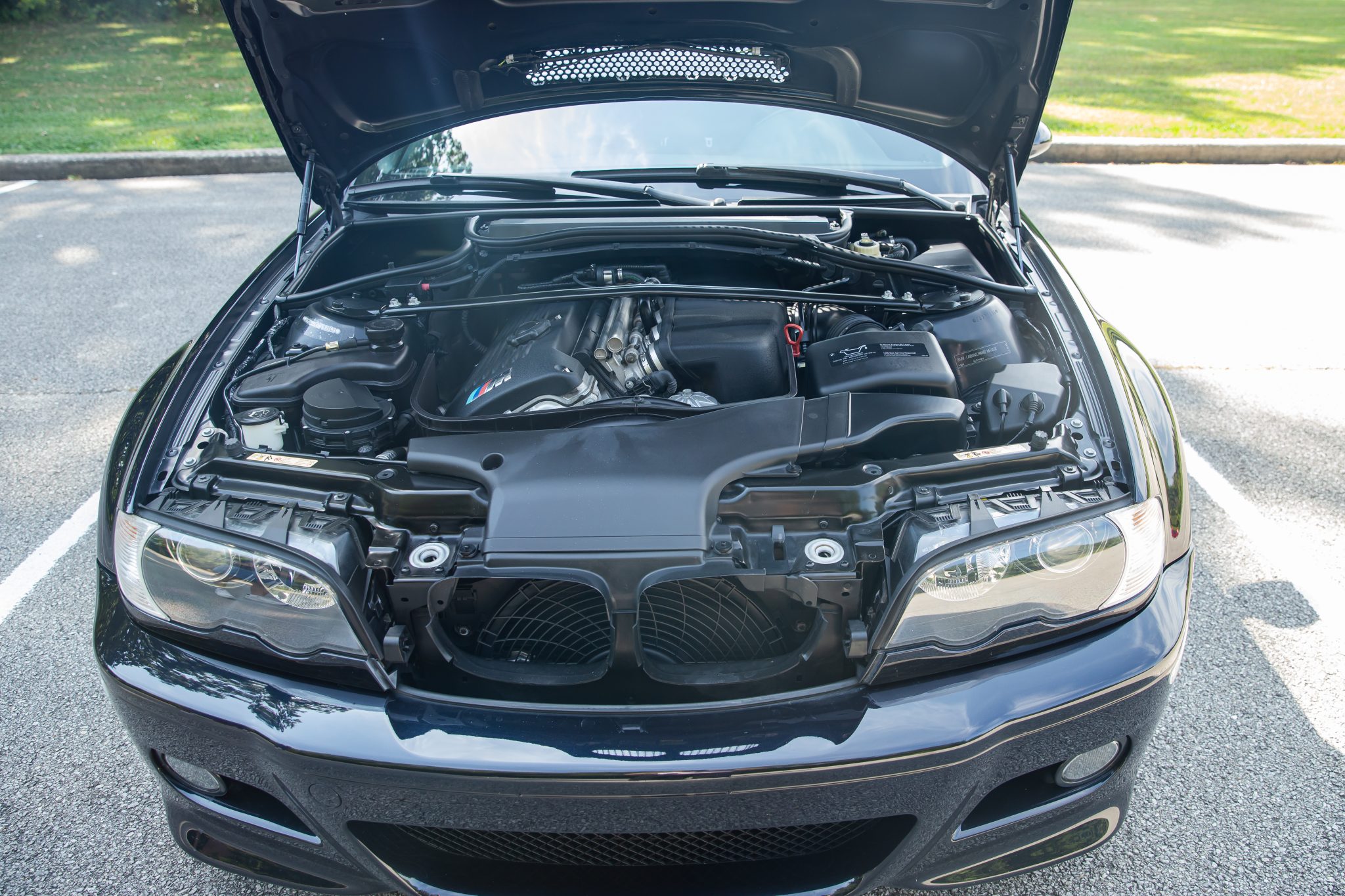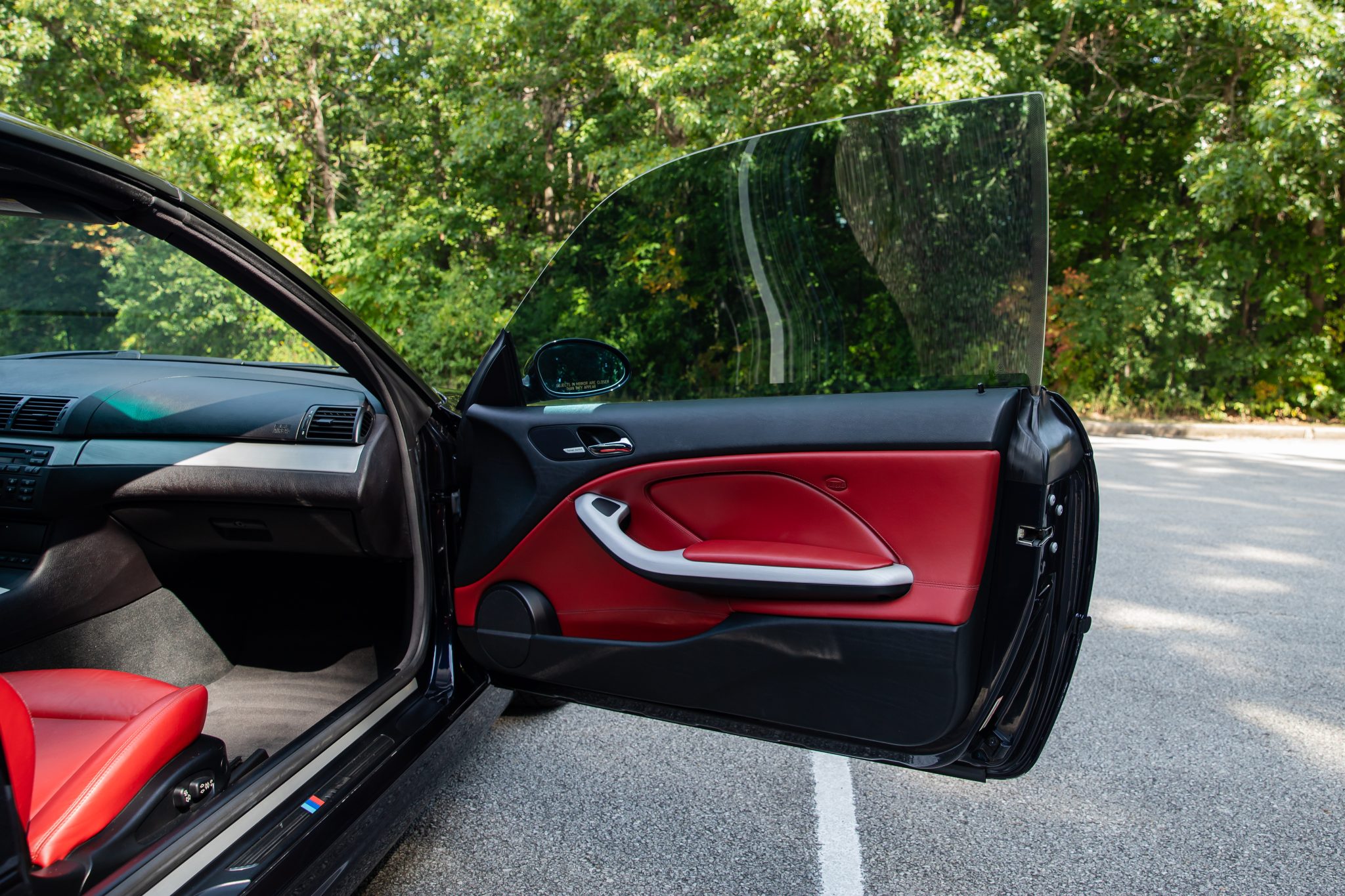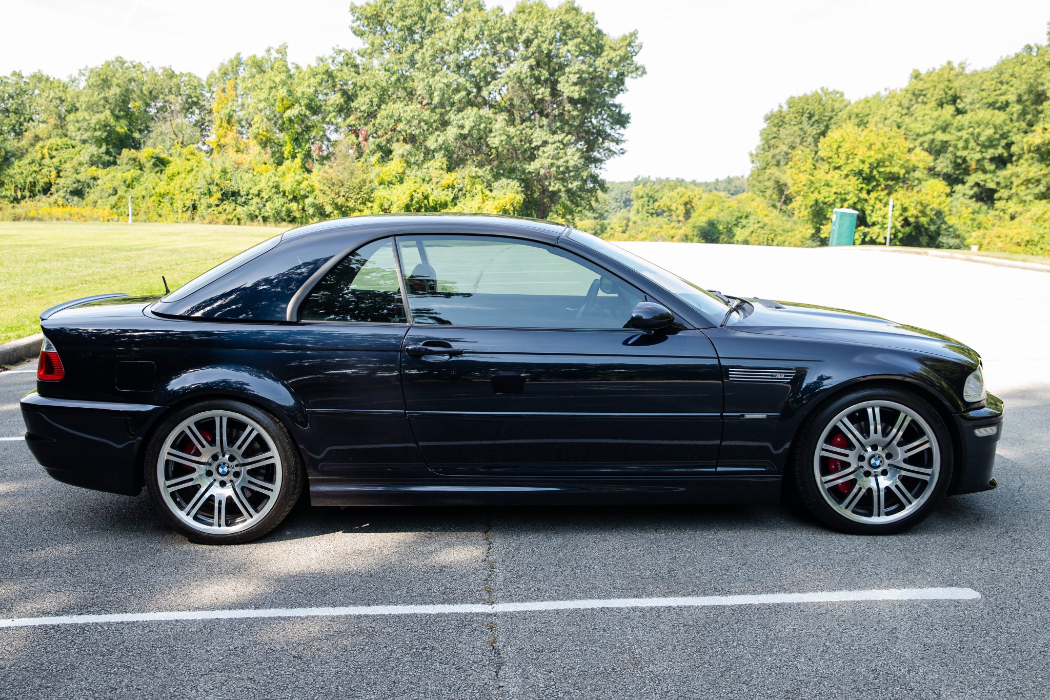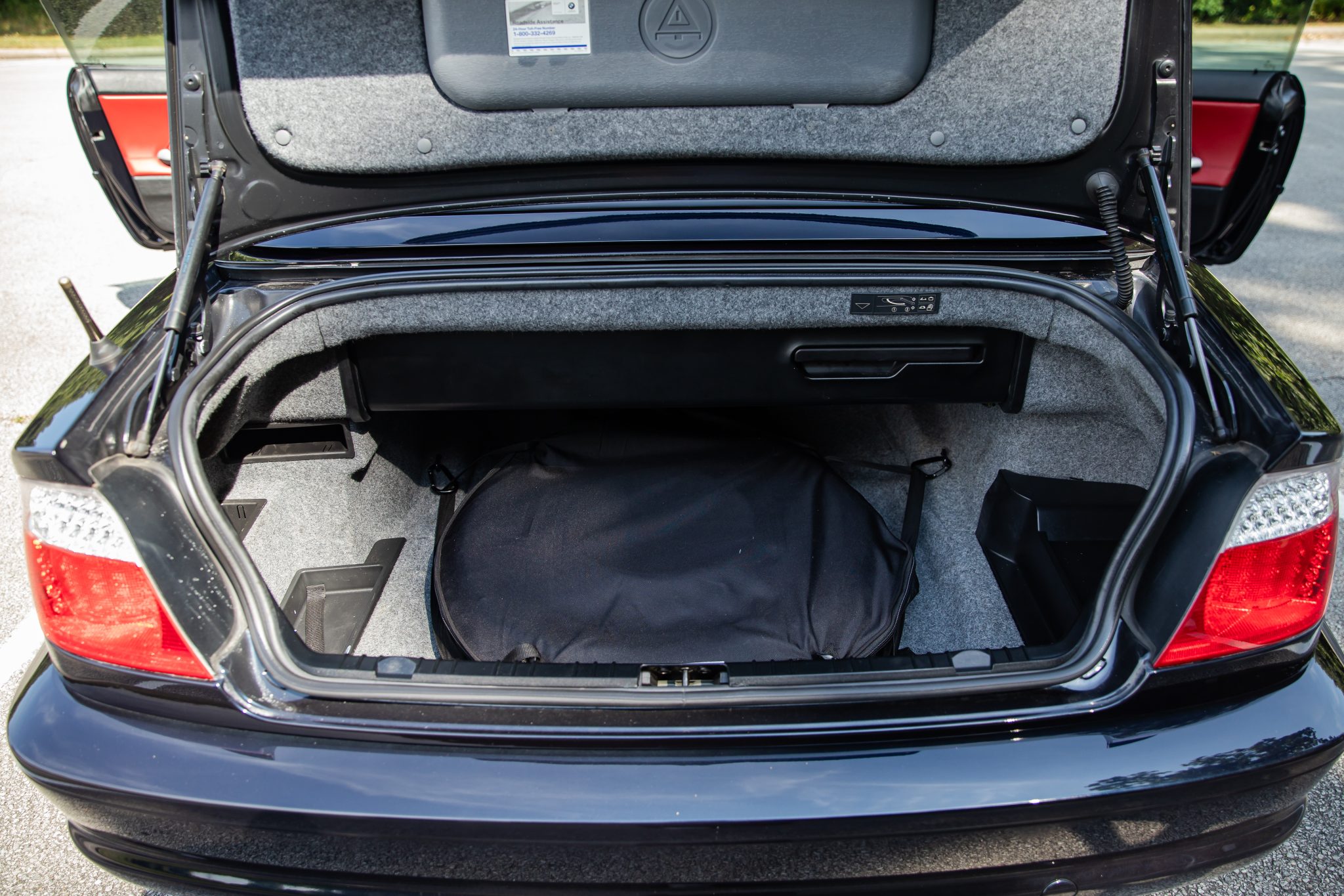 This 2006 BMW M3 convertible has 52k miles The car is finished in Carbon Black Metallic over Imola Red Nappa leather and is powered by a 3.2-liter inline-six linked with a six-speed manual transmission and a limited-slip differential. Equipment includes a black soft top, a body-color removable hardtop, 19″ M double-spoke Style 67 wheels, xenon headlights, heated power-adjustable front sport seats, a Harman Kardon sound system, and automatic climate control.