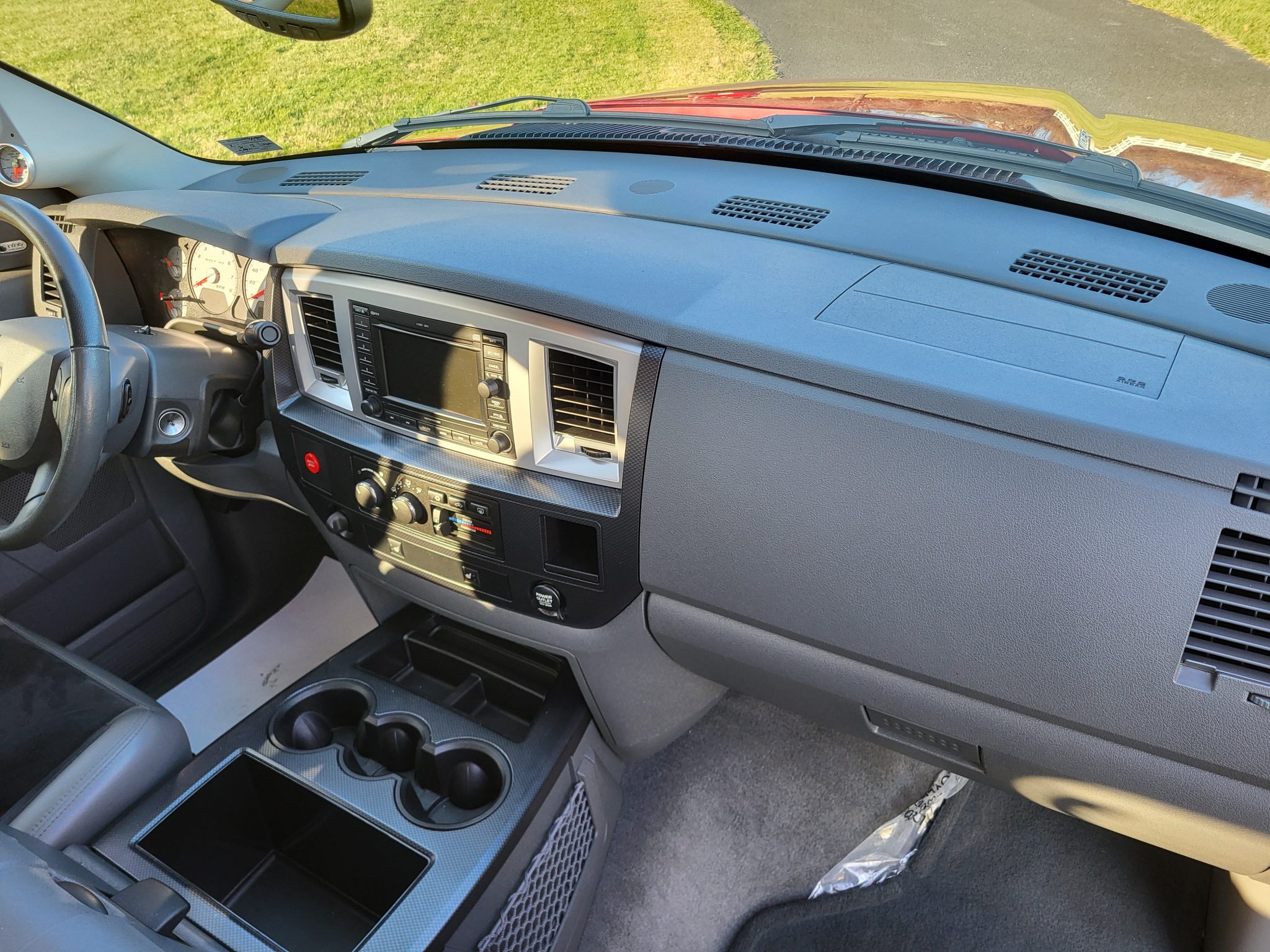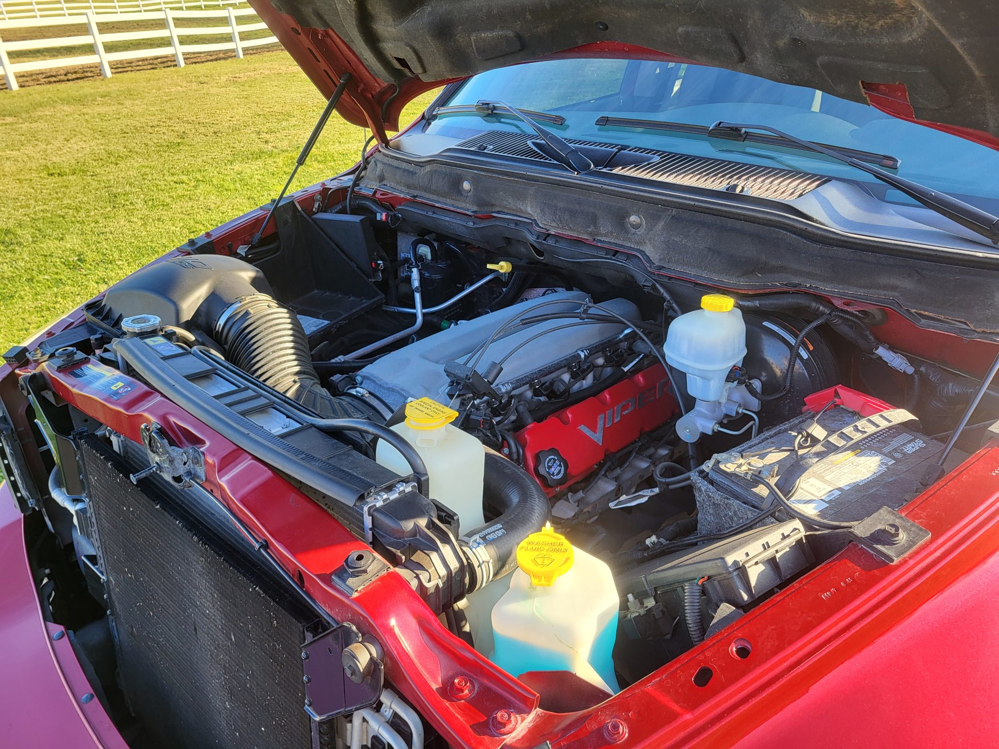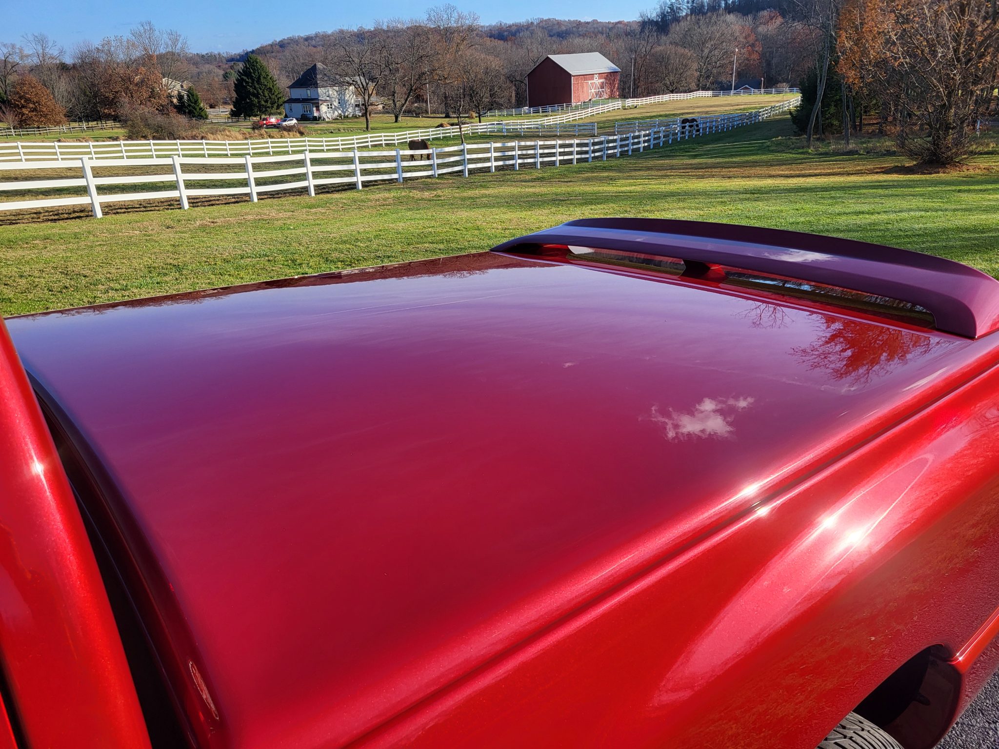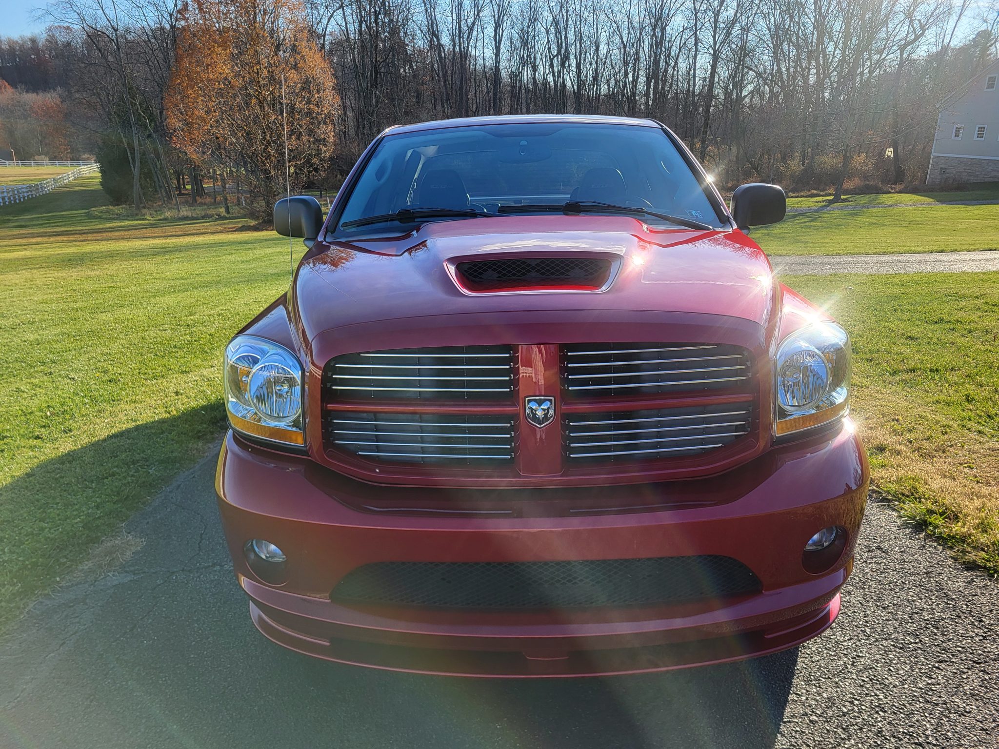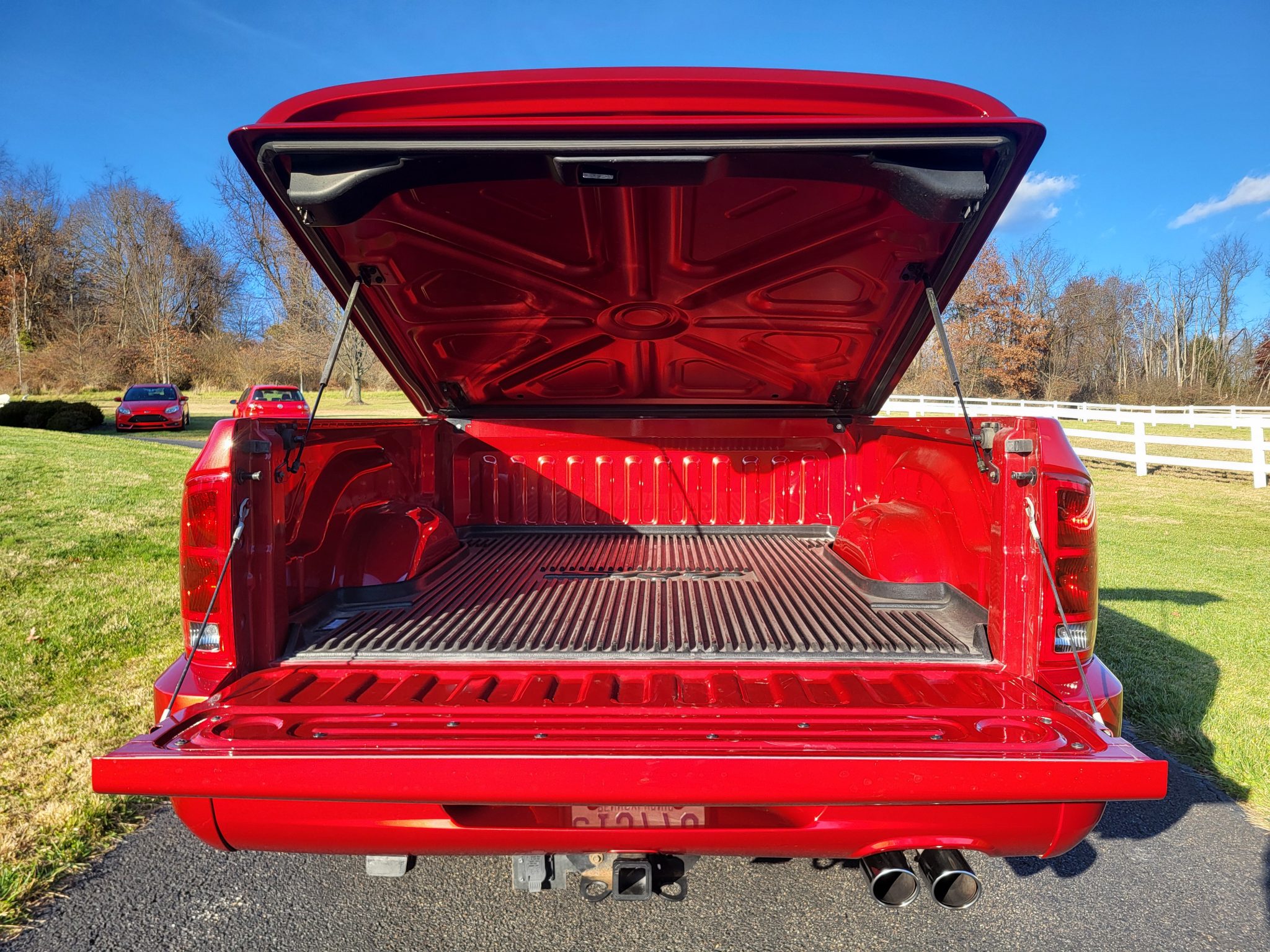 The truck is finished in Inferno Red over Medium Slate Gray leather and suede, and it is powered by a Viper-sourced 8.3-liter V10 linked with a four-speed automatic transmission and a limited-slip differential. Appointments include a fiberglass tonneau cover, a rear spoiler, a drop-in bedliner, a receiver hitch, polished 22″ alloy wheels, heated front seats, a K40 radar detector, an Infinity sound system, and dual-zone manual air conditioning.