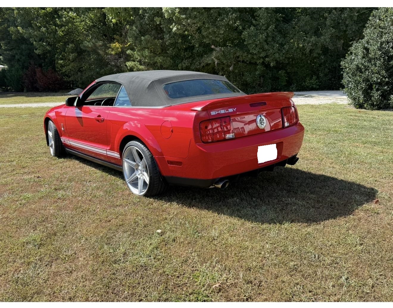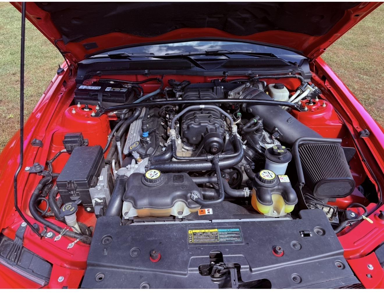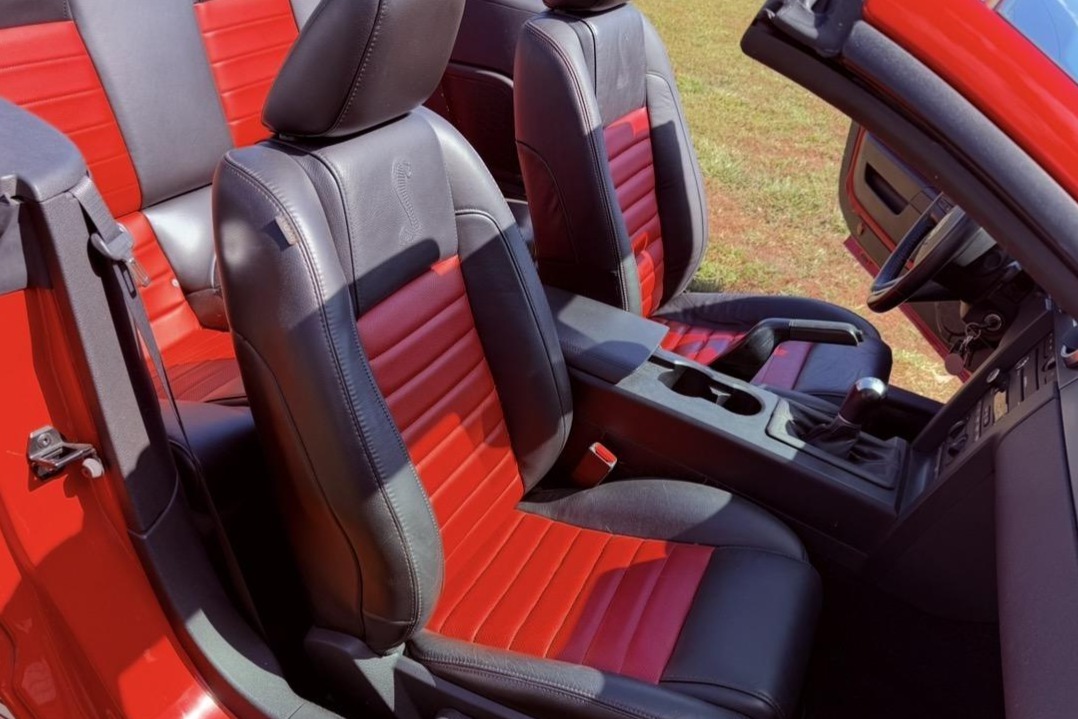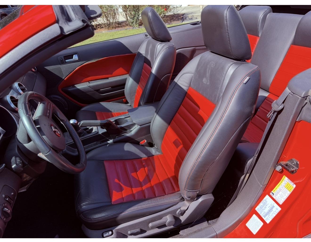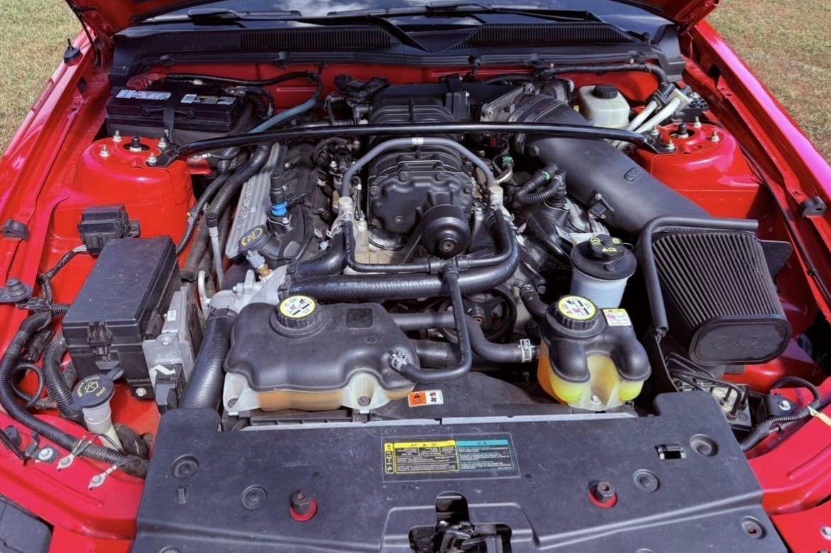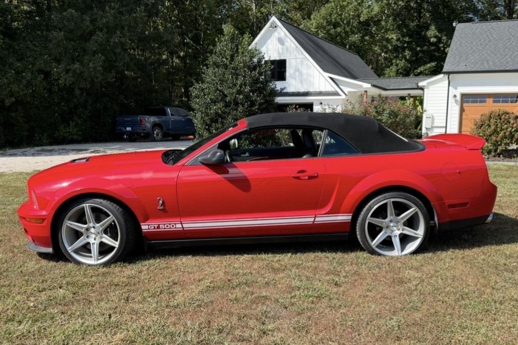 The car is finished in Torch Red over Charcoal Black and Crimson Red leather, and it is powered by a supercharged 5.4-liter V8 paired with a six-speed manual transmission and a limited-slip differential. Equipment includes a C&L air-intake system, a power-retractable black soft top, a revised rear diffuser, 18″ KMC six-spoke wheels, a Shaker 500 sound system, and a power-adjustable driver’s seat.
