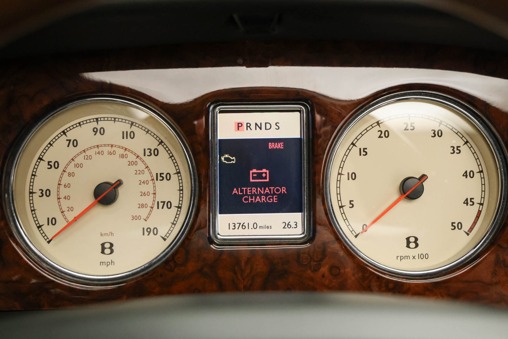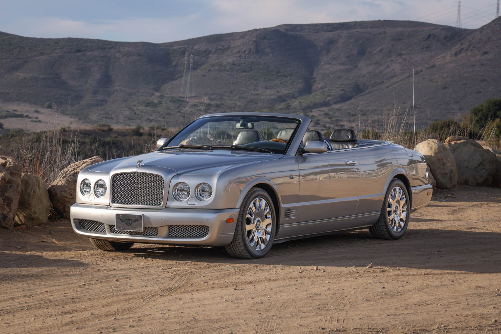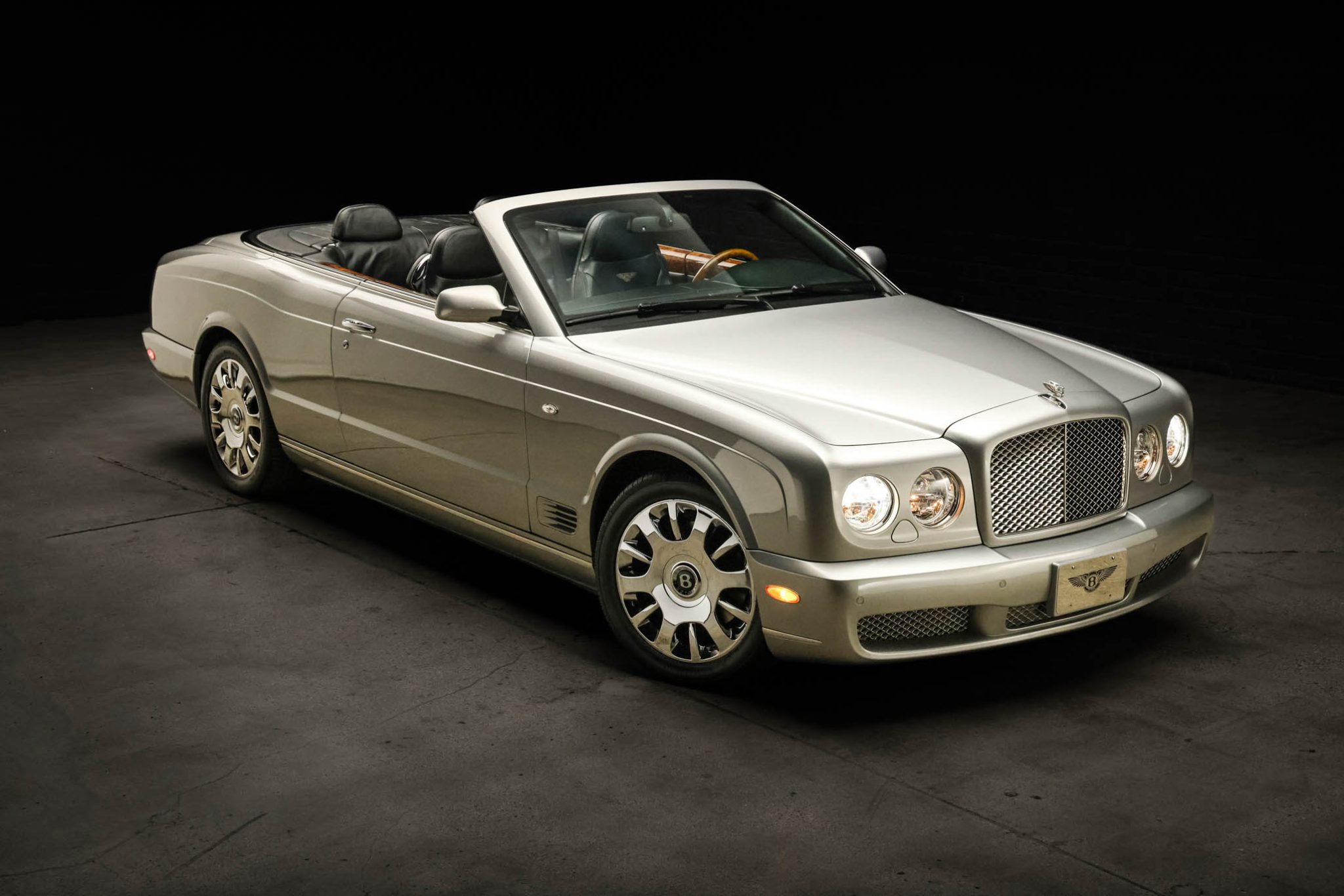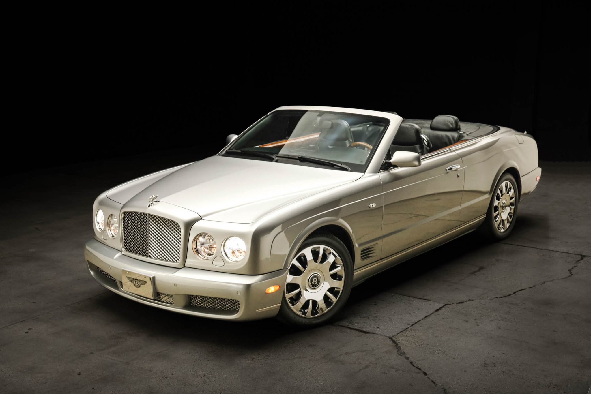 Finished in Silver Pearl over Beluga leather, the convertible is powered by a twin-turbocharged 6.75-liter V8 linked with a six-speed automatic transmission. Equipment includes massaging and heated front seats, a premium audio system, a black soft top, 19″ 12-spoke wheels, an electronically controlled adaptive suspension, and an Alpine stereo with Bluetooth.