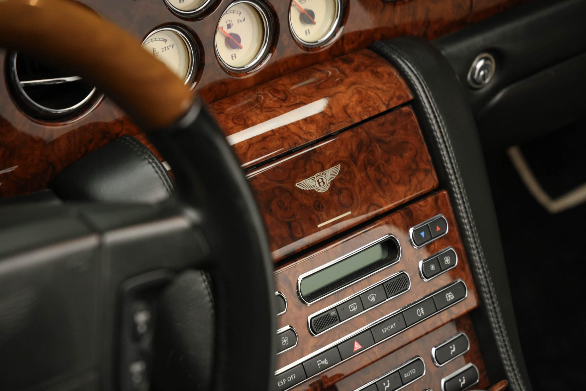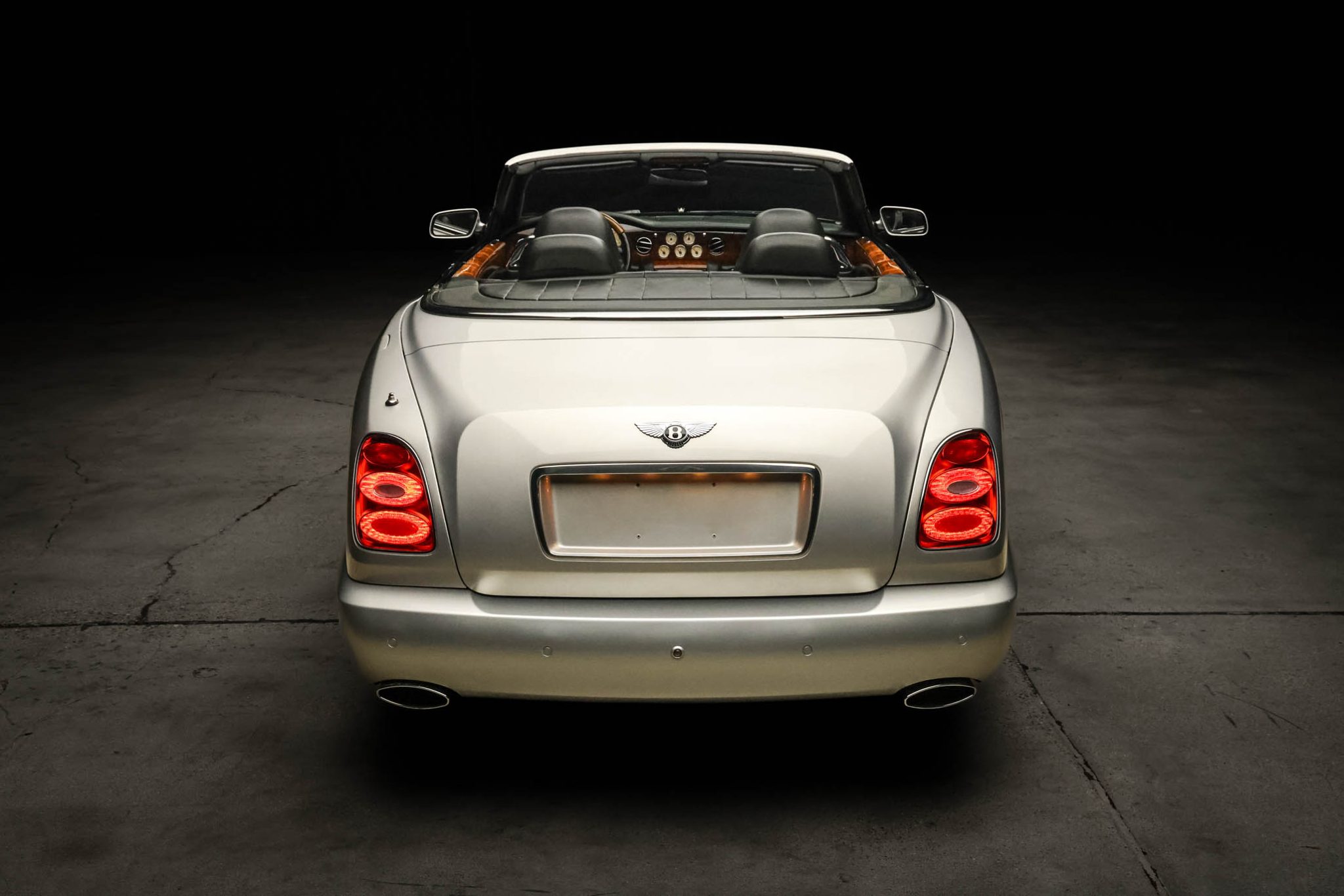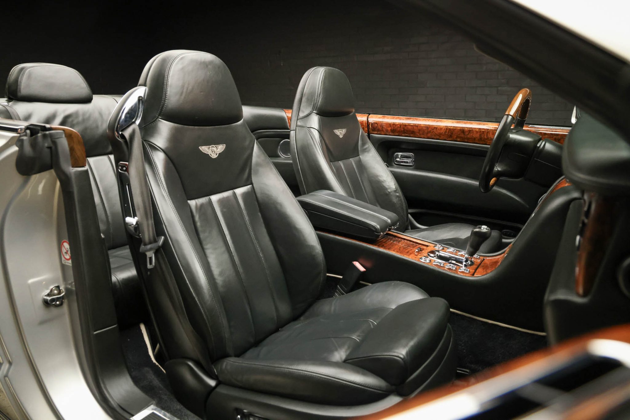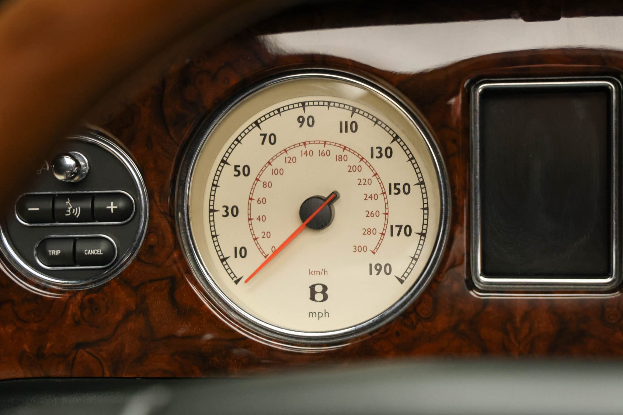 Finished in Silver Pearl over Beluga leather, the convertible is powered by a twin-turbocharged 6.75-liter V8 linked with a six-speed automatic transmission. Equipment includes massaging and heated front seats, a premium audio system, a black soft top, 19″ 12-spoke wheels, an electronically controlled adaptive suspension, and an Alpine stereo with Bluetooth.