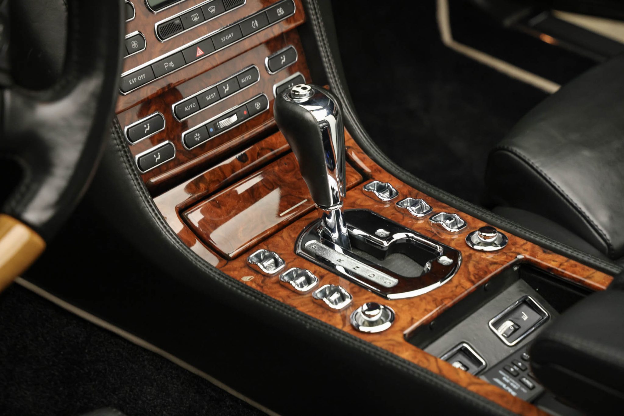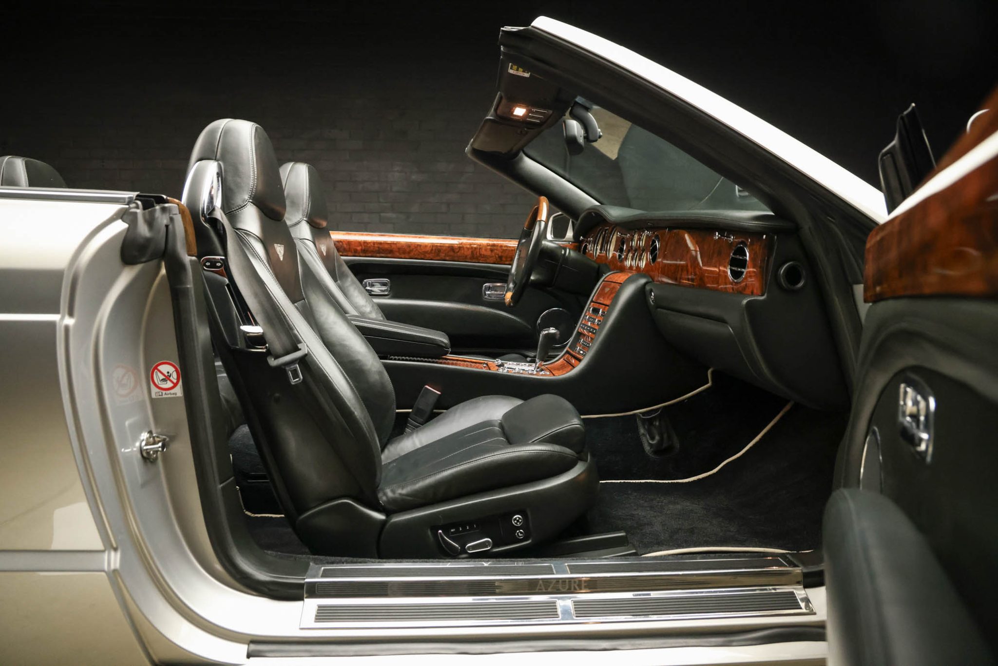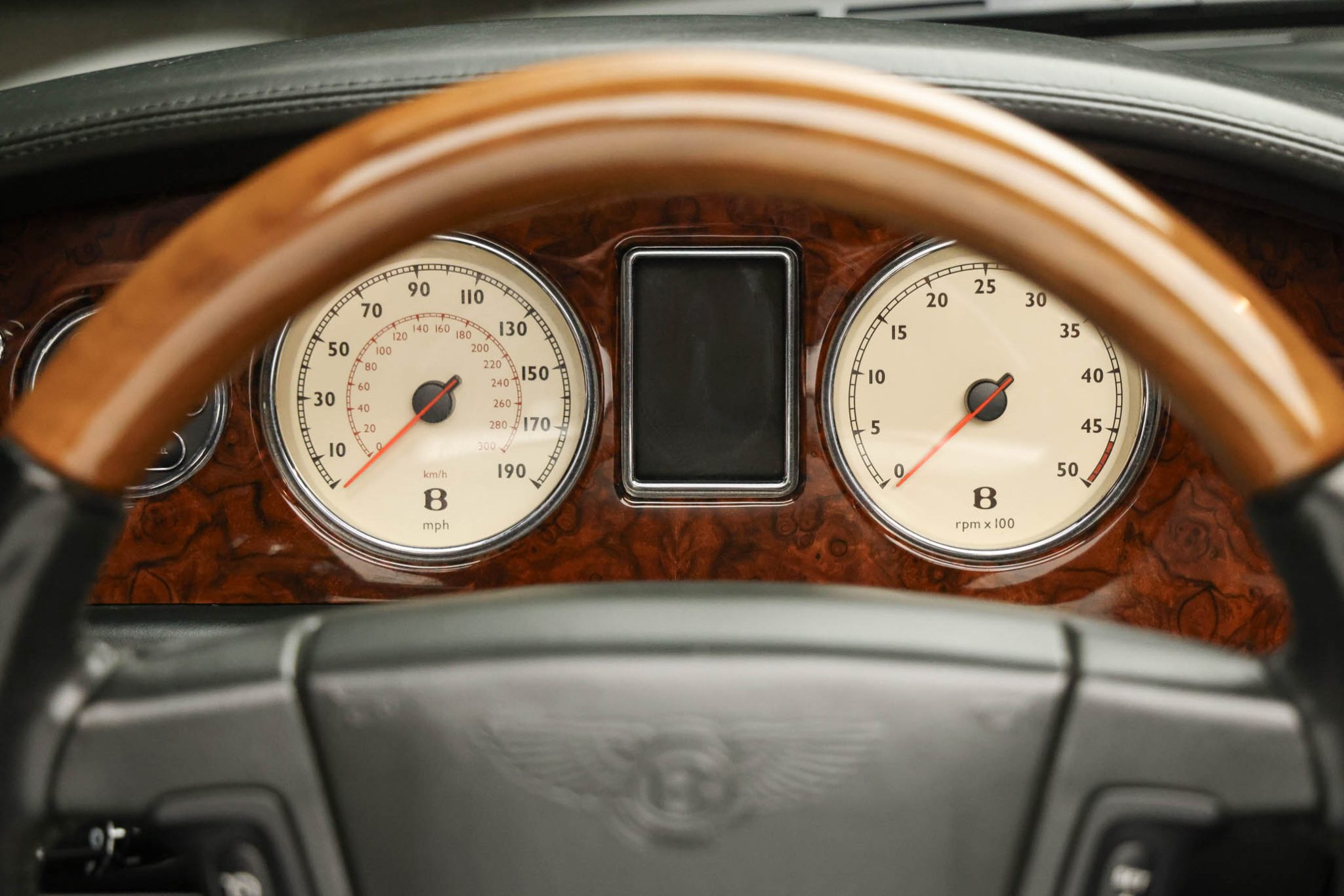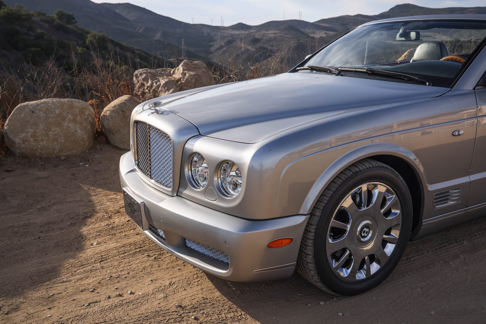 Finished in Silver Pearl over Beluga leather, the convertible is powered by a twin-turbocharged 6.75-liter V8 linked with a six-speed automatic transmission. Equipment includes massaging and heated front seats, a premium audio system, a black soft top, 19″ 12-spoke wheels, an electronically controlled adaptive suspension, and an Alpine stereo with Bluetooth.