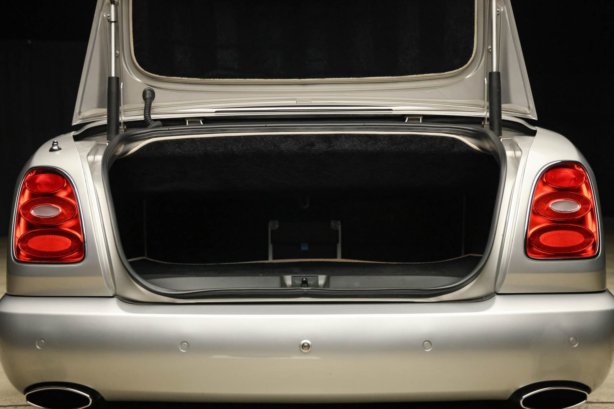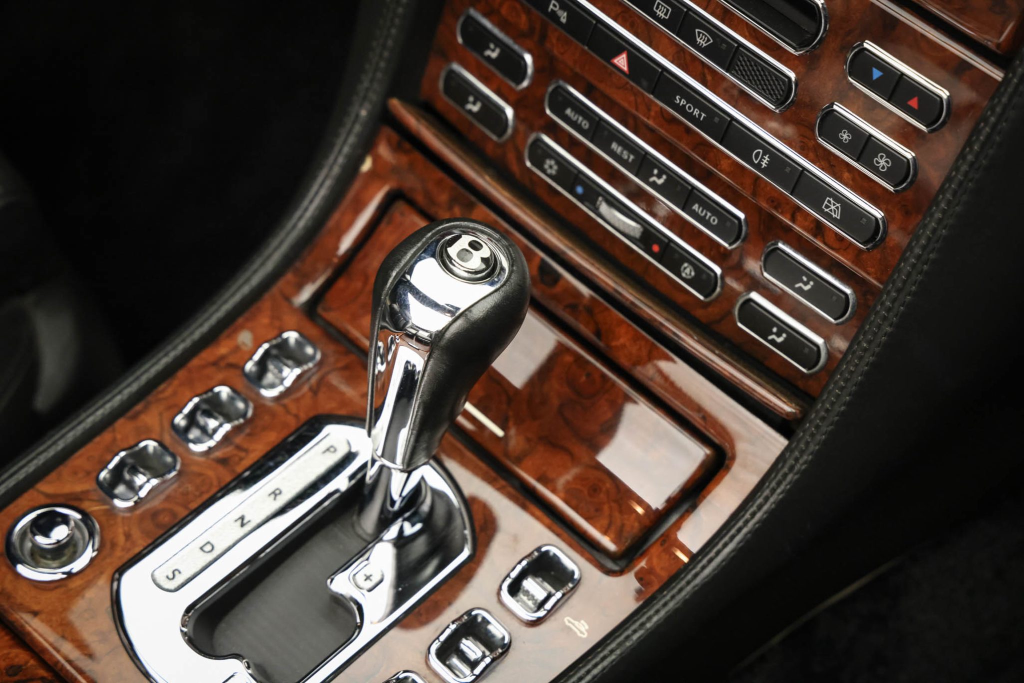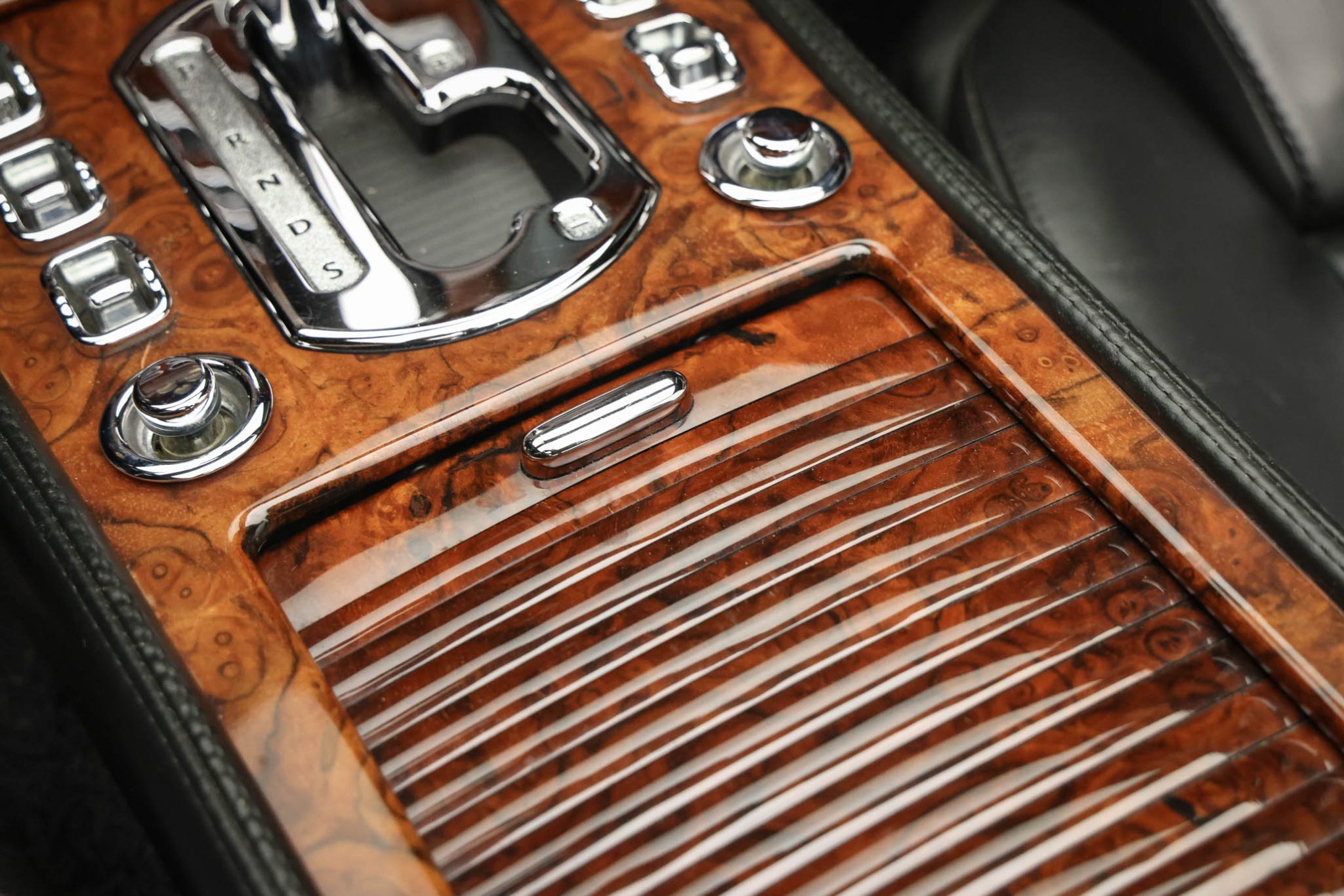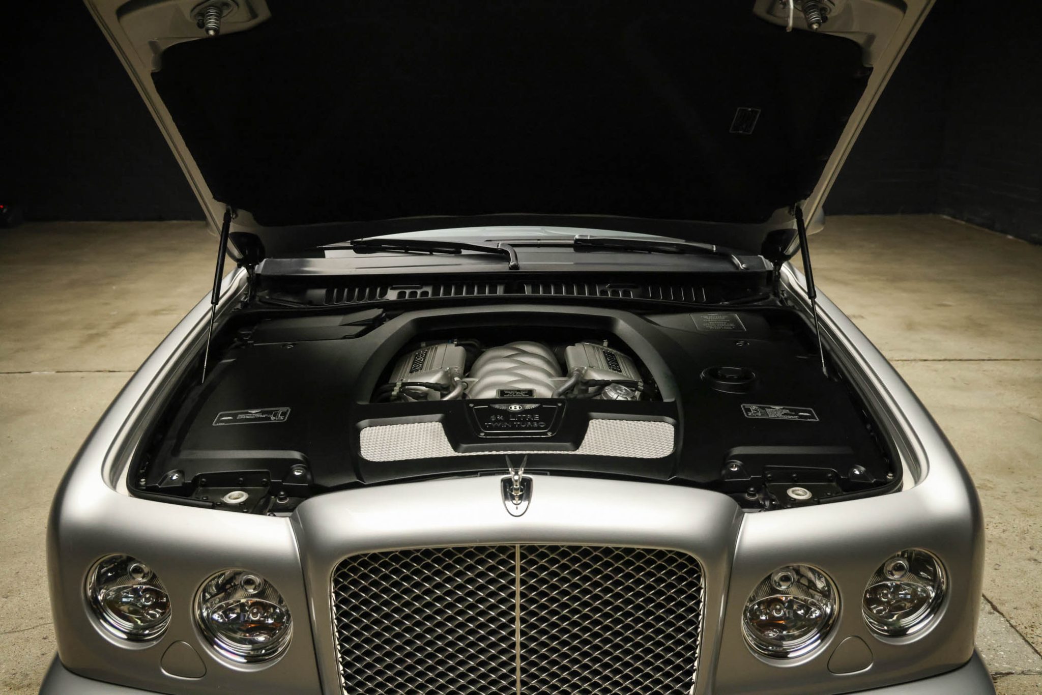 Finished in Silver Pearl over Beluga leather, the convertible is powered by a twin-turbocharged 6.75-liter V8 linked with a six-speed automatic transmission. Equipment includes massaging and heated front seats, a premium audio system, a black soft top, 19″ 12-spoke wheels, an electronically controlled adaptive suspension, and an Alpine stereo with Bluetooth.