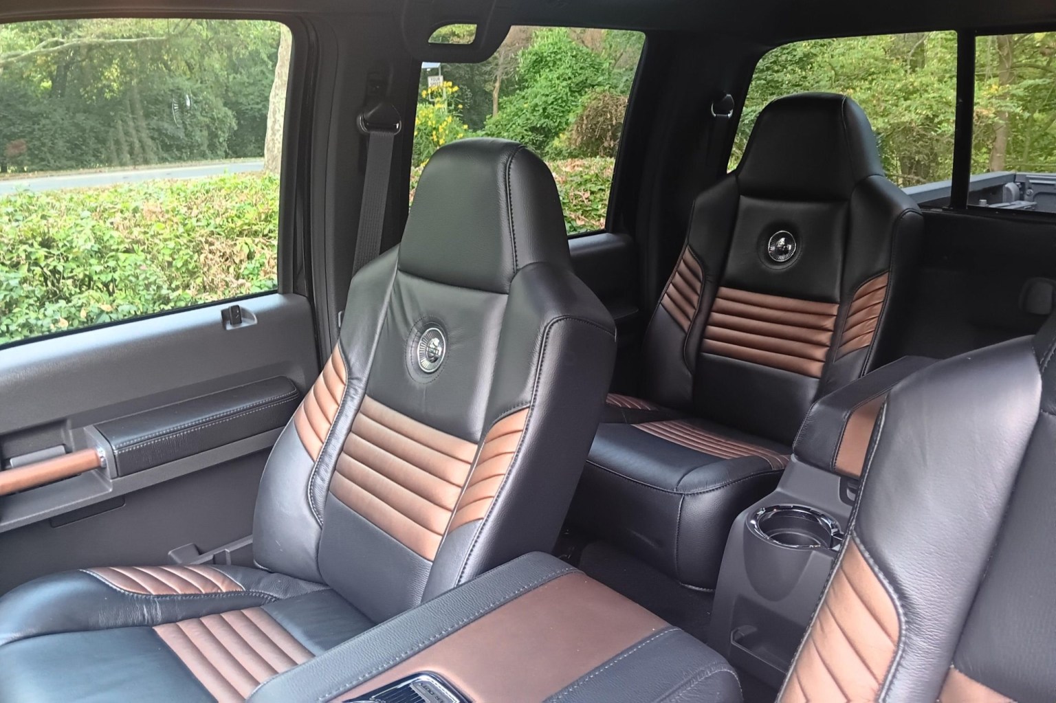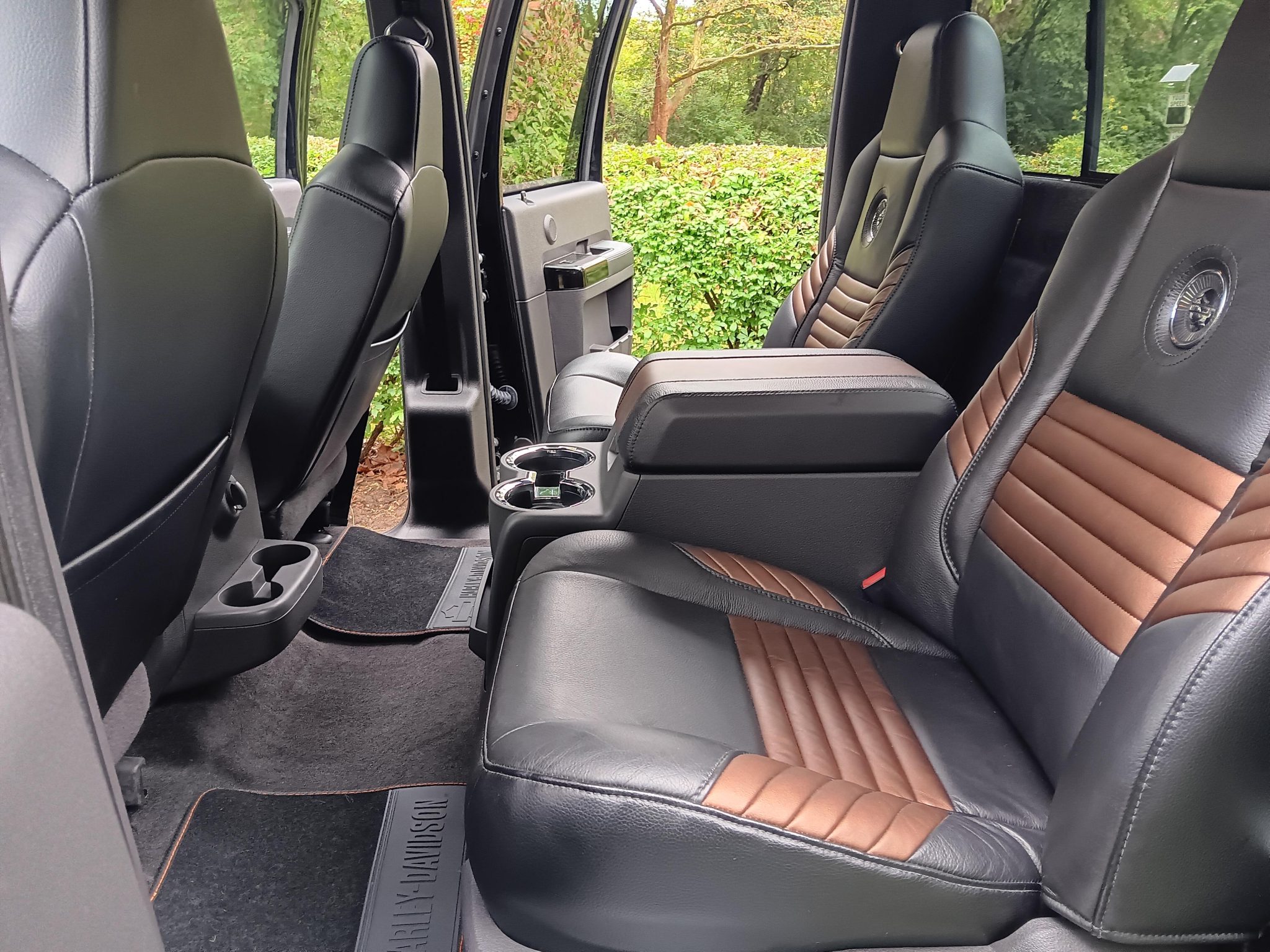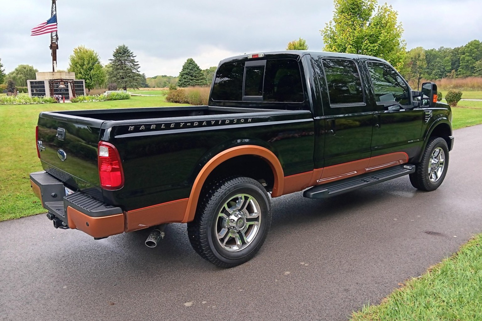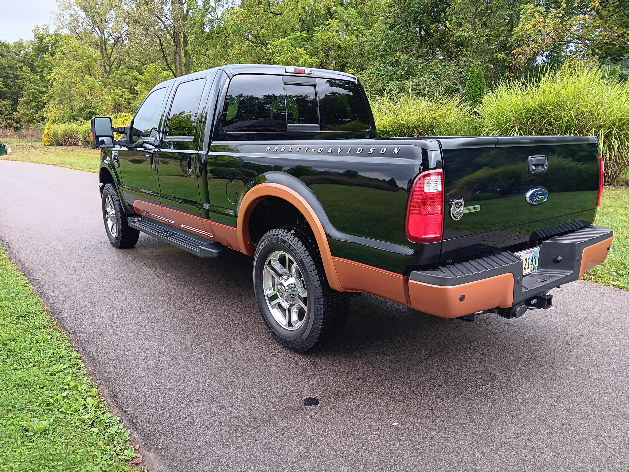 This 2008 Ford F-250 Super Duty is a Harley-Davidson Edition Crew Cab 4×4 Finished in Black and Vintage Copper, the truck is powered by a 6.8-liter V10 linked with a five-speed automatic transmission, a dual-range transfer case, and a limited-slip rear differential. Equipment includes antilock disc brakes, 20″ alloy wheels, a sunroof, running boards, a sliding rear window, a spray-on bedliner, a tailgate step, a receiver hitch, parking sensors, heated power-adjustable front seats, rear bucket seats, dual-zone automatic climate control, power windows, and an AM/FM stereo.