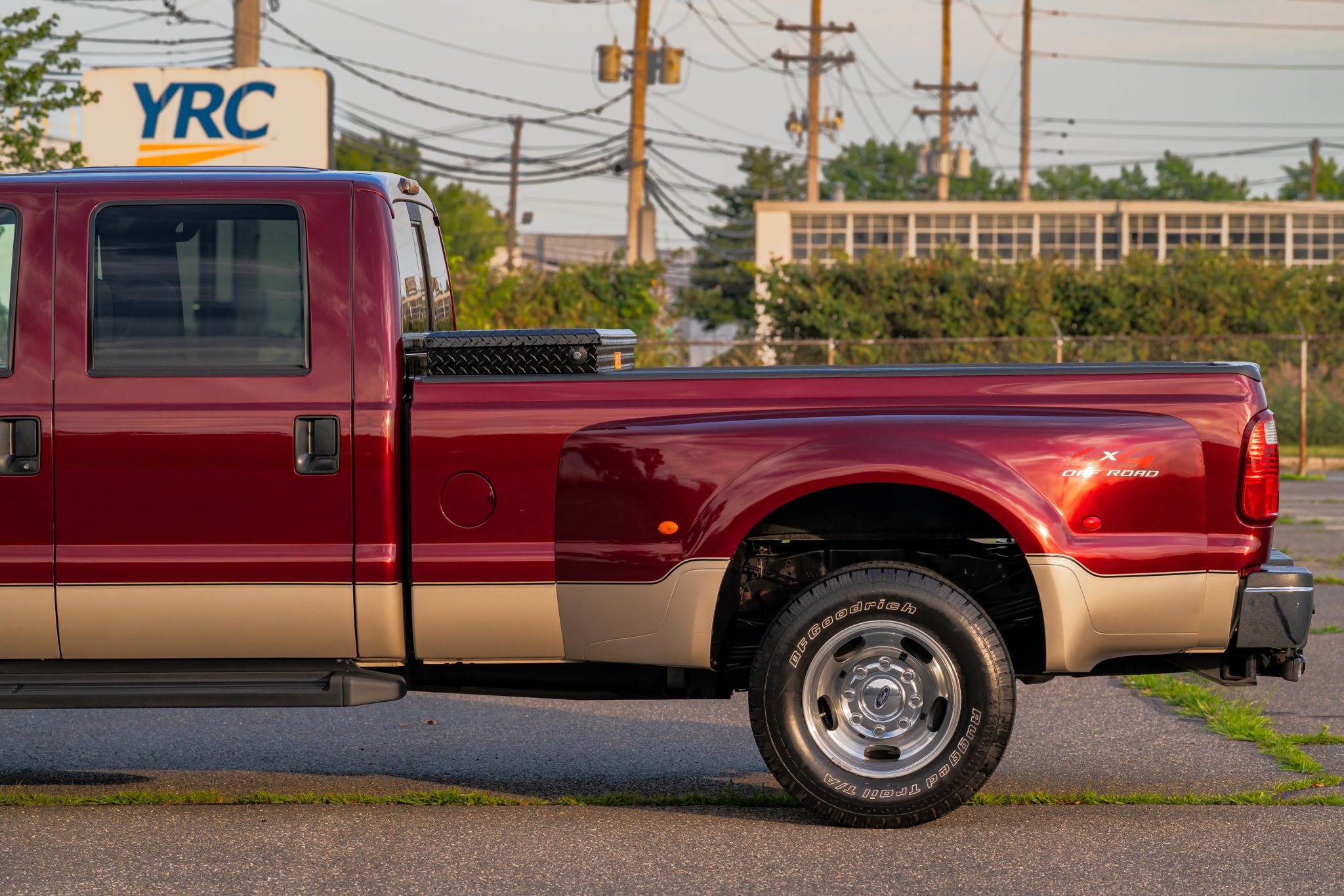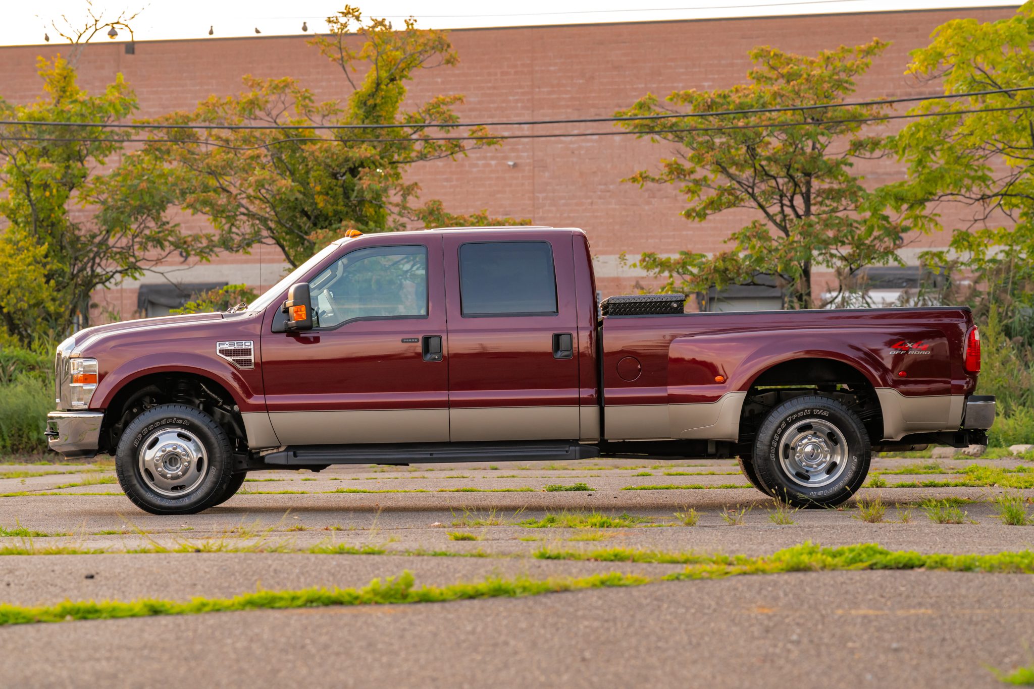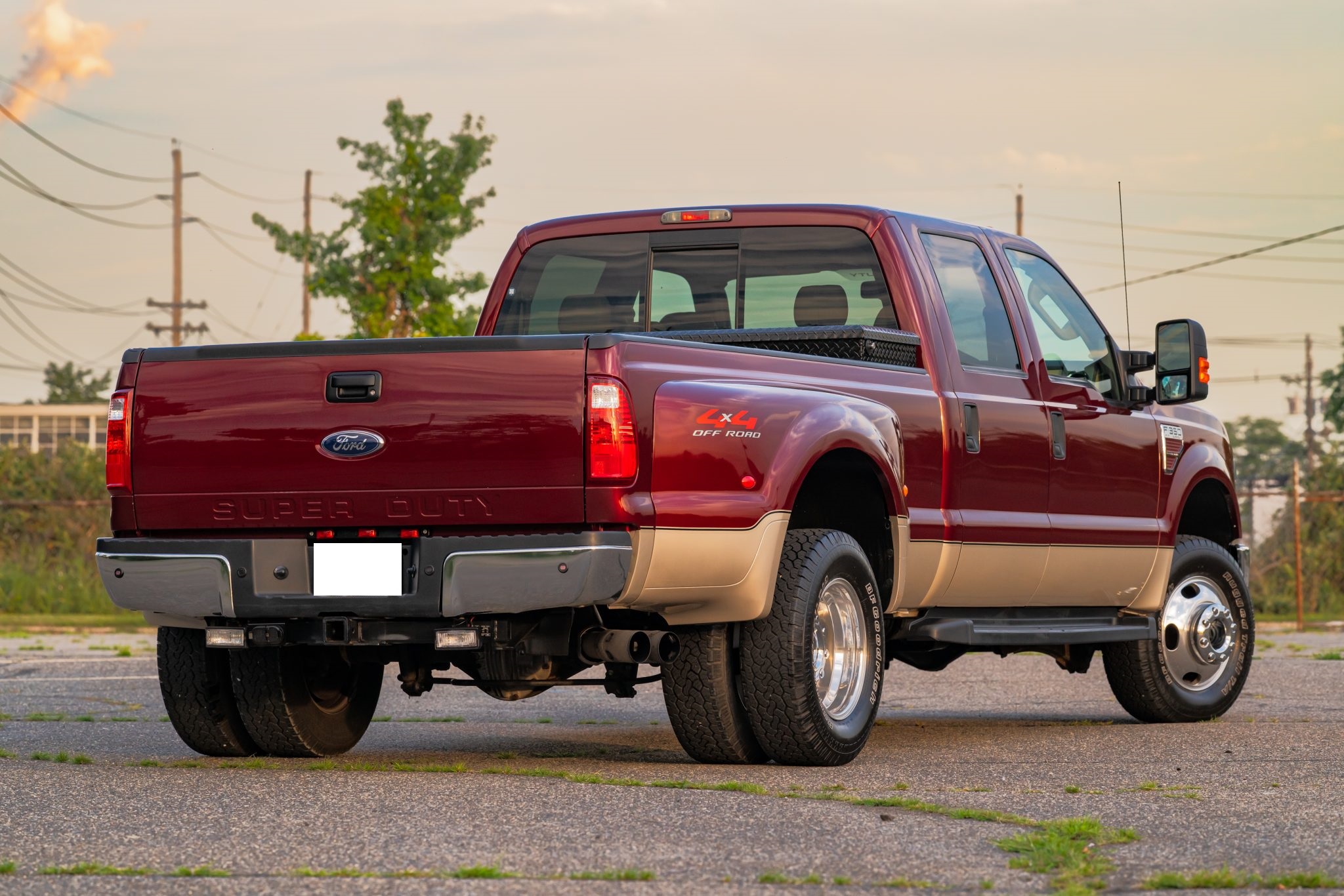 Finished in Dark Toreador and Pueblo Gold Metallic over Camel leather, the truck is powered by a 6.4-liter Power Stroke turbodiesel V8 linked with a five-speed automatic transmission, a dual-range transfer case, and a limited-slip rear differential. Equipment includes the 4×4 Off-Road Package, a power sunroof, a bed-mounted toolbox, cab marker lights, 17″ eight-lug wheels, heated front seats, power-adjustable pedals, automatic climate control, cruise control, and a CD stereo.