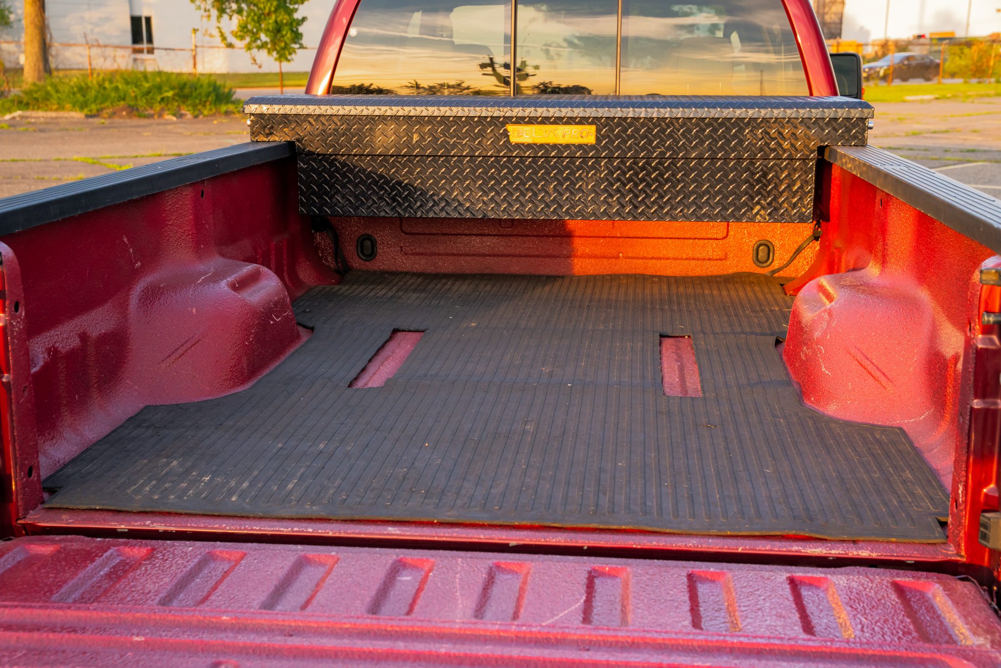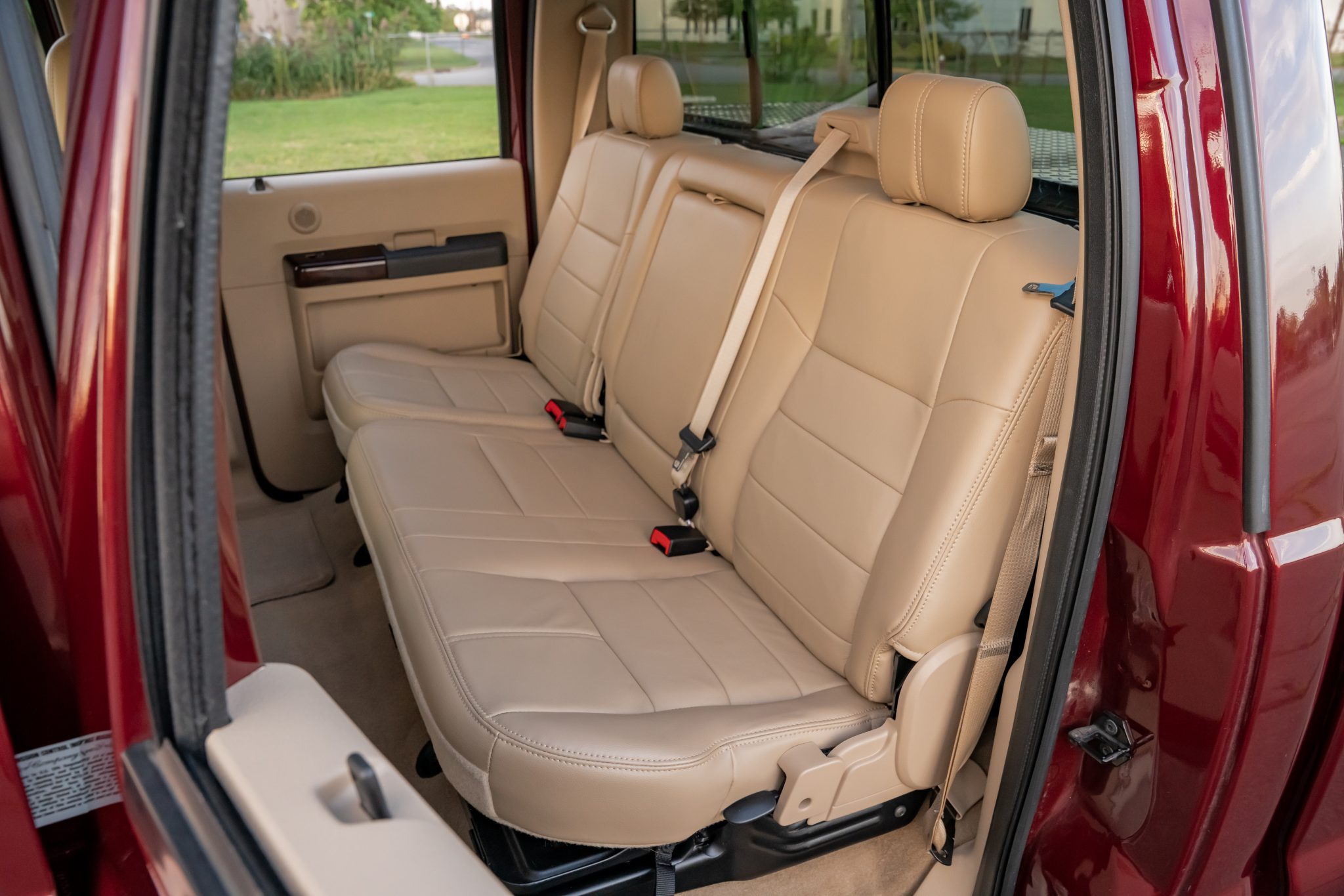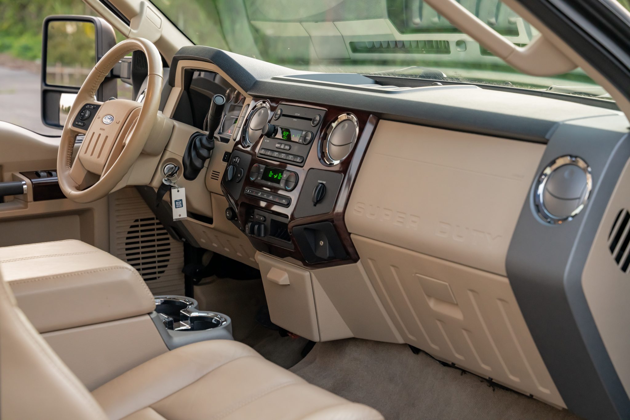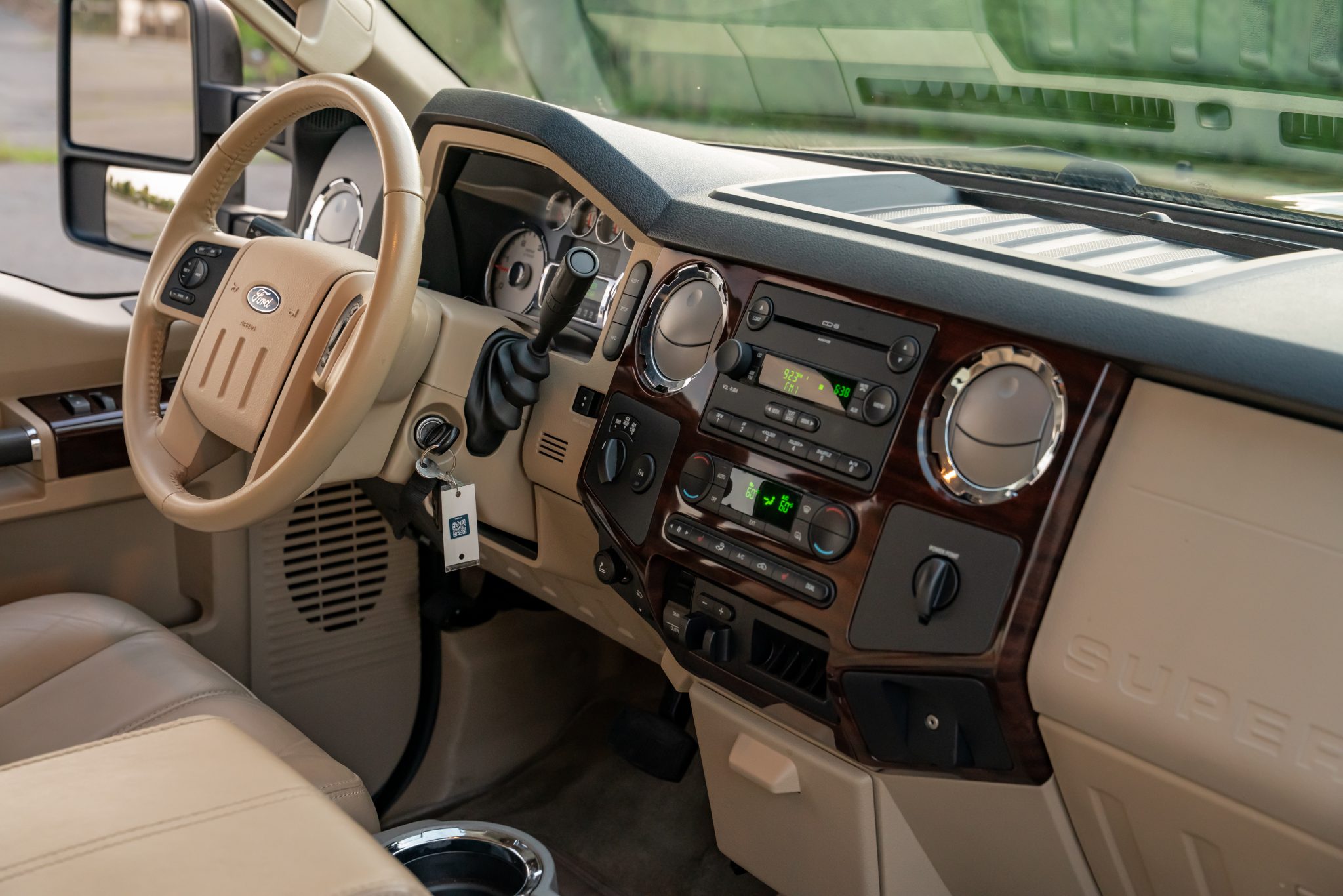 Finished in Dark Toreador and Pueblo Gold Metallic over Camel leather, the truck is powered by a 6.4-liter Power Stroke turbodiesel V8 linked with a five-speed automatic transmission, a dual-range transfer case, and a limited-slip rear differential. Equipment includes the 4×4 Off-Road Package, a power sunroof, a bed-mounted toolbox, cab marker lights, 17″ eight-lug wheels, heated front seats, power-adjustable pedals, automatic climate control, cruise control, and a CD stereo.