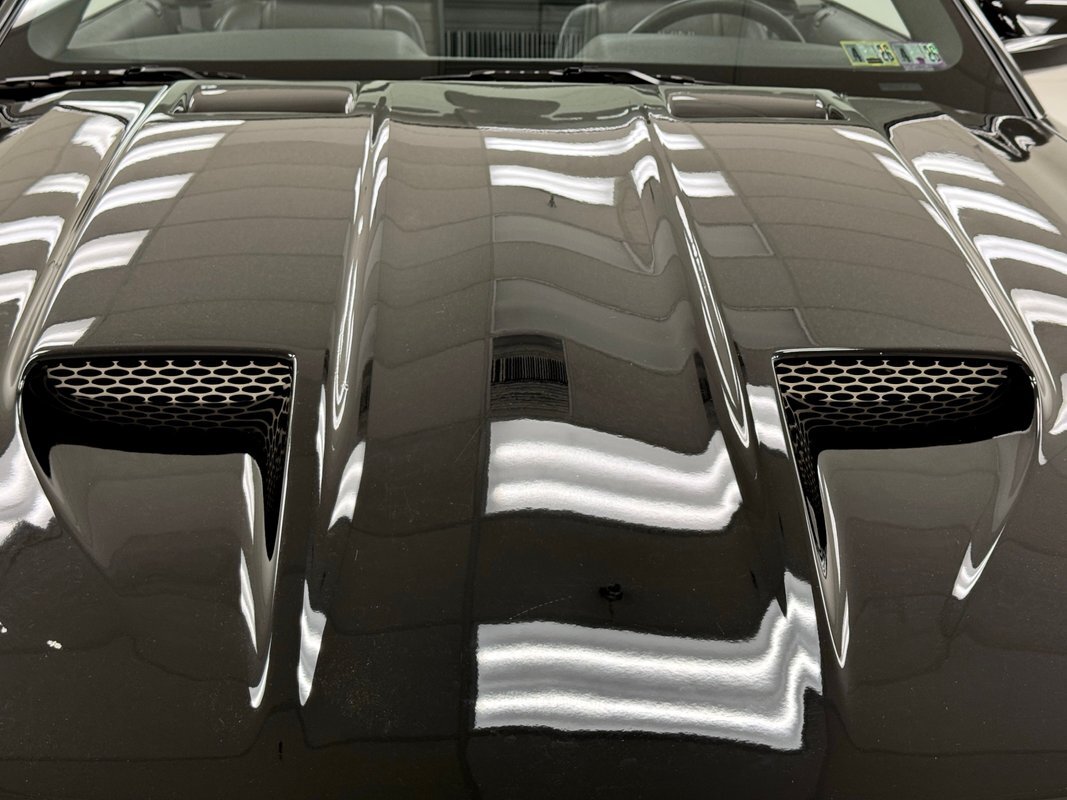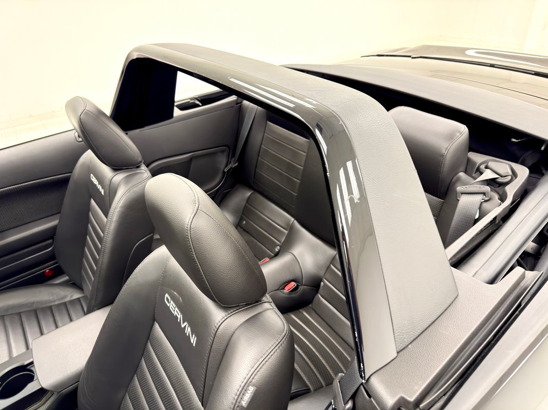 Cervini's C-series body kit was installed early on changing the bumper, grille, spoiler, side scoops and adding side exhaust, side skirts, and the infamous Stalker hood. It was then that the 20-inch American Racing wheels were added carrying 35 series ZR rated tires. Cervini's "Shelby style" tail light configuration wasn't added until 2013, the same time the Raxiom smoked projector headlights were mounted. A painted styling bar arches over the car behind the front seats while a dramatically raked windshield really becomes evident when the black canvas top is down.