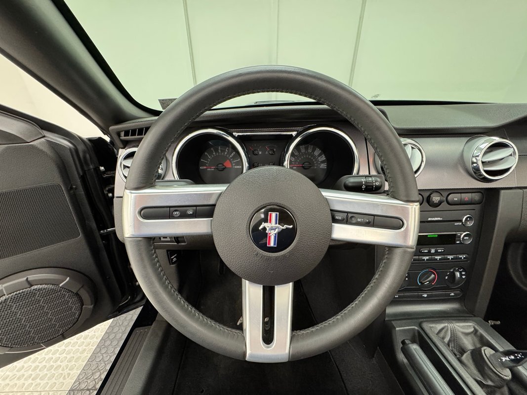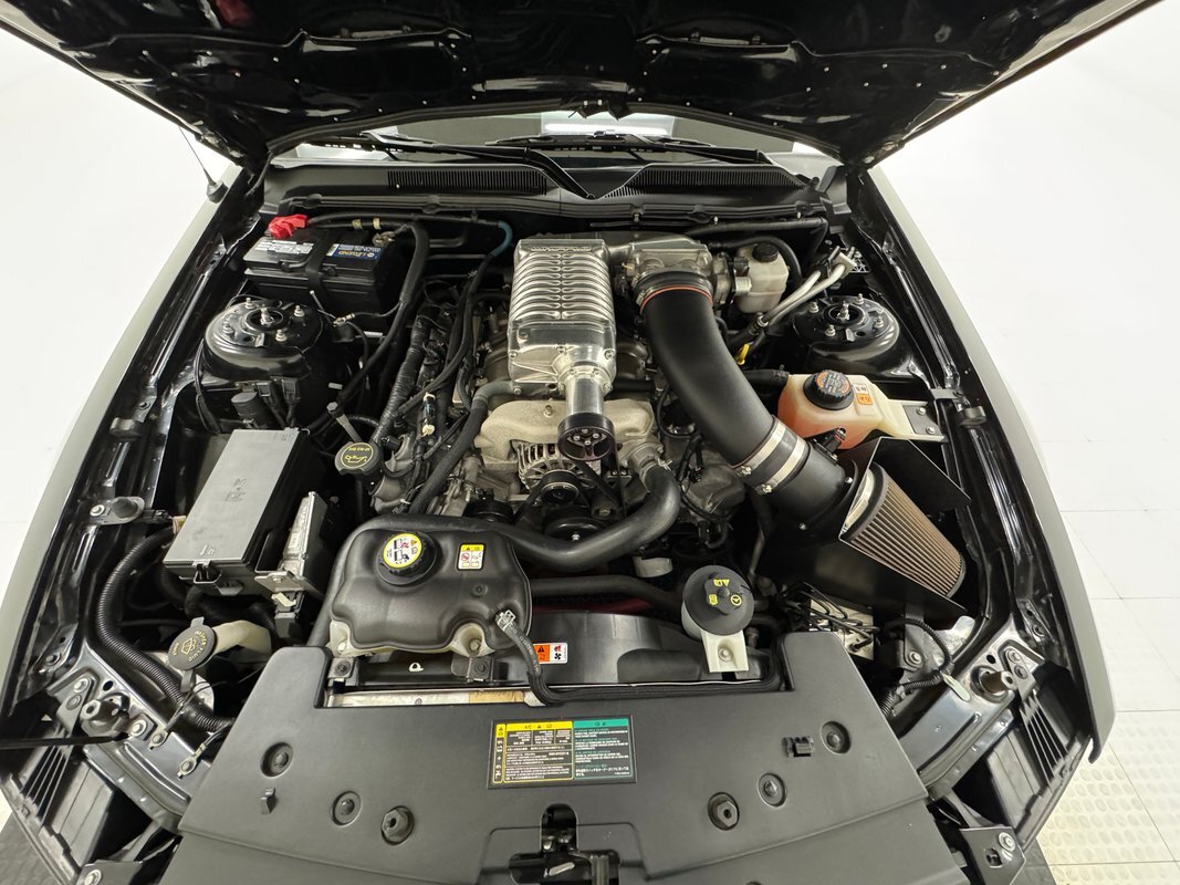 Speaking of star of the show, changes to the 4.6 liter 3 valve V8 began in 2009 and includes a Ford Racing HO Whipple supercharger, an SCT Xcal2 tune, a cold air intake, and a Bosch water pump. This results in the expected and consignor stated 475 horsepower helped by an upgraded fuel pump and 39 pound injectors. All that power is routed through the TR3650 5-speed manual transmission to the Ford 9 inch in back with 3.55 gearing and TracLoc. Wilwood brakes are called into action, equipping the power disc brakes with high performance stopping power. The polished supercharger sits atop a clean engine and environs.