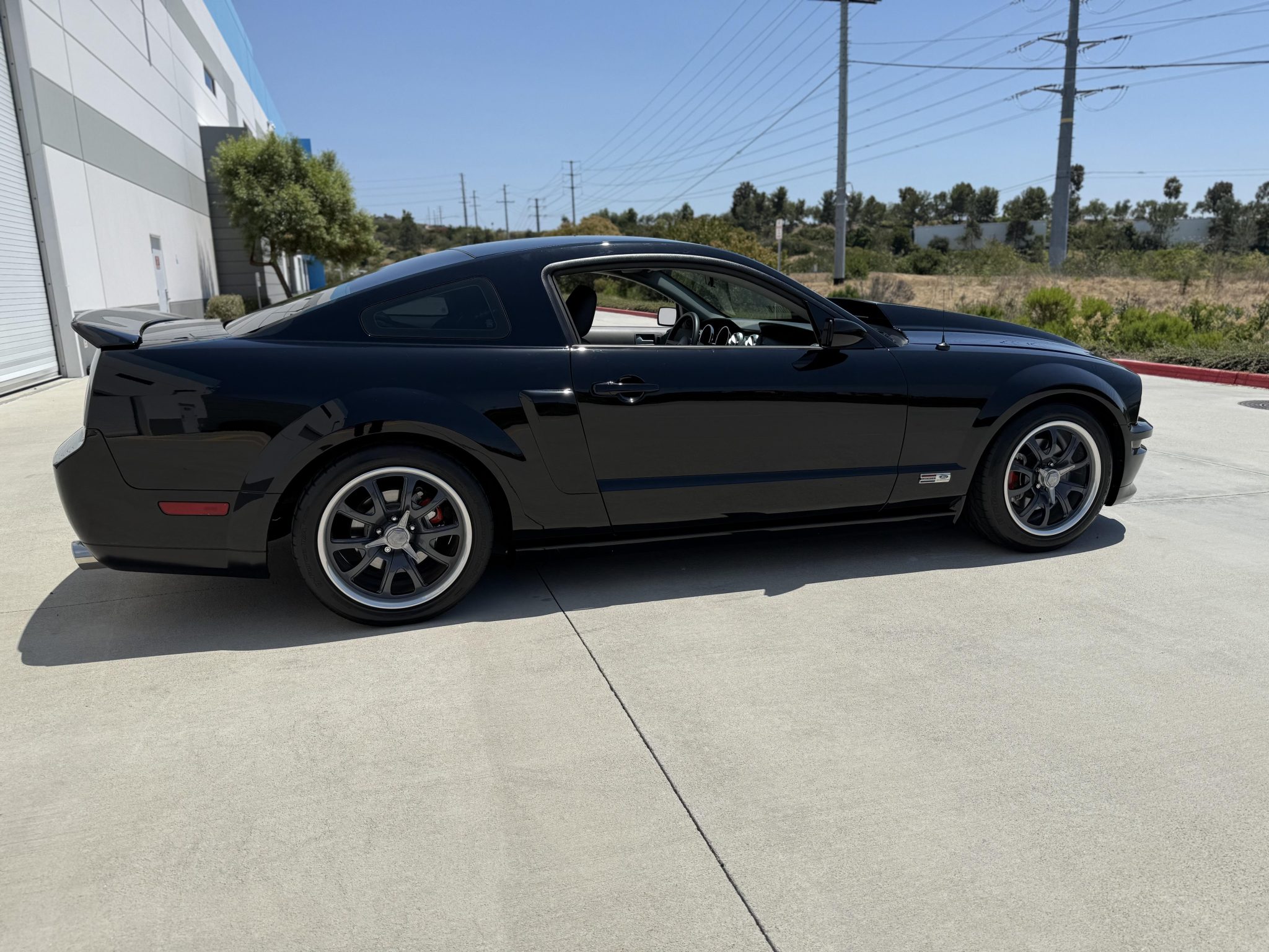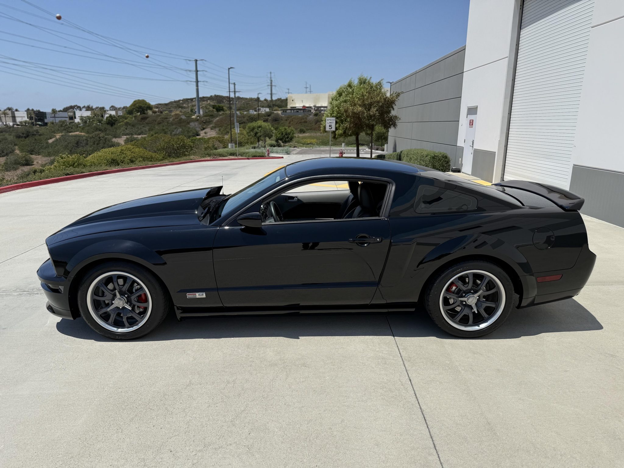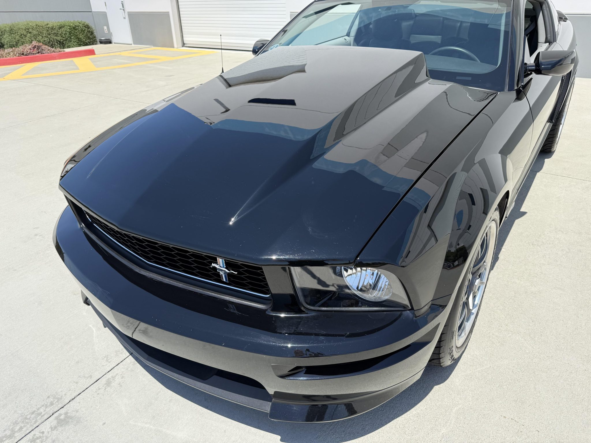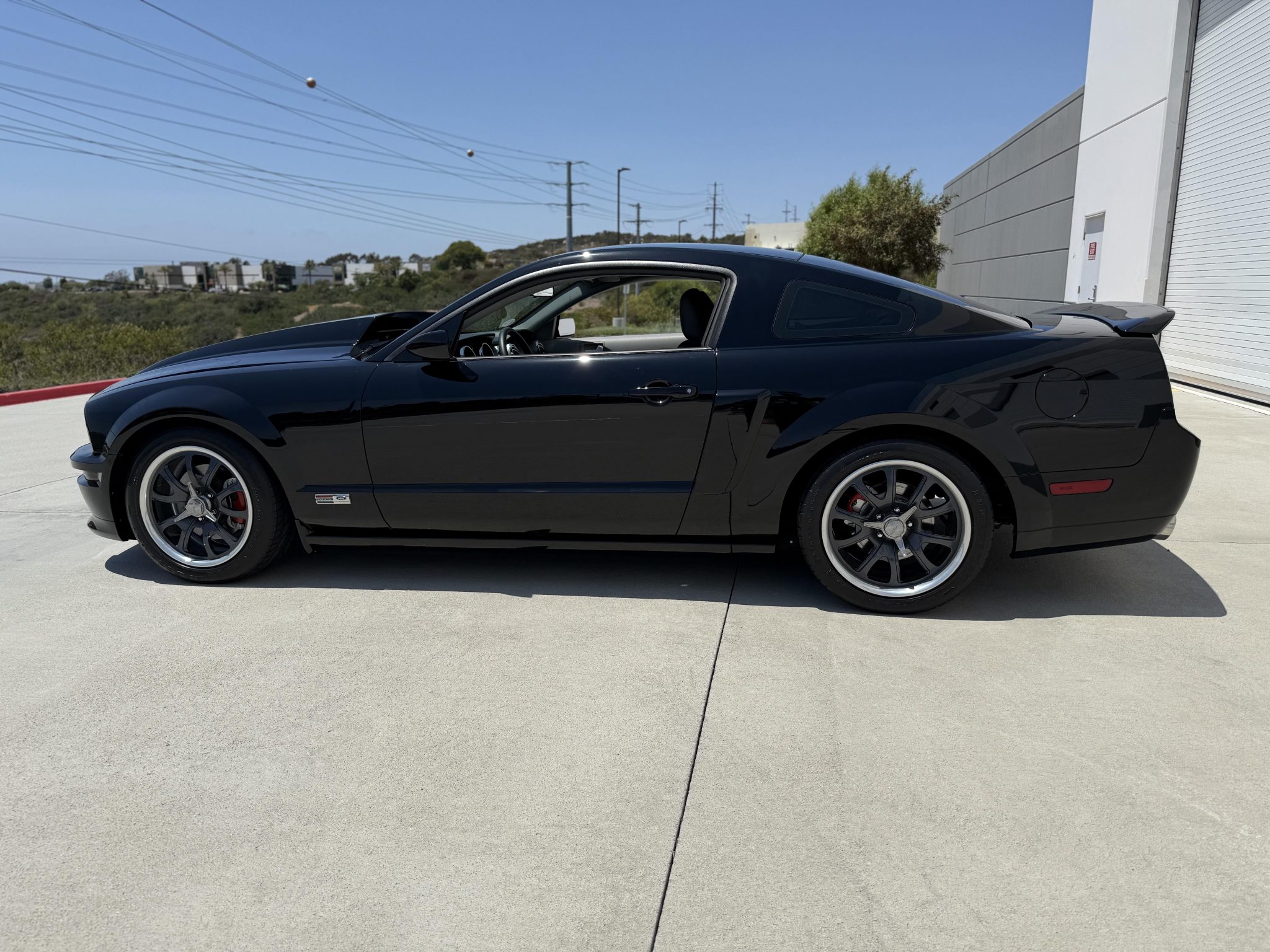 This 2008 Ford Mustang GT is a black California Special coupe now indicates 18k miles. Powered by a 4.6-liter 24-valve V8 linked with a five-speed manual transmission and a limited-slip differential, the car has been modified with a cowl induction hood, a GT500-style rear spoiler, Shelby auxiliary light and brake duct bezels, Eibach Pro-Kit lowering springs, GT500-specification dampers, Raceline 18″ wheels, aftermarket engine management software, a Bassani off-road X-pipe, a Flowmaster exhaust system, and a BBK air intake, throttle body, and pulley kit as well as a Ford Racing upper intake plenum, “Hot Rod” camshafts, and short-tube exhaust headers without integrated catalysts. The seats wear Dark Charcoal leather upholstery with Dove inserts, and the cabin is appointed with air conditioning, a power-adjustable driver’s seat, a cueball-style shift knob, a Shaker 500 audio system with an in-dash CD changer.