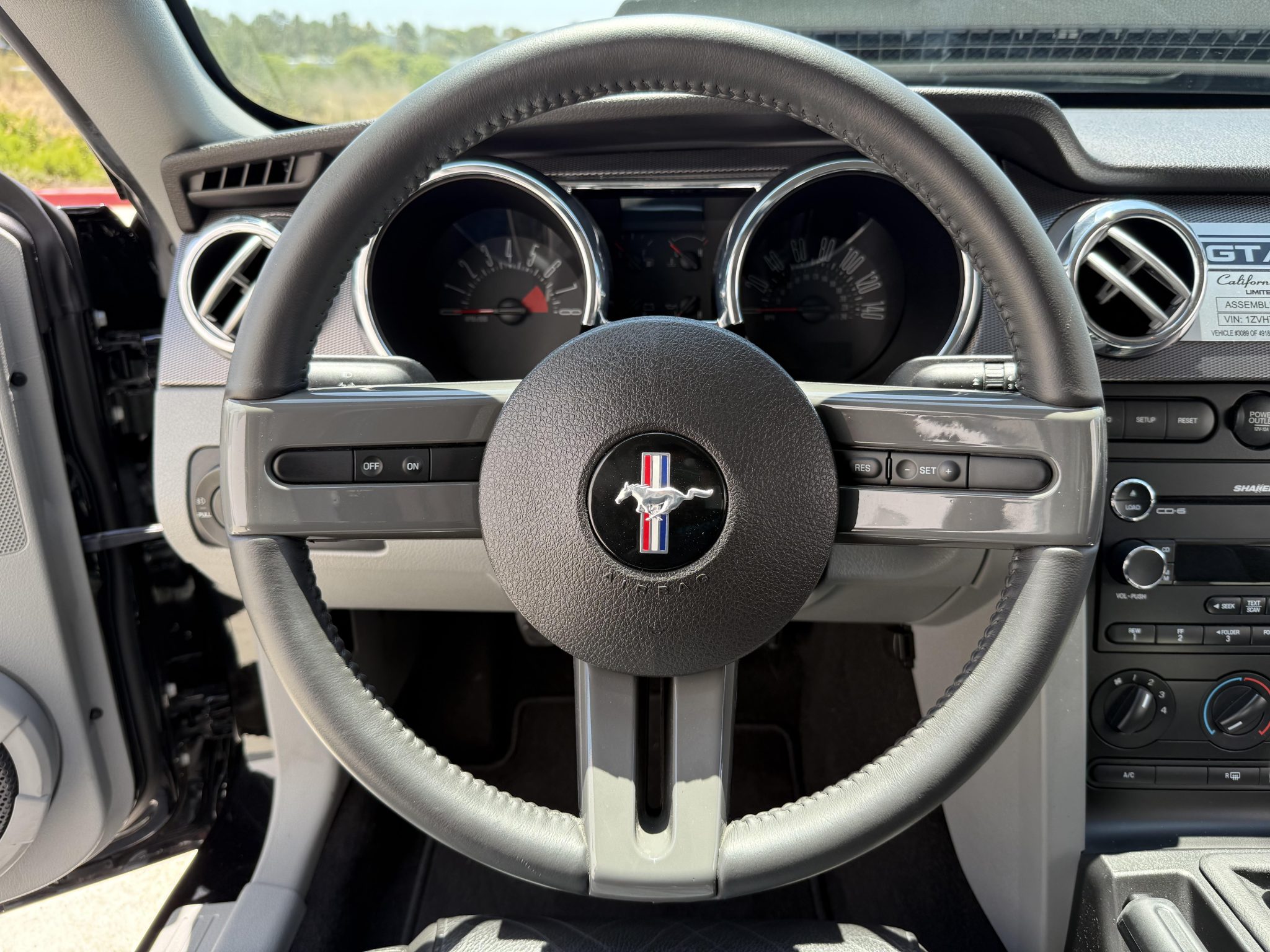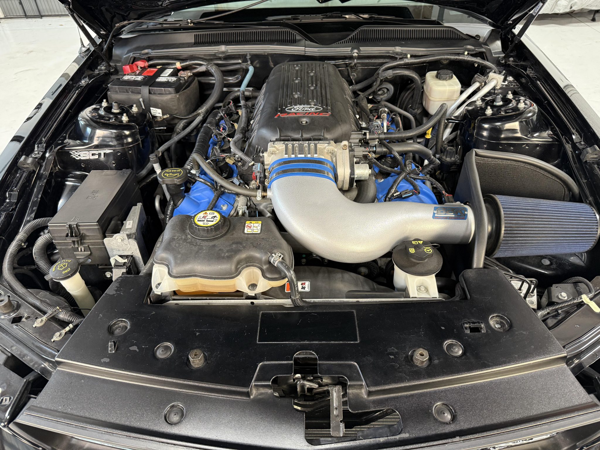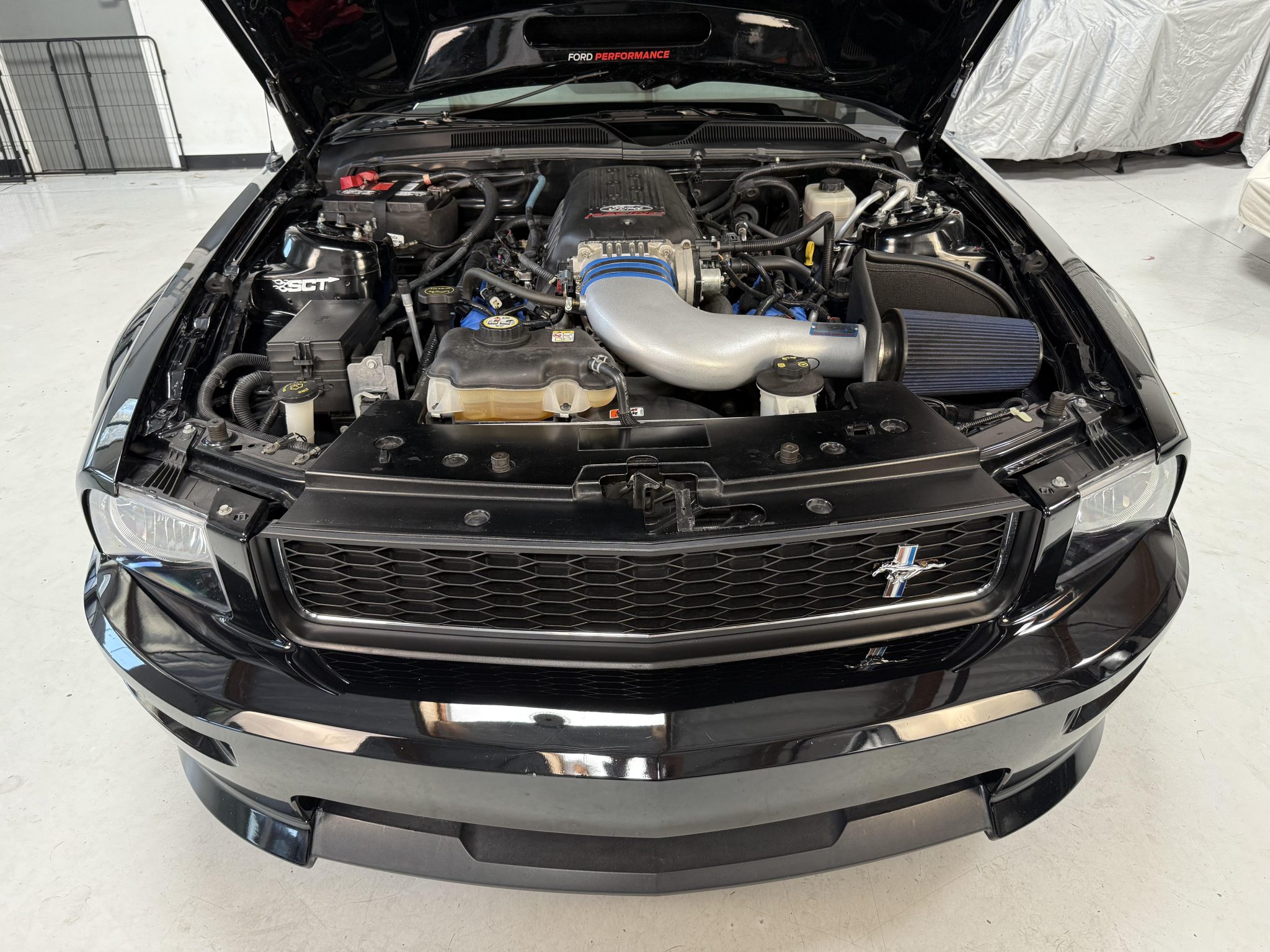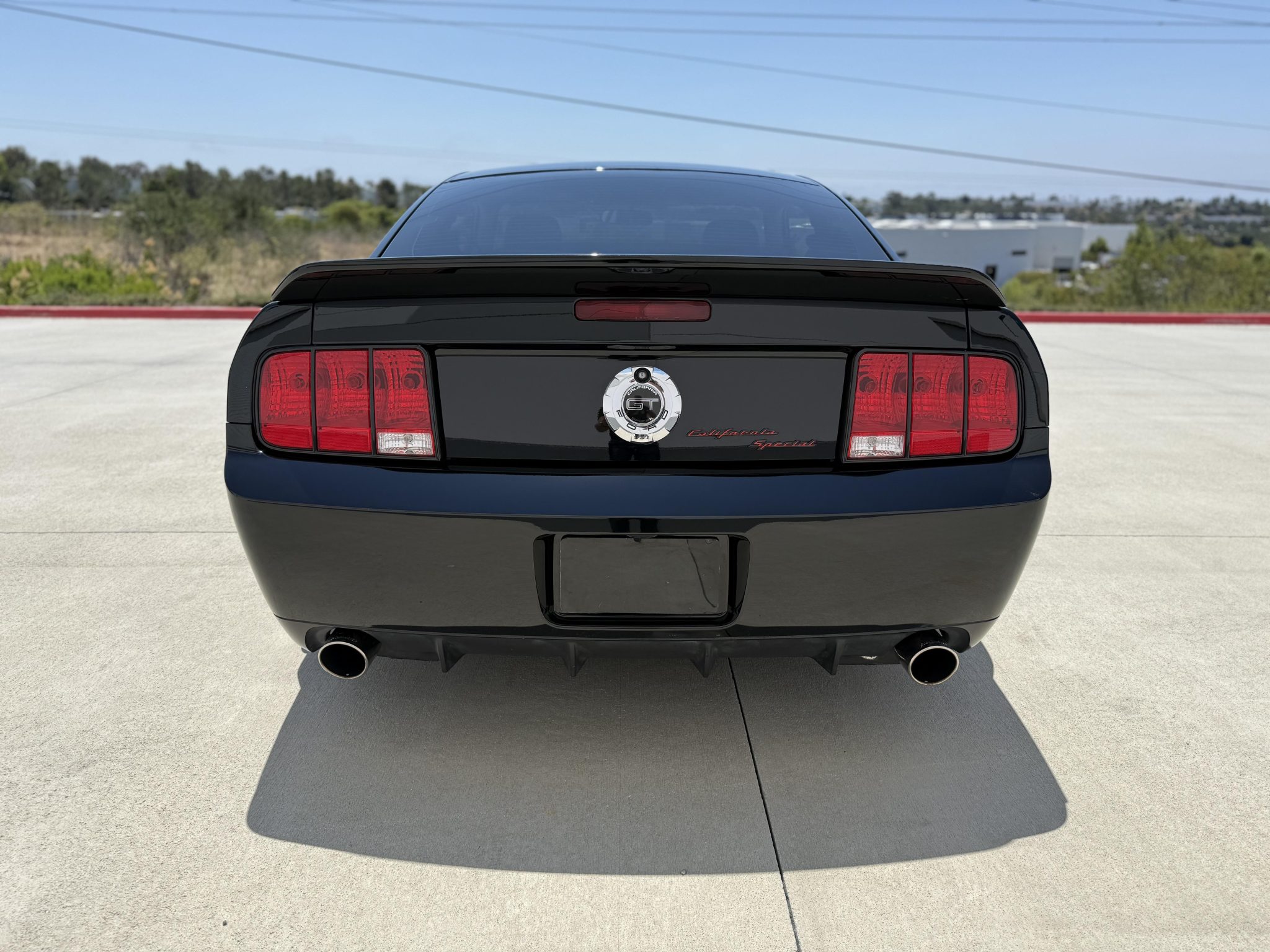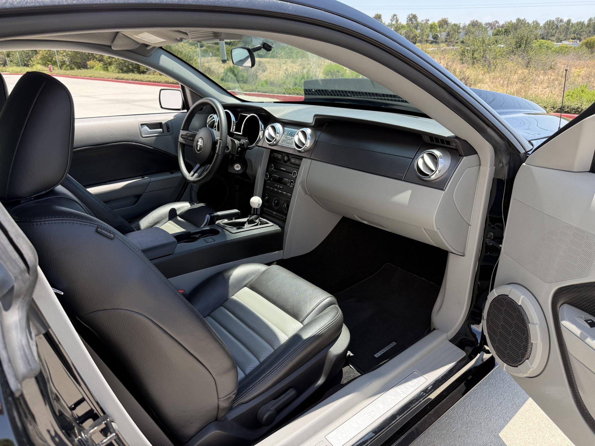 This 2008 Ford Mustang GT is a black California Special coupe now indicates 18k miles. Powered by a 4.6-liter 24-valve V8 linked with a five-speed manual transmission and a limited-slip differential, the car has been modified with a cowl induction hood, a GT500-style rear spoiler, Shelby auxiliary light and brake duct bezels, Eibach Pro-Kit lowering springs, GT500-specification dampers, Raceline 18″ wheels, aftermarket engine management software, a Bassani off-road X-pipe, a Flowmaster exhaust system, and a BBK air intake, throttle body, and pulley kit as well as a Ford Racing upper intake plenum, “Hot Rod” camshafts, and short-tube exhaust headers without integrated catalysts. The seats wear Dark Charcoal leather upholstery with Dove inserts, and the cabin is appointed with air conditioning, a power-adjustable driver’s seat, a cueball-style shift knob, a Shaker 500 audio system with an in-dash CD changer.