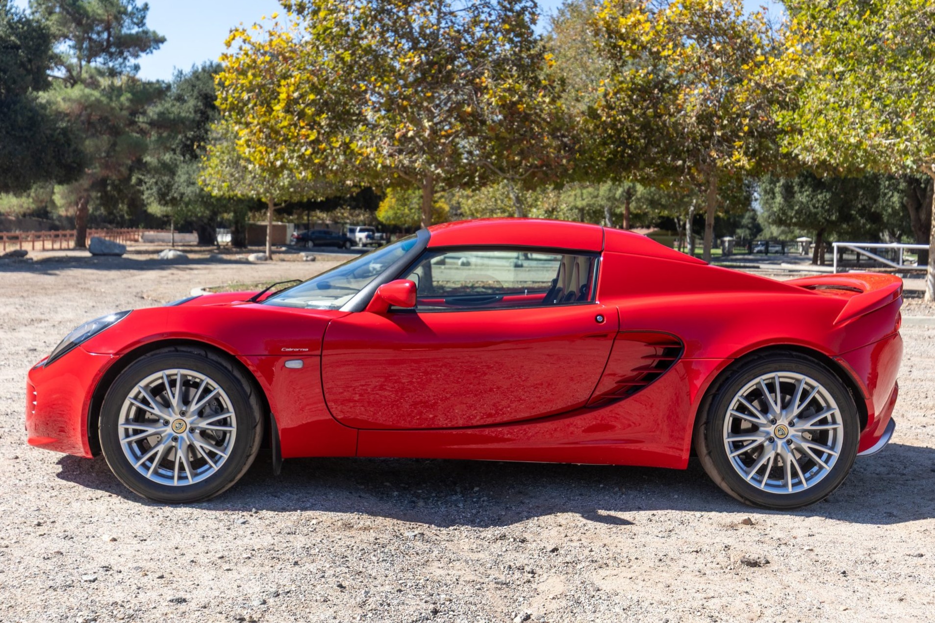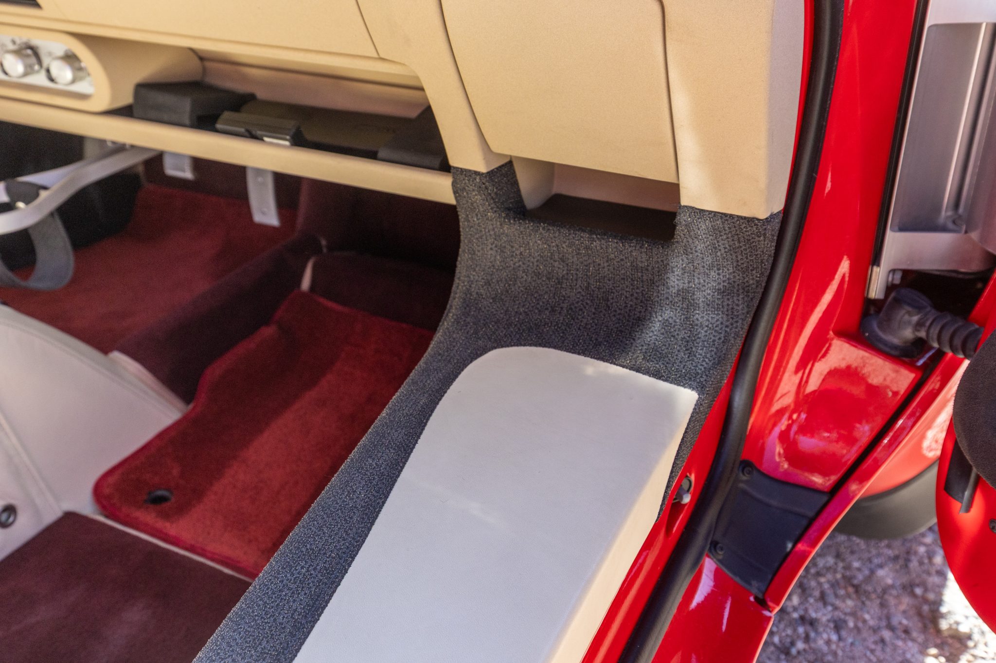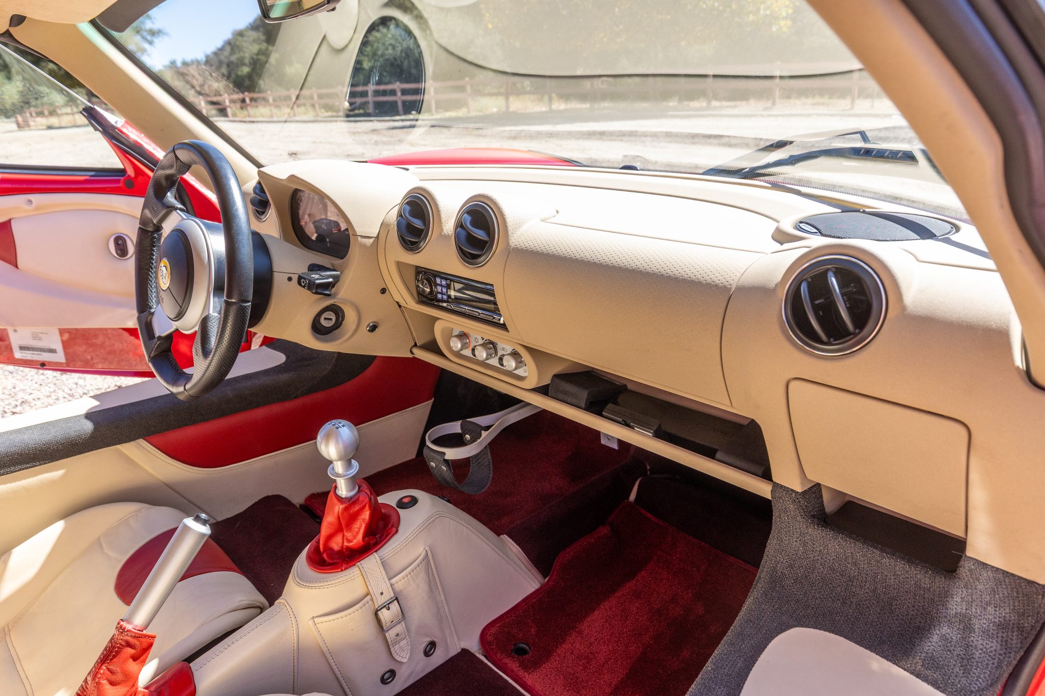 Finished in Ardent Red over Magnolia and red leather, the car is powered by a 1.8-liter inline-four paired with a six-speed manual transaxle. Equipment includes 16″ and 17″ Y-spoke alloy wheels, a removable soft top, a color-matching roof panel, a Alpine CD stereo, power windows, and air conditioning.