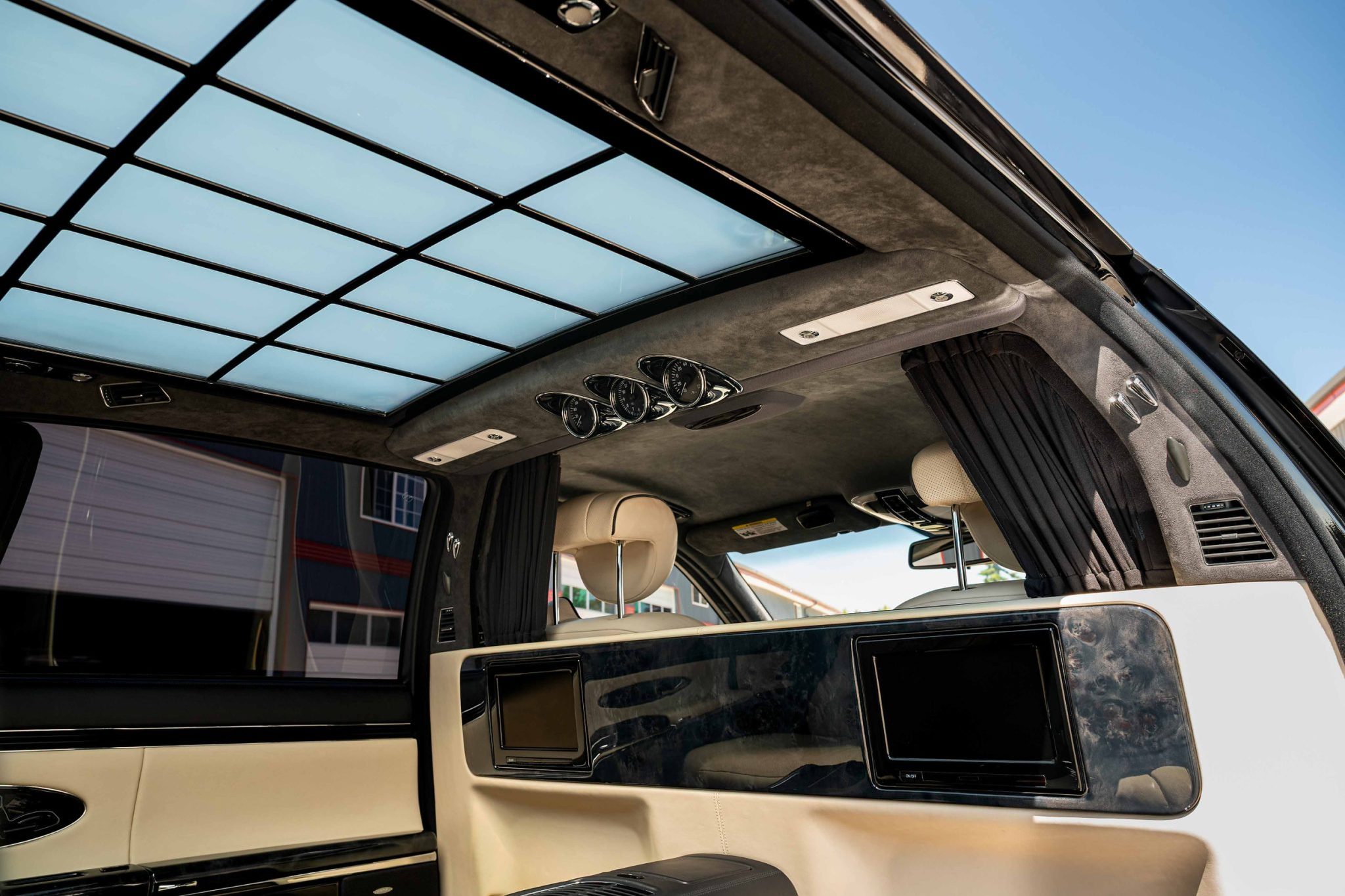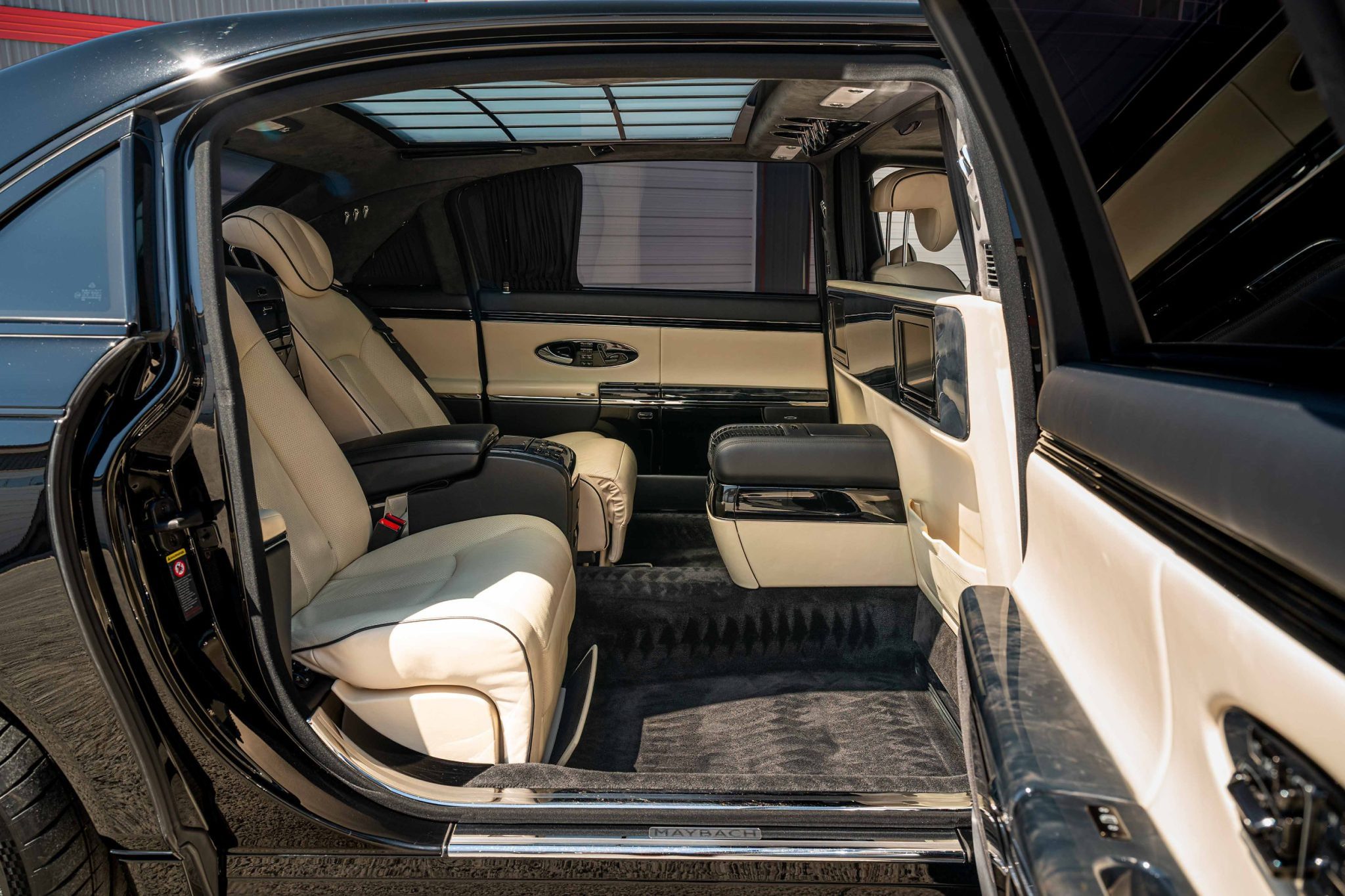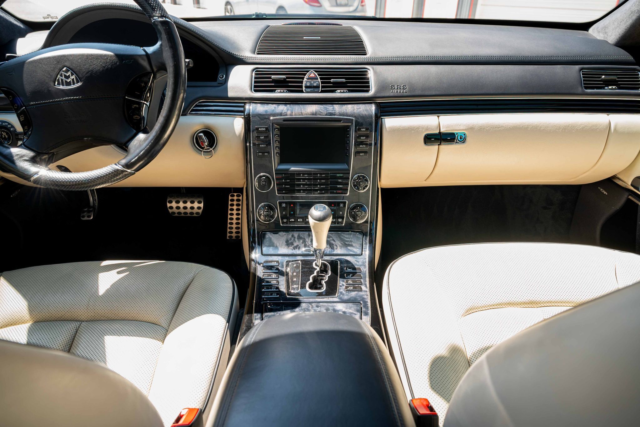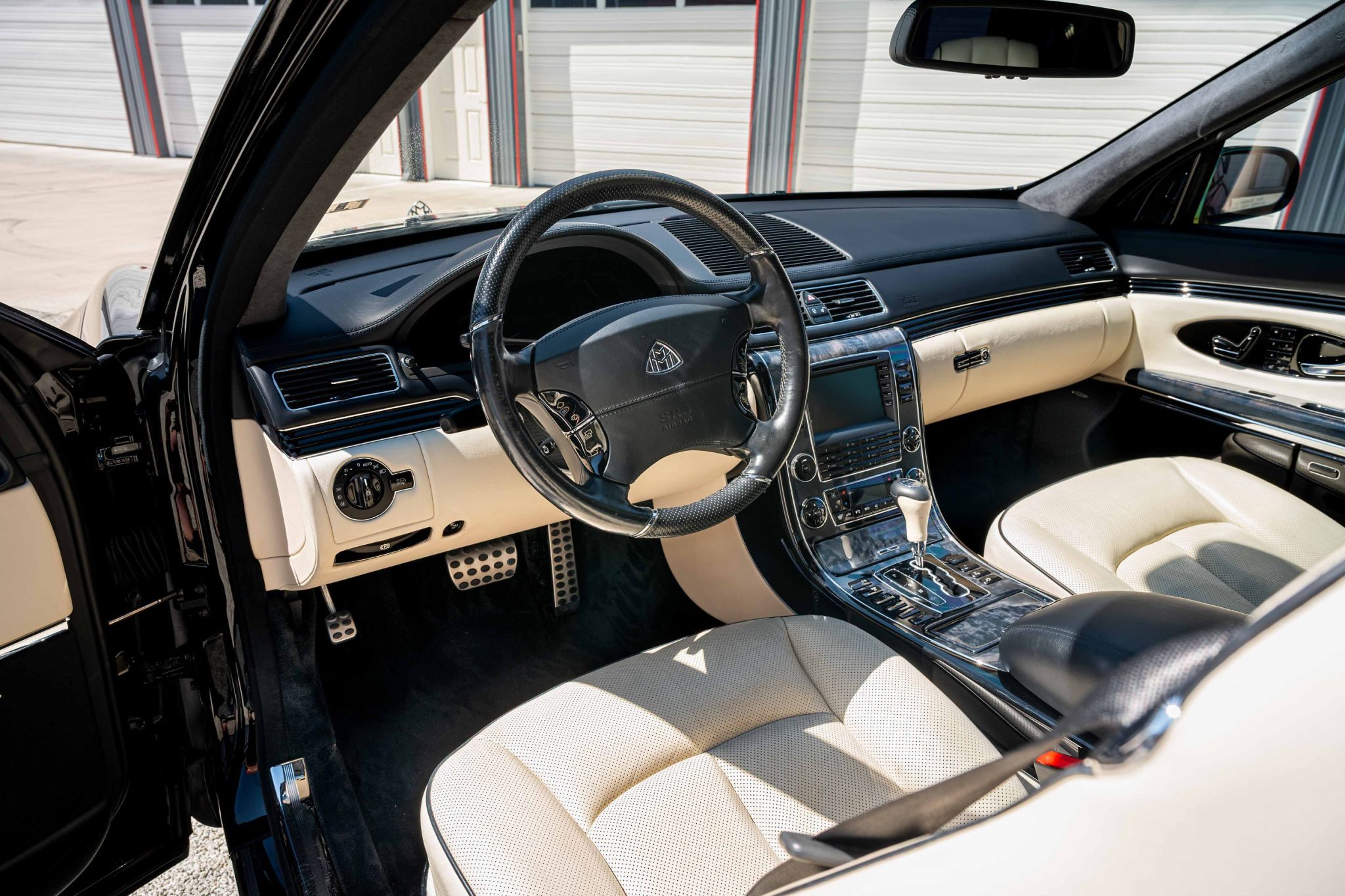 This 2008 Maybach 62S was factory-equipped with a $24k central partition with entertainment screens and a retractable electrochromic glass panel The Baltic Black car’s interior is outfitted with Beige Exclusive leather upholstery, piano lacquer wood interior trim, and front and rear heated, ventilated, and massaging bucket seats along with Distronic adaptive cruise control, COMAND infotainment with navigation, a 21-speaker Bose sound system, a beverage chiller compartment, power-operated window curtains, and four-zone automatic climate control. A panoramic sunroof is fitted along with bi-xenon headlights and 22″ Mandrus Otto wheels, and the twin-turbocharged 6.0-liter V12 is paired with a five-speed automatic transmission.