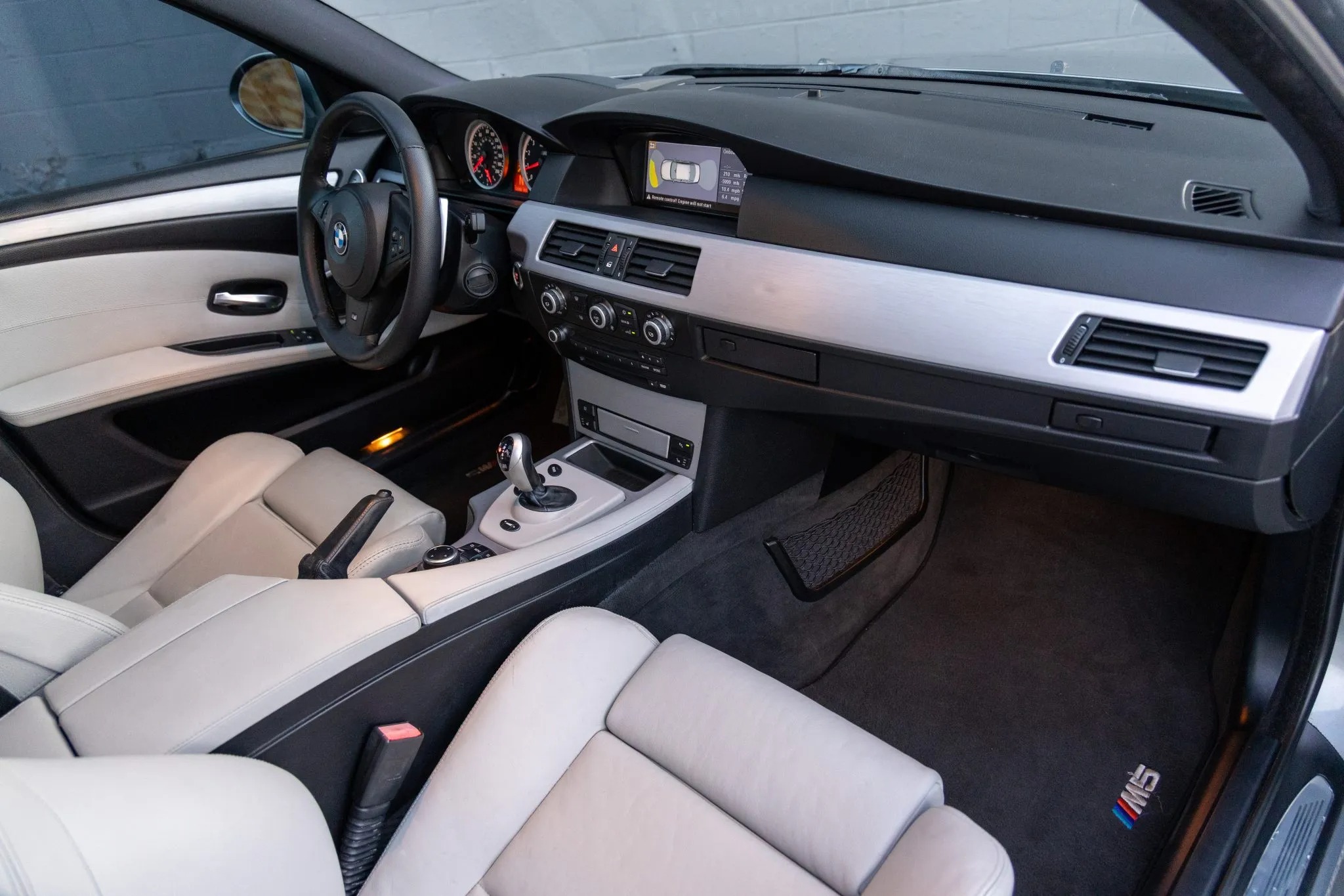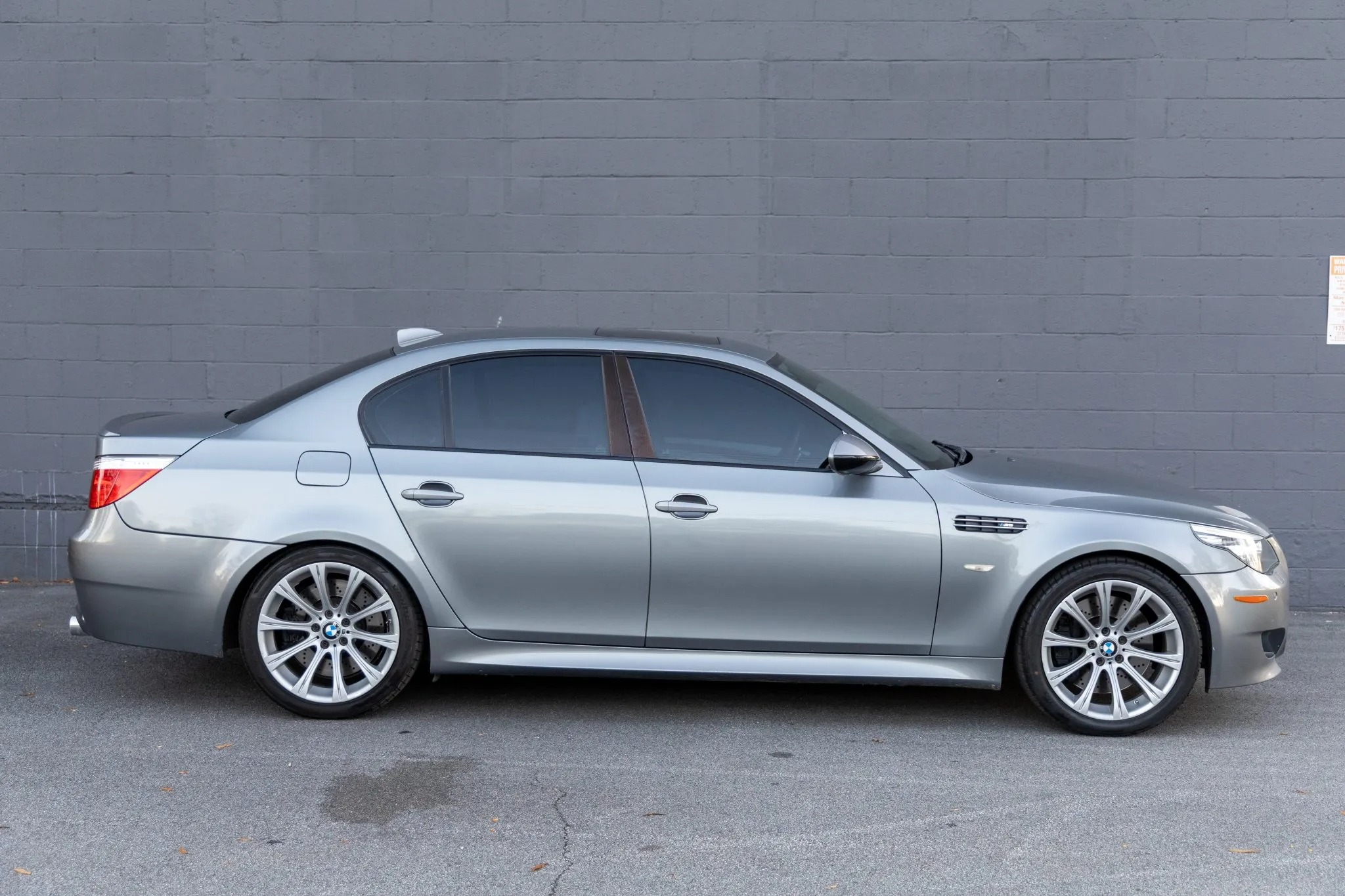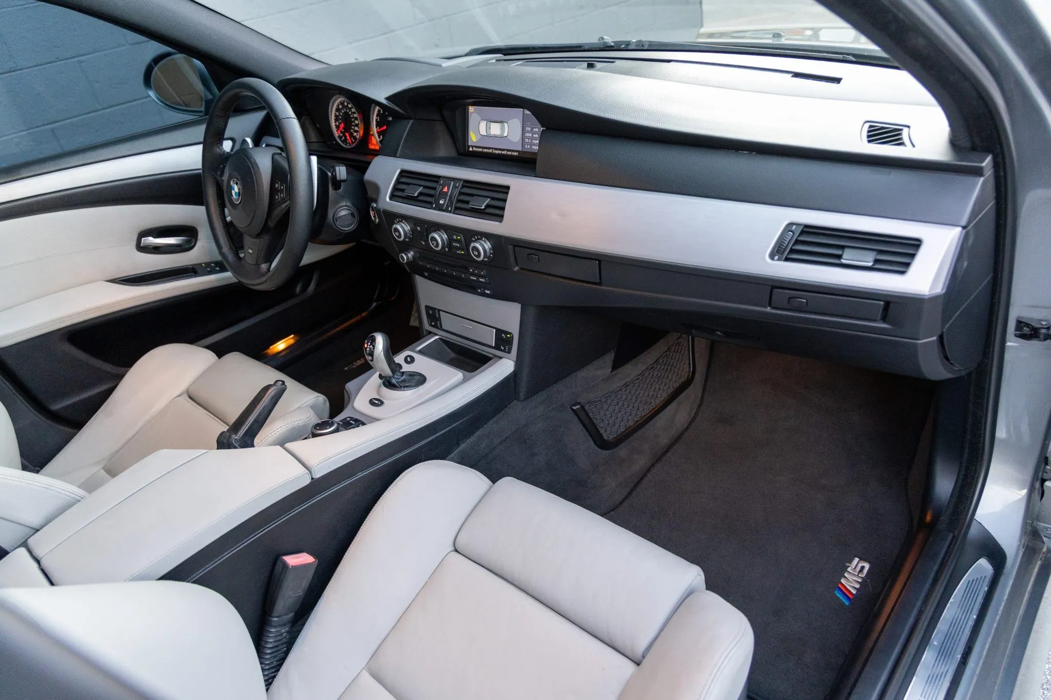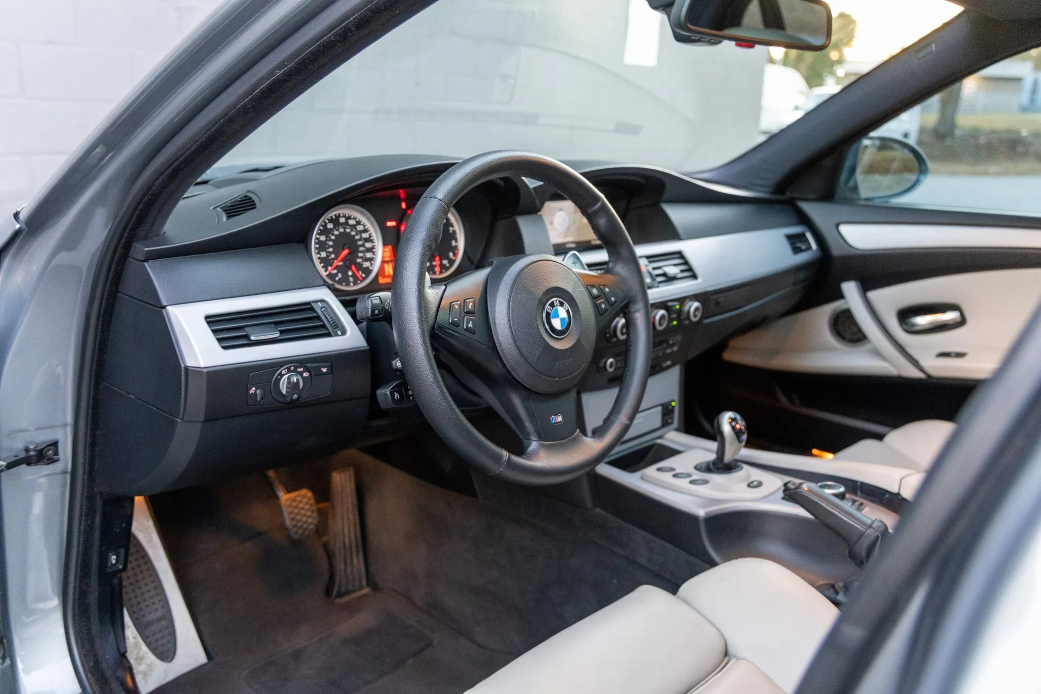 This 2009 BMW M5 is finished in Space Gray Metallic over Silverstone Merino leather and is powered by a 5.0-liter V10 paired with a seven-speed SMG sequential transmission. Equipment includes an M Variable differential, adaptive xenon headlights, a glass sunroof, Park Distance Control parking sensors, 19″ Style 166 wheels, iDrive with navigation, a head-up display, heated power-adjustable front seats, Comfort Access keyless entry, dual-zone automatic climate control, and cruise control.