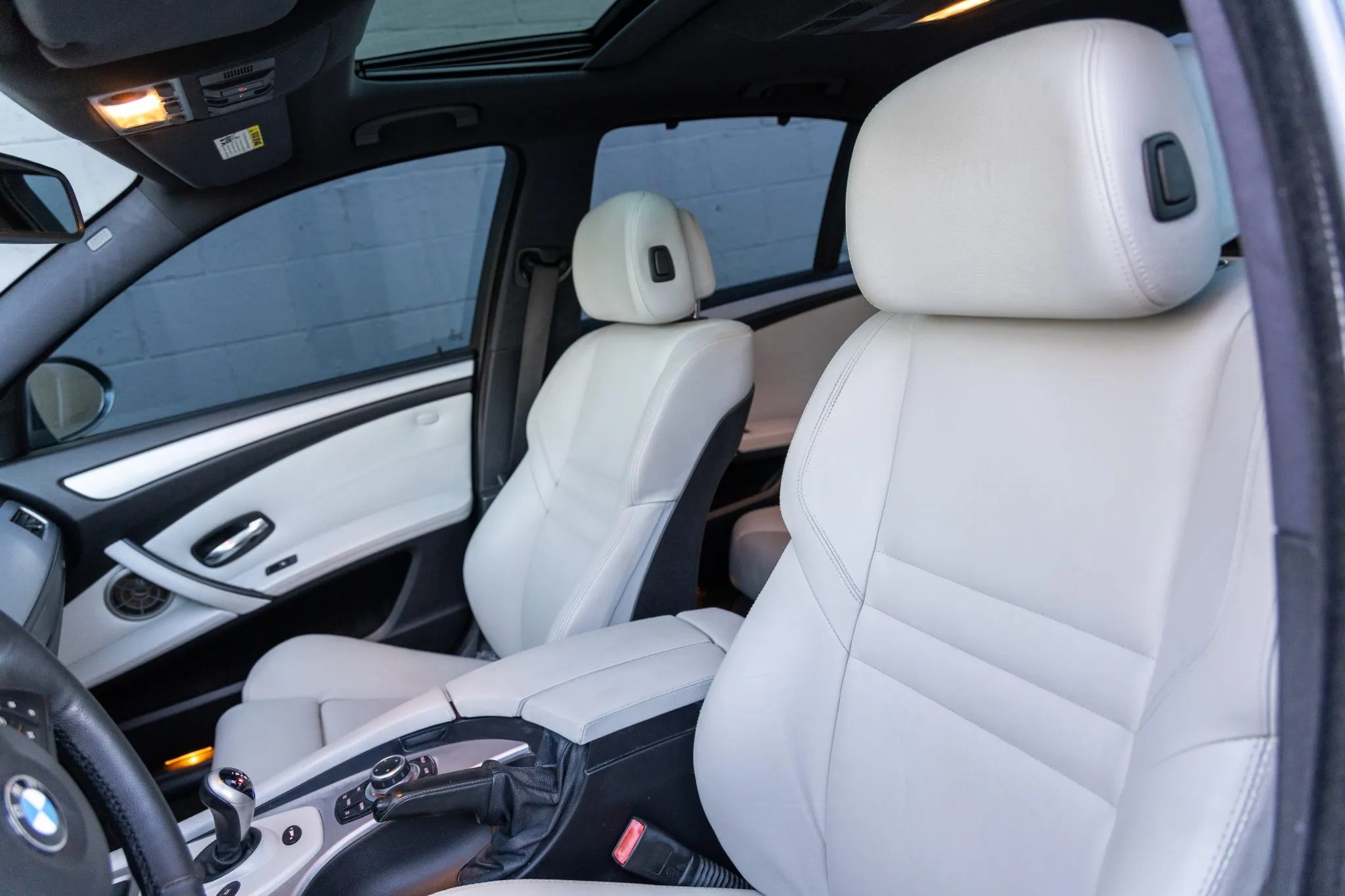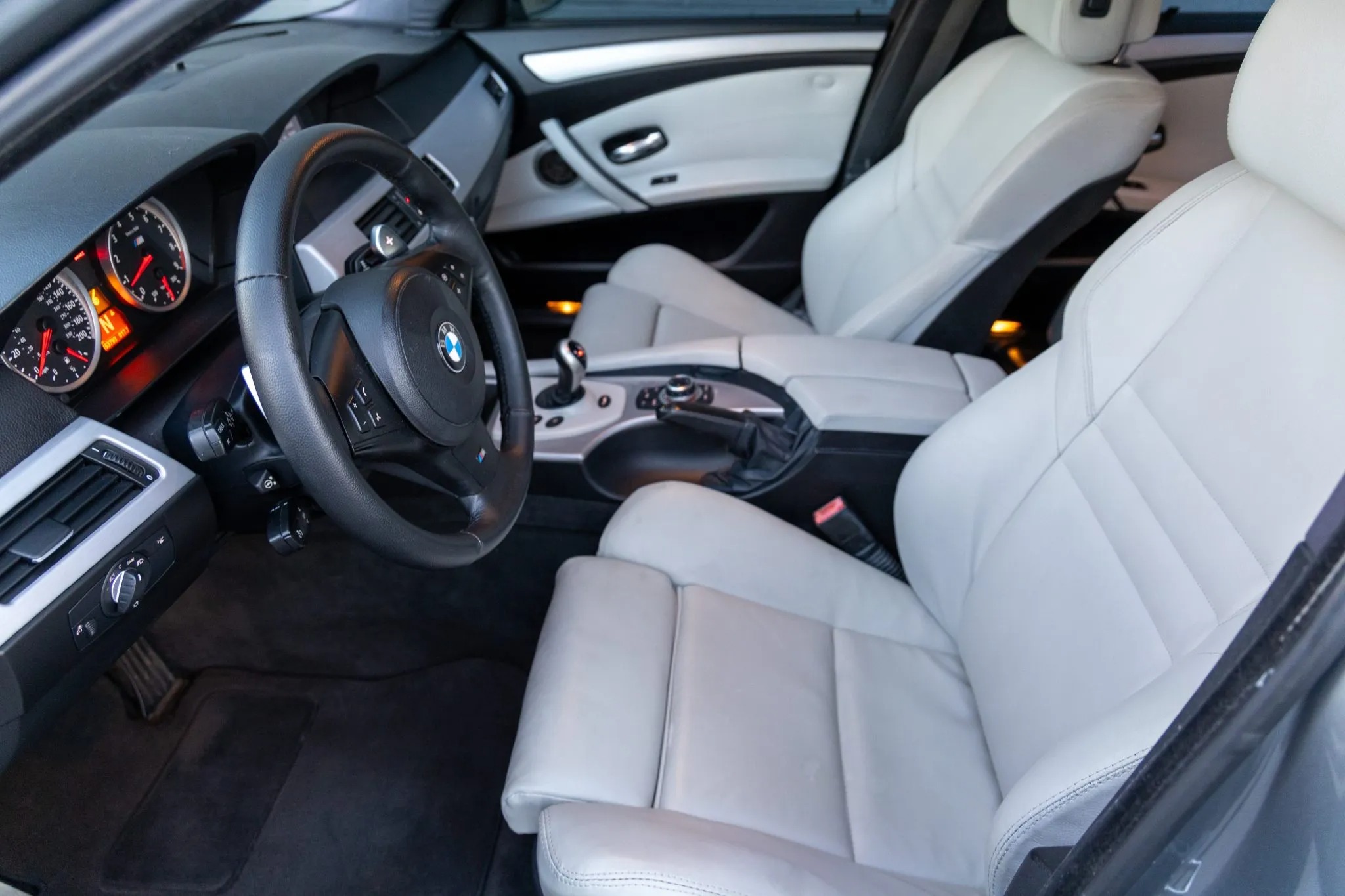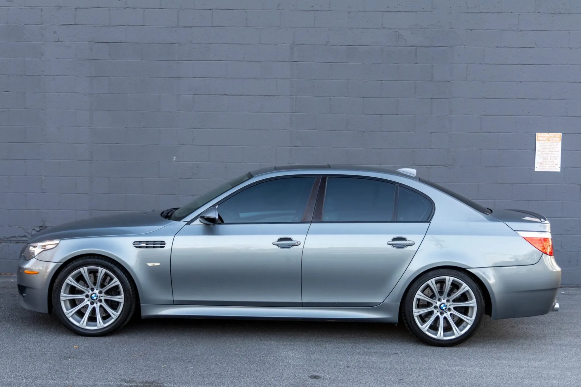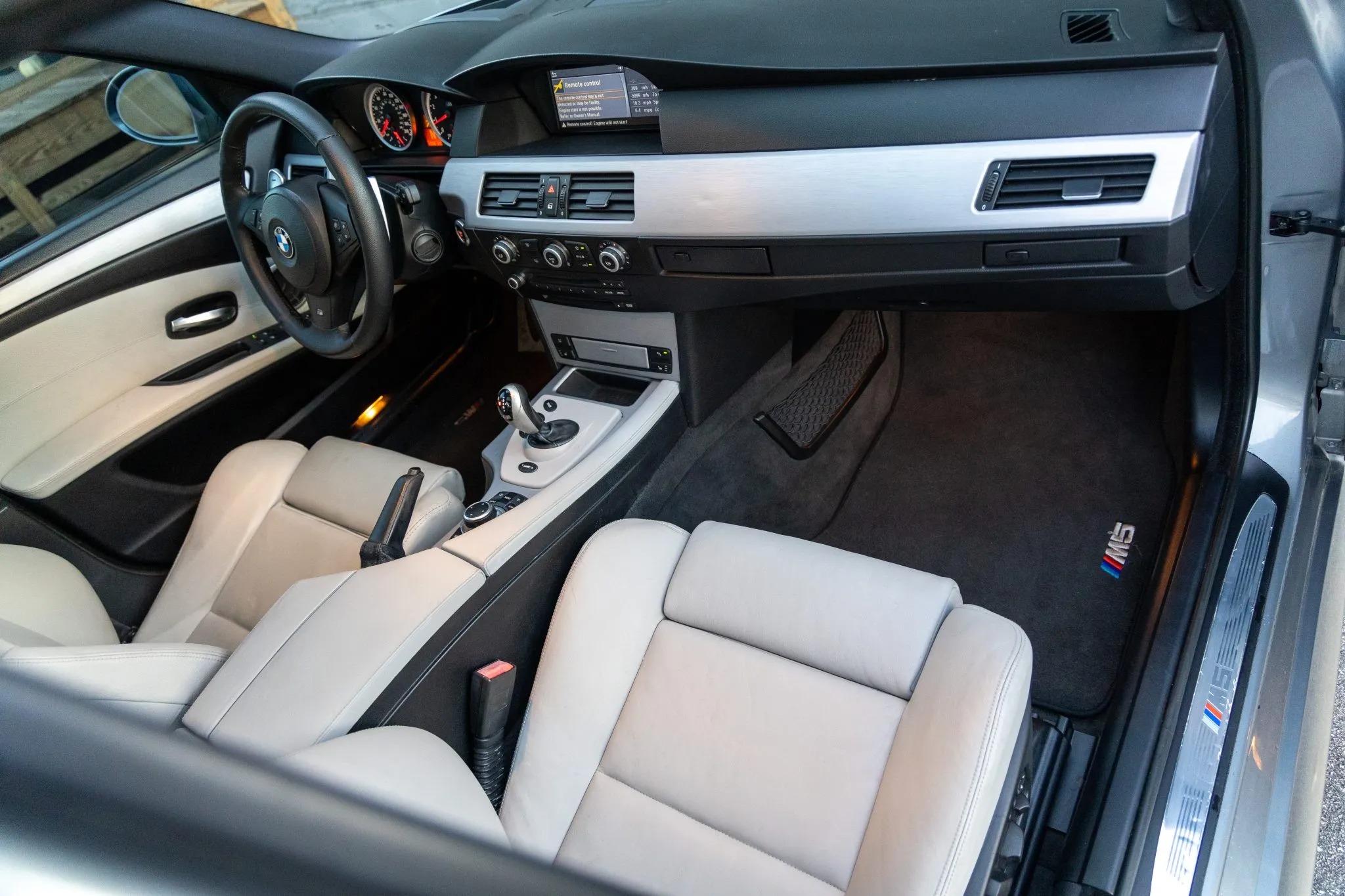 This 2009 BMW M5 is finished in Space Gray Metallic over Silverstone Merino leather and is powered by a 5.0-liter V10 paired with a seven-speed SMG sequential transmission. Equipment includes an M Variable differential, adaptive xenon headlights, a glass sunroof, Park Distance Control parking sensors, 19″ Style 166 wheels, iDrive with navigation, a head-up display, heated power-adjustable front seats, Comfort Access keyless entry, dual-zone automatic climate control, and cruise control.