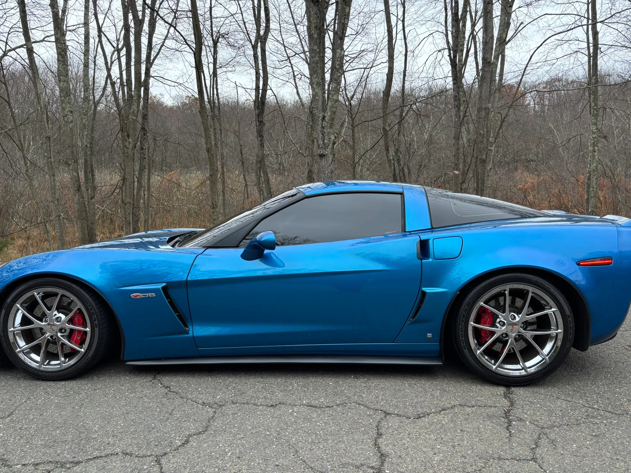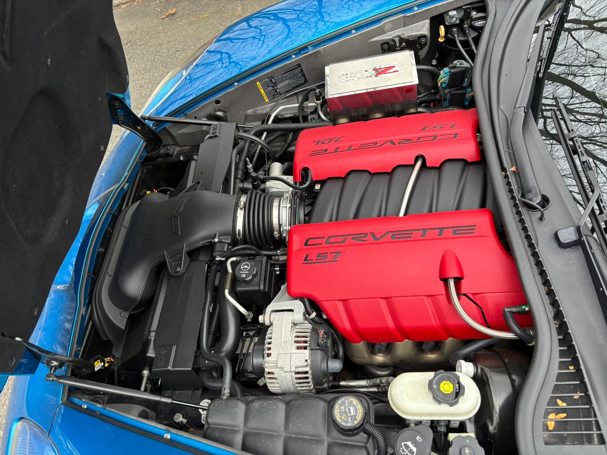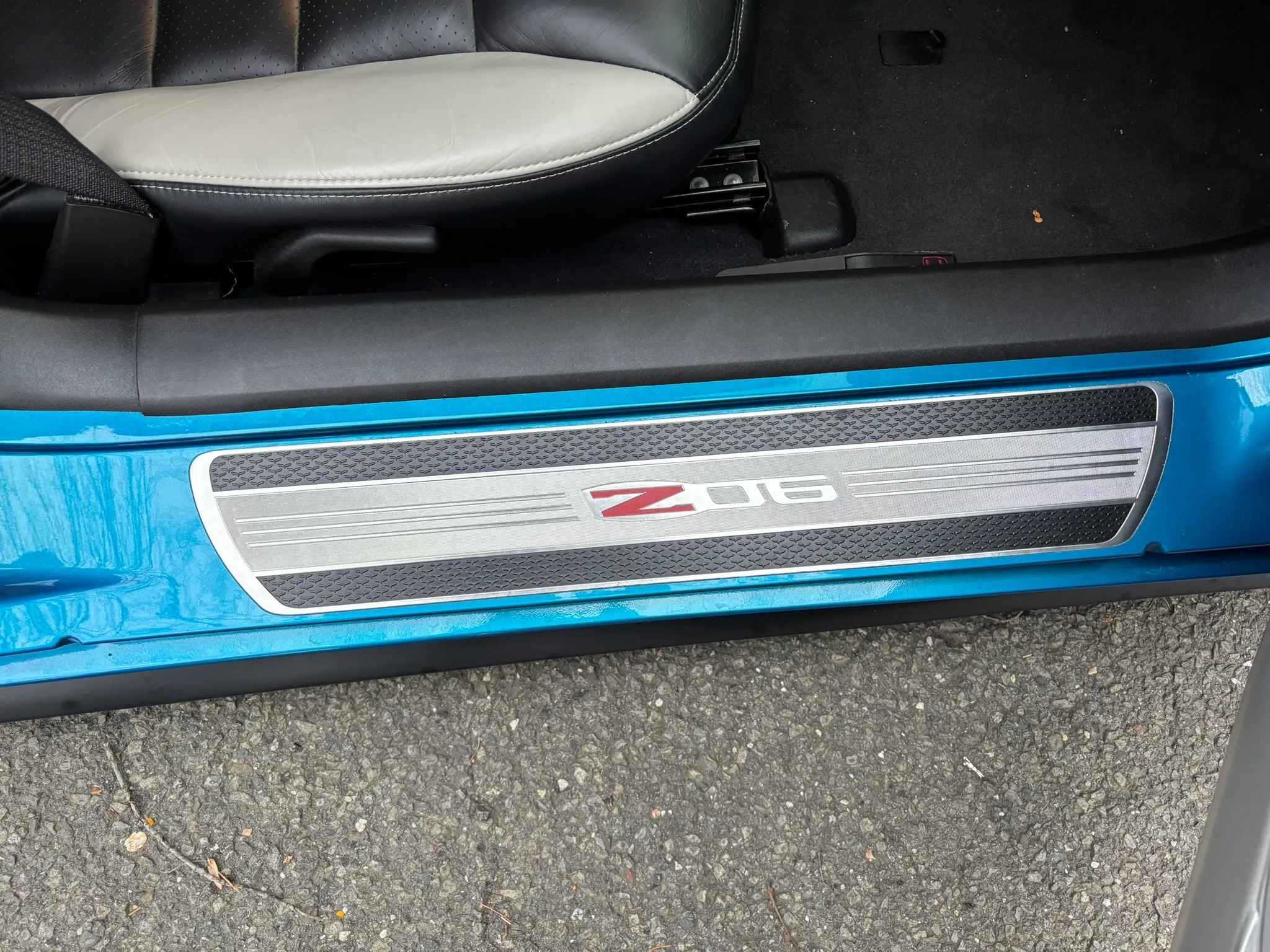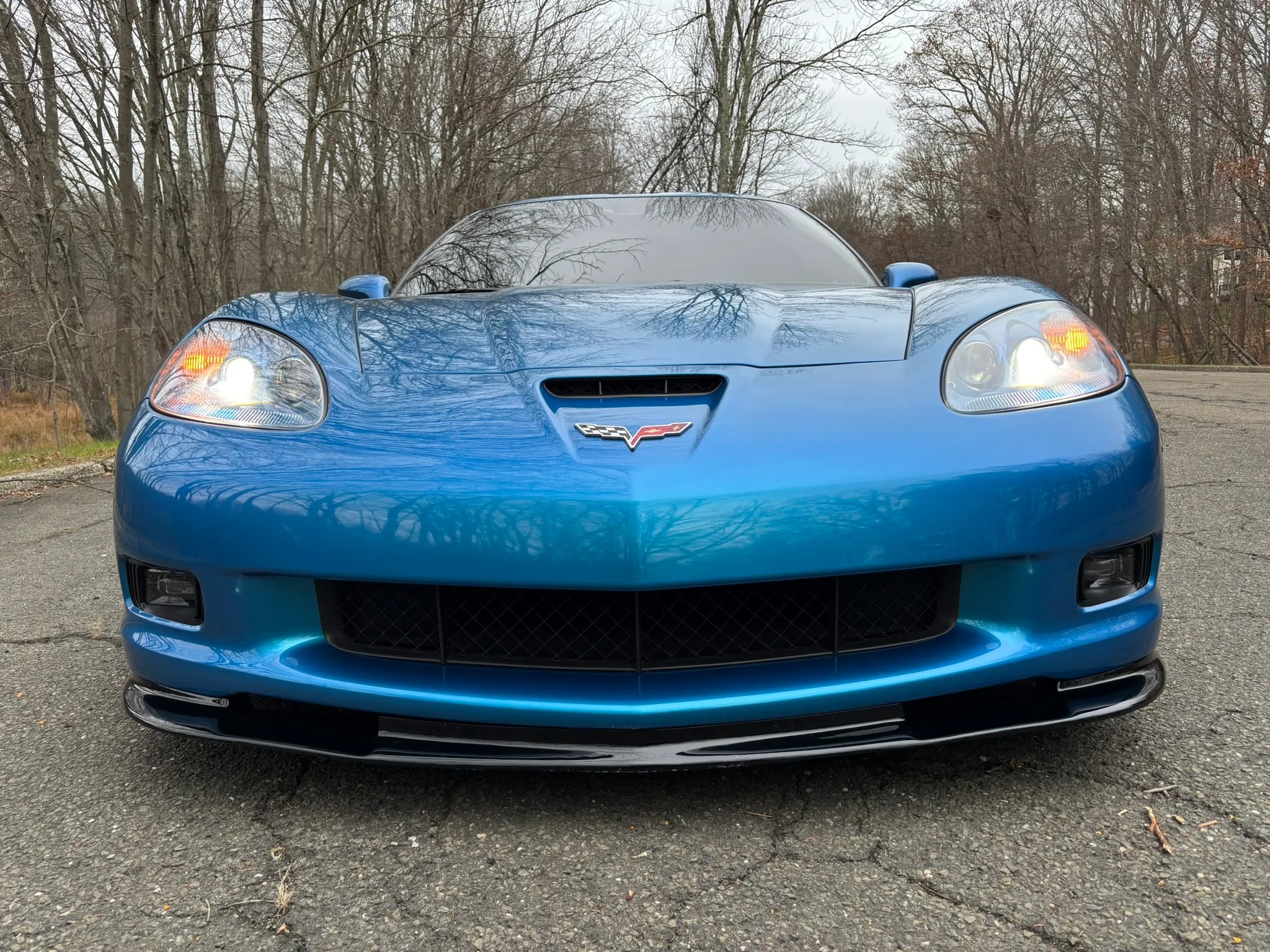2009 Chevrolet Corvette Z06 is finished in Jetstream Blue over Ebony and Titanium leather It is powered by a 7.0-liter LS7 V8 paired with a six-speed manual gearbox and is equipped with the 2LZ Preferred Equipment Group, chrome 18″ and 19″ wheels, a head-up display, heated power-adjustable seats, a Kenwood touchscreen infotainment system, and aftermarket taillights and side markers.