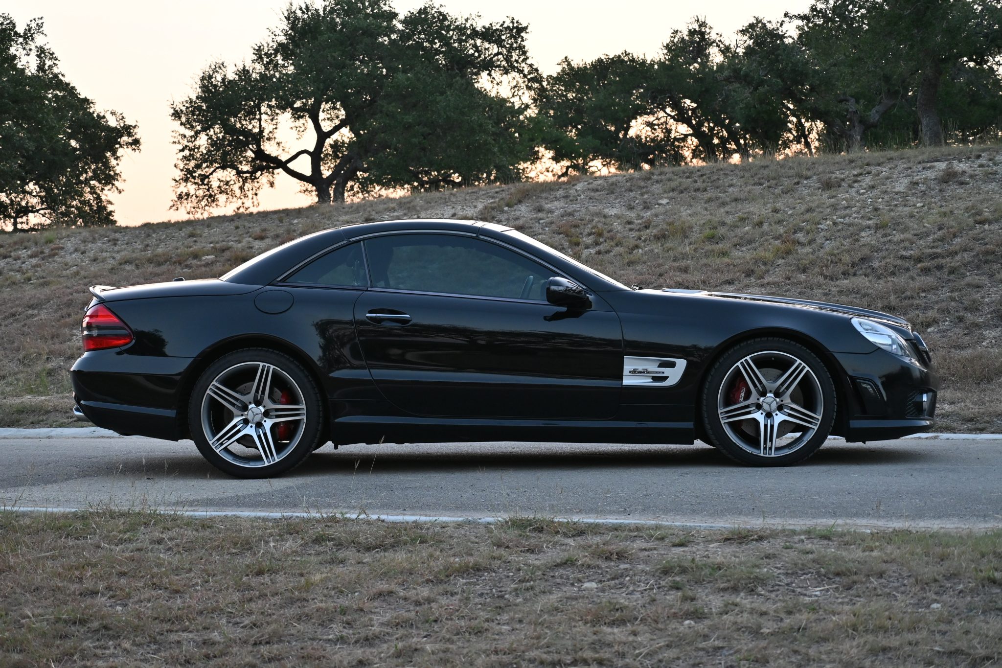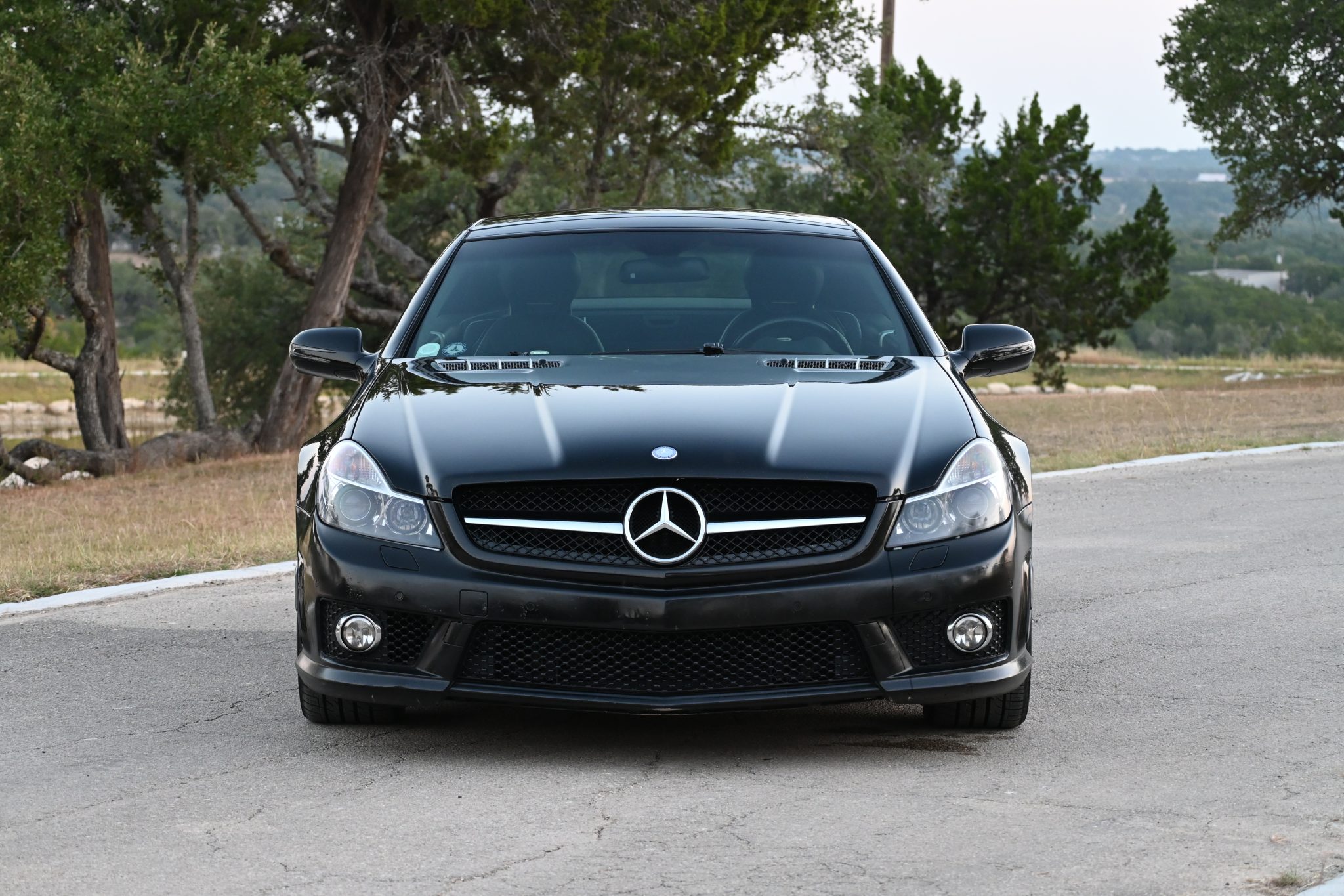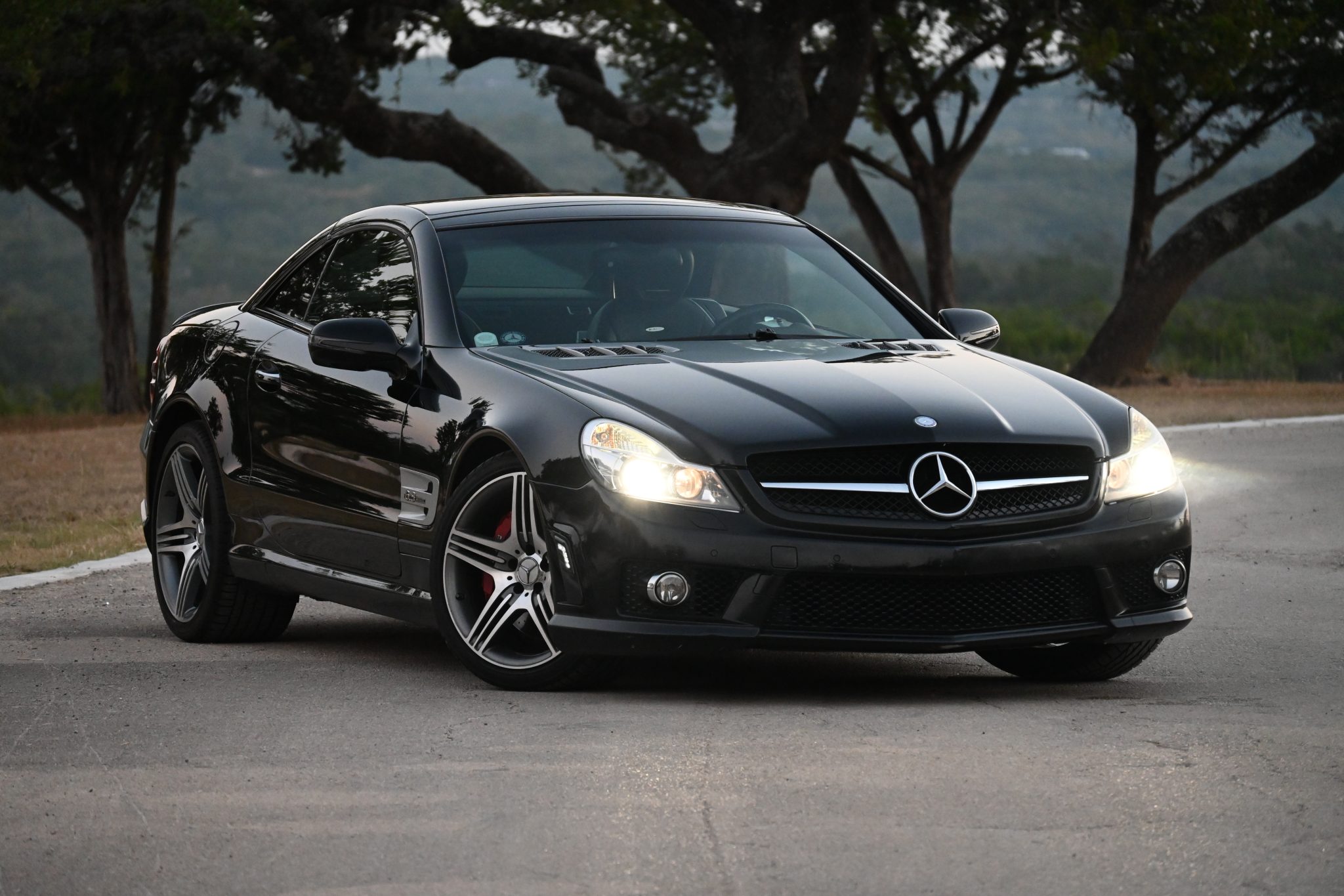 This 2009 Mercedes-Benz SL63 AMG is powered by a 6.2-liter V8 paired with a seven-speed AMG Speedshift MCT transmission and is finished in black over black leather upholstery. Equipment includes bi-xenon headlights, 19″ AMG triple five-spoke wheels, parking sensors, a backup camera, a rear spoiler, heated and ventilated seats with massaging elements, Airscarf neck warmers, a Harman Kardon sound system, and COMAND with navigation.