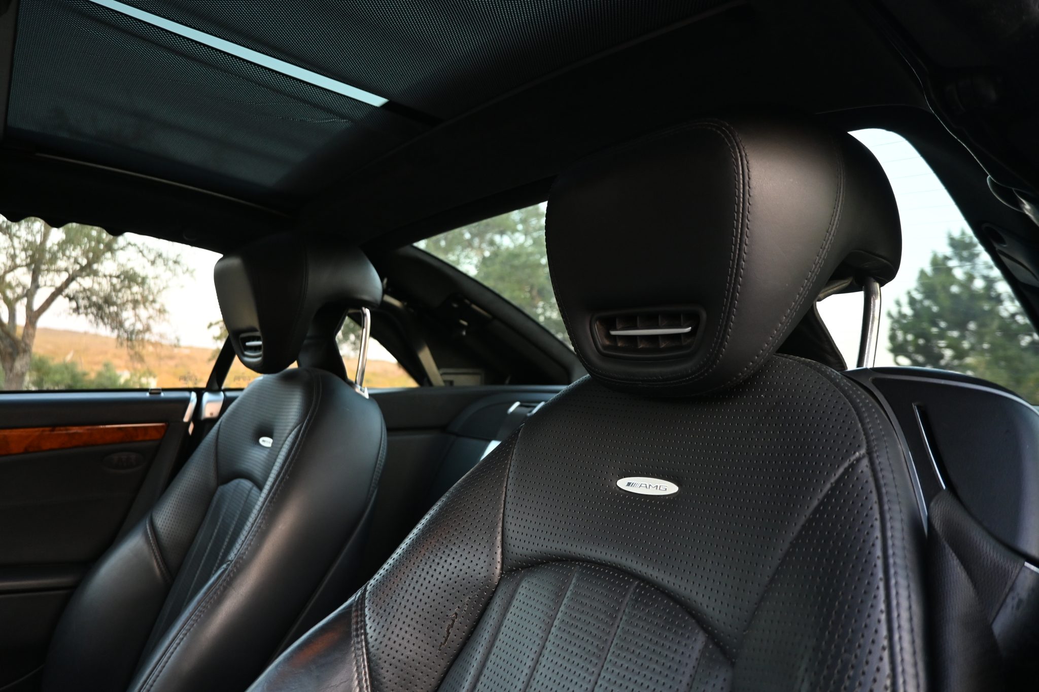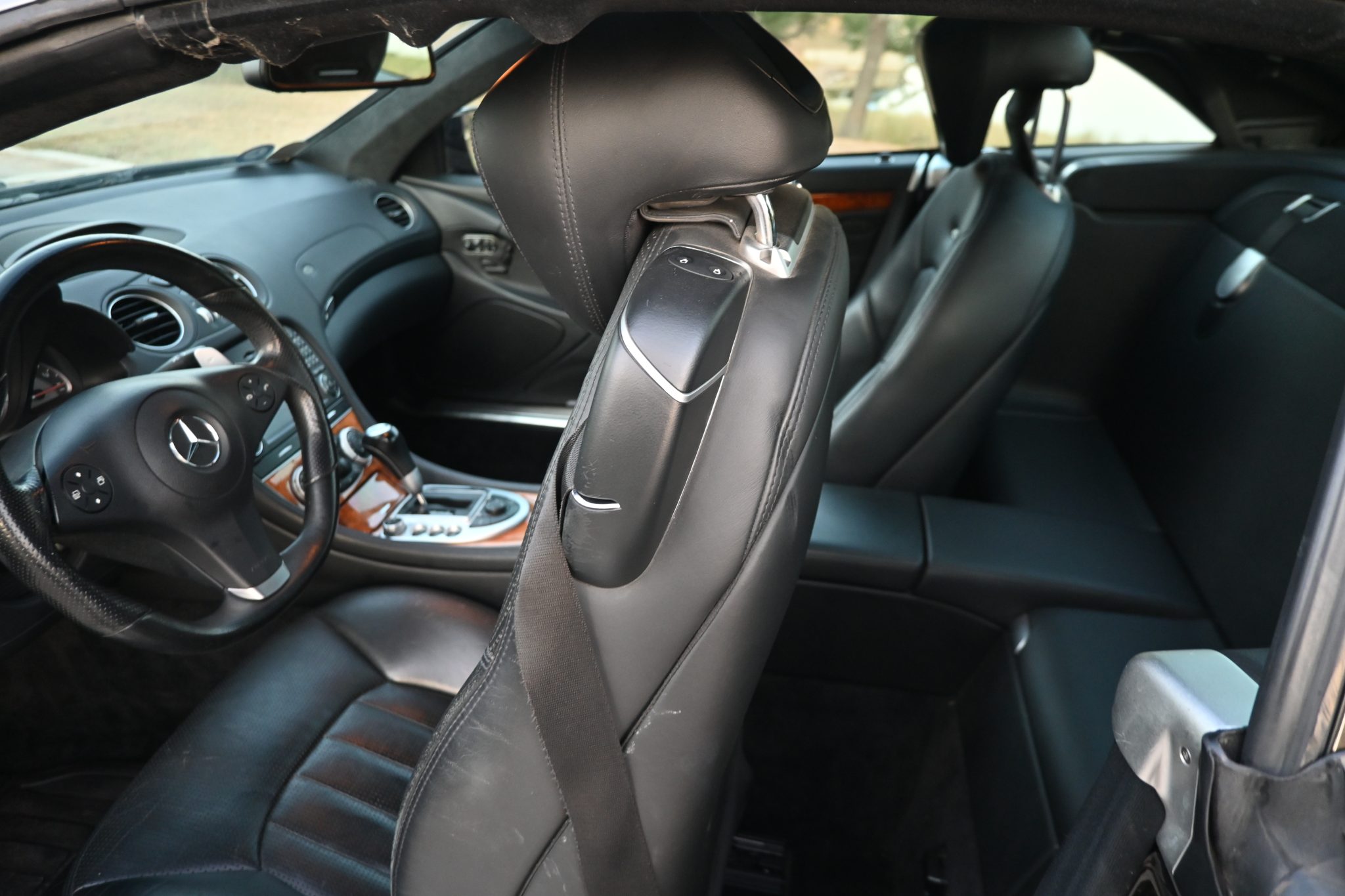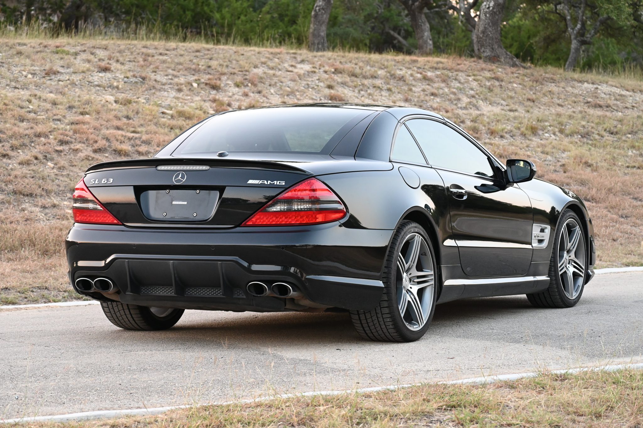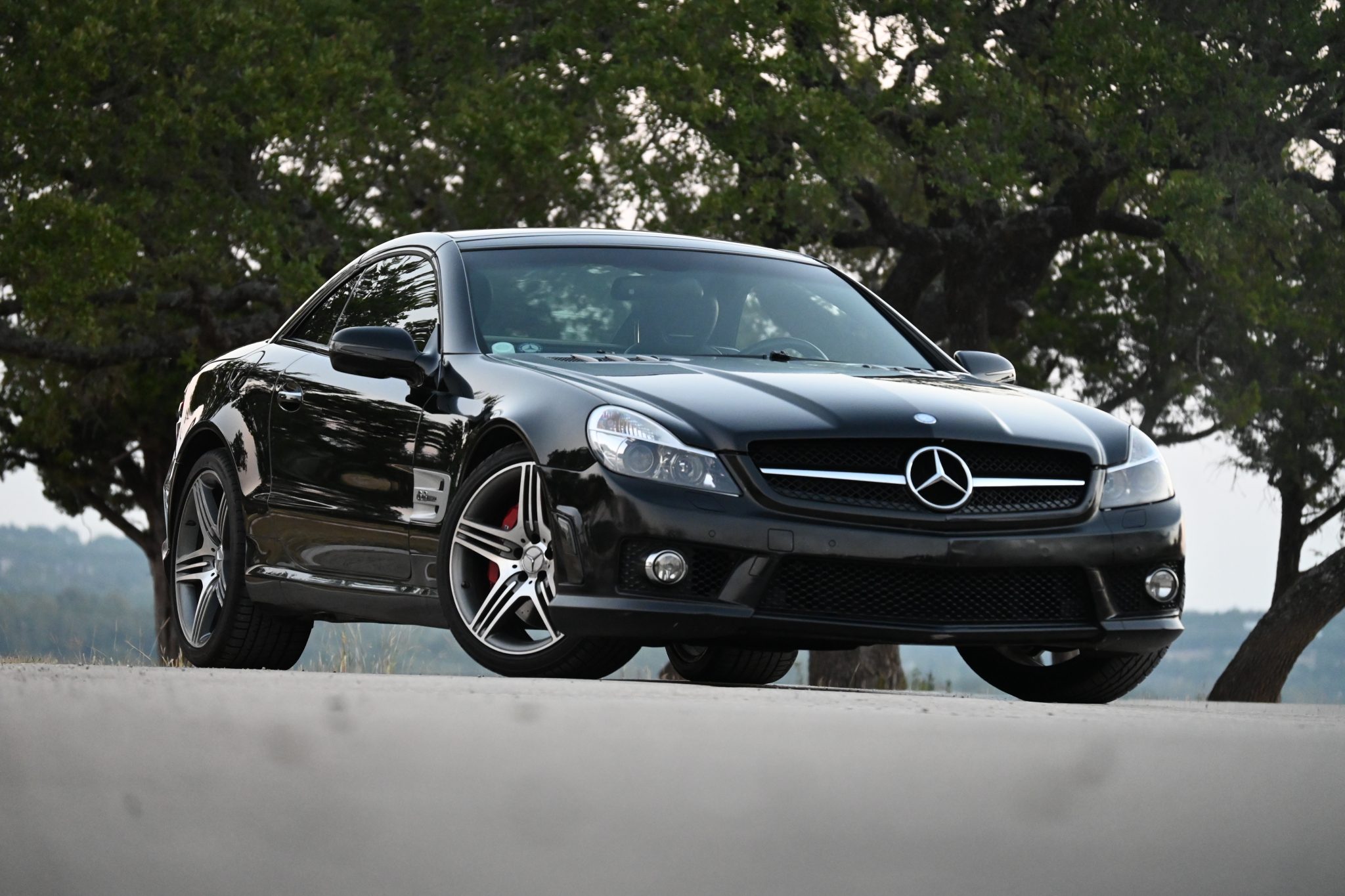 This 2009 Mercedes-Benz SL63 AMG is powered by a 6.2-liter V8 paired with a seven-speed AMG Speedshift MCT transmission and is finished in black over black leather upholstery. Equipment includes bi-xenon headlights, 19″ AMG triple five-spoke wheels, parking sensors, a backup camera, a rear spoiler, heated and ventilated seats with massaging elements, Airscarf neck warmers, a Harman Kardon sound system, and COMAND with navigation.