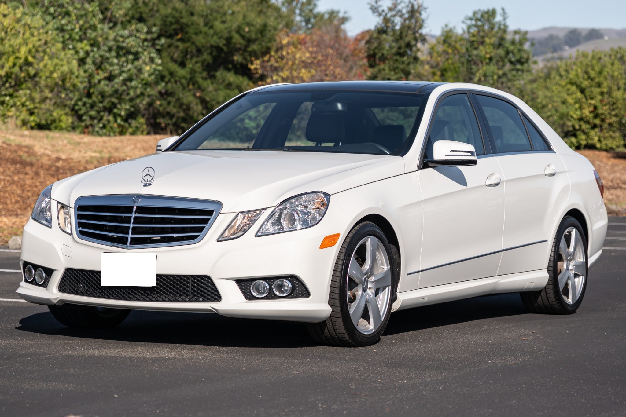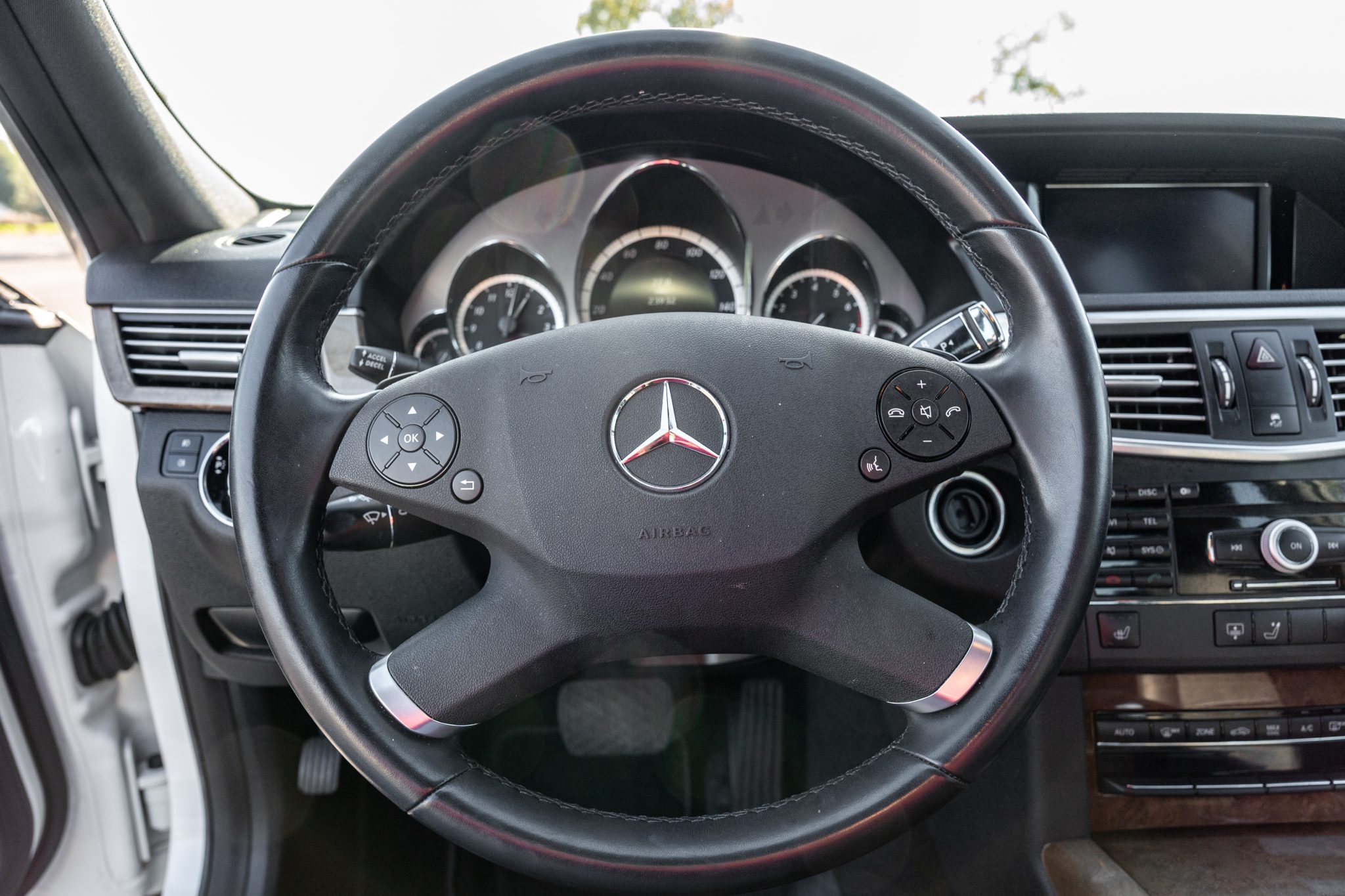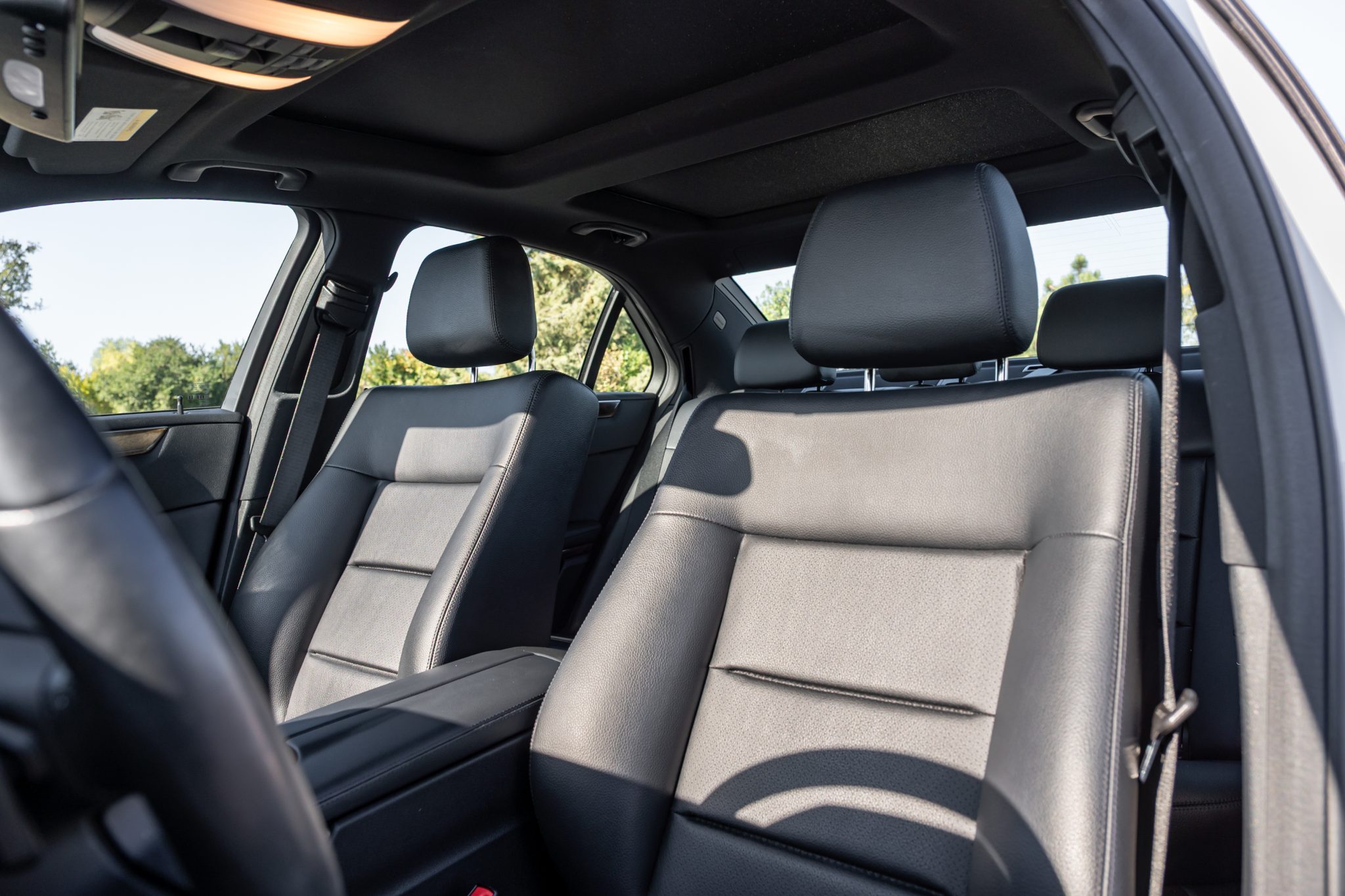 The car is powered by a 3.5-liter V6 paired with a seven-speed automatic transmission and is finished in Arctic White over black MB-Tex upholstery. Features include xenon headlights, a panoramic sunroof, 18″ five-spoke alloy wheels, a rearview camera, navigation, heated power-adjustable front seats, a Harman Kardon sound system, cruise control, a CD stereo, and dual-zone automatic climate control.
